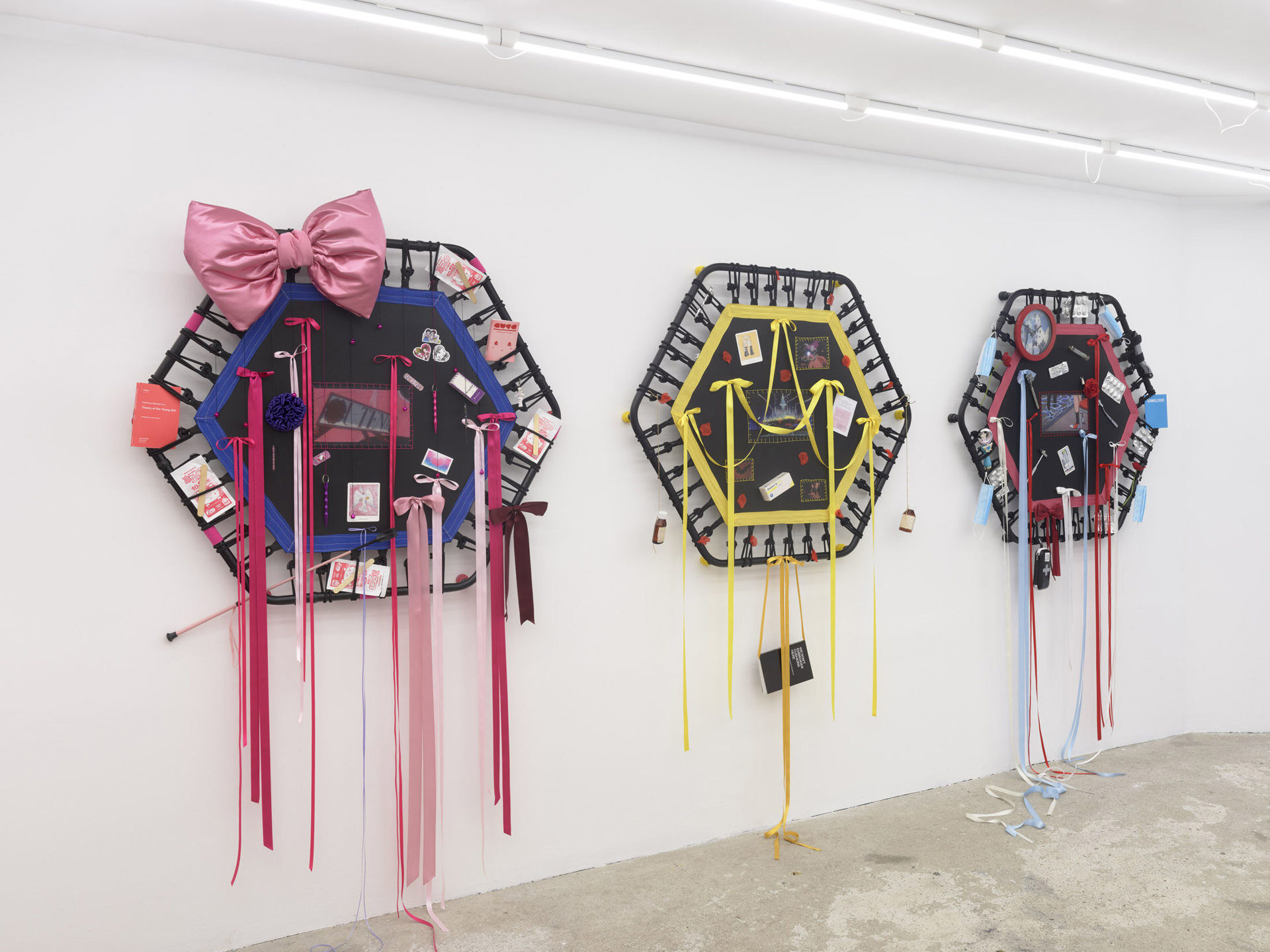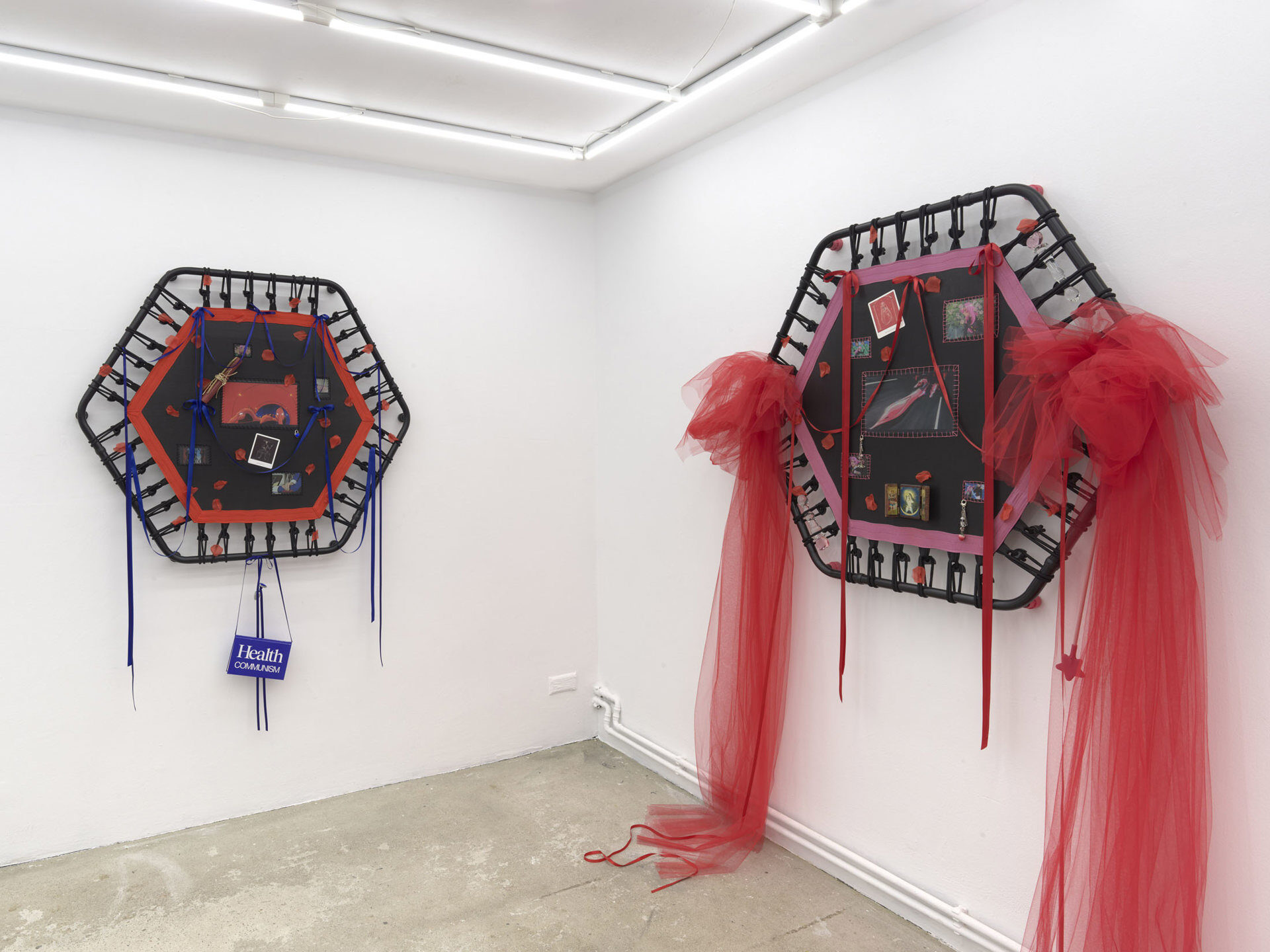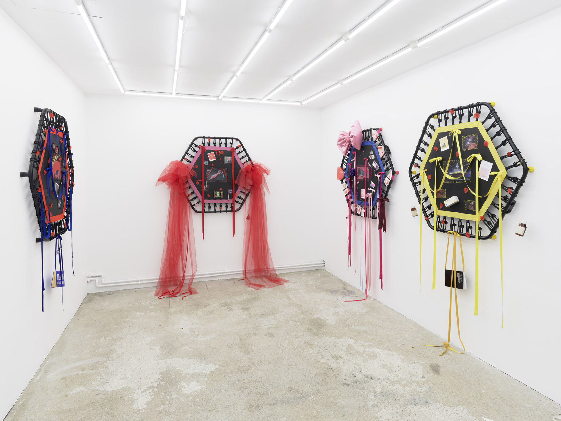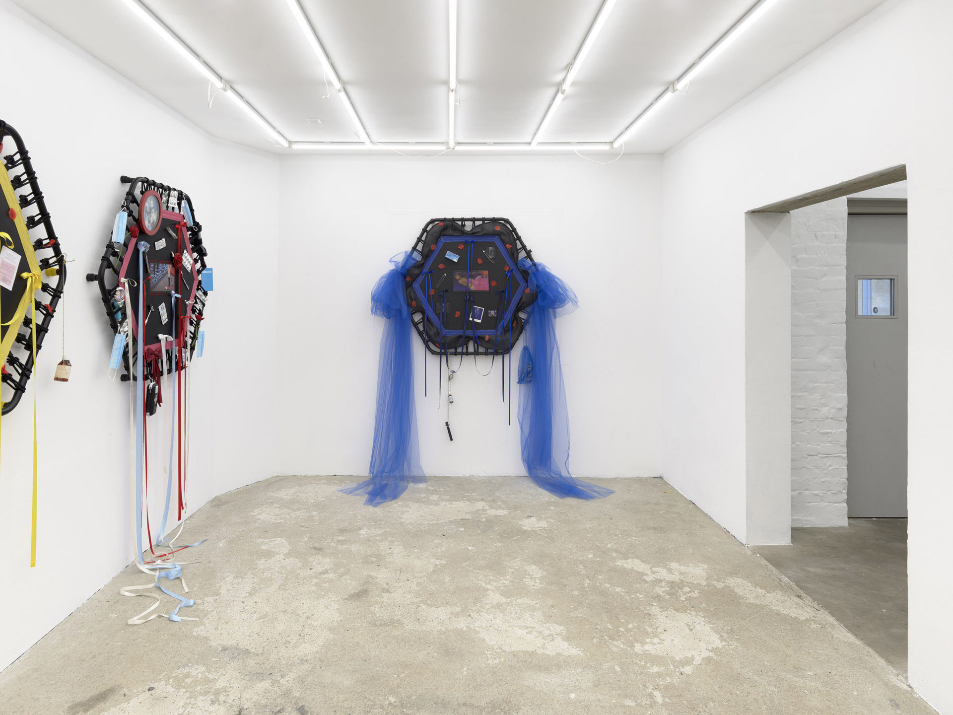 Even A Worm Will Turn, Lauryn Youden’s solo exhibition at Number 1 Main Road, Berlin navigates the sterile surfaces of the medical-industrial complex and modernist architecture, exposing the latent violence they inflict on chronically ill and disabled lives. The show centers around a series of ornate wall sculptures reminiscent of oversized prize ribbons, made from trampolines—the same kind once prescribed to Youden as a “misguided” cure for chronic pain. Emblematic of bodily capitalist regimes, these trampolines inherit Le Corbusier’s vision of the home as a machine for living: a paradigm that reduces domestic space to a site of regulation and exclusion, where sick and disabled bodies are unwelcome. Even the mundane is complicit; its supposed neutrality conceals architectures of control and erasure. Youden renders the trampolines inoperable: their legs truncated, stripped of function, with surfaces adorned by bows, fabric patches, and intimate detritus. They become portals into queer…
