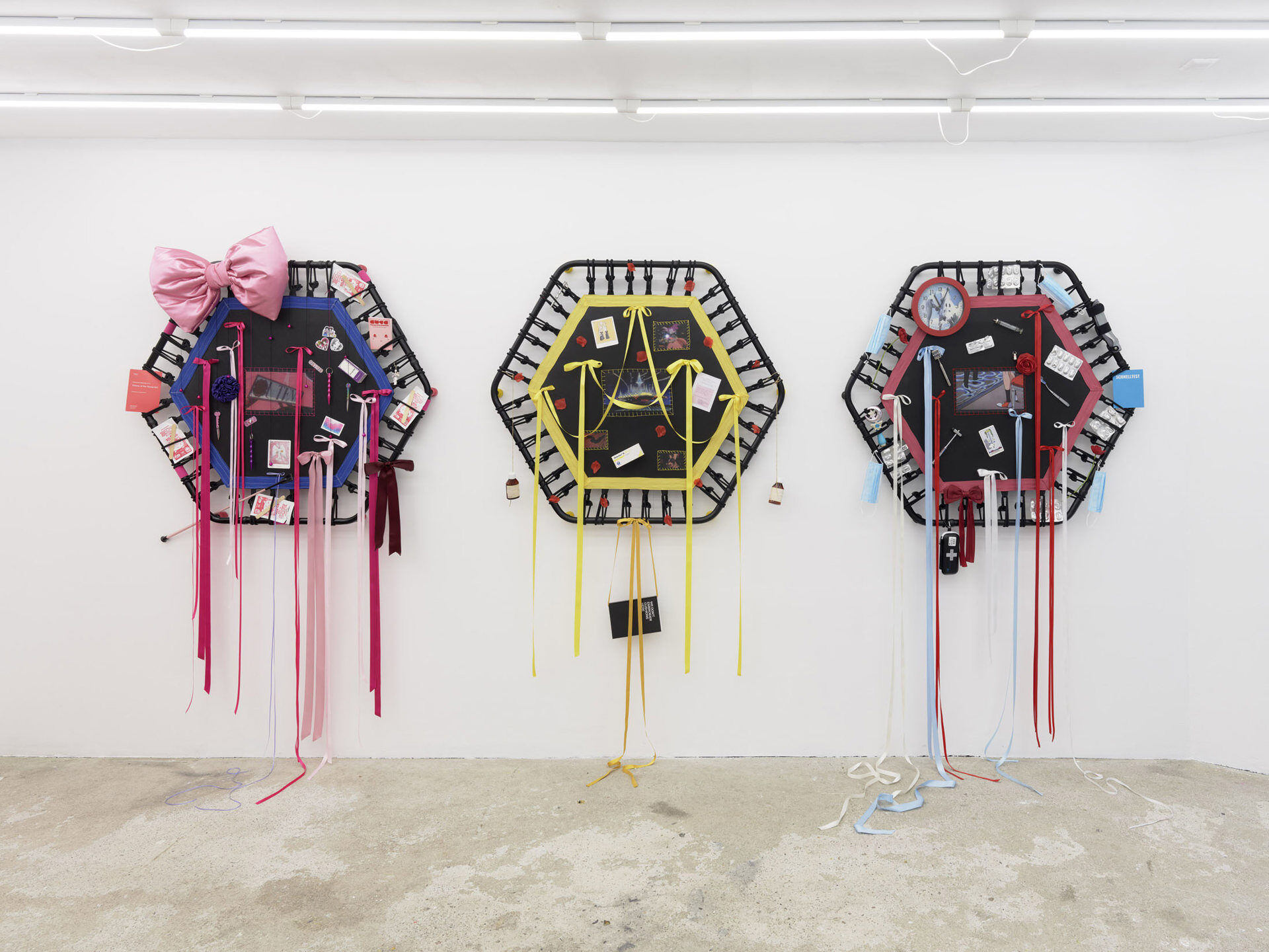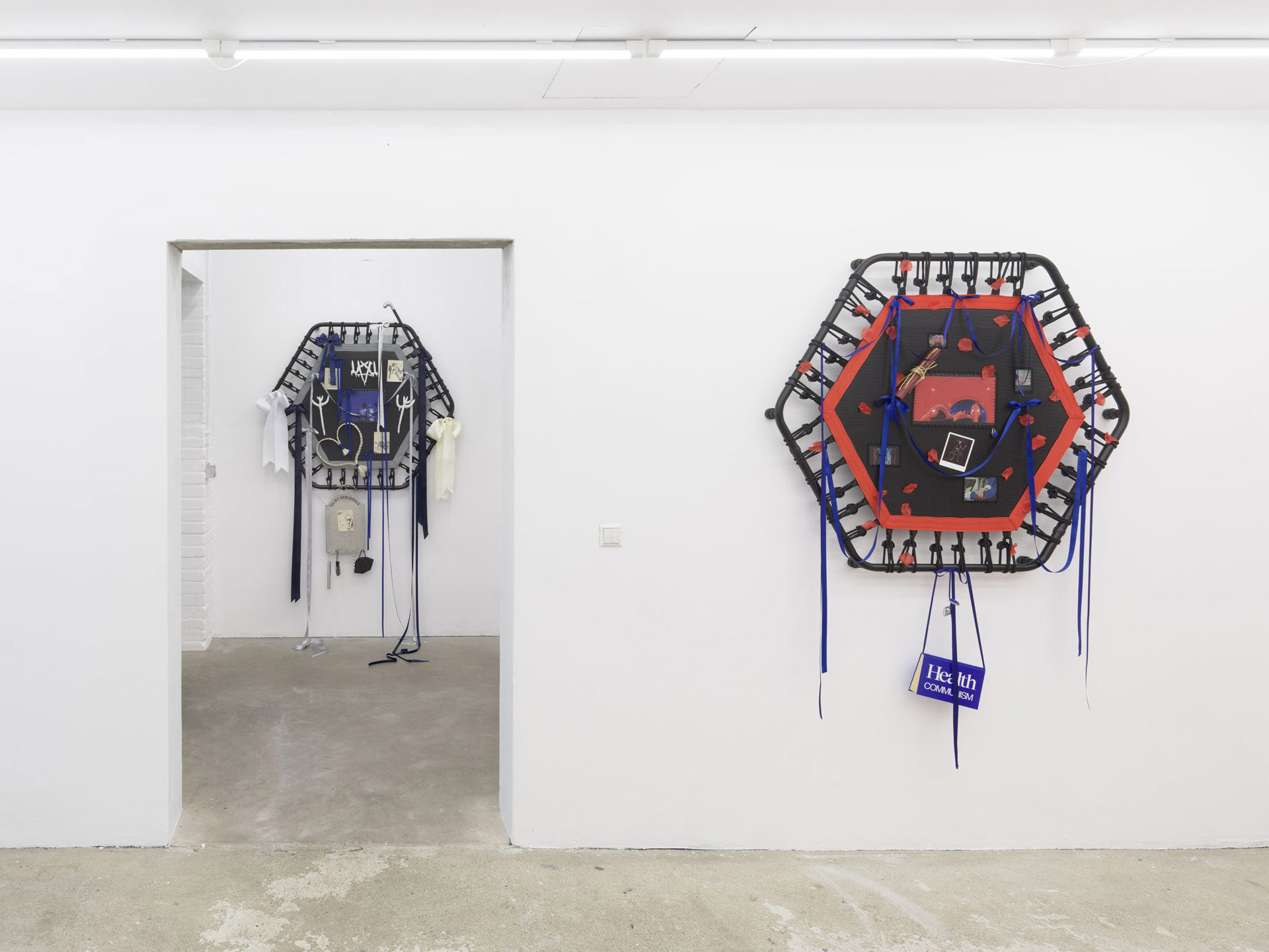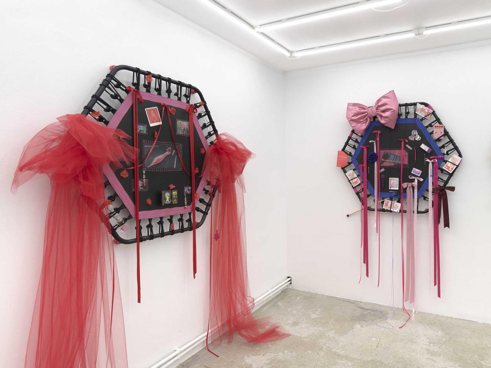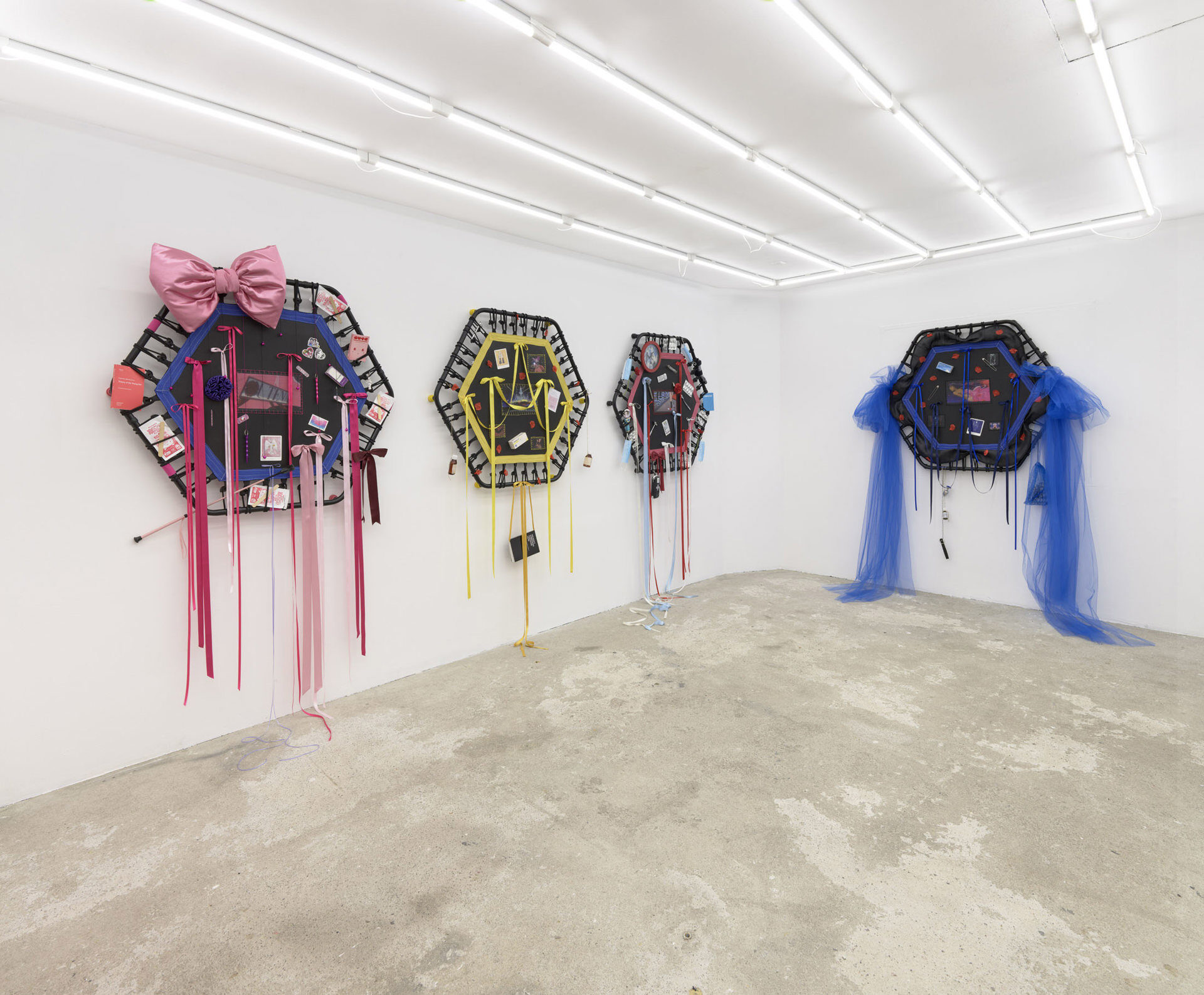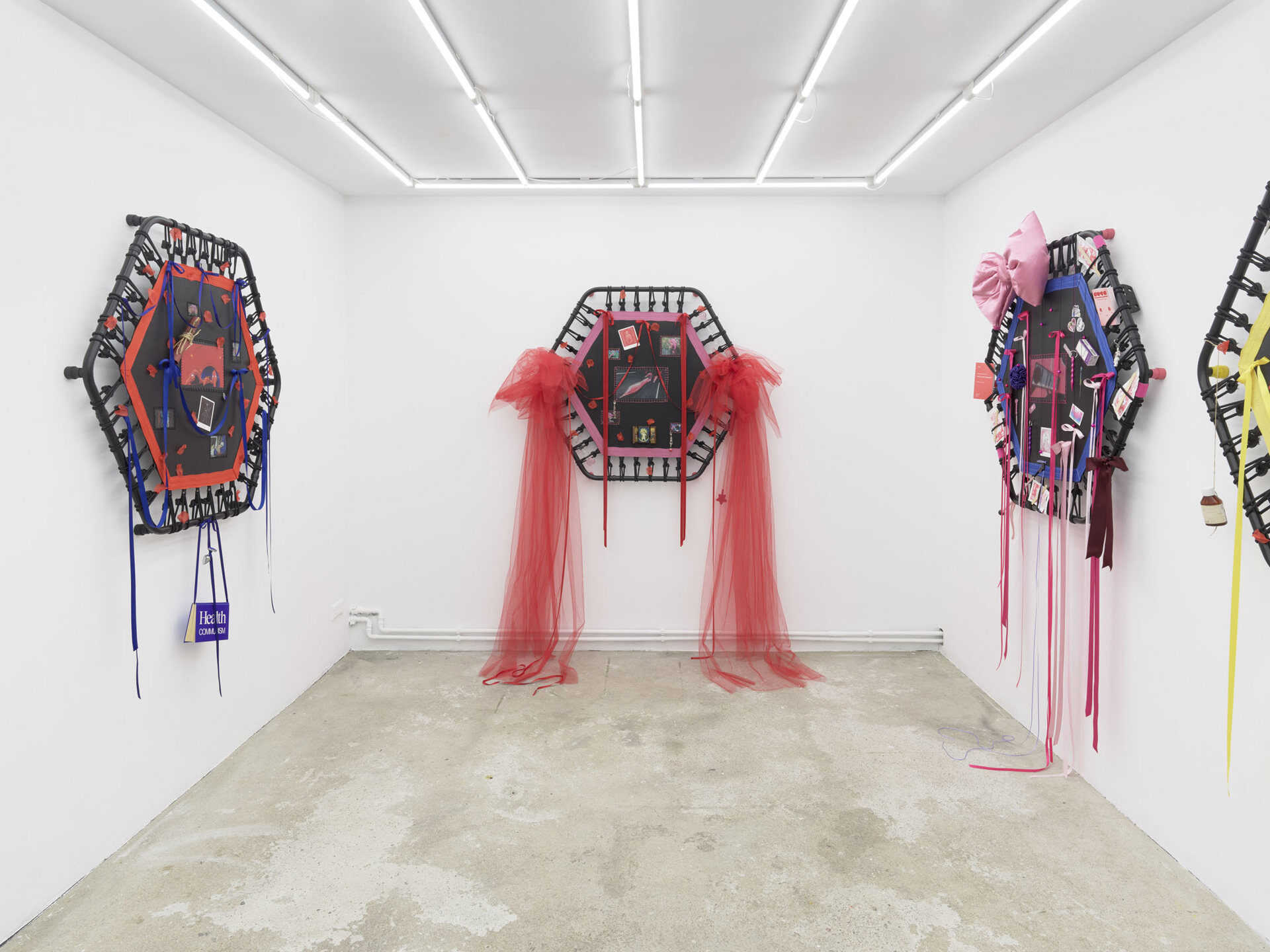 Even A Worm Will Turn, Lauryn Youden’s solo exhibition at Number 1 Main Road, Berlin navigates the sterile surfaces of the medical-industrial complex and modernist architecture, exposing the latent violence they inflict on chronically ill and disabled lives. The show centers around a series of ornate wall sculptures reminiscent of oversized prize ribbons, made from trampolines—the same kind once prescribed to Youden as a “misguided” cure for chronic pain. Emblematic of bodily capitalist regimes, these trampolines inherit Le Corbusier’s vision of the home as a machine for living: a paradigm that reduces domestic space to a site of regulation and exclusion, where sick and disabled bodies are unwelcome. Even the mundane is complicit; its supposed neutrality conceals architectures of control and erasure. Youden renders the trampolines inoperable: their legs truncated, stripped of function, with surfaces adorned by bows, fabric patches, and intimate detritus. They become portals into queer…