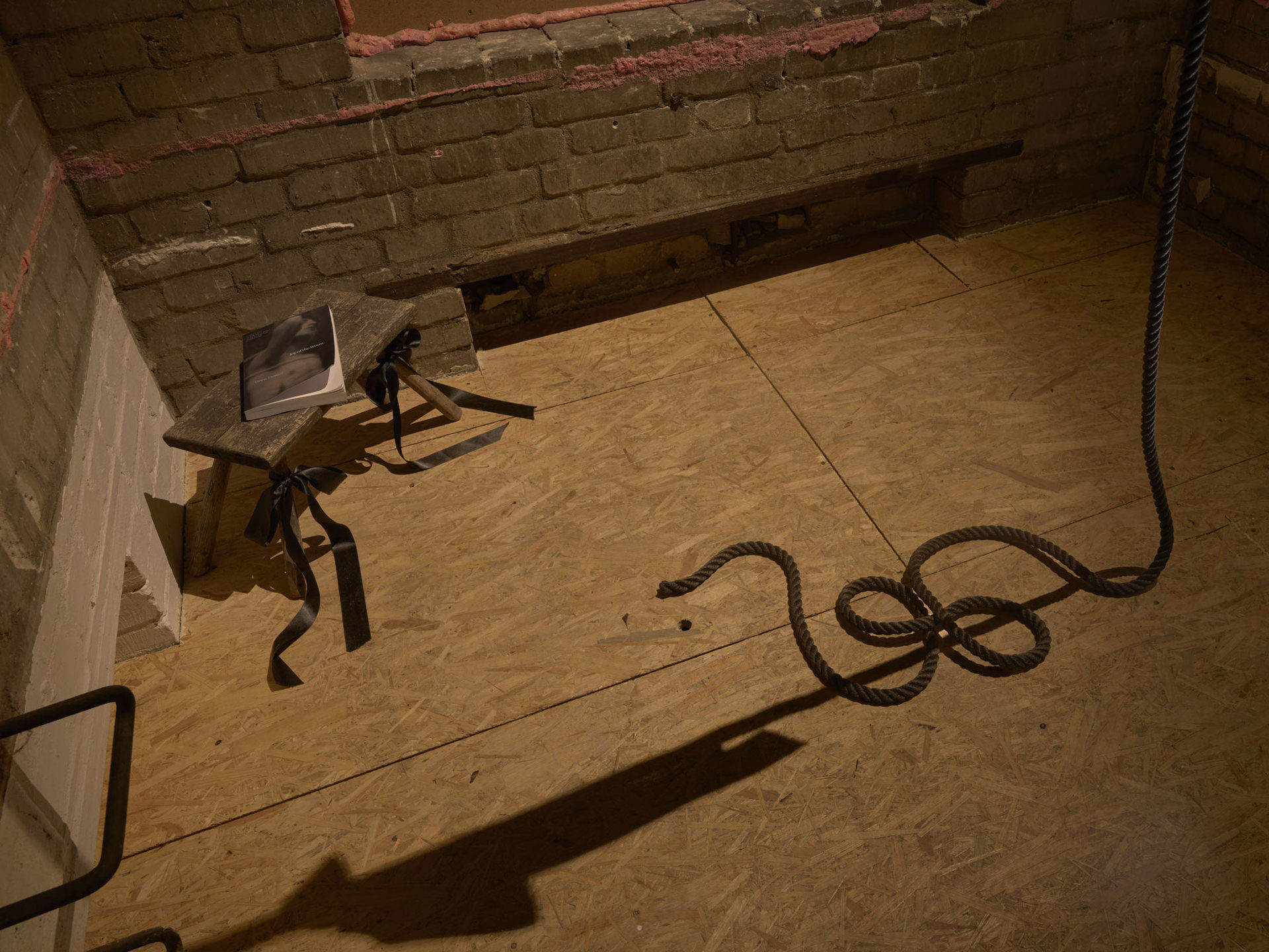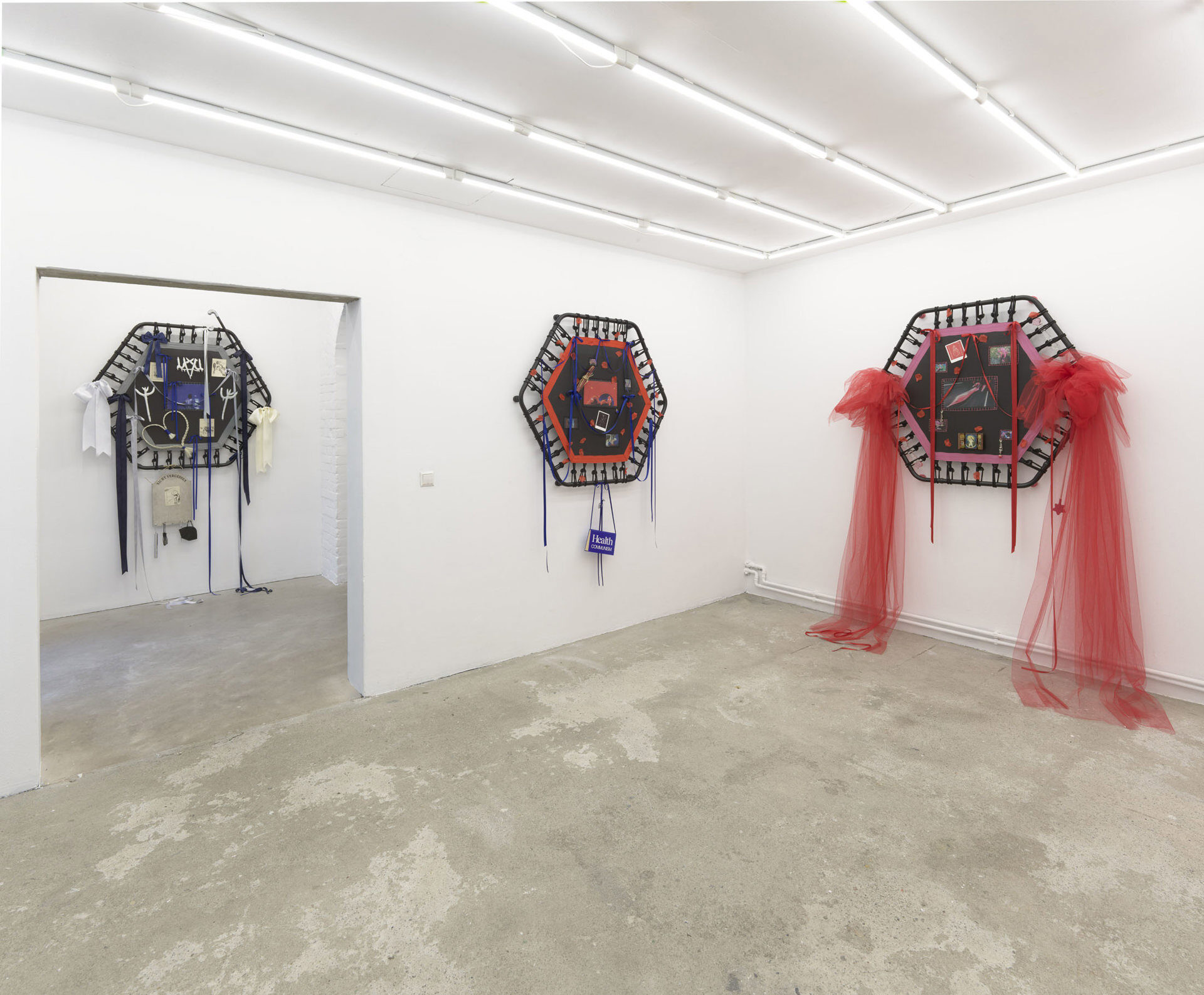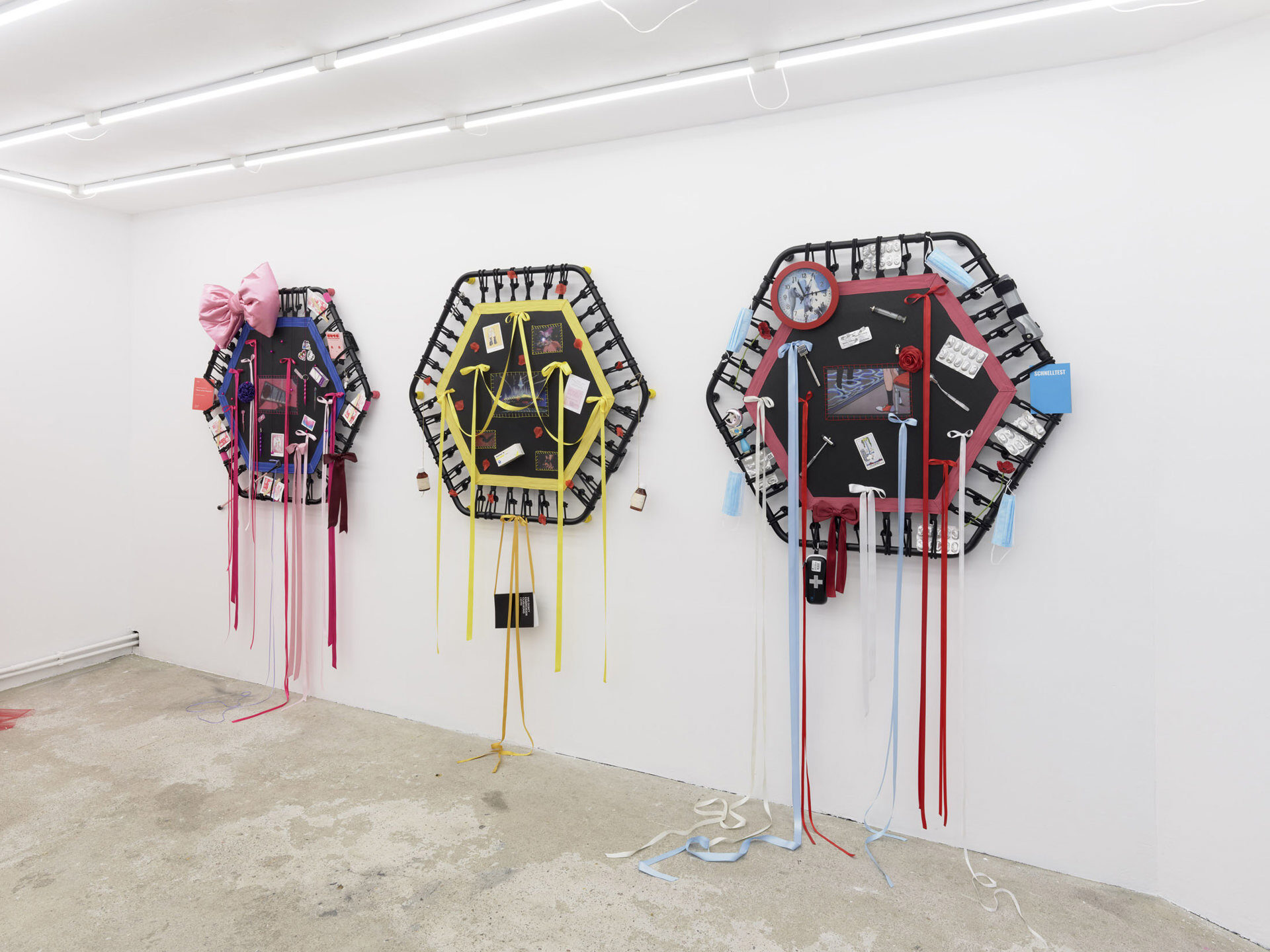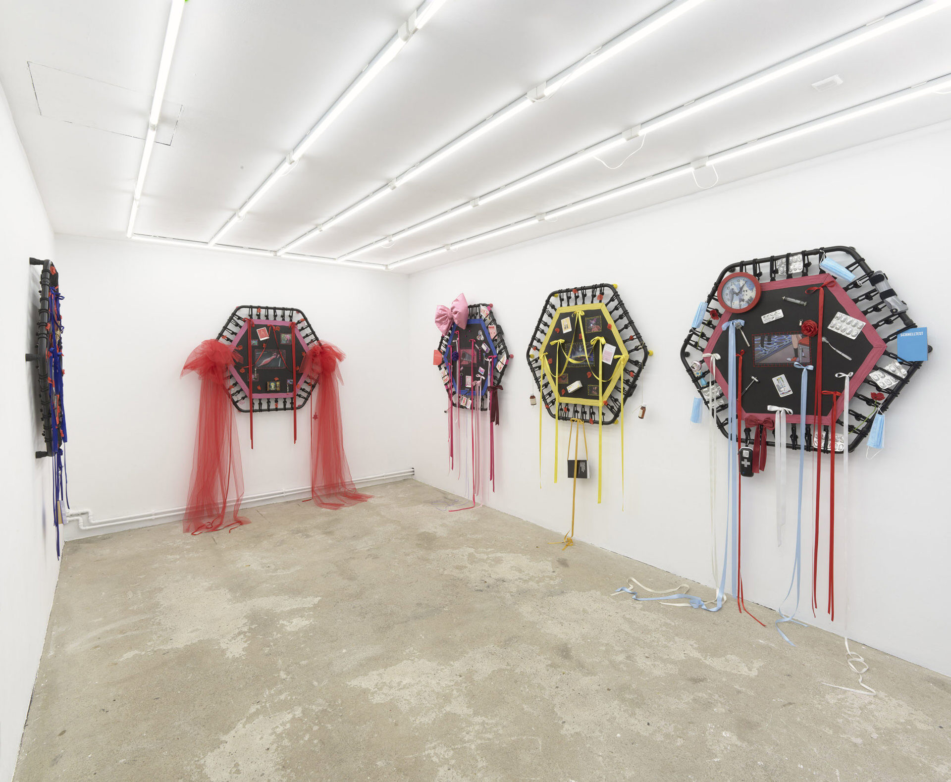 Even A Worm Will Turn, Lauryn Youden’s solo exhibition at Number 1 Main Road, Berlin navigates the sterile surfaces of the medical-industrial complex and modernist architecture, exposing the latent violence they inflict on chronically ill and disabled lives. The show centers around a series of ornate wall sculptures reminiscent of oversized prize ribbons, made from trampolines—the same kind once prescribed to Youden as a “misguided” cure for chronic pain. Emblematic of bodily capitalist regimes, these trampolines inherit Le Corbusier’s vision of the home as a machine for living: a paradigm that reduces domestic space to a site of regulation and exclusion, where sick and disabled bodies are unwelcome. Even the mundane is complicit; its supposed neutrality conceals architectures of control and erasure. Youden renders the trampolines inoperable: their legs truncated, stripped of function, with surfaces adorned by bows, fabric patches, and intimate detritus. They become portals into queer…