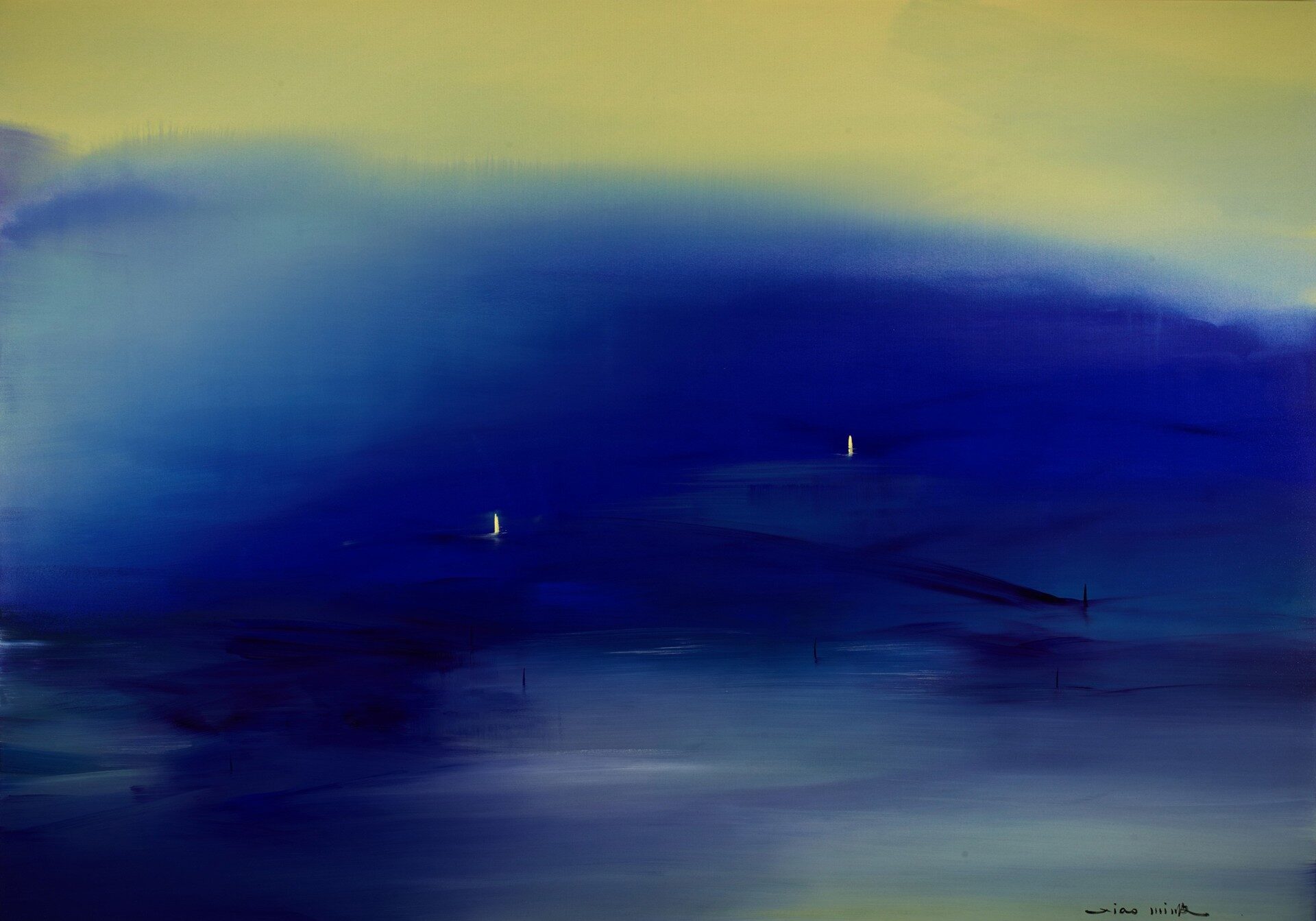 In Composition N°26.7.21 (2021), deep midnight blues dominate the canvas, conjuring a tranquil yet mysterious expanse. Two luminous focal points appear in the distance—perhaps lighthouses, perhaps solitary vessels—immersing…