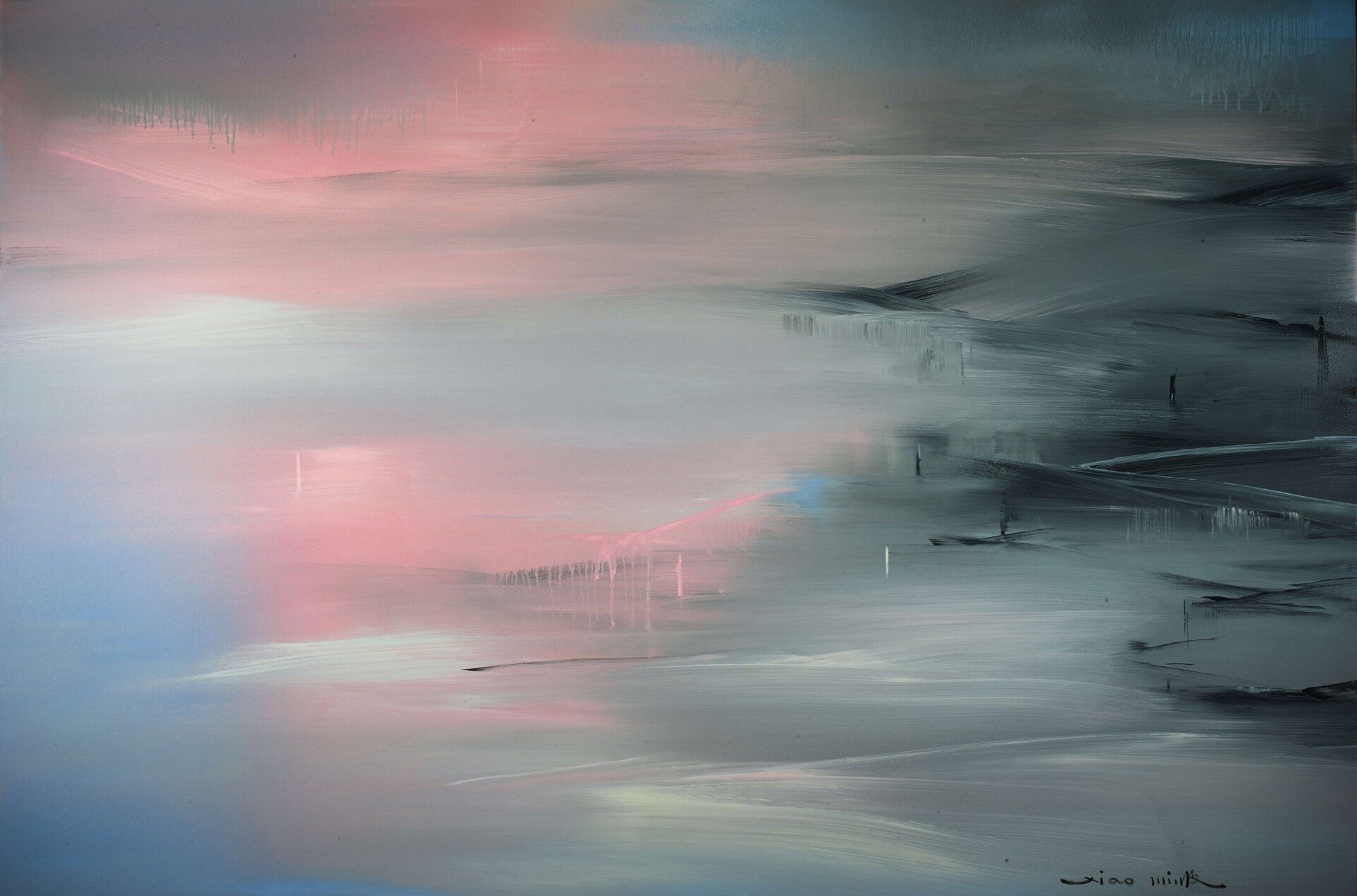 Evoking imagery of sailing boats adrift on vast, limitless seas, Feng’s paintings blur the boundaries between sky and water. Glowing orbs of light emerge like guiding beacons, offering solace in a landscape of ever-shifting hues. His canvases create an experience beyond mere observation; they are an invitation to voyage—a moment of pause and reflection in an era overwhelmed by movement and uncertainty.