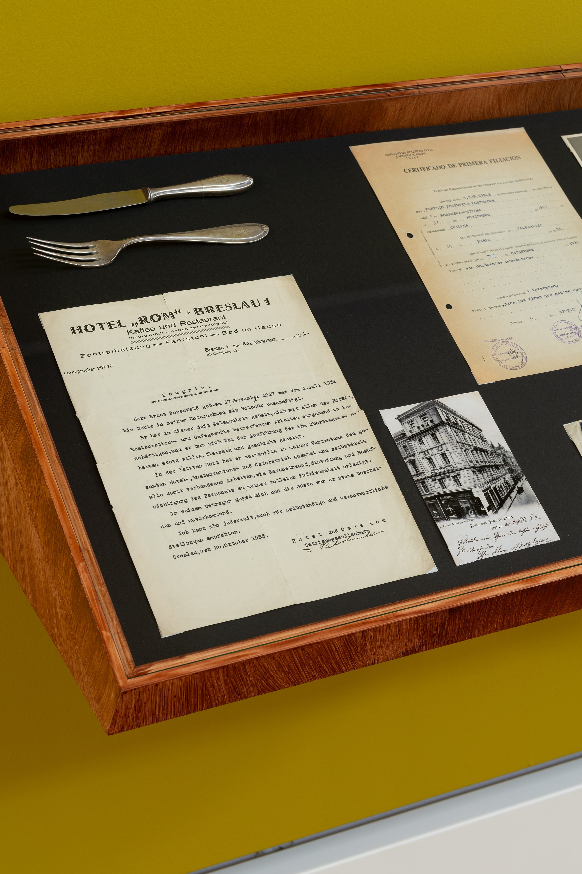 Daughter, exile, feminist, urban choreographer, political activist and conceptual artist, Lotty Rosenfeld was born in Santiago de Chile in 1943, into a family marked by the experiences of expulsion, survival and resilience. Her father, Ernst Rosenfeld, left Nazi Germany in 1935, part of the early wave of Jewish refugees seeking safety in Latin America. Her grandparents, Rudolf and Charlotte Rosenfeld, who once owned the Hotel Rom in Breslau, fled to Siberia, later emigrating to Chile after the war. In exile, the Rosenfeld family rebuilt a life—and a café—in Santiago, grounded in the memories of their lives in Europe.