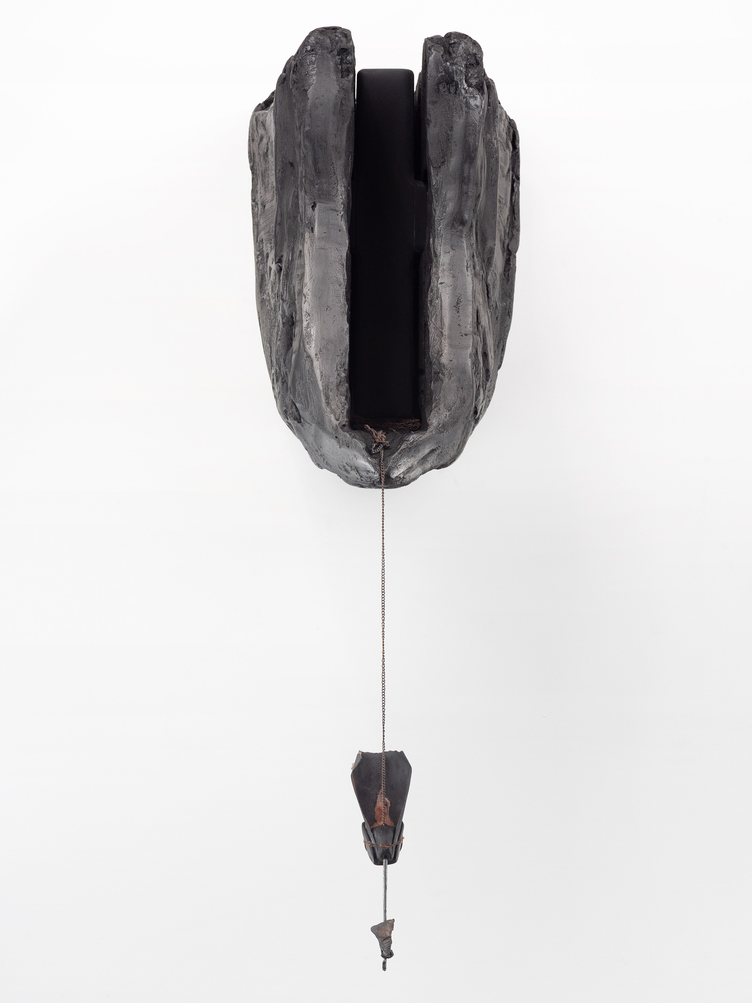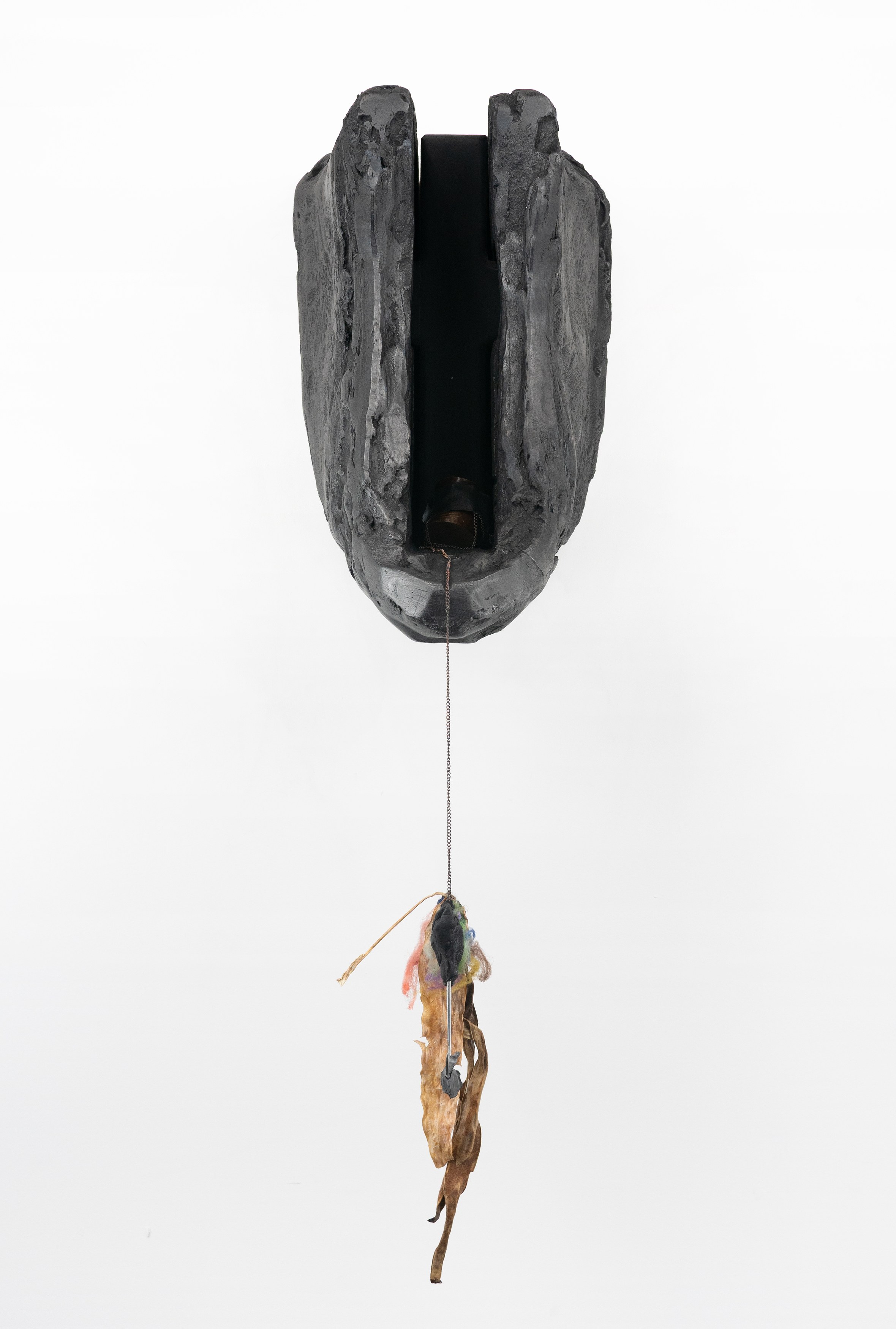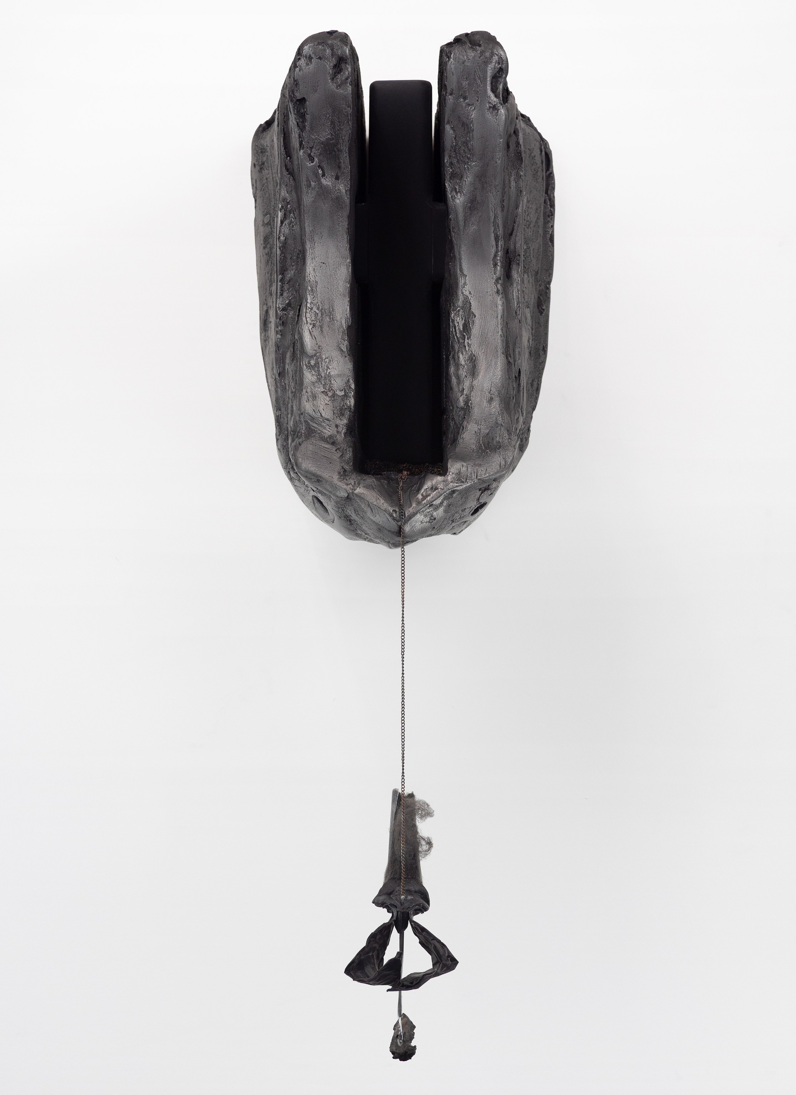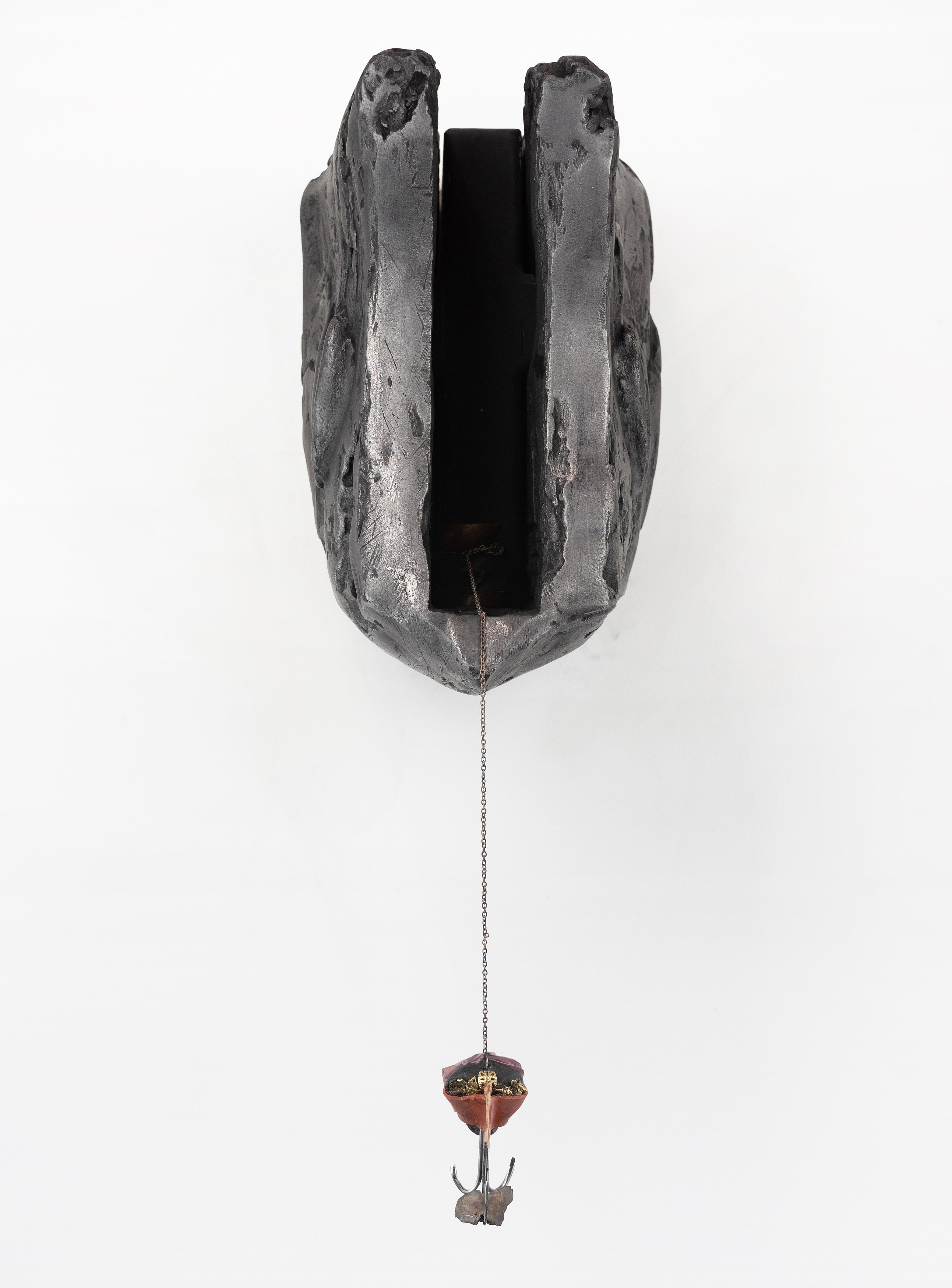 At the entrance to the gallery, visitors are greeted with a takeaway card that reads: “That we are capable only of being what we are remains our unforgivable sin.” The text is from The Claw of the Conciliator, the second volume in American writer Gene Wolfe’s four-part science fiction series, The Book of the New Sun. With this phrase in mind, the works in the exhibition begin to take shape, creating an aura of foreboding, mystery, and intrigue. Within the gallery, Geronimas has installed nineteen wall mounted sculptures around the perimeter of the room, surrounding the exposed ceiling beams and adjoining joists original to the gallery’s 1947 building. Conceived in response to the architectural hardware, his new series of Custom Joist Hanger Cover and Lures are detailed in their ornamentation and decidedly handmade, belying traditional function and mass utility. Each sculpture is composed…