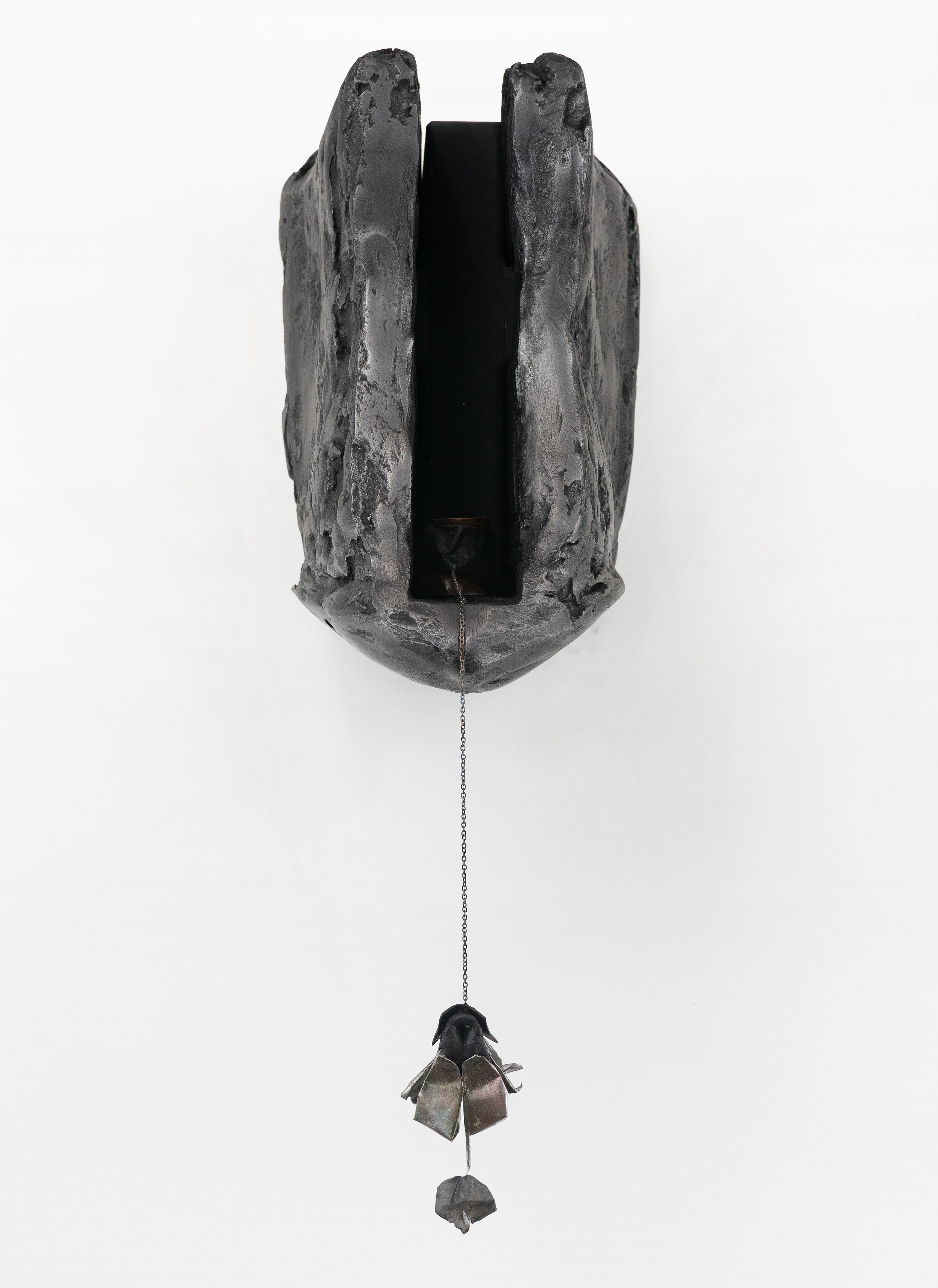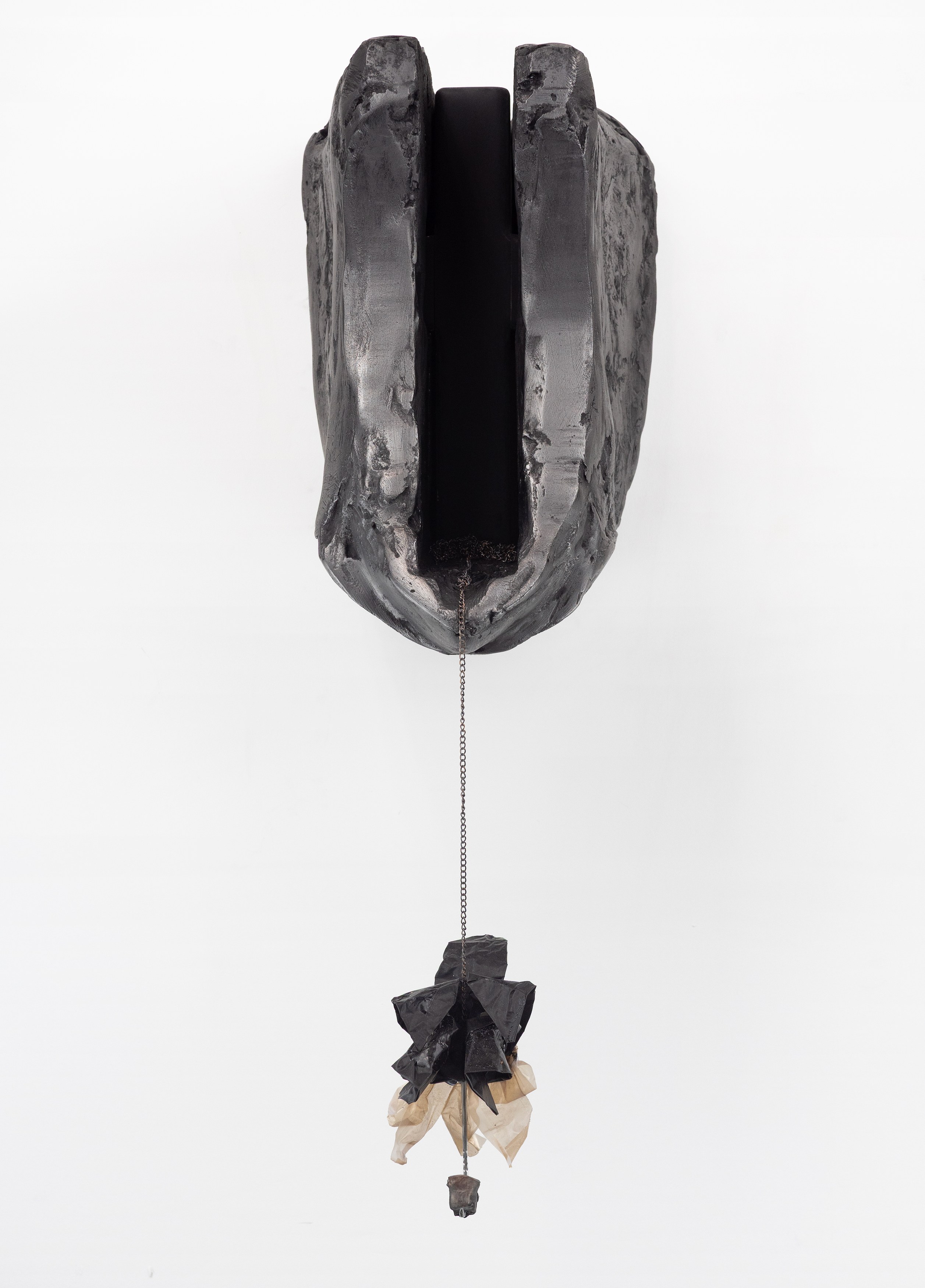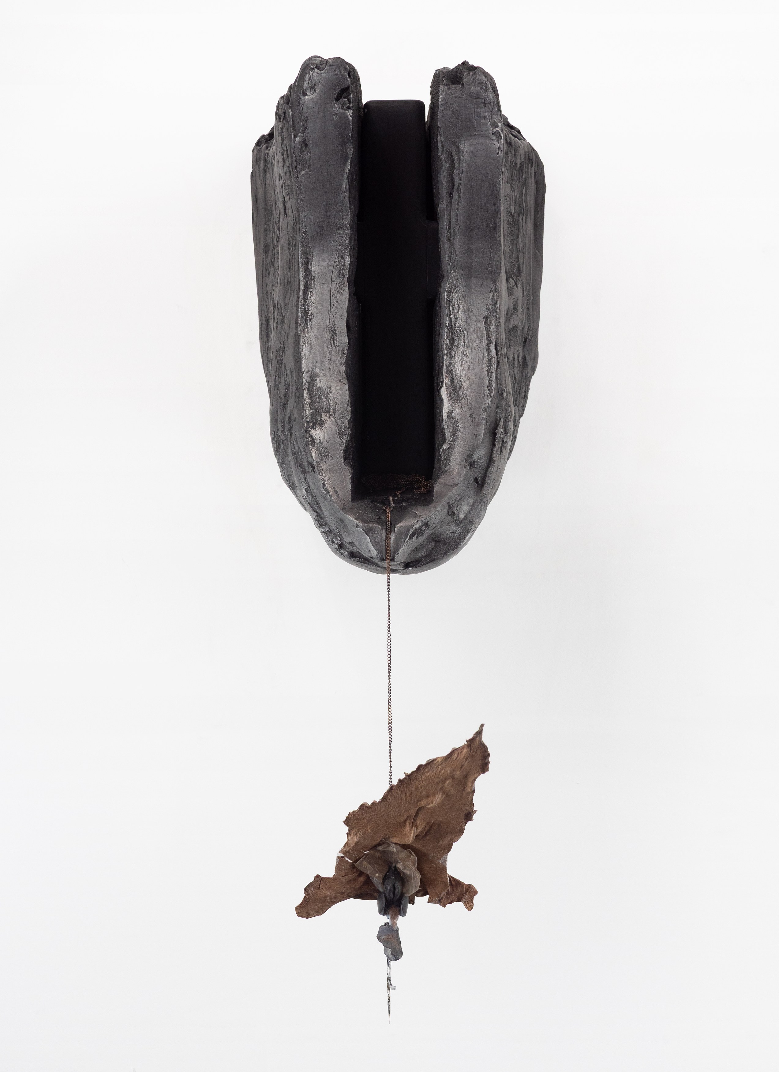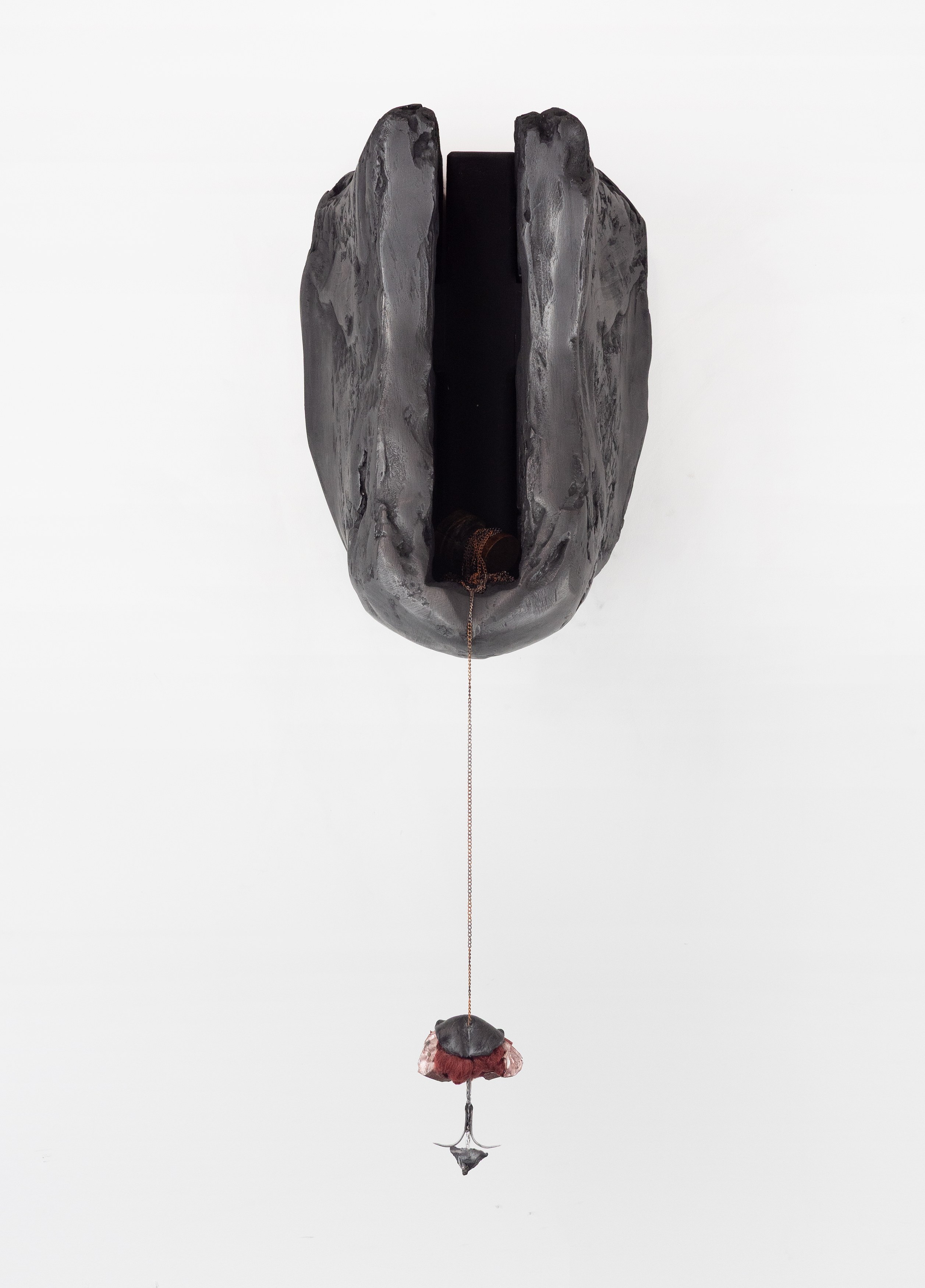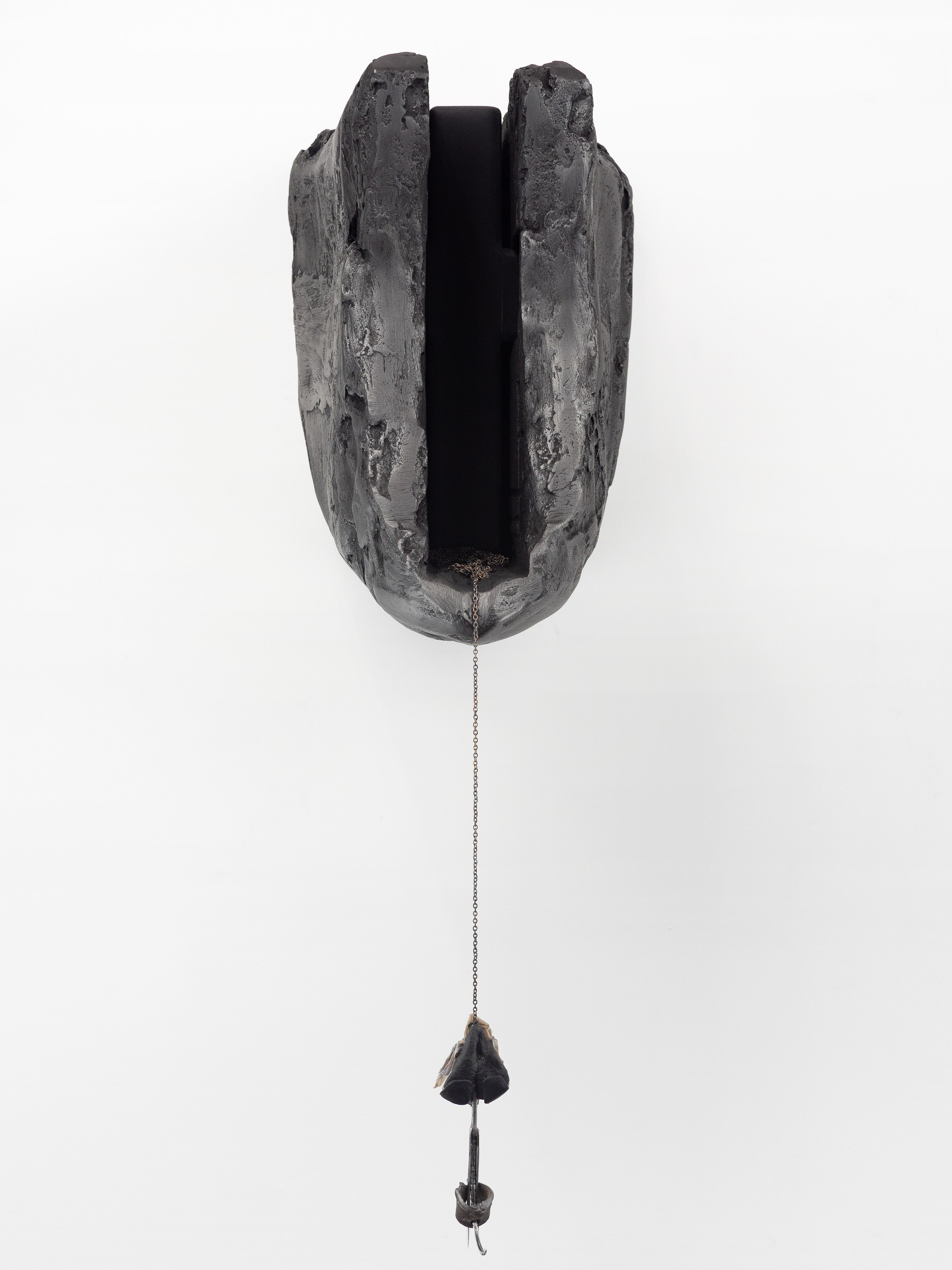 At the entrance to the gallery, visitors are greeted with a takeaway card that reads: “That we are capable only of being what we are remains our unforgivable sin.” The text is from The Claw of the Conciliator, the second volume in American writer Gene Wolfe’s four-part science fiction series, The Book of the New Sun. With this phrase in mind, the works in the exhibition begin to take shape, creating an aura of foreboding, mystery, and intrigue. Within the gallery, Geronimas has installed nineteen wall mounted sculptures around the perimeter of the room, surrounding the exposed ceiling beams and adjoining joists original to the gallery’s 1947 building. Conceived in response to the architectural hardware, his new series of Custom Joist Hanger Cover and Lures are detailed in their ornamentation and decidedly handmade, belying traditional function and mass utility. Each sculpture is composed…