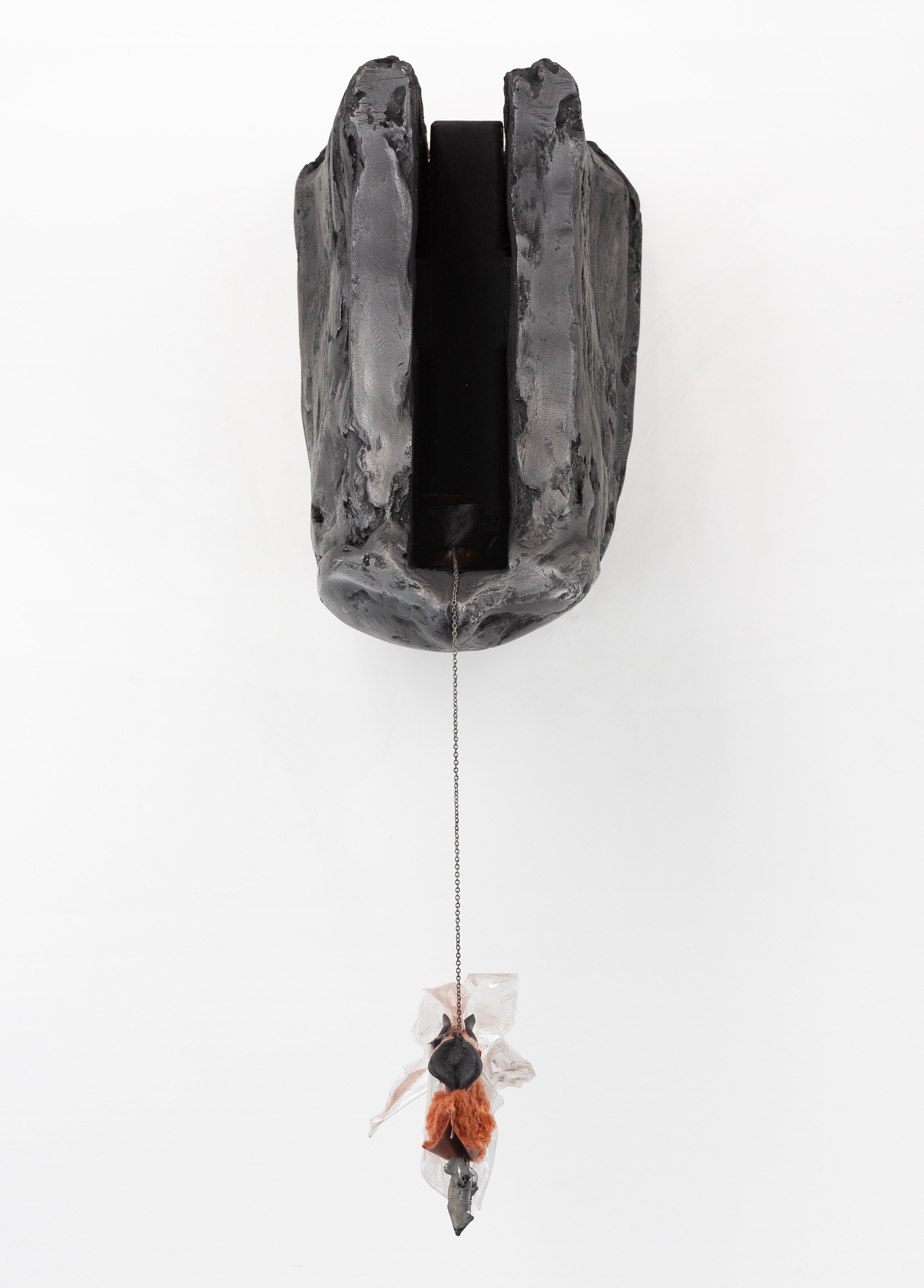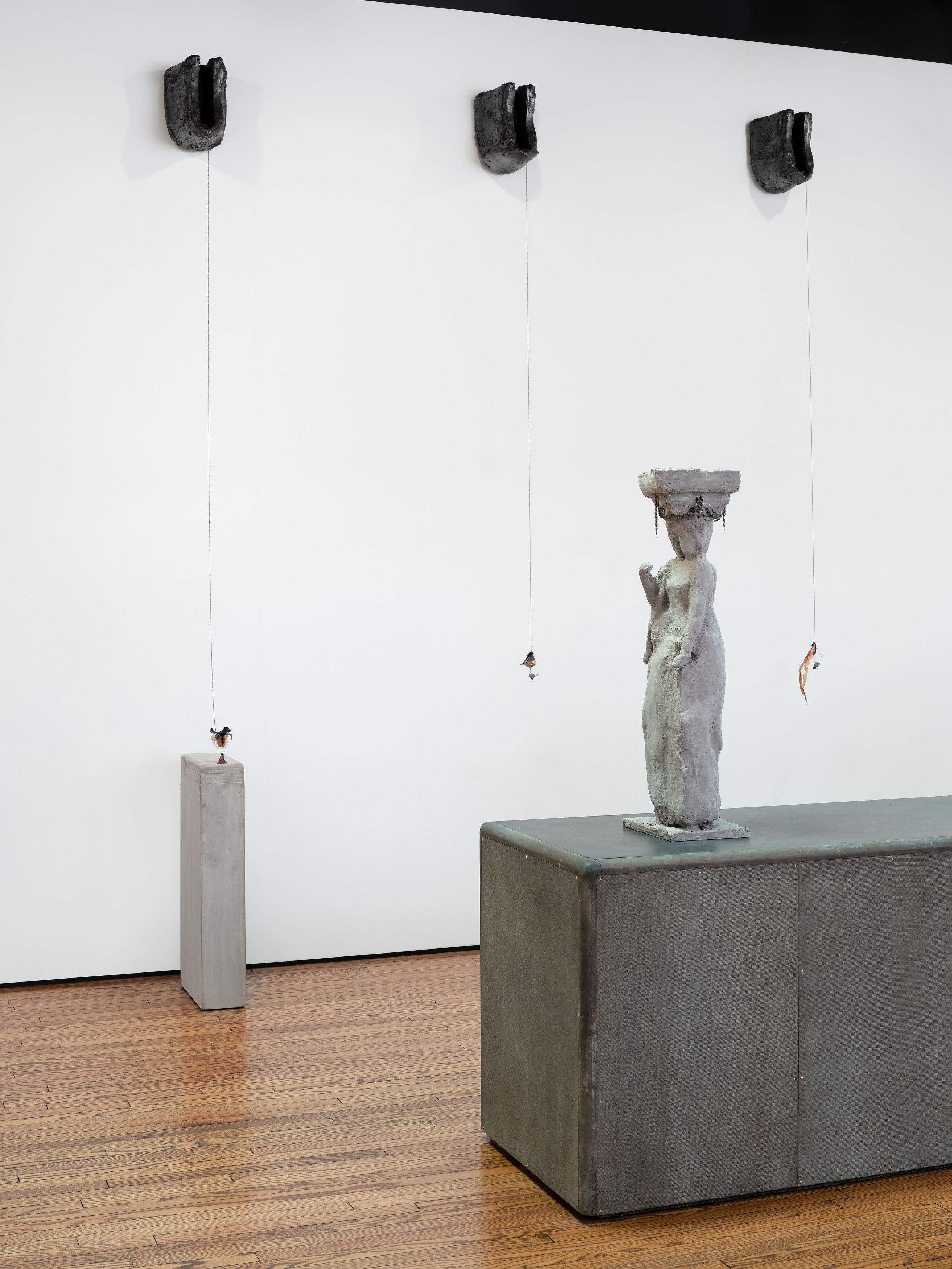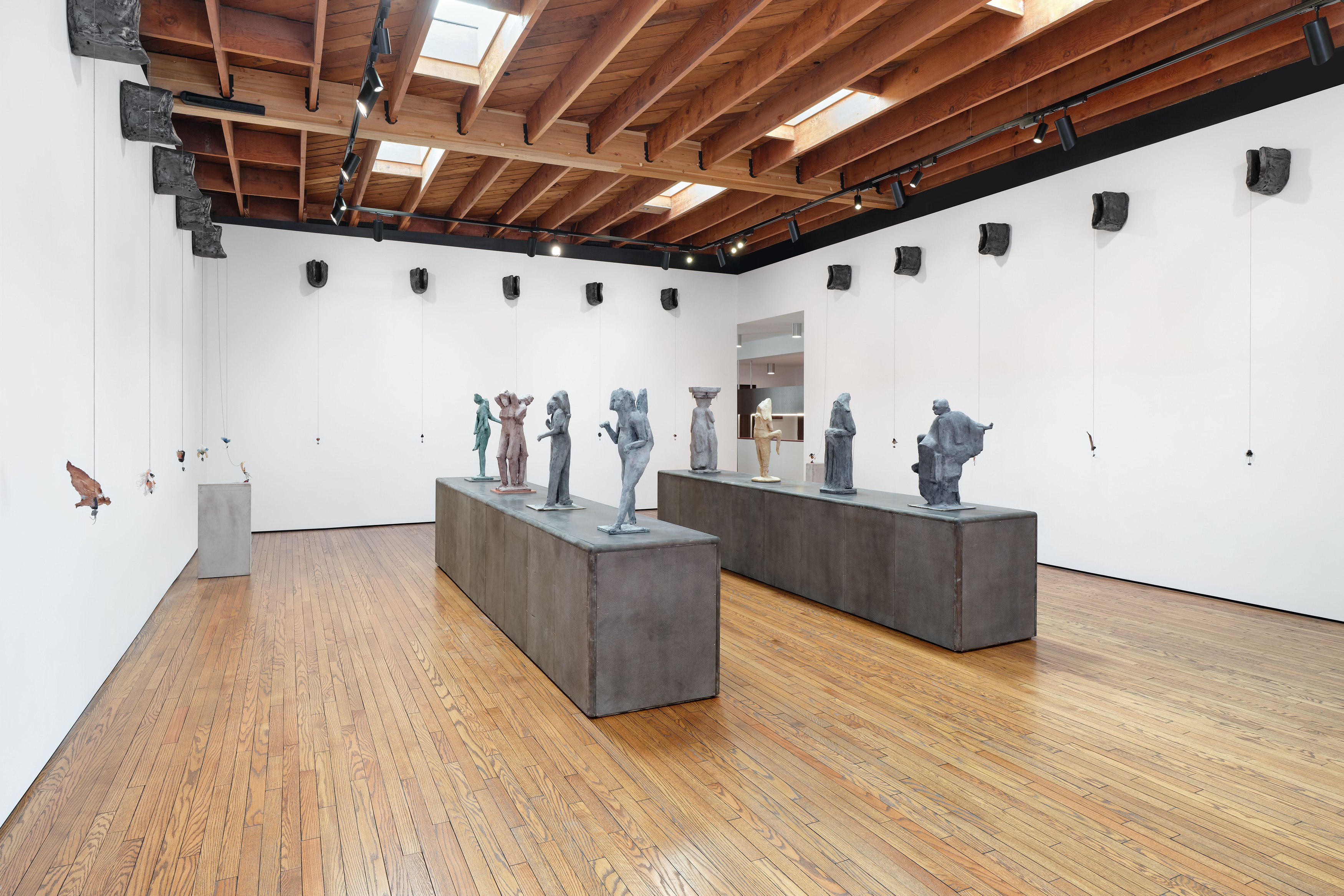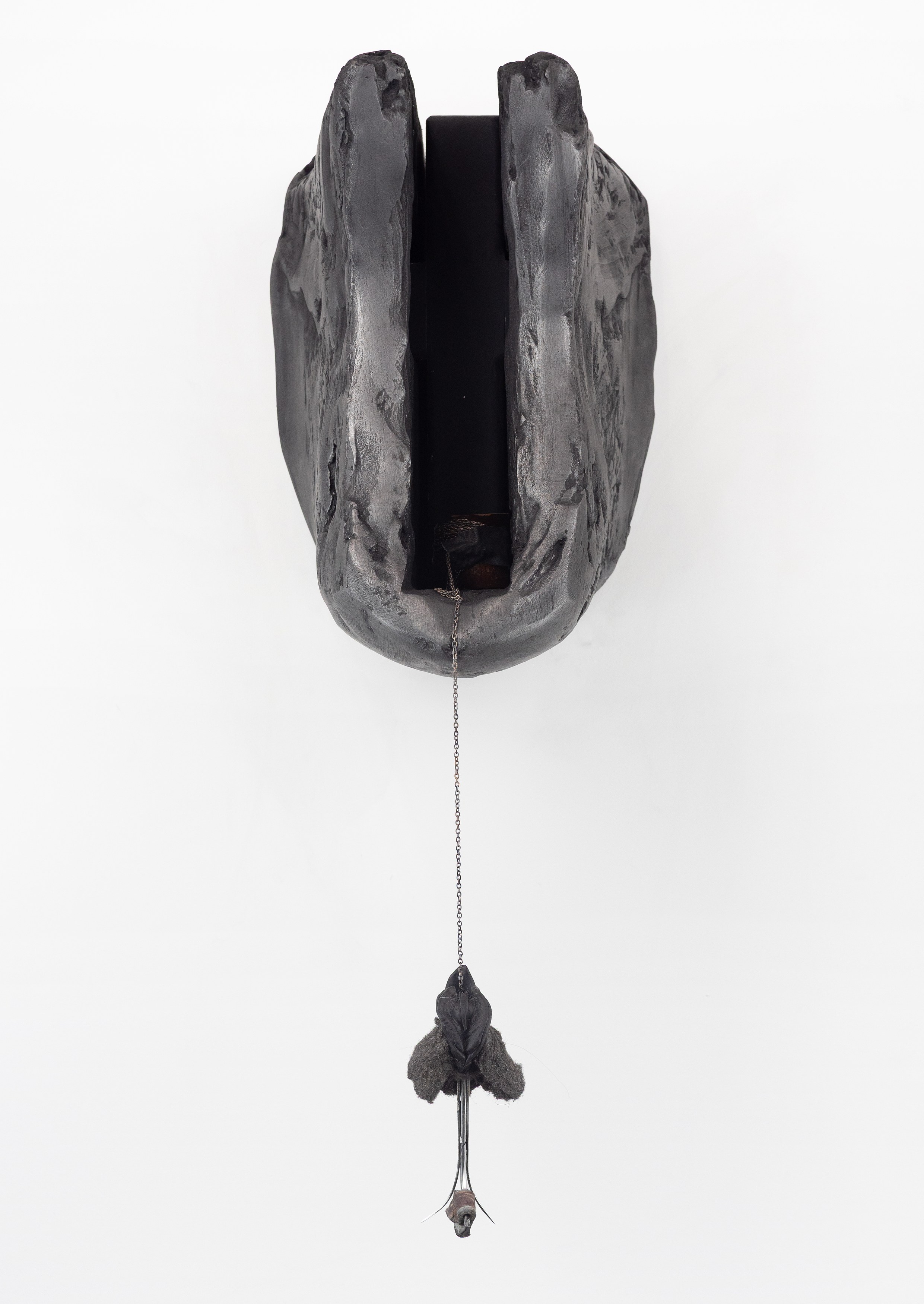 At the entrance to the gallery, visitors are greeted with a takeaway card that reads: “That we are capable only of being what we are remains our unforgivable sin.” The text is from The Claw of the Conciliator, the second volume in American writer Gene Wolfe’s four-part science fiction series, The Book of the New Sun. With this phrase in mind, the works in the exhibition begin to take shape, creating an aura of foreboding, mystery, and intrigue. Within the gallery, Geronimas has installed nineteen wall mounted sculptures around the perimeter of the room, surrounding the exposed ceiling beams and adjoining joists original to the gallery’s 1947 building. Conceived in response to the architectural hardware, his new series of Custom Joist Hanger Cover and Lures are detailed in their ornamentation and decidedly handmade, belying traditional function and mass utility. Each sculpture is composed…