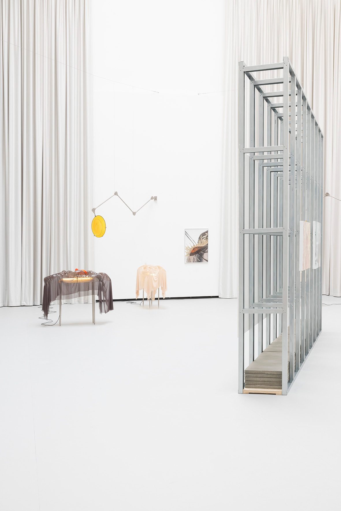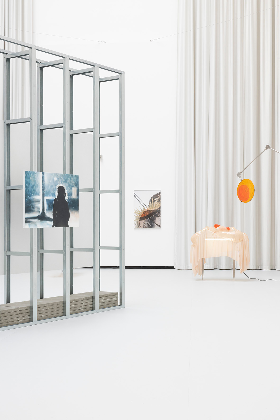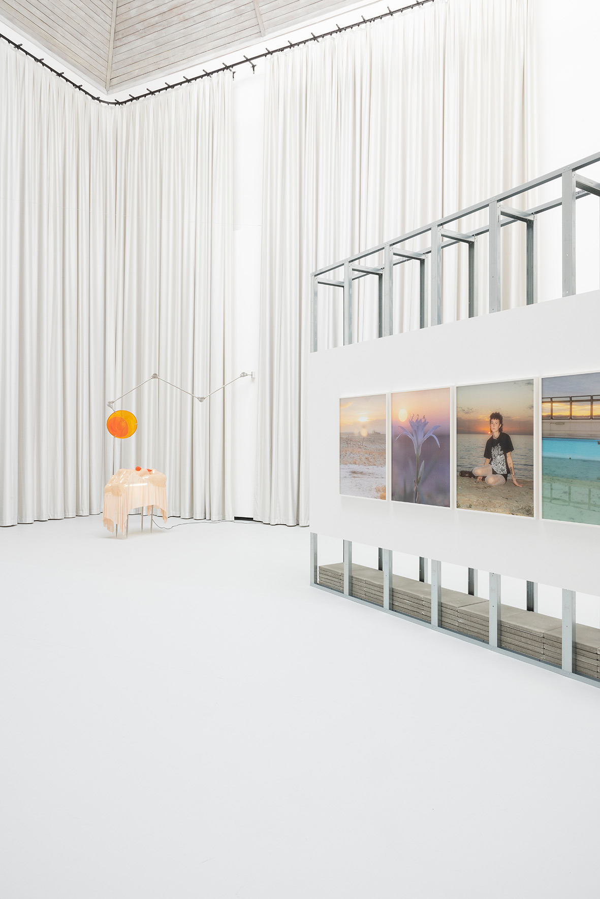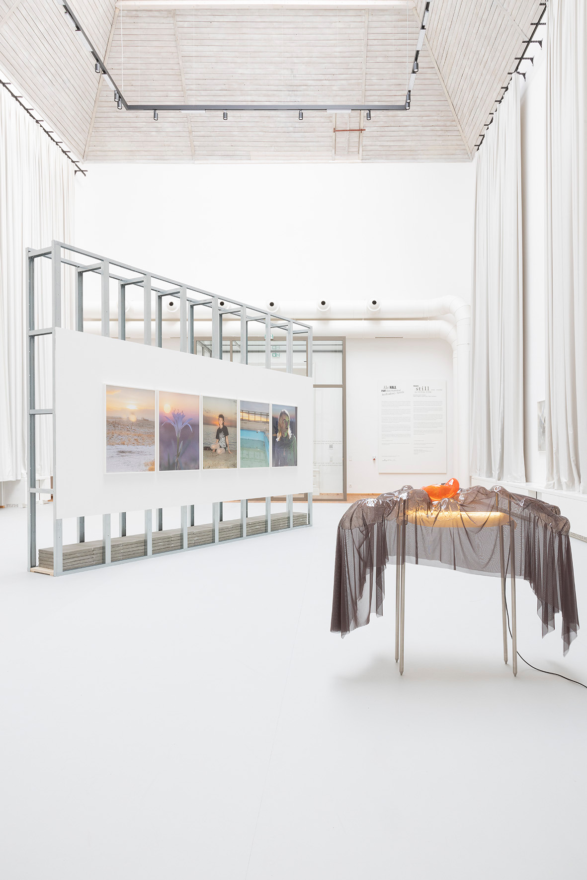 The ceiling of THE HALL, far above, leaves space for a light in which there is permanence – a light evenly diffused, entering the space from above and settling softly across walls and objects. There is a grey linoleum floor, quite hostile, amplifying the feeling of not lingering too long. This is the room in which you are standing.