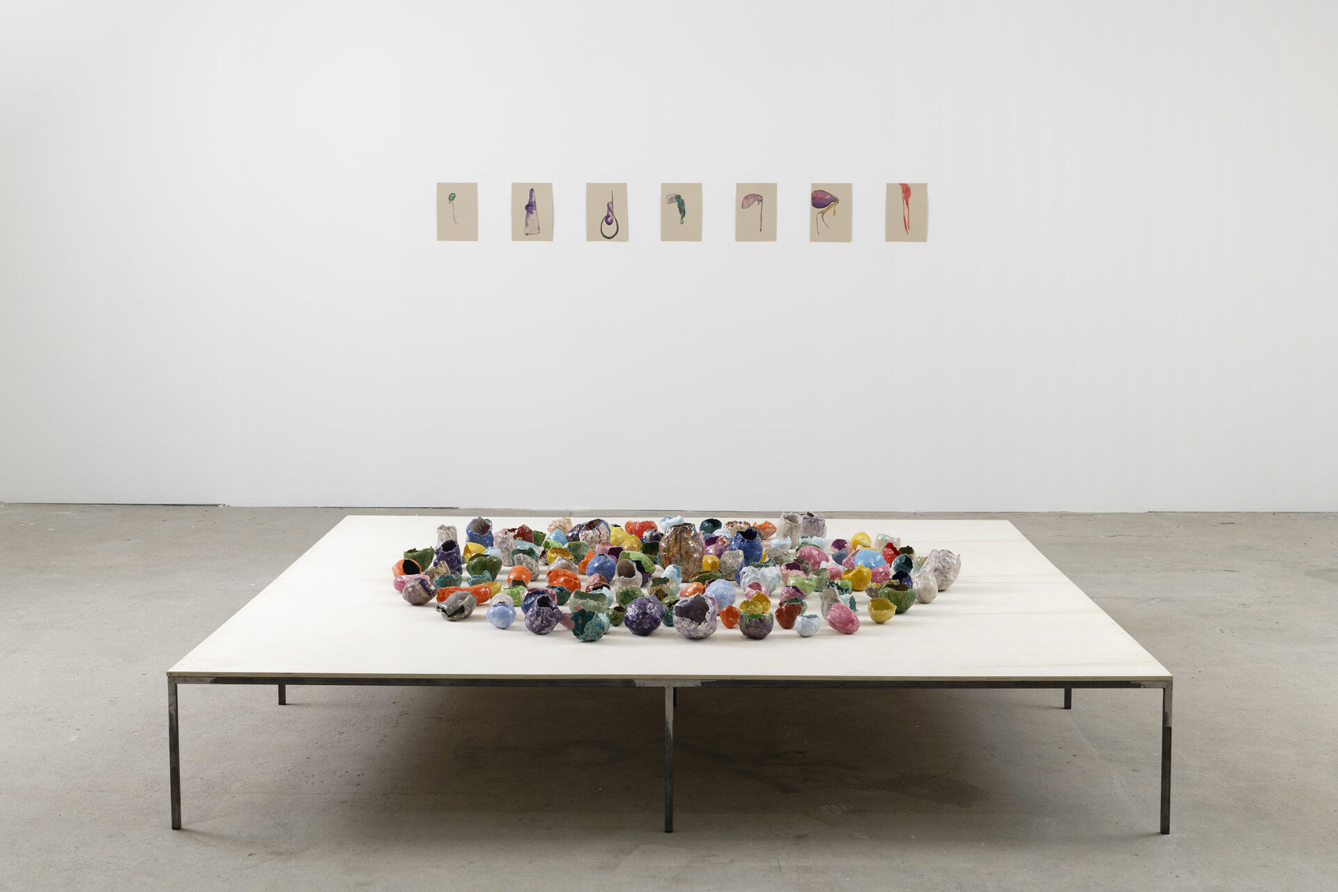 The body of works presented in the Passerelle patio has been entitled ‘Menhirs’ by the artist. Ciacciofera is fascinated by megalithic art, yet decided to work from fragile, modest materials, essentially workshop waste including paper and cardboard, the very opposite of the eternity of stone. In this sense this series recalls the work of the Arte…