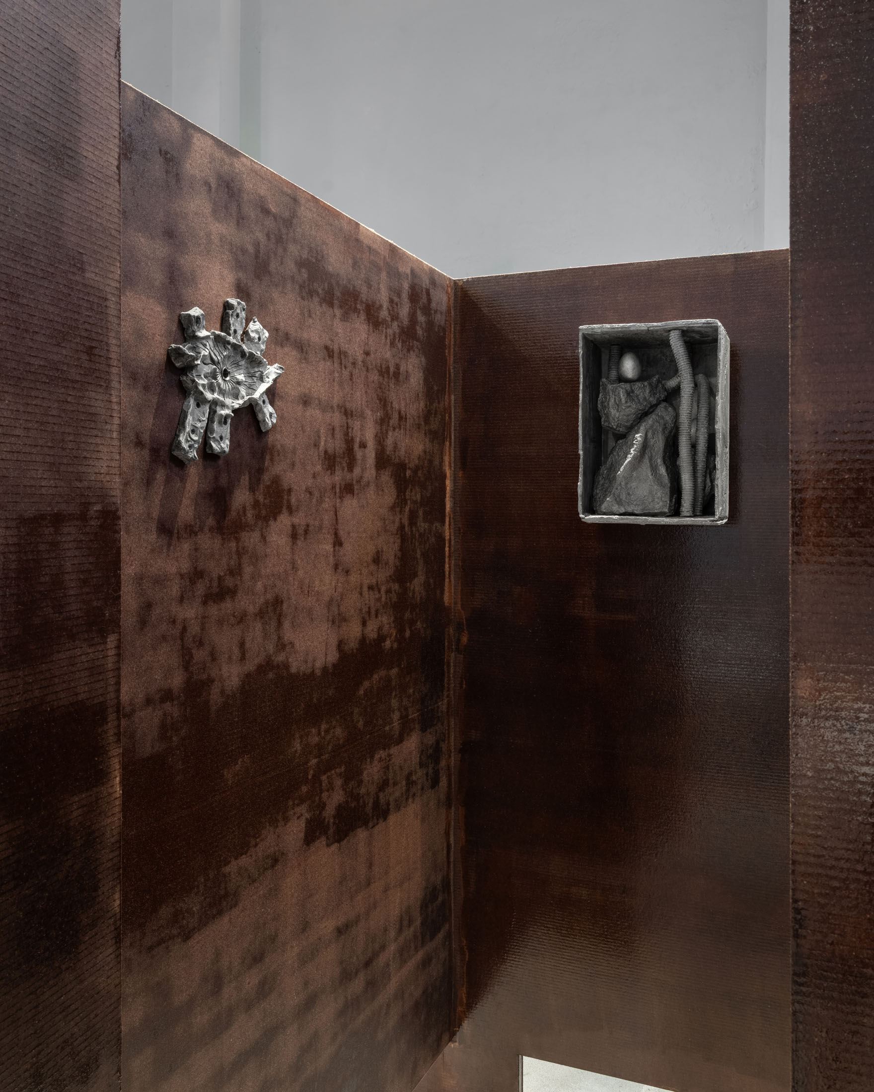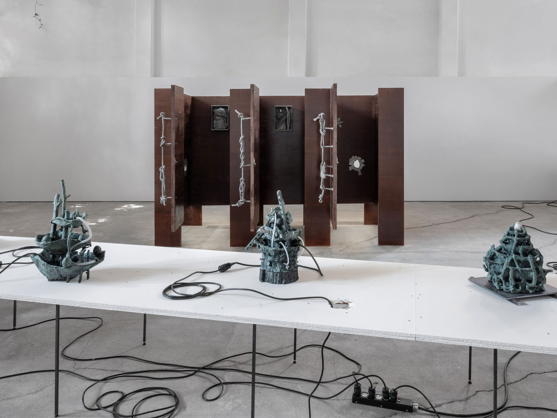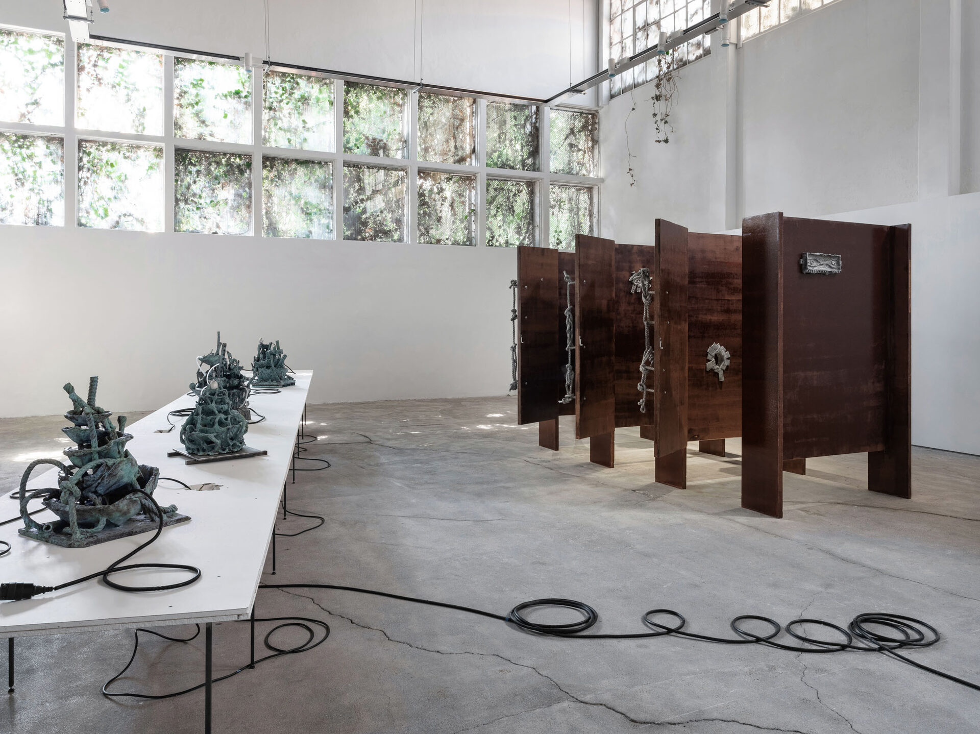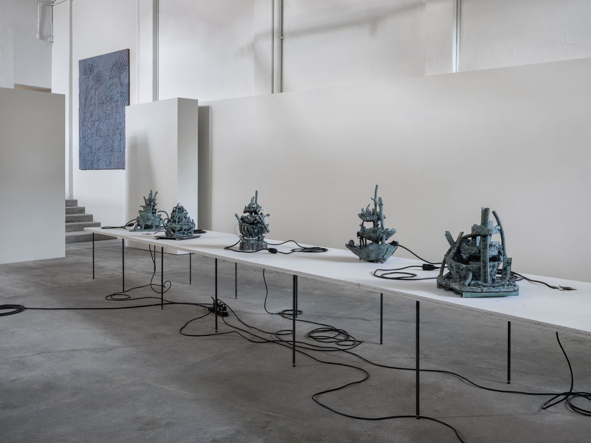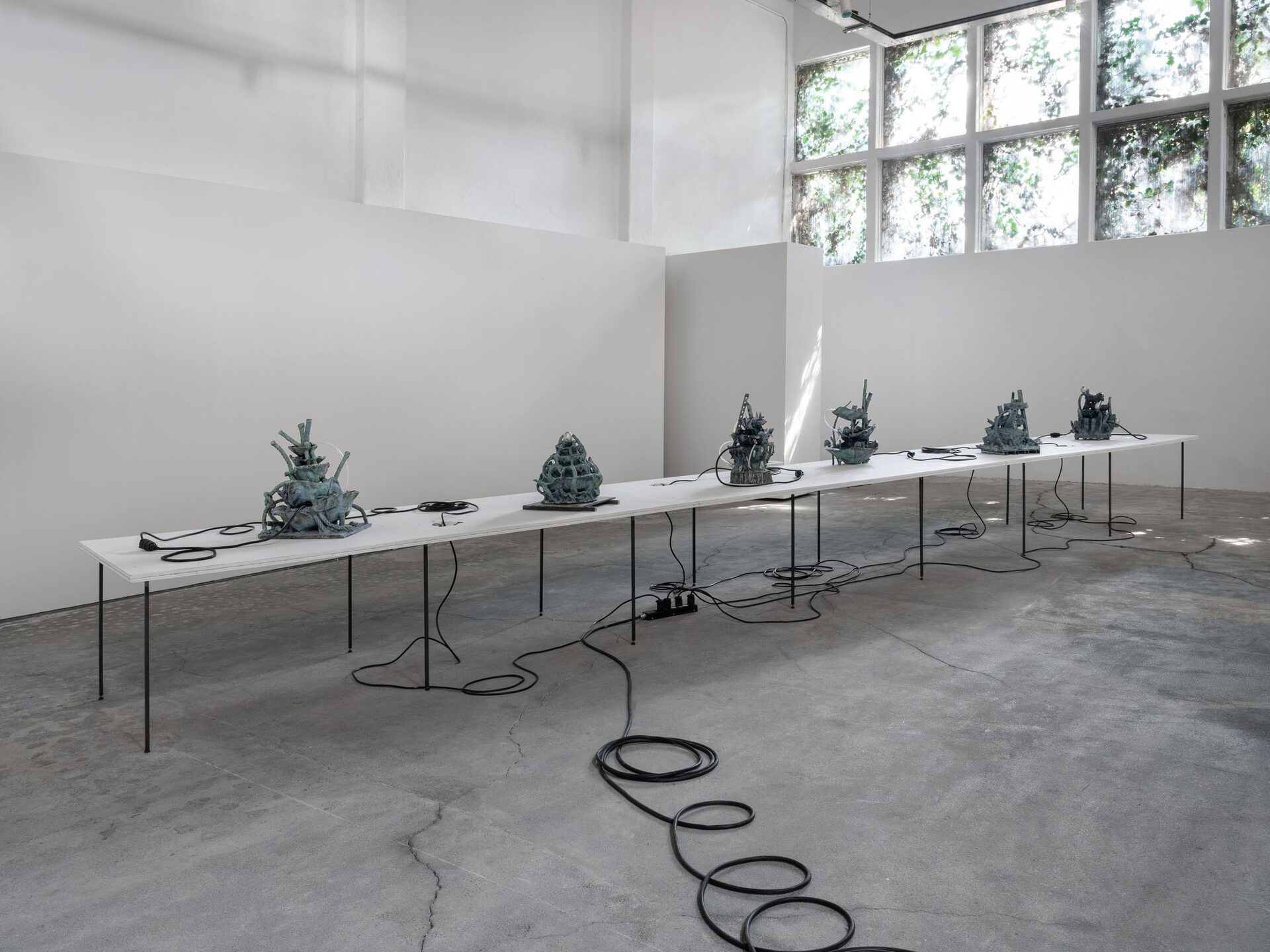 The more cursed everything appears, the more we look at the persistence of myth, ritual and superstition, the manifold human practices of grasping at agency through rites and customs even in our technologically deterministic present: why do we still throw coins into fountains? Our superstitious spirit ebbs as we grow ever more distant from the temperamental rain that could suffocate the crops and engorge the rivers to disastrous width; and it flows as we crawl closer to enduring a horizon full of similarly catastrophic weather. This show is then an alloy, mixing together the deep past and the uncertain future to represent a current moment that continuously gets harder, tougher, impossible to break out of.