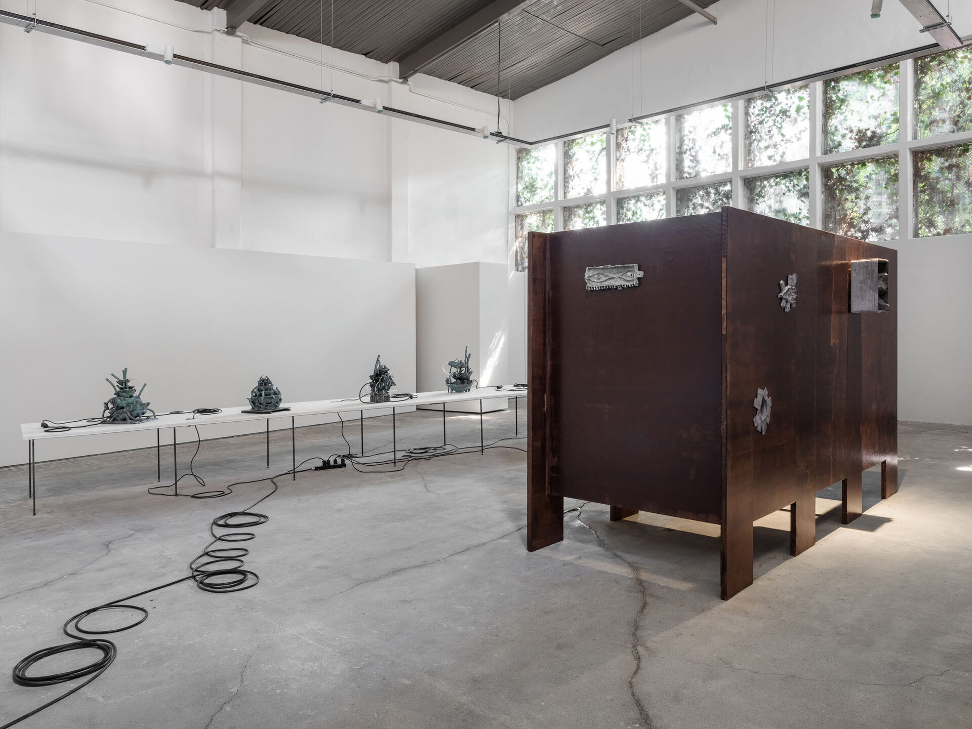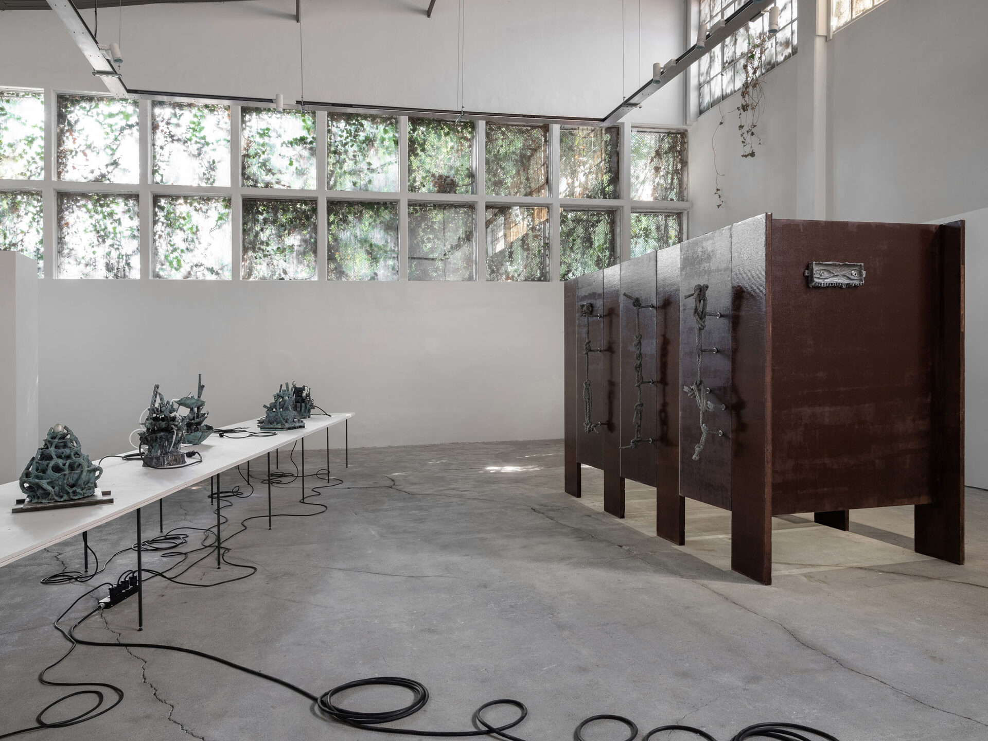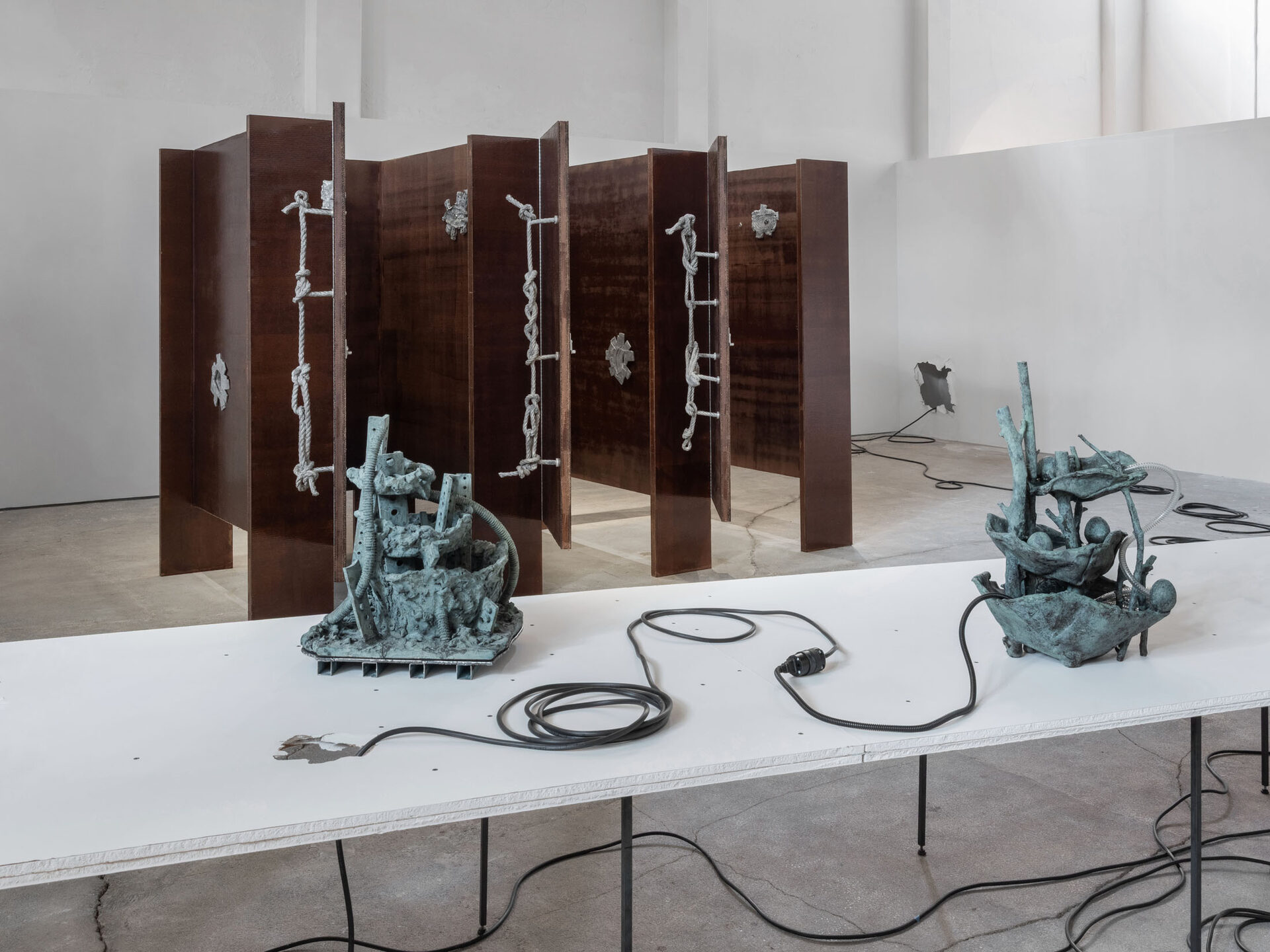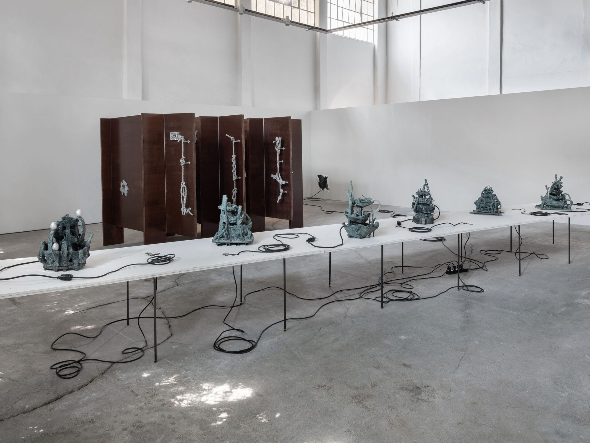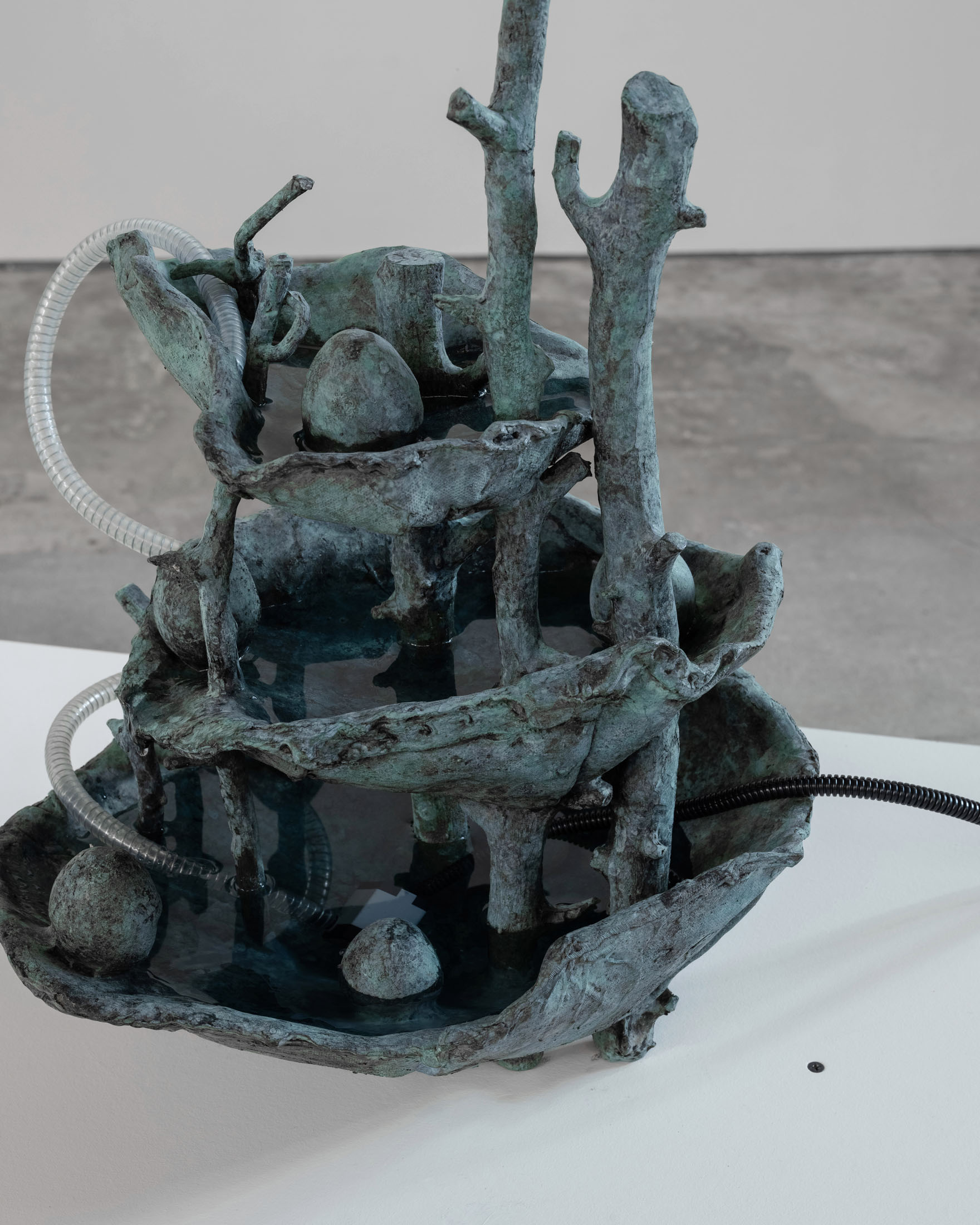 The more cursed everything appears, the more we look at the persistence of myth, ritual and superstition, the manifold human practices of grasping at agency through rites and customs even in our technologically deterministic present: why do we still throw coins into fountains? Our superstitious spirit ebbs as we grow ever more distant from the temperamental rain that could suffocate the crops and engorge the rivers to disastrous width; and it flows as we crawl closer to enduring a horizon full of similarly catastrophic weather. This show is then an alloy, mixing together the deep past and the uncertain future to represent a current moment that continuously gets harder, tougher, impossible to break out of.