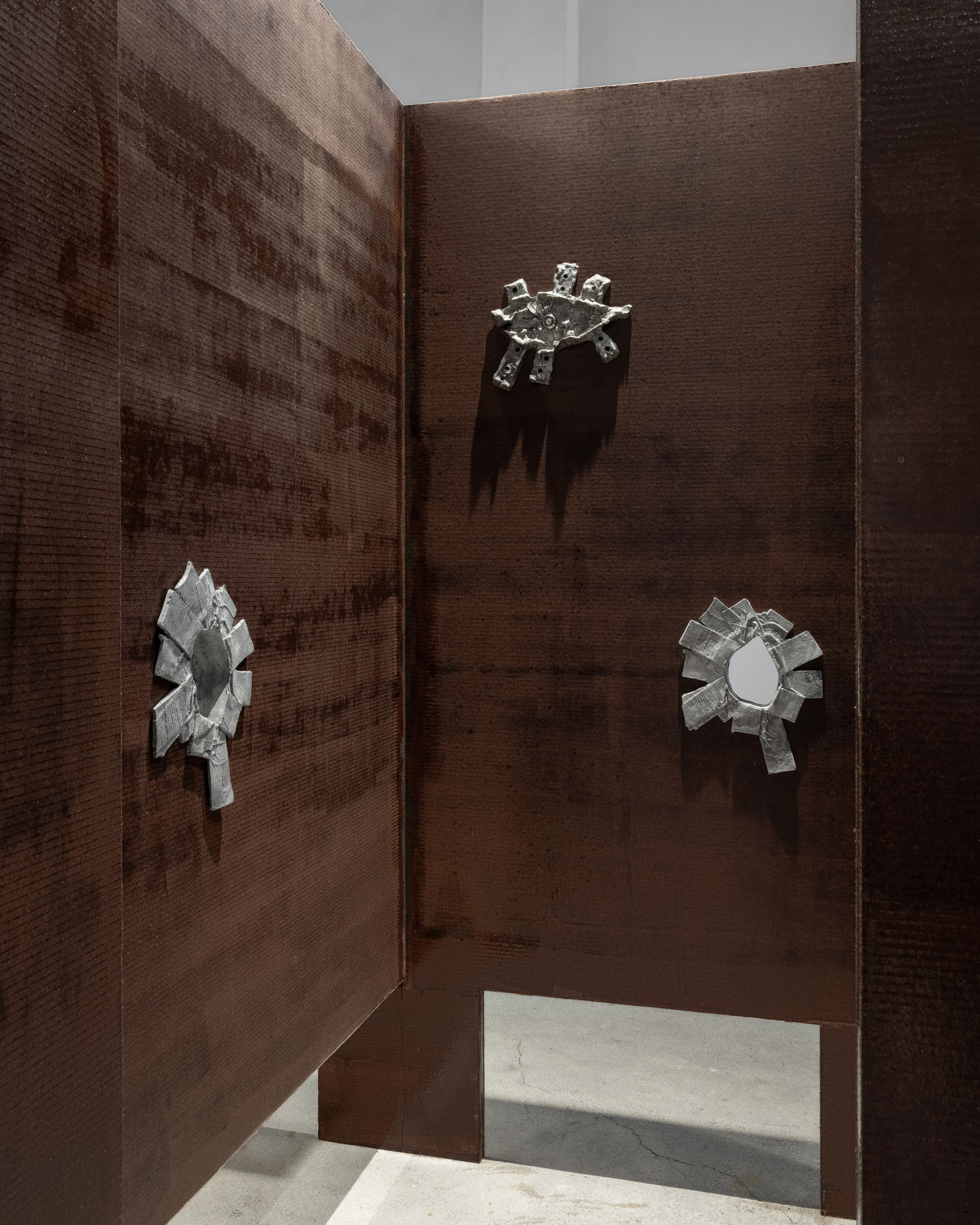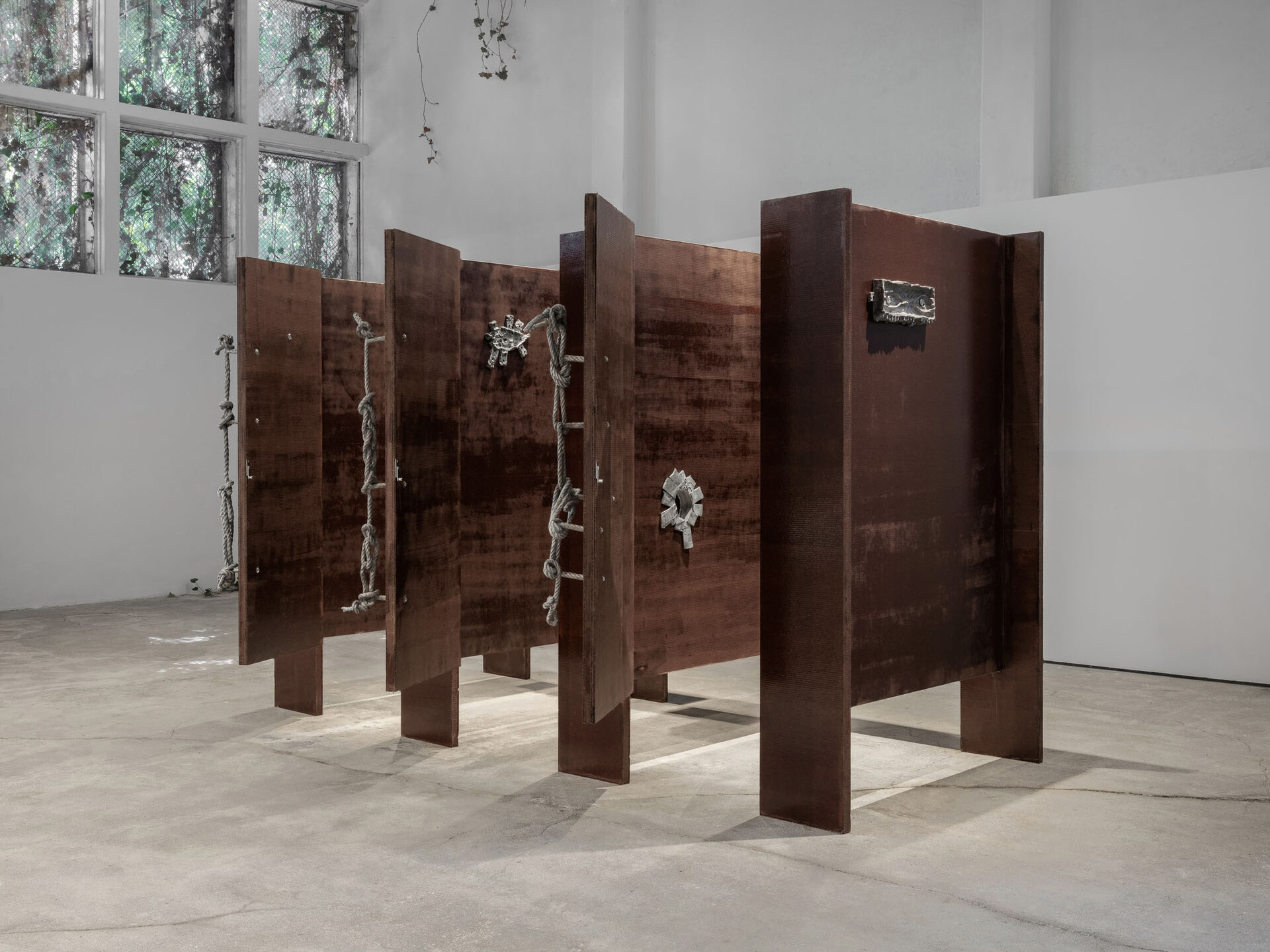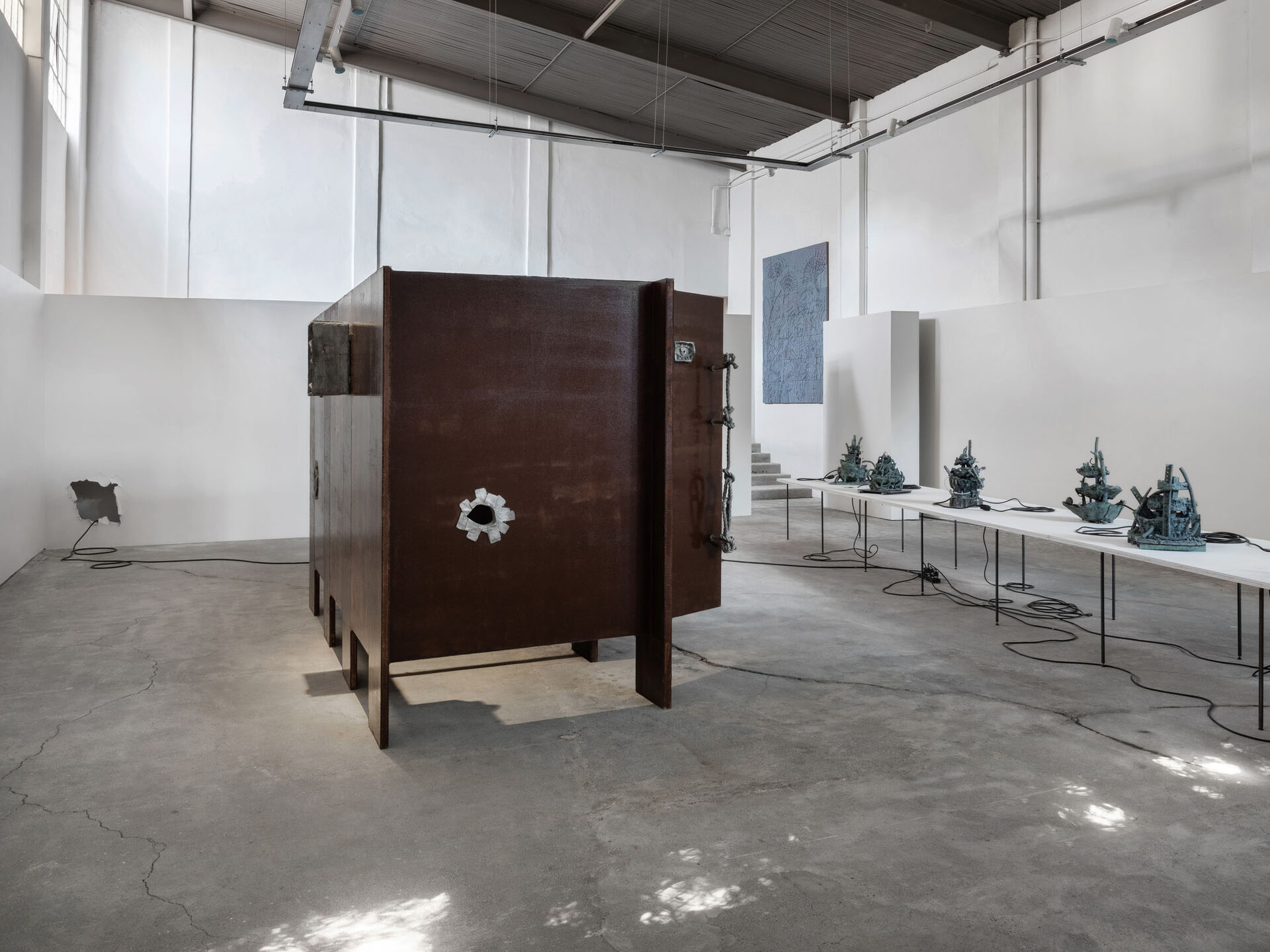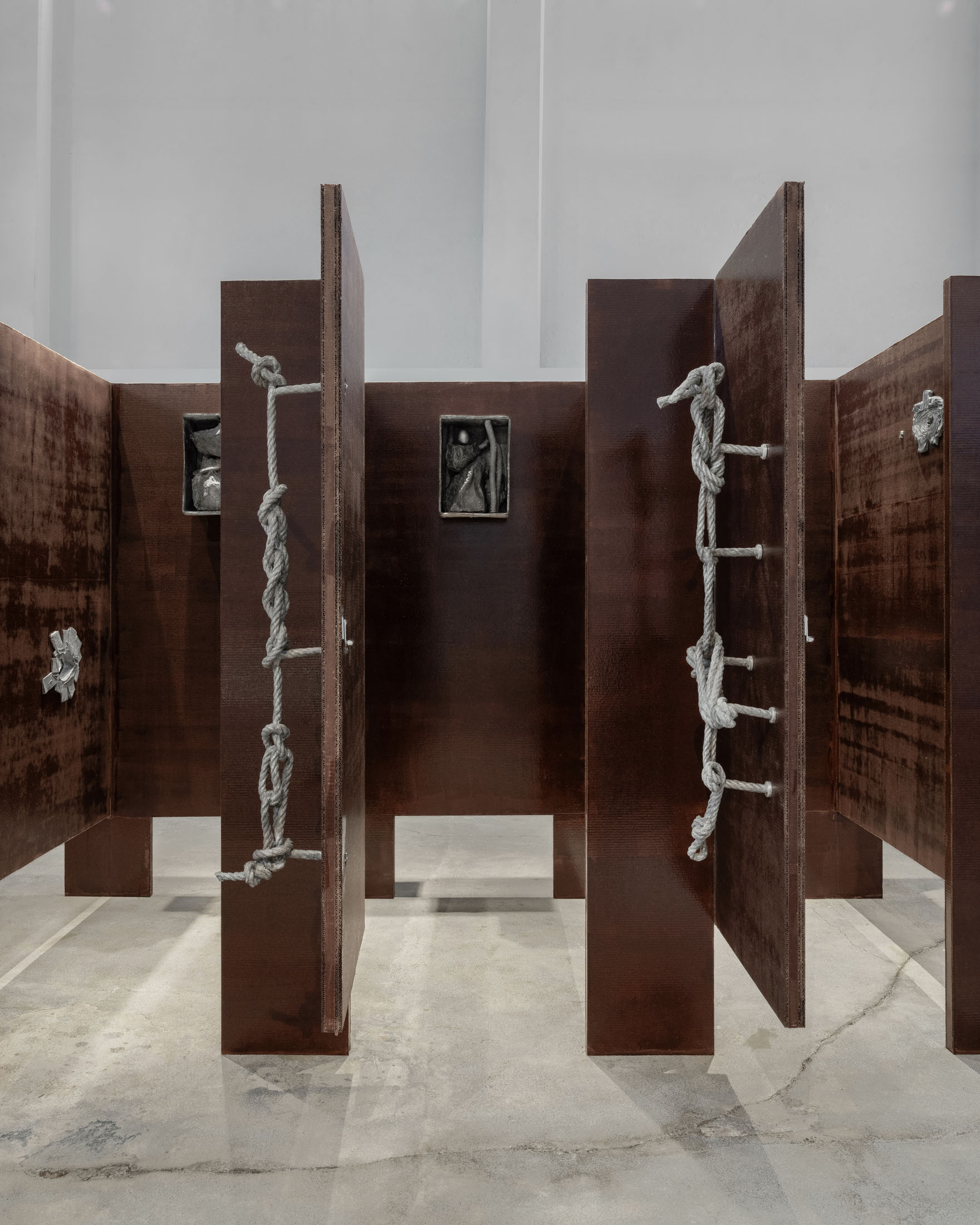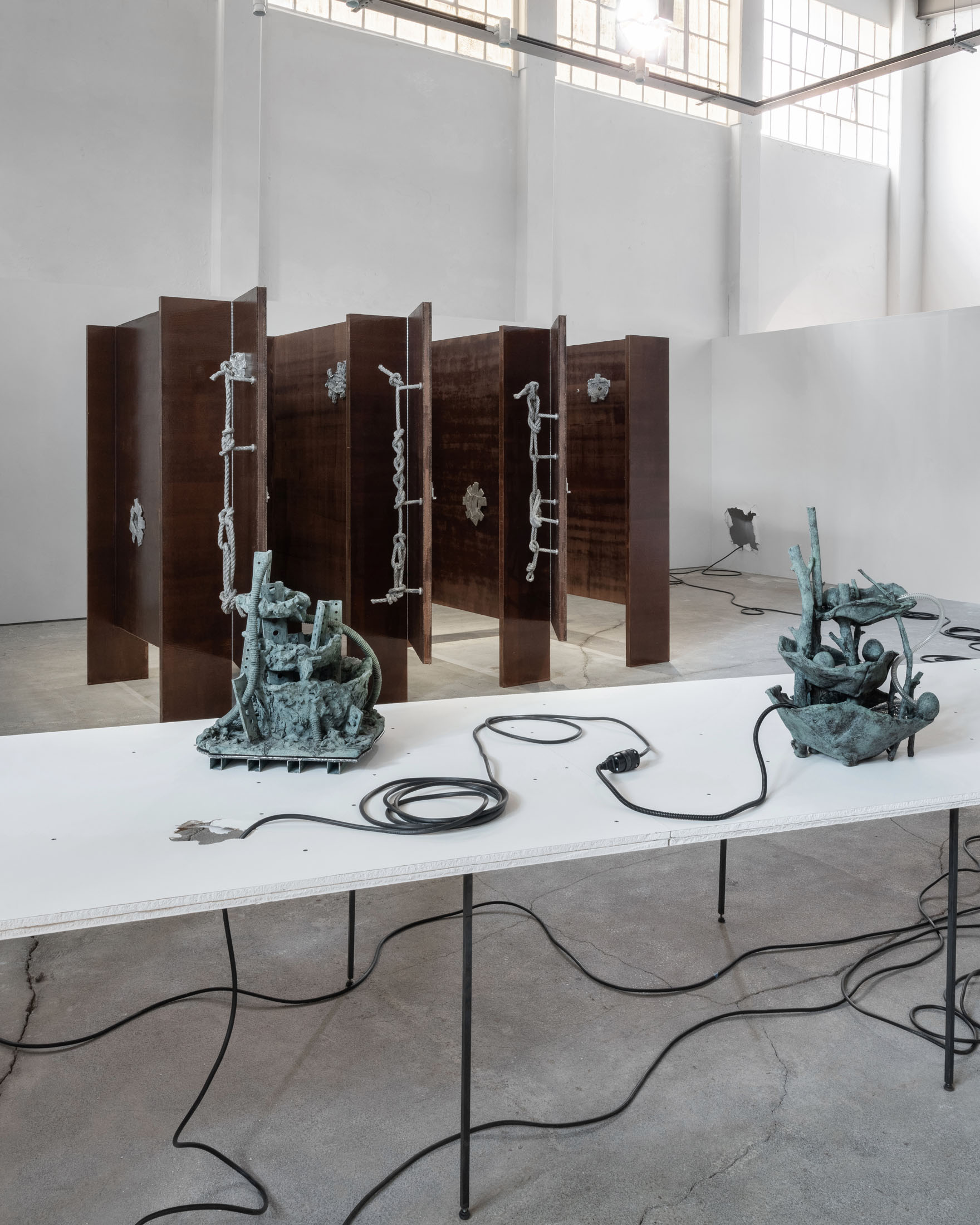 The more cursed everything appears, the more we look at the persistence of myth, ritual and superstition, the manifold human practices of grasping at agency through rites and customs even in our technologically deterministic present: why do we still throw coins into fountains? Our superstitious spirit ebbs as we grow ever more distant from the temperamental rain that could suffocate the crops and engorge the rivers to disastrous width; and it flows as we crawl closer to enduring a horizon full of similarly catastrophic weather. This show is then an alloy, mixing together the deep past and the uncertain future to represent a current moment that continuously gets harder, tougher, impossible to break out of.