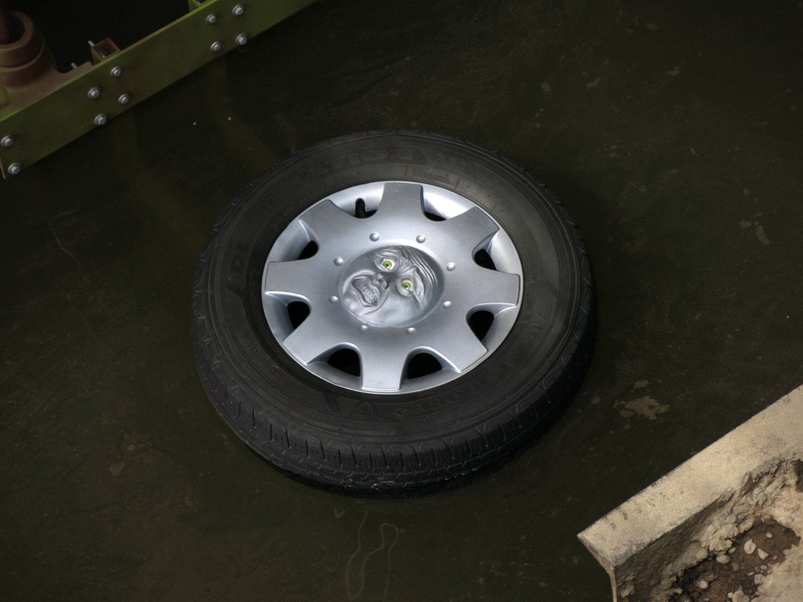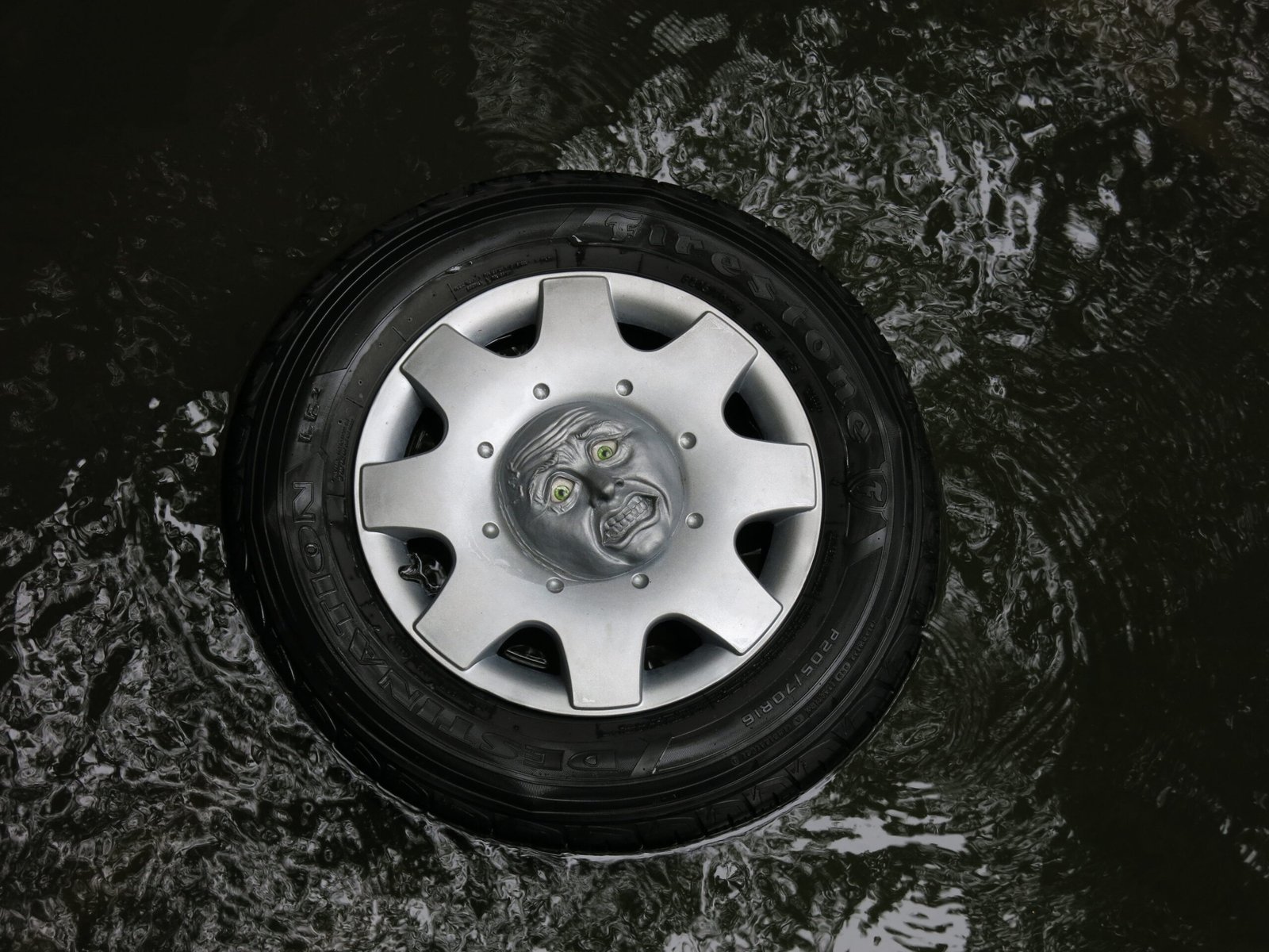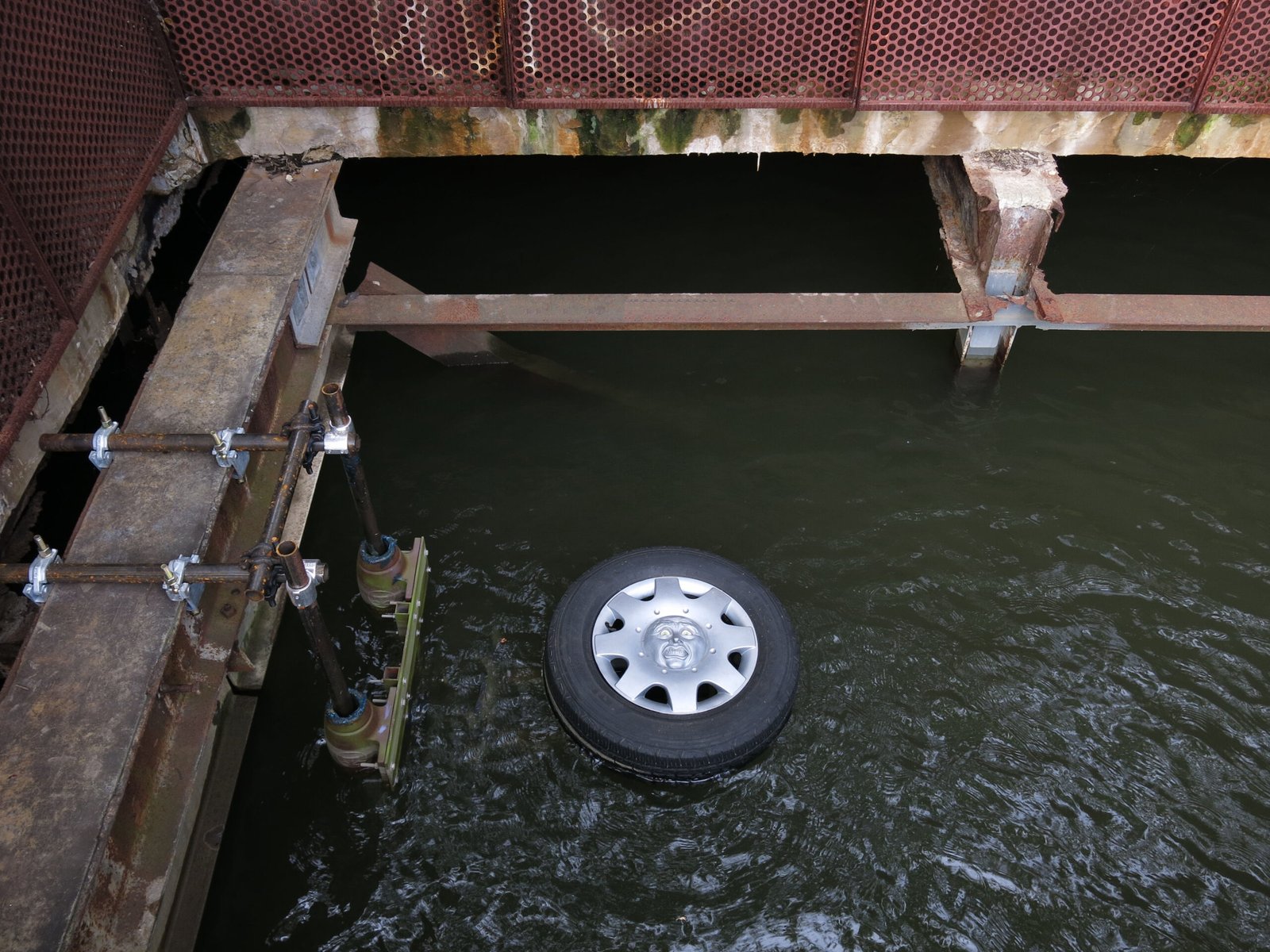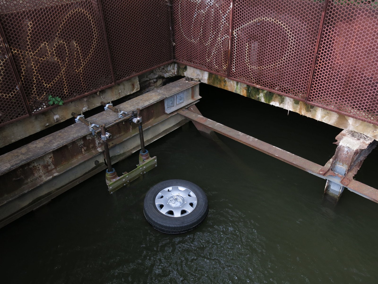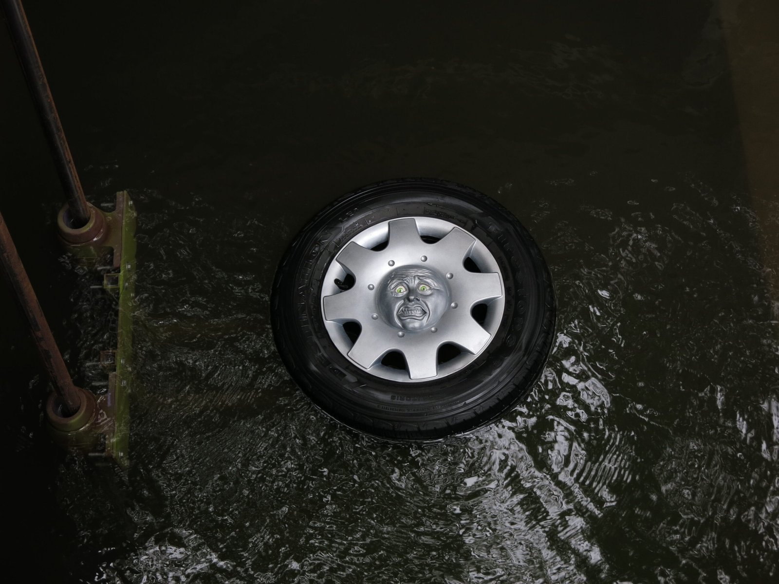 Mondo Cane is a site-specific sculptural installation on Philadelphia’s Delaware River at the Race Street Pier. Challenging the conventions of public artworks, it is quasi-concealed within a designed void in the pier’s structure, framing a floating tire with an anthropomorphic hubcap bearing a worried grimace, cast adrift in the river, nearly submerged. “Mondo cane” is an Italian curse translating to “a dog’s world,” inferring a period of struggle or difficulty. Exploring pathos, callousness, and spectacle, the installation challenges the viewer’s response to anxiety in a time of reactionary change and increasing uncertainty.