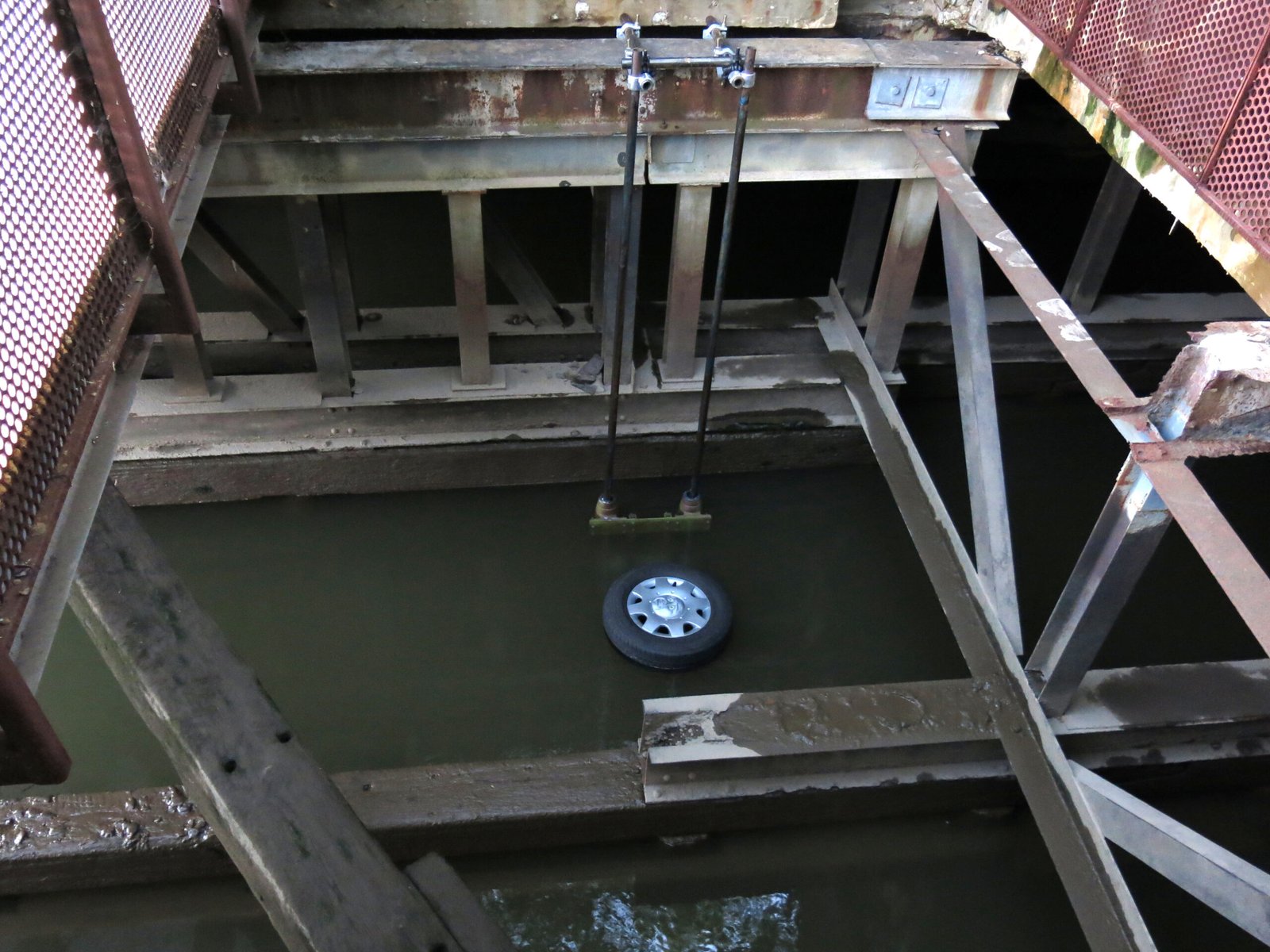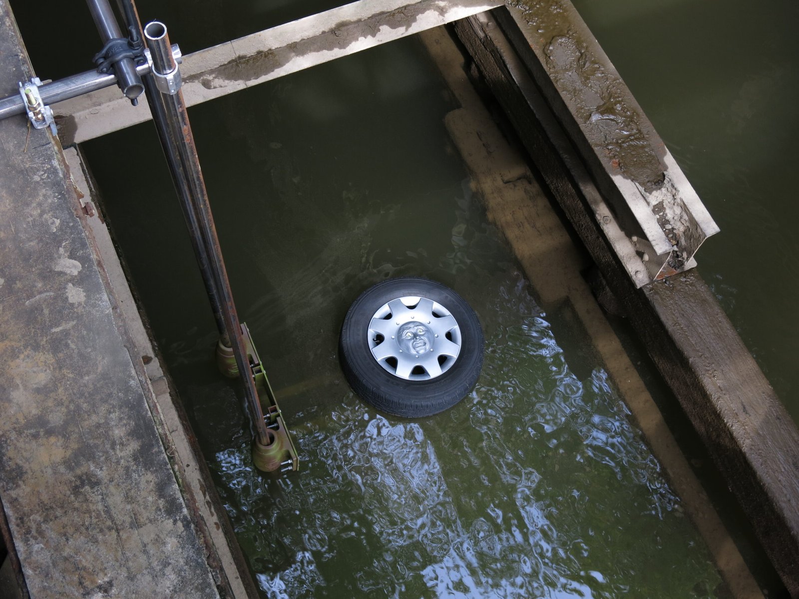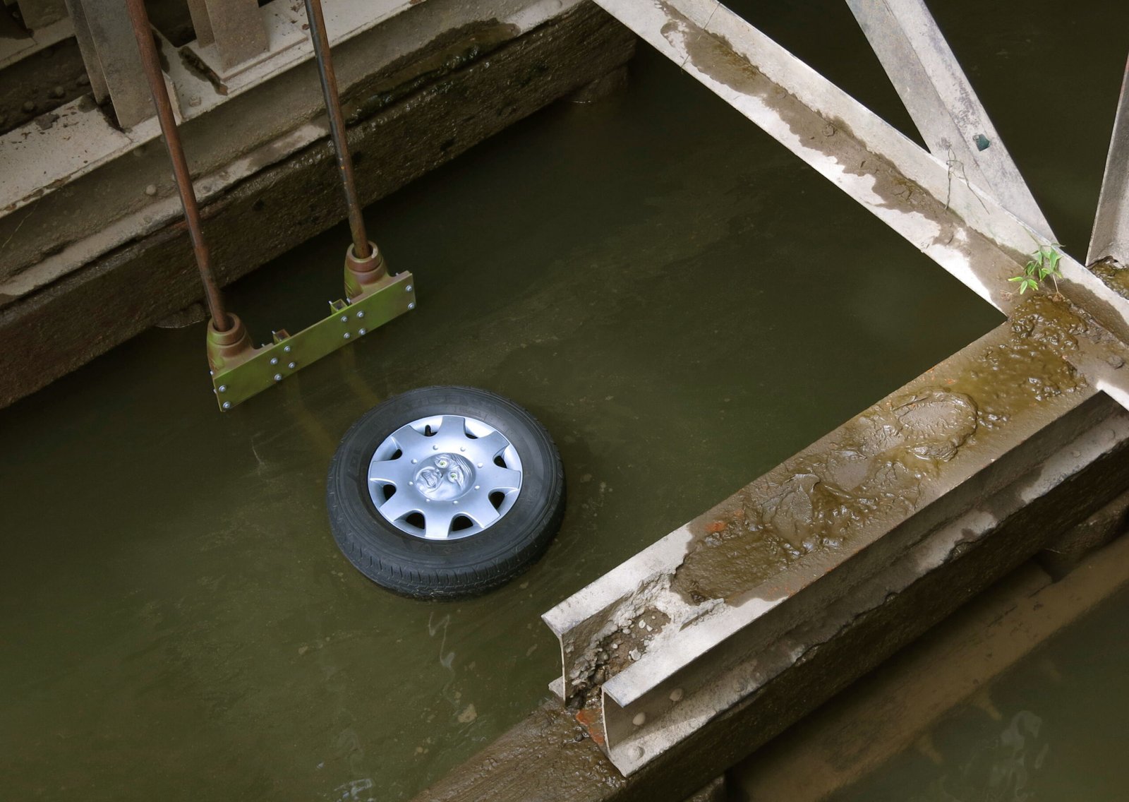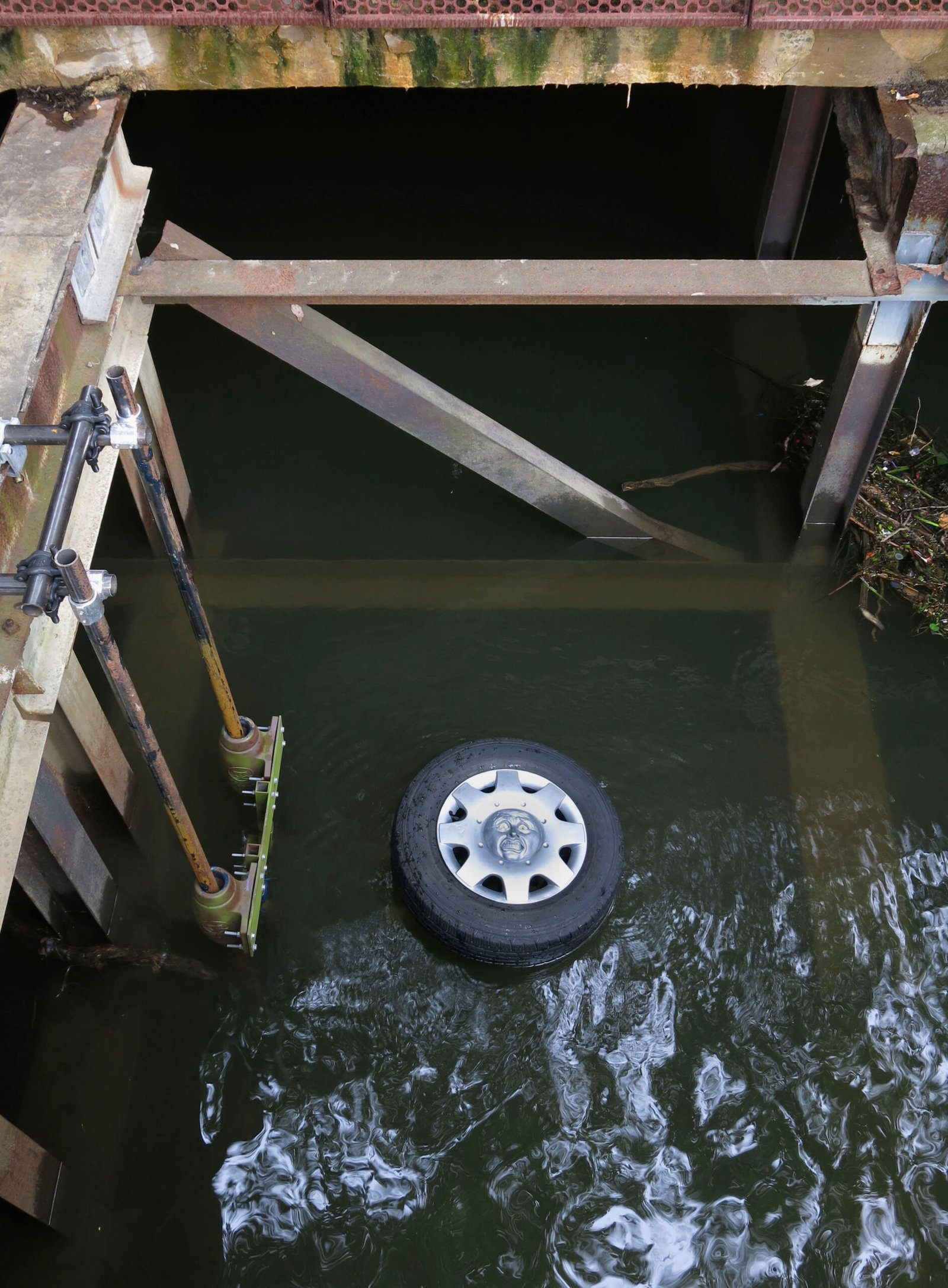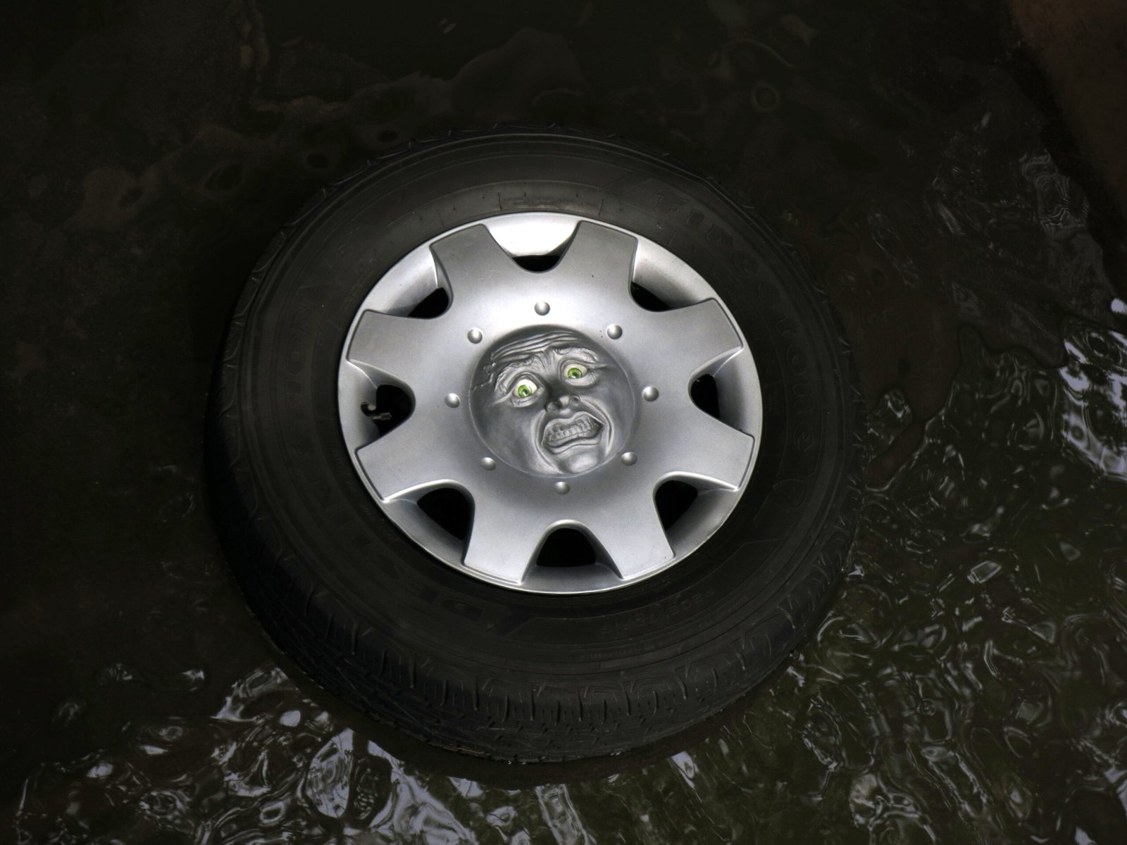 Mondo Cane is a site-specific sculptural installation on Philadelphia’s Delaware River at the Race Street Pier. Challenging the conventions of public artworks, it is quasi-concealed within a designed void in the pier’s structure, framing a floating tire with an anthropomorphic hubcap bearing a worried grimace, cast adrift in the river, nearly submerged. “Mondo cane” is an Italian curse translating to “a dog’s world,” inferring a period of struggle or difficulty. Exploring pathos, callousness, and spectacle, the installation challenges the viewer’s response to anxiety in a time of reactionary change and increasing uncertainty.