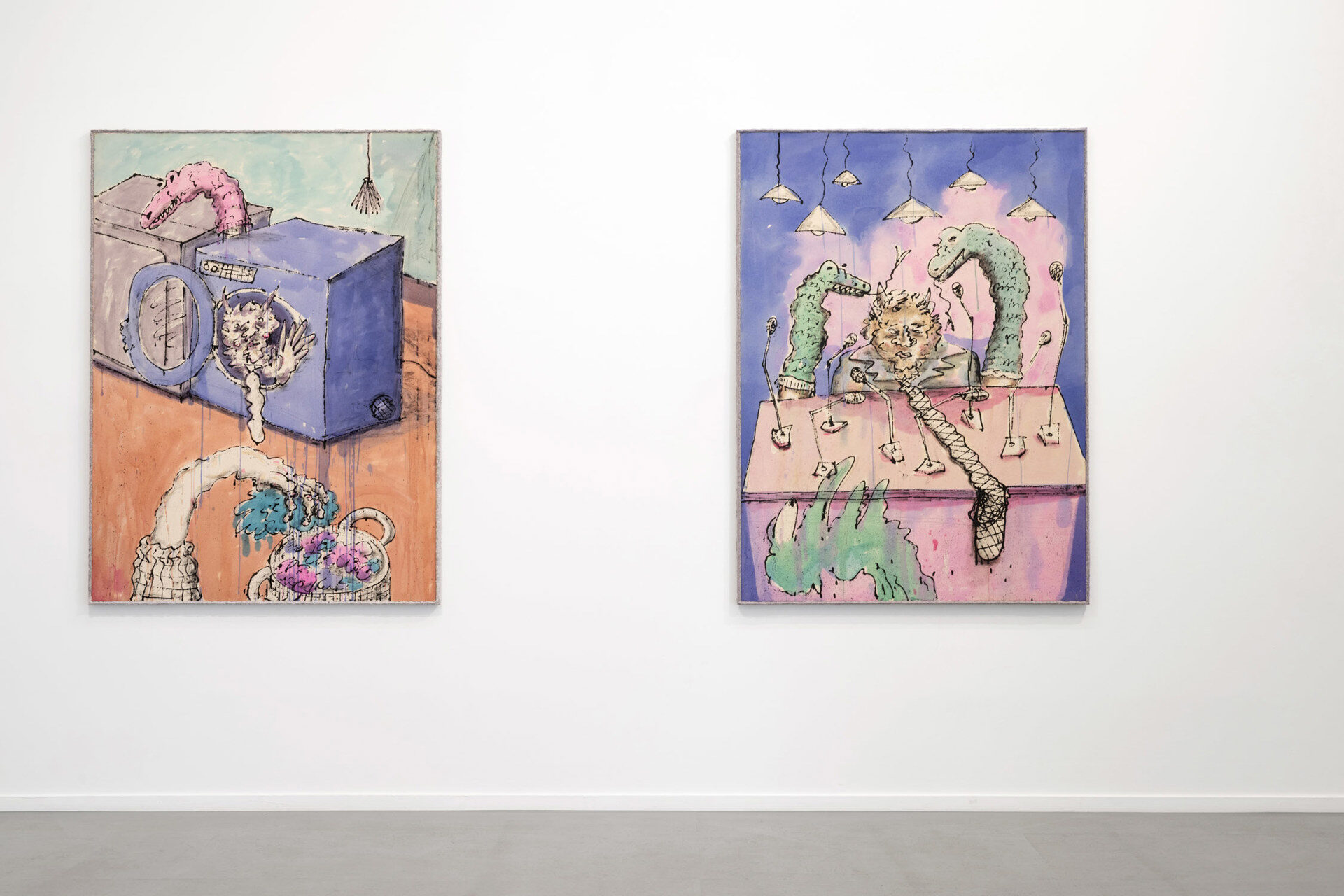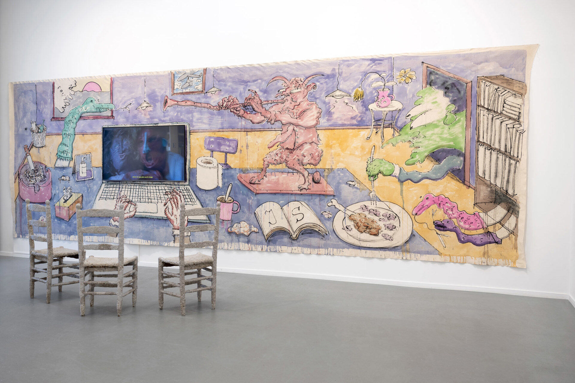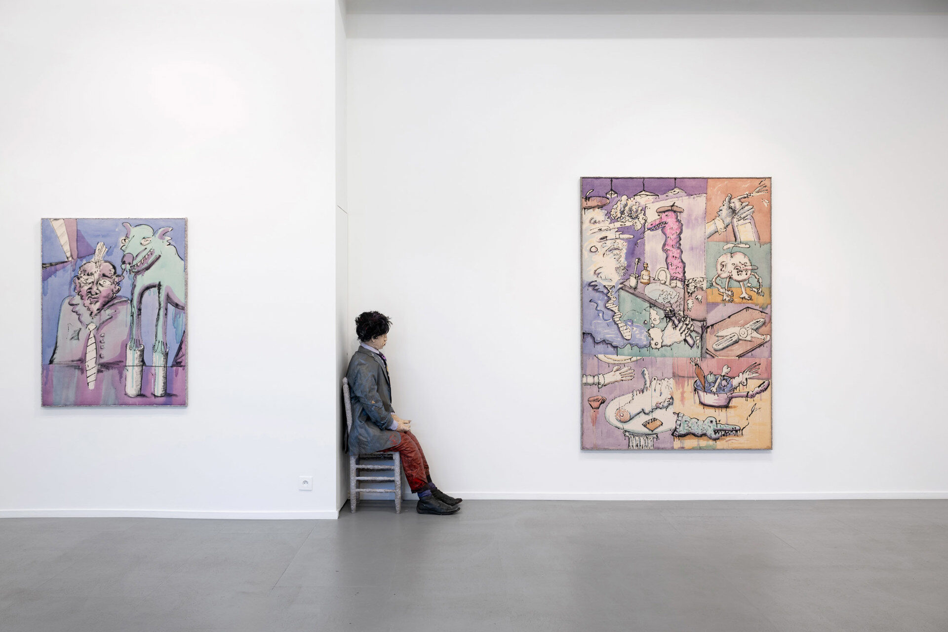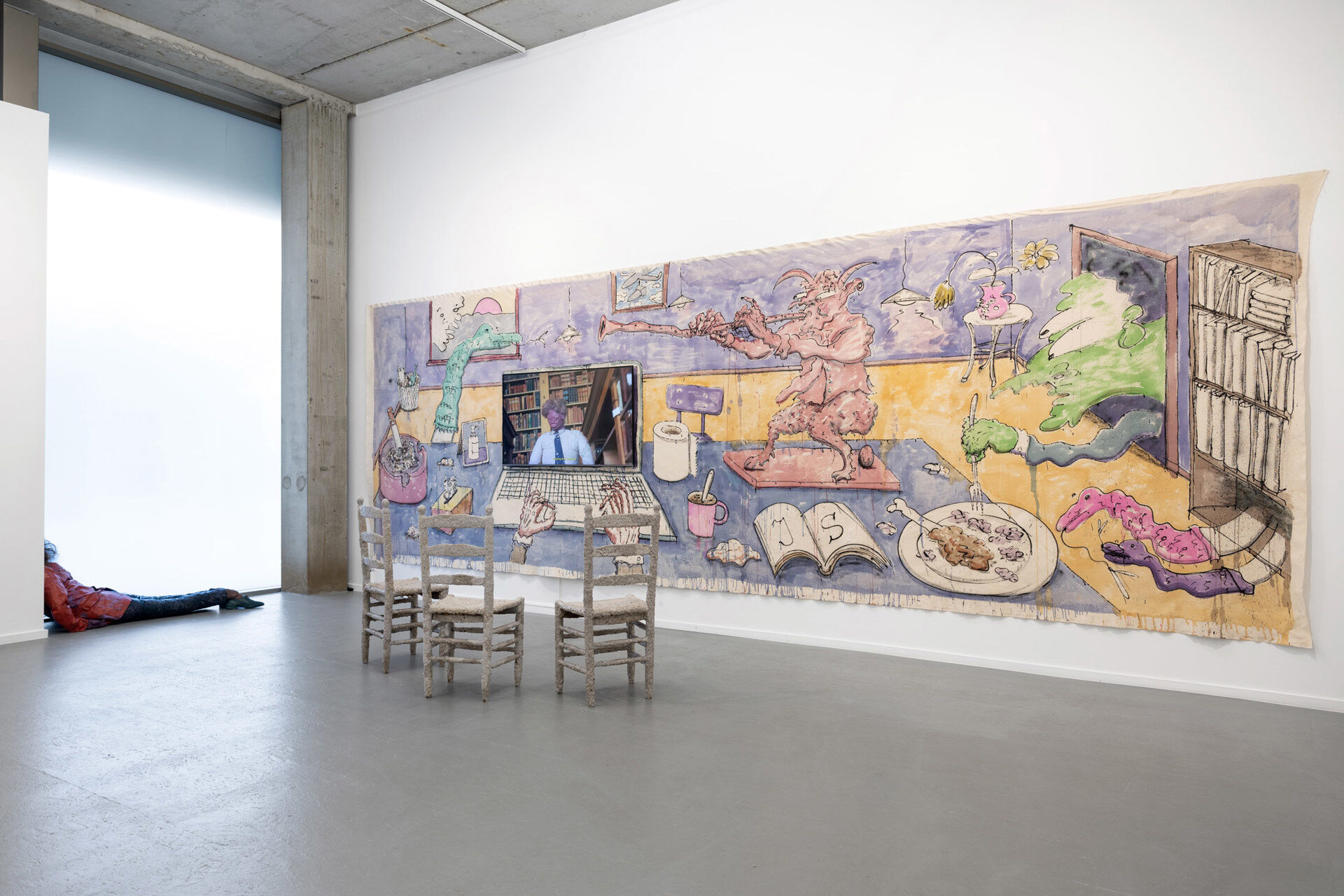 William Ludwig Lutgens (1991, Turnhout), two years after his last solo exhibition on Belgian soil, invites us into his world again, which has lately been populated by new and transformed archetypes. A man with devil ears and a tie stares before him while dragon-like hand puppets seem to conjure him. He embodies the hard-working, neoliberal achievement-subject that needs fantasies of success and money to avoid an overly harsh confrontation with reality.