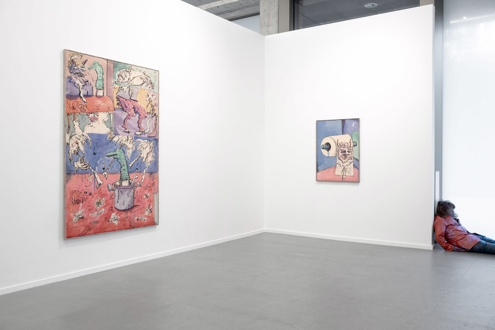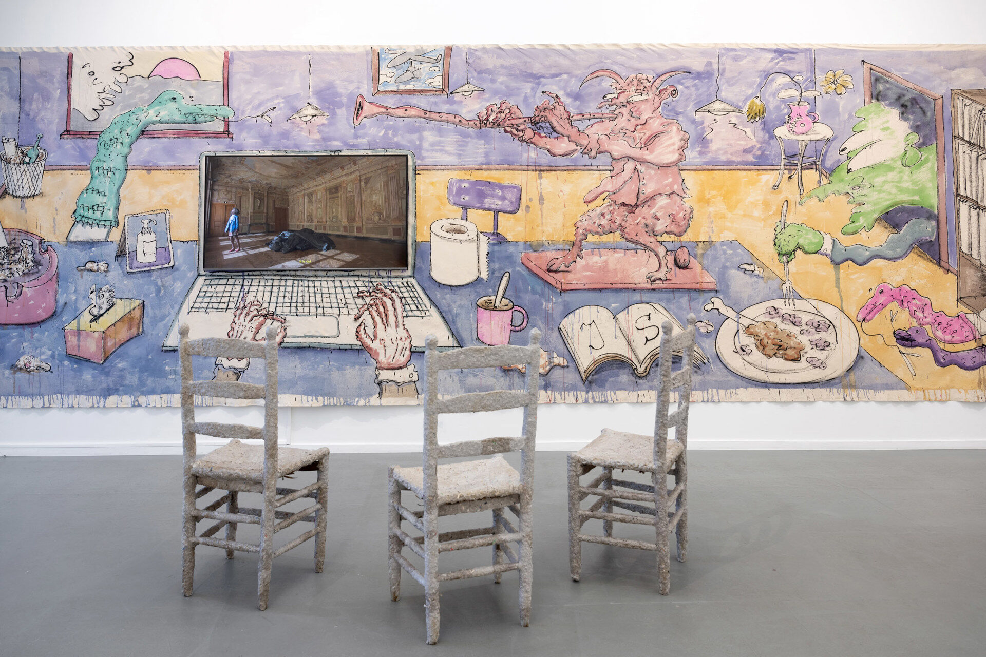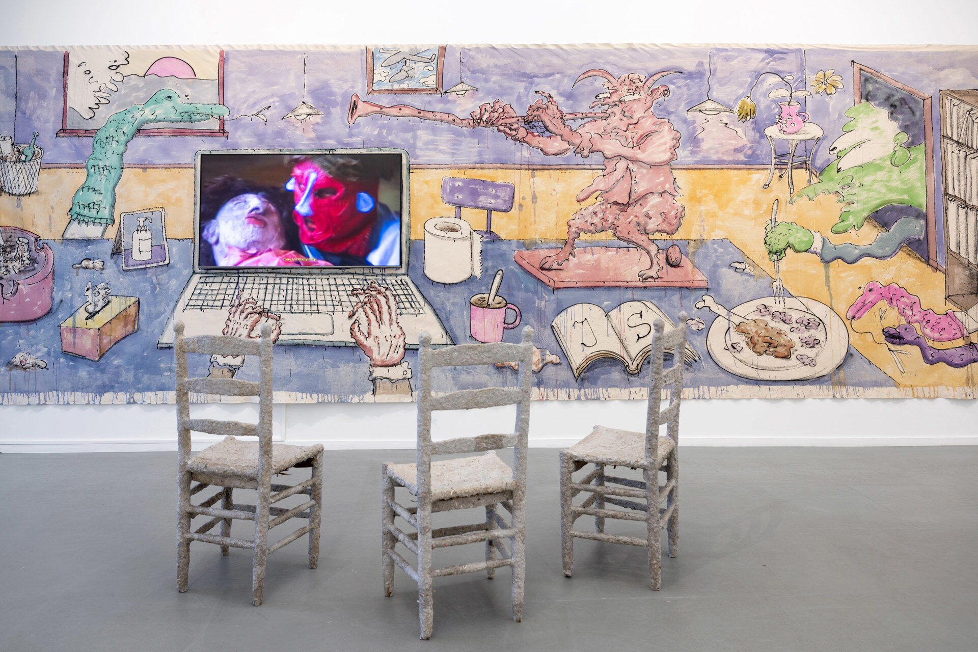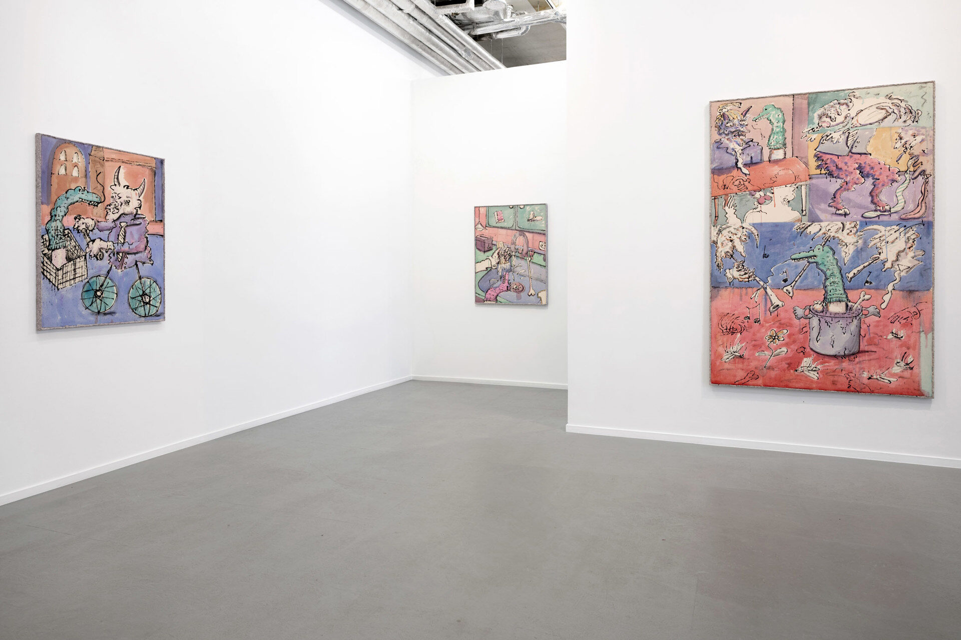 William Ludwig Lutgens (1991, Turnhout), two years after his last solo exhibition on Belgian soil, invites us into his world again, which has lately been populated by new and transformed archetypes. A man with devil ears and a tie stares before him while dragon-like hand puppets seem to conjure him. He embodies the hard-working, neoliberal achievement-subject that needs fantasies of success and money to avoid an overly harsh confrontation with reality.