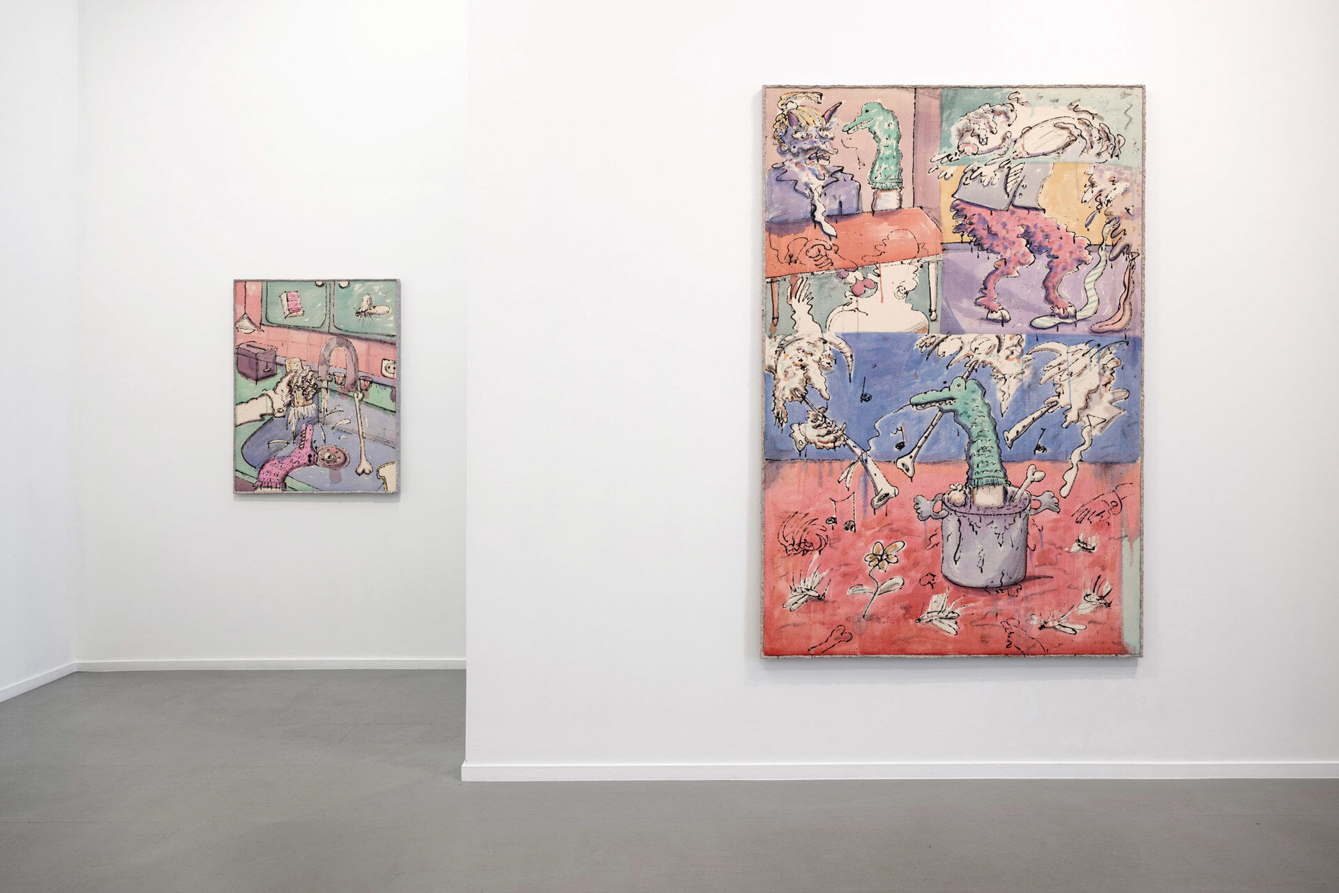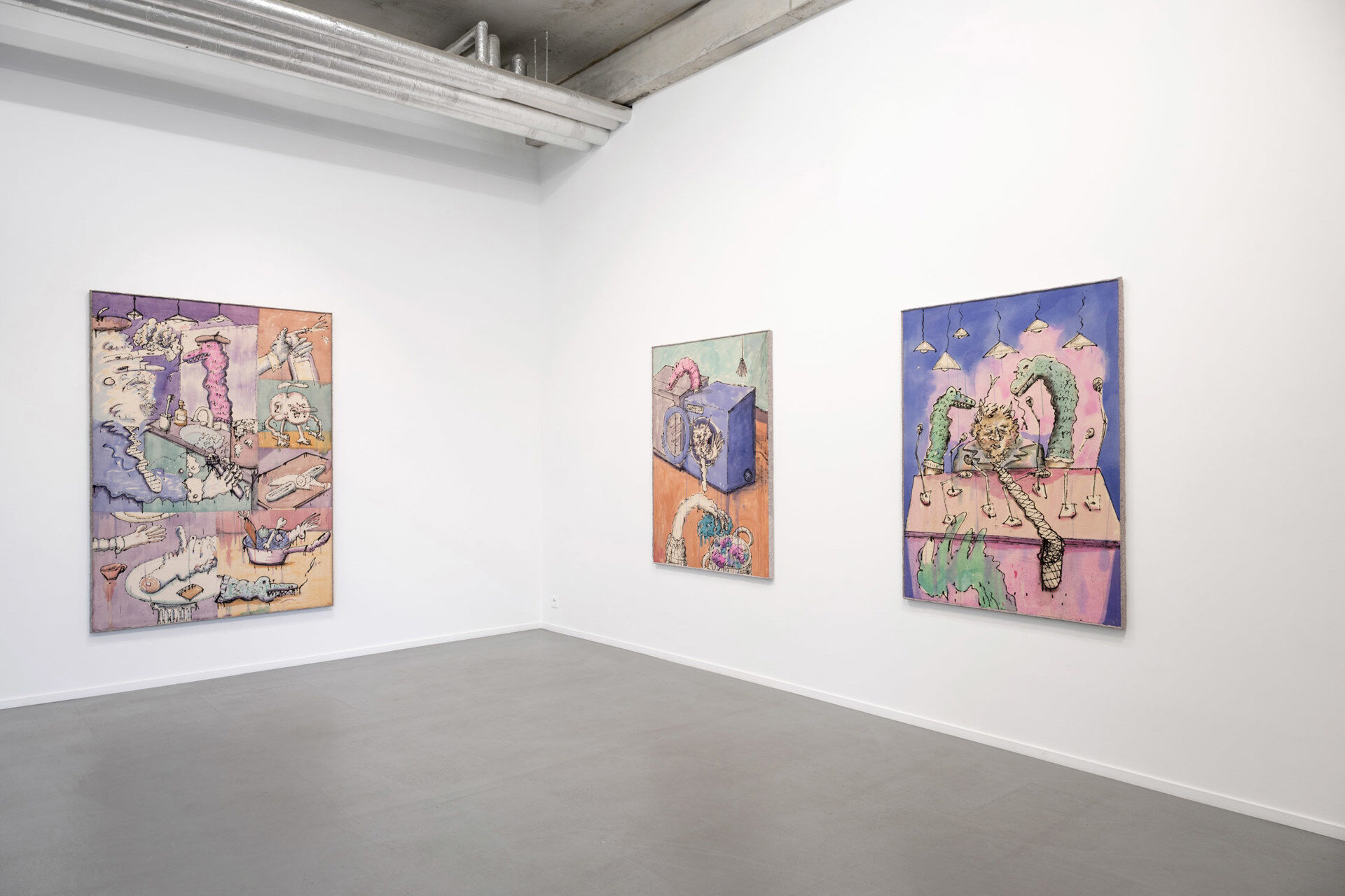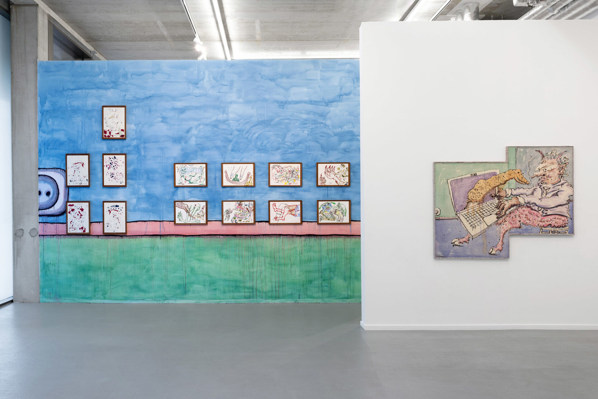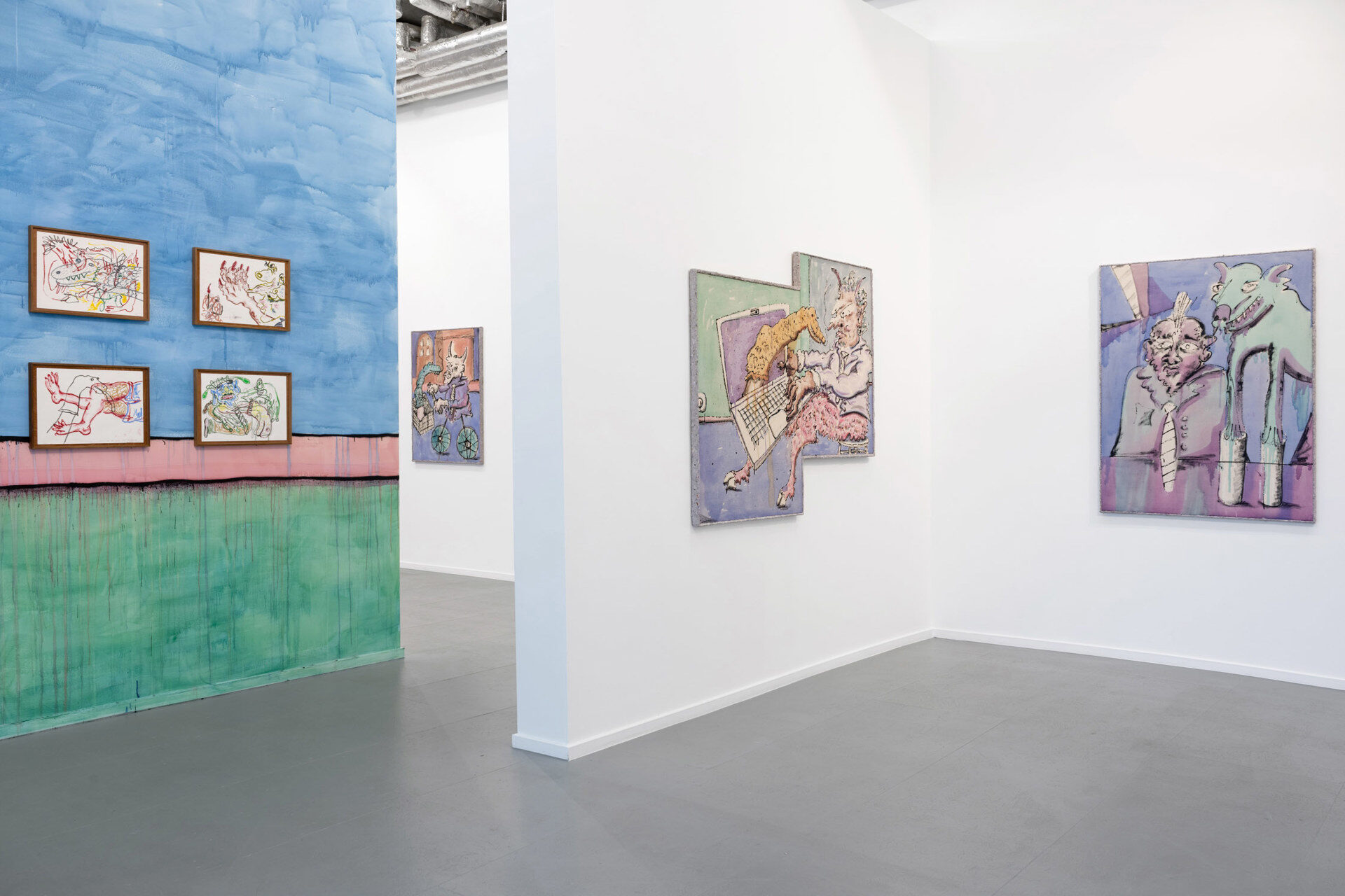 William Ludwig Lutgens (1991, Turnhout), two years after his last solo exhibition on Belgian soil, invites us into his world again, which has lately been populated by new and transformed archetypes. A man with devil ears and a tie stares before him while dragon-like hand puppets seem to conjure him. He embodies the hard-working, neoliberal achievement-subject that needs fantasies of success and money to avoid an overly harsh confrontation with reality.