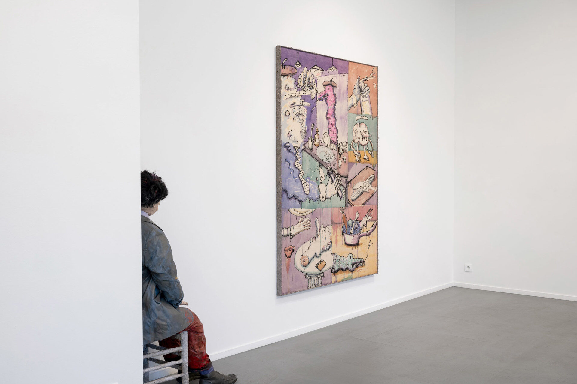 Lutgens draws on Lacanian psycho-analysis and in particular that of Slovenian psychologist and philosopher Slavoj Žižek in his approach of this character and his fortunes. Žižek uses the term fantasy supplement to refer to the ways in which our imagination fills in the disturbing inconsistencies and gaps in reality. In Lutgens’ new drawings and paintings, this fantasy supplement is embodied by the Liegebeest, inspired by the BRT series of the same name from the 1980s. Whereas in the series the snake-puppet by the name of Liegebeest…