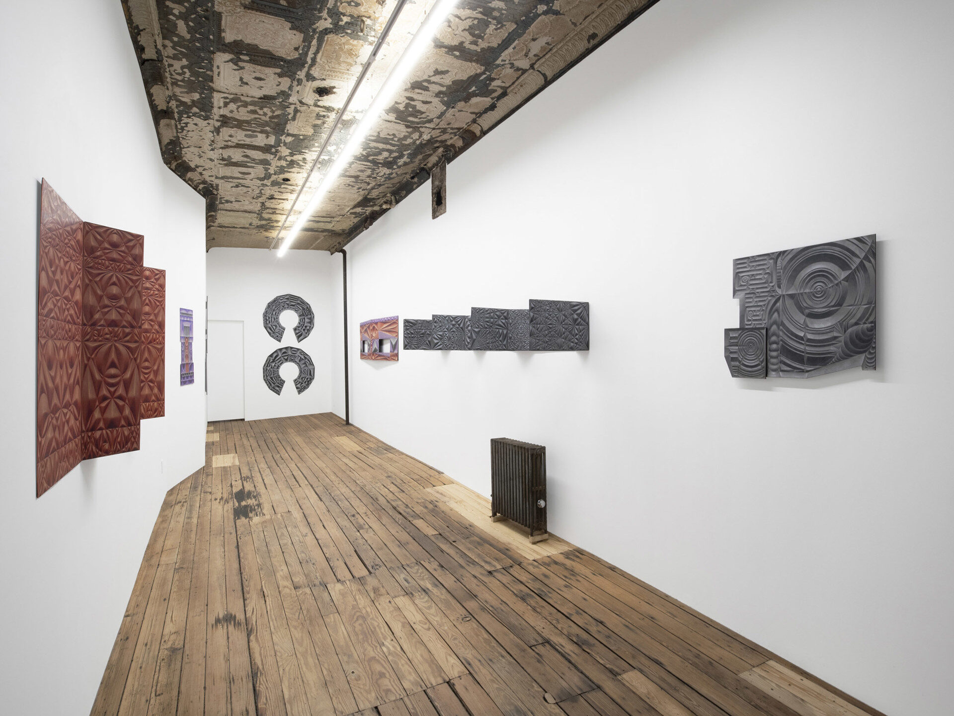 The characters of Flagg’s language are intricately woven into the geometric patterns of his drawings, seamlessly embedded to the point where they become one. Viewing his work requires an oscillation between attempting to navigate the text while also taking in the intricate relief-like patterns, fields of color that appear three-dimensional through contrasts of hue and gradations of value. When mounted to a ¾ inch medex…