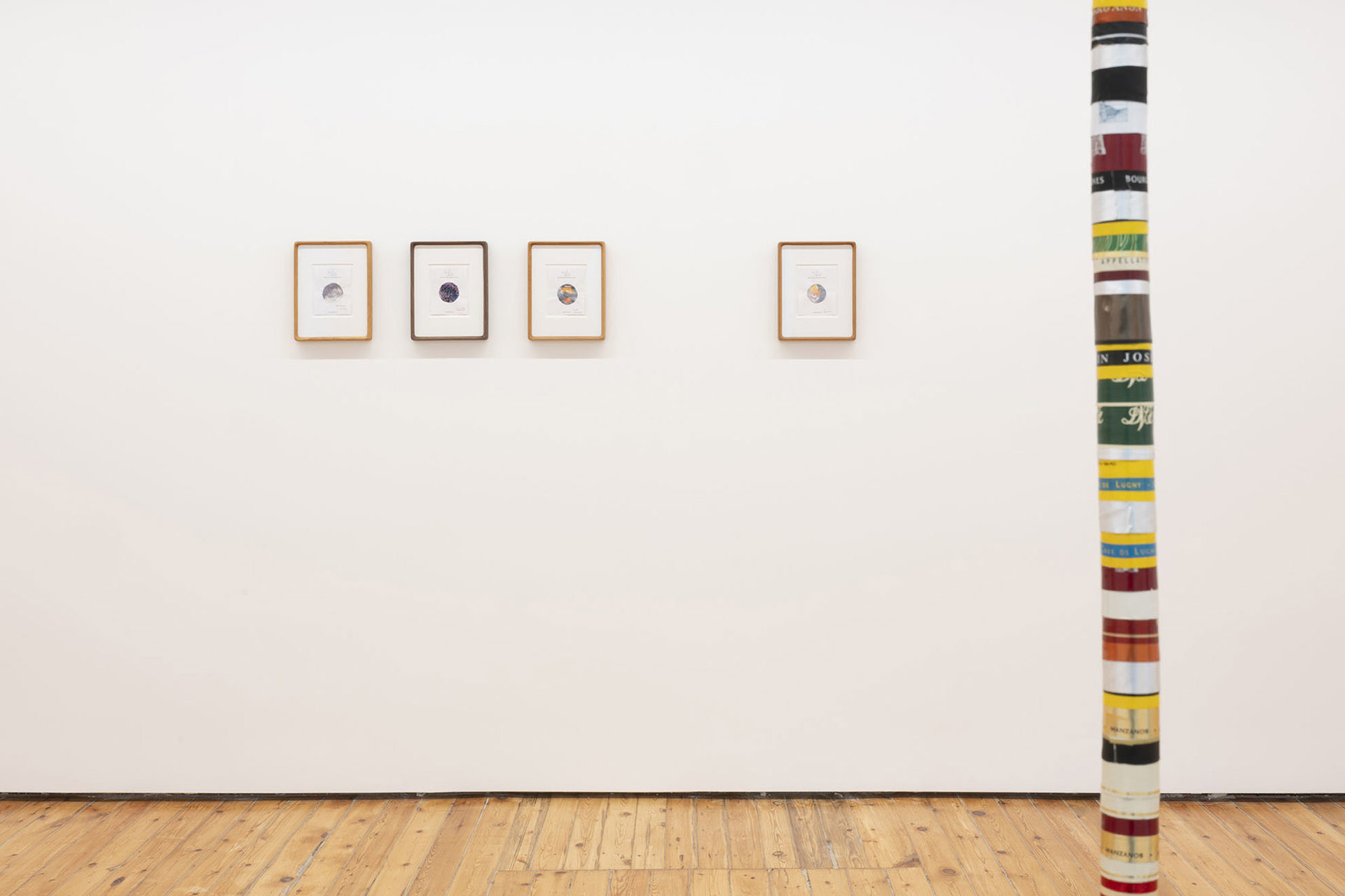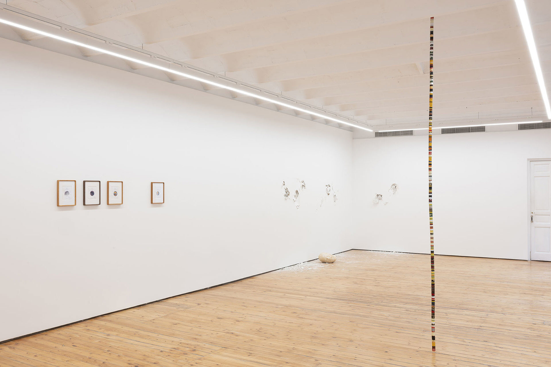 Much of the exhibition chronicles the way bodies respond to disruptive change: in Grigely’s case, an eye hemorrhage that occurred in the winter of 2022, which occluded his vision in his right eye. For one month, Grigely made watercolors almost every day, documenting what he could see through his eye: a tangle of rings of light and dark, of specks and blobs and swirls. Initially made as documentation for his retina surgeon, the watercolors now stand apart as an ineffable moment of being, when words could not describe the transformative moments when the body reshaped itself.