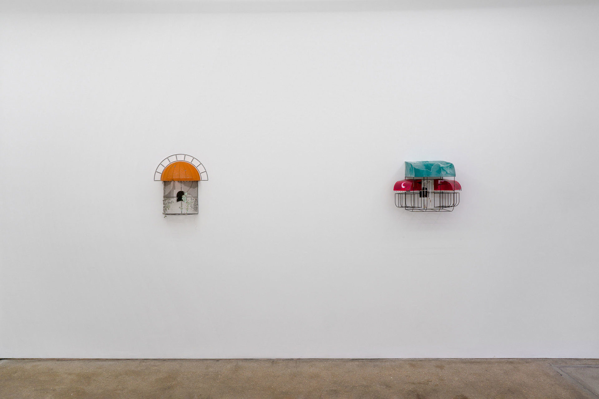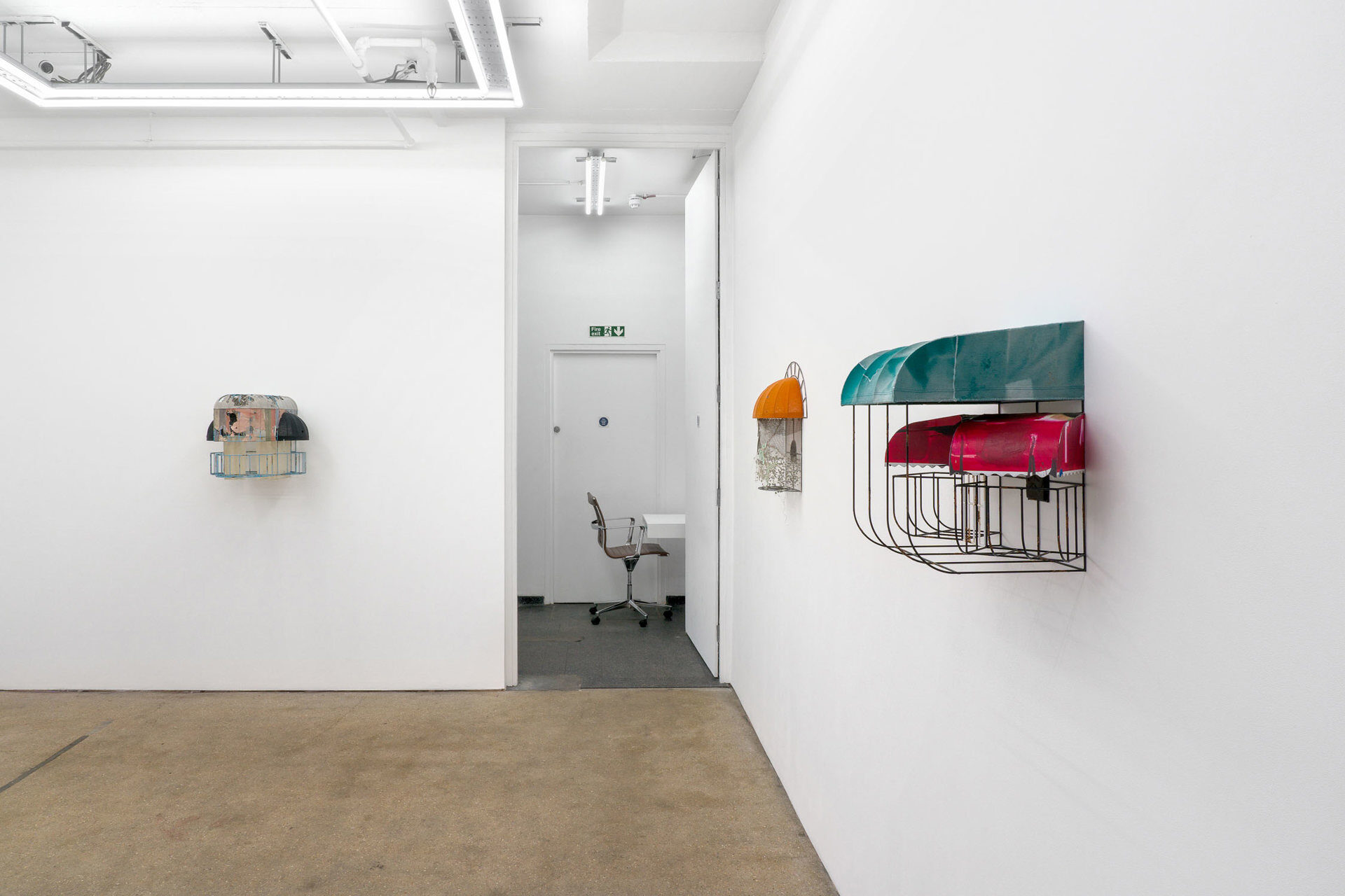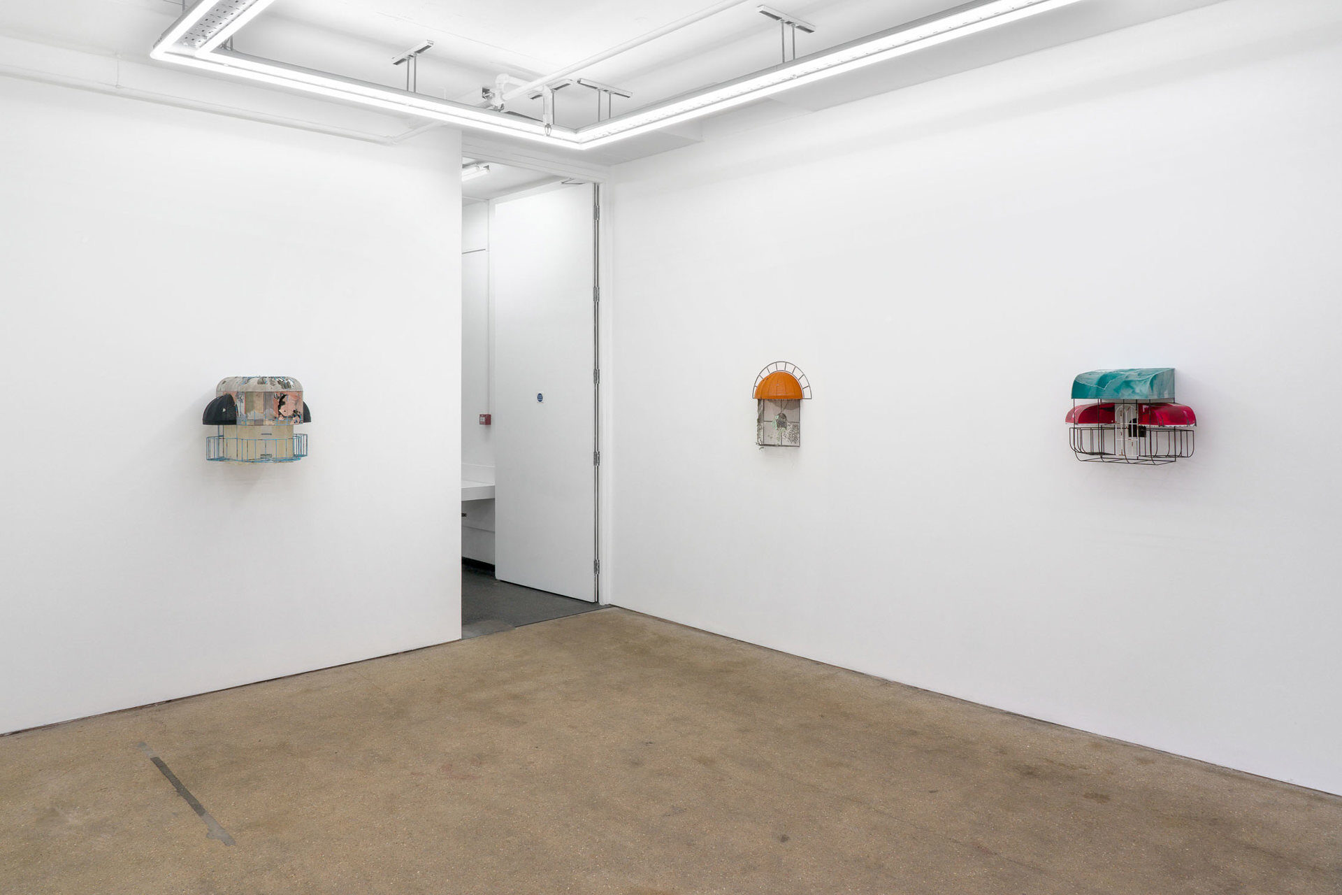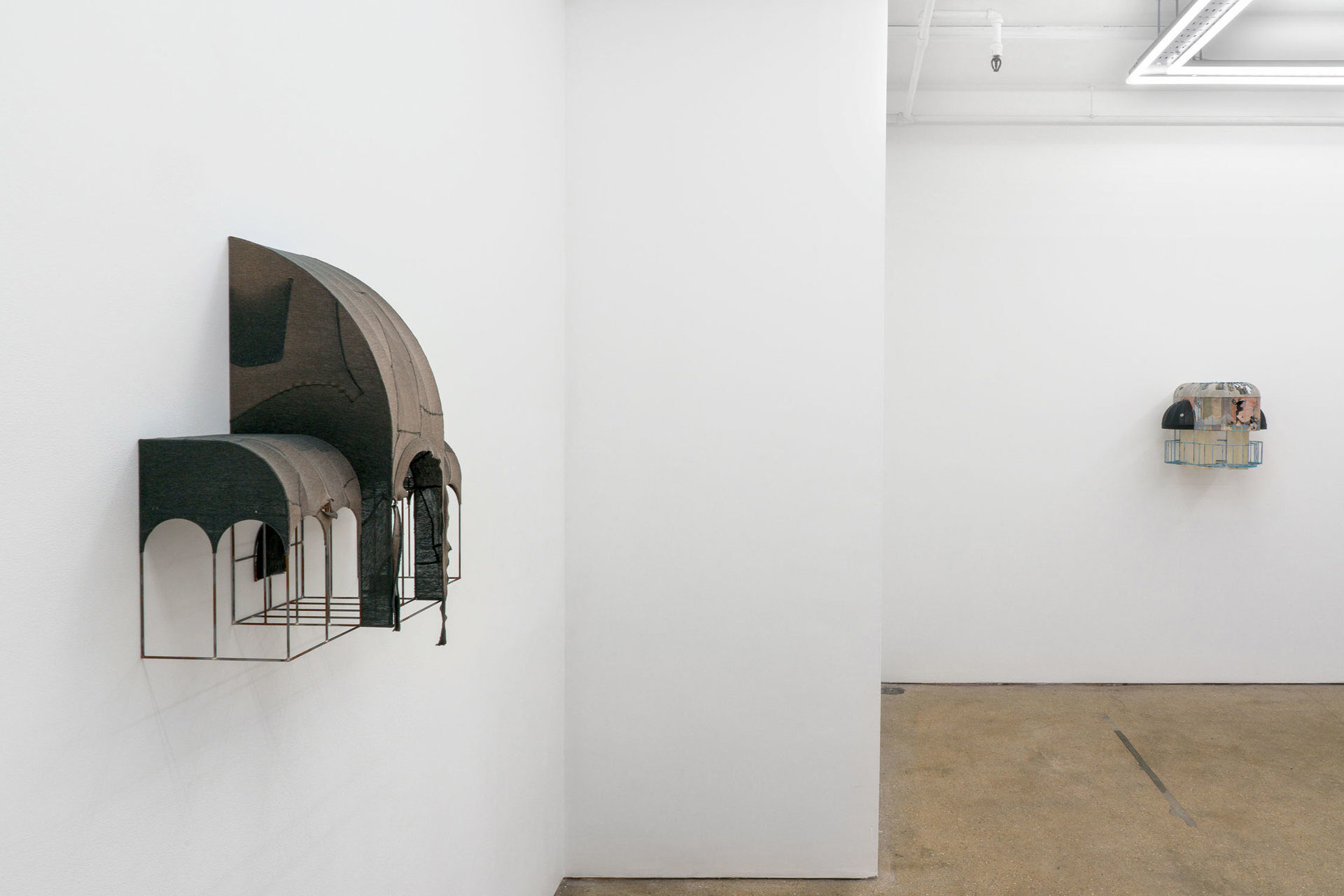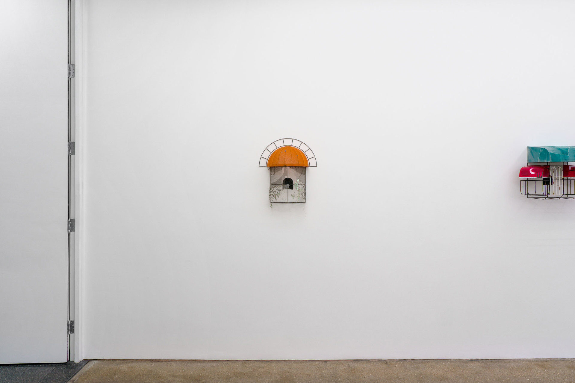 For Condo London 2025, Public Gallery is pleased to present groundwork, a solo exhibition of new works by New York based artist Greg Carideo, whose practice references the architectural language of awnings, building facades, doorways, and thresholds. Using found fabrics, shoe heels, and other lost or discarded items, Carideo’s intimate wall-based sculptures – silver-brazed steel armatures threaded through delicate fabric canopies – call to mind social spaces of shelter, encounter and exchange.