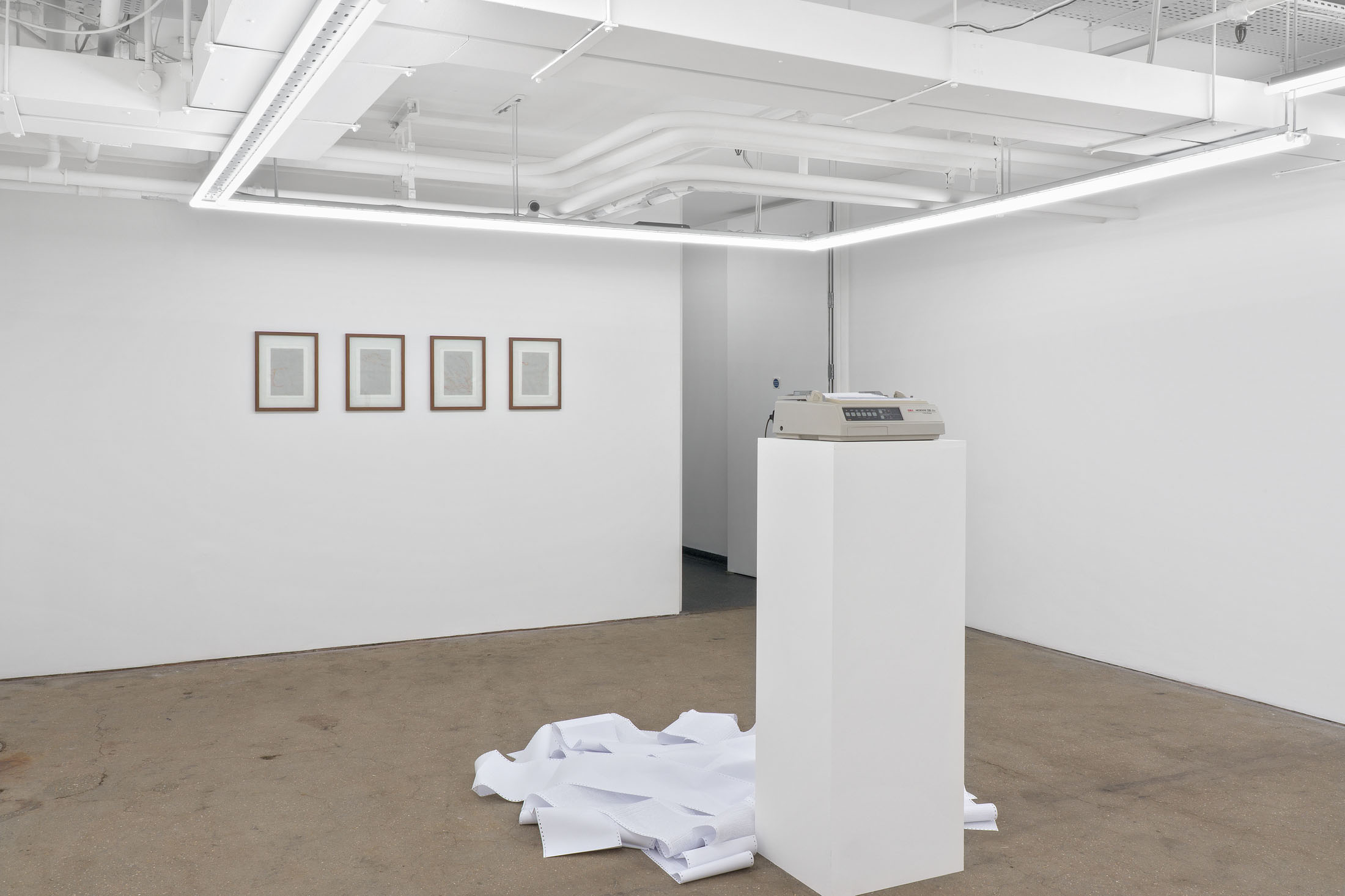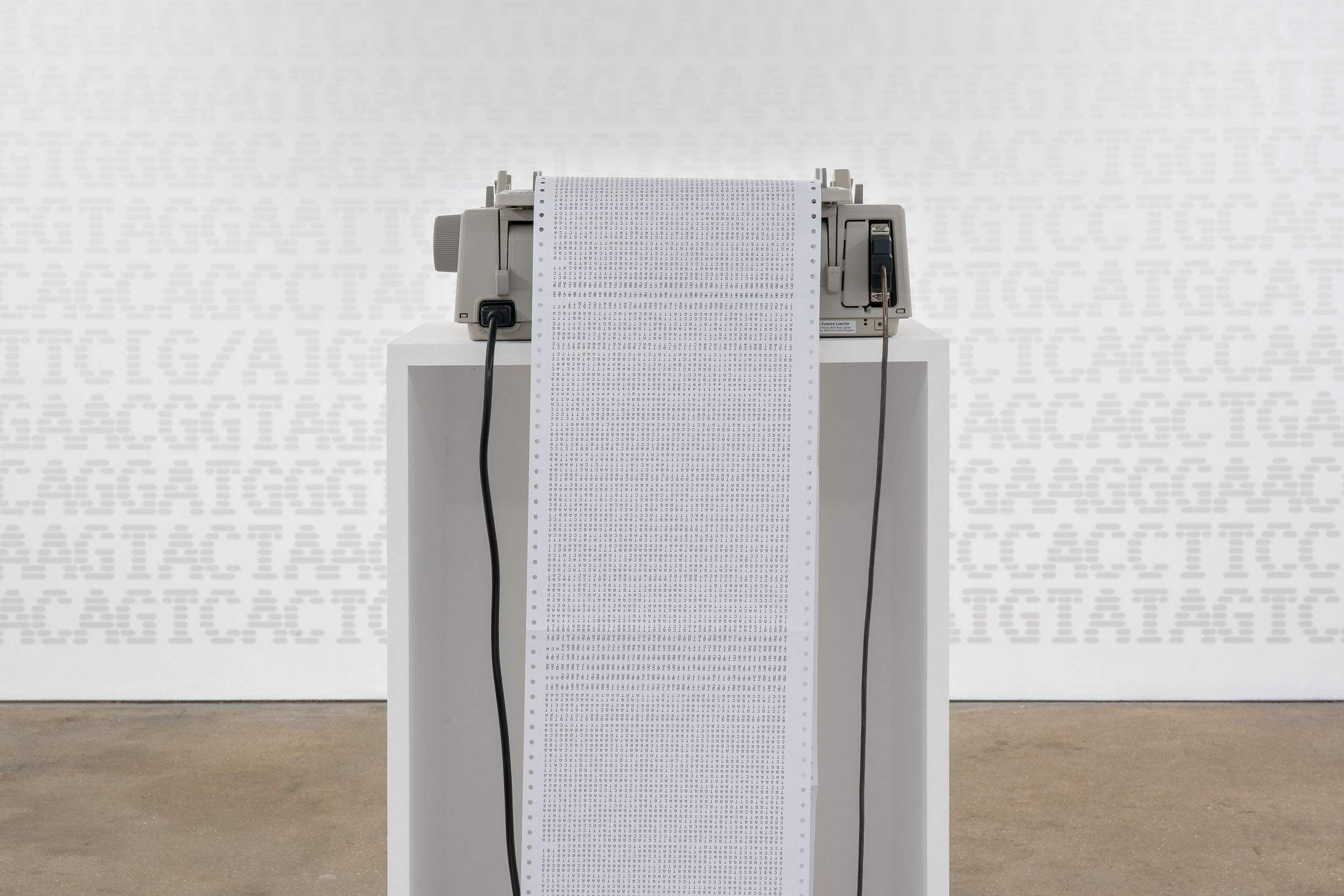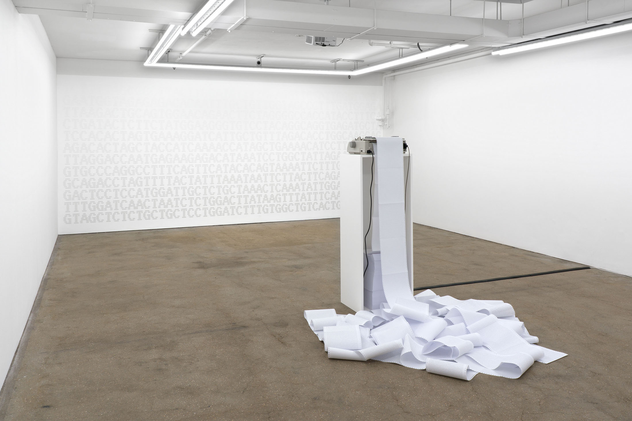 Positioned at the frontier of technological and cultural change, Xin Liu’s practice examines the futility of preservation and the exhausts of progress and scientific pursuit, foregrounding the limitations that shape our contemporary condition. Her work reclaims narratives shaped by technological transformations in recent decades, from space exploration and immigration to biotechnology and motherhood. On the basement level, Liu’s mixed media installation Book of Mine (2019) projects the artist’s DNA sequence in base pairs across the back wall. A dot matrix printer produces endless pages of Liu’s…