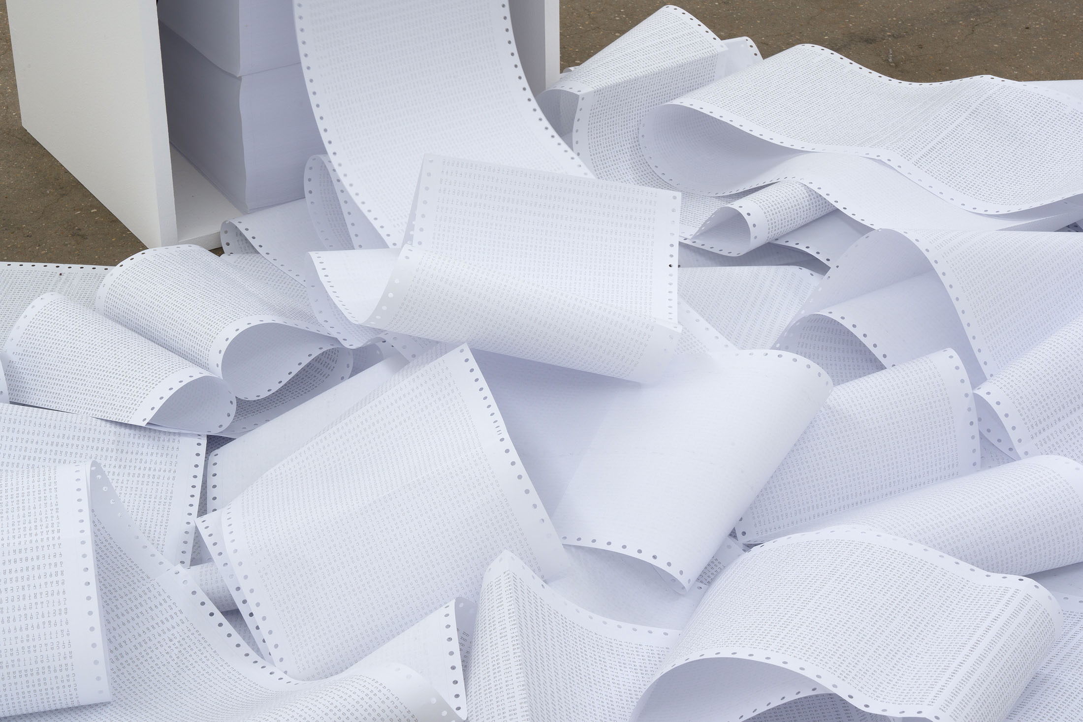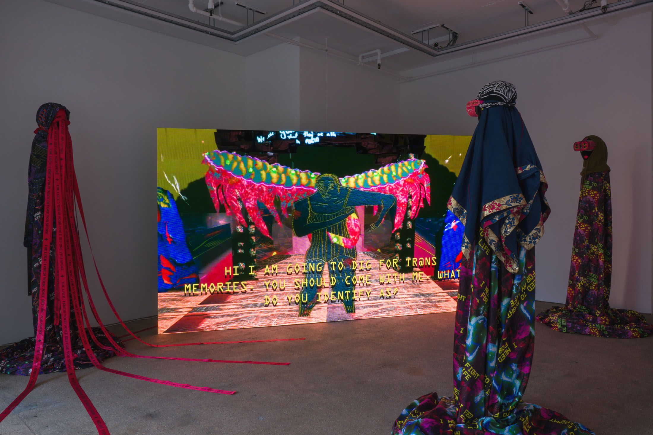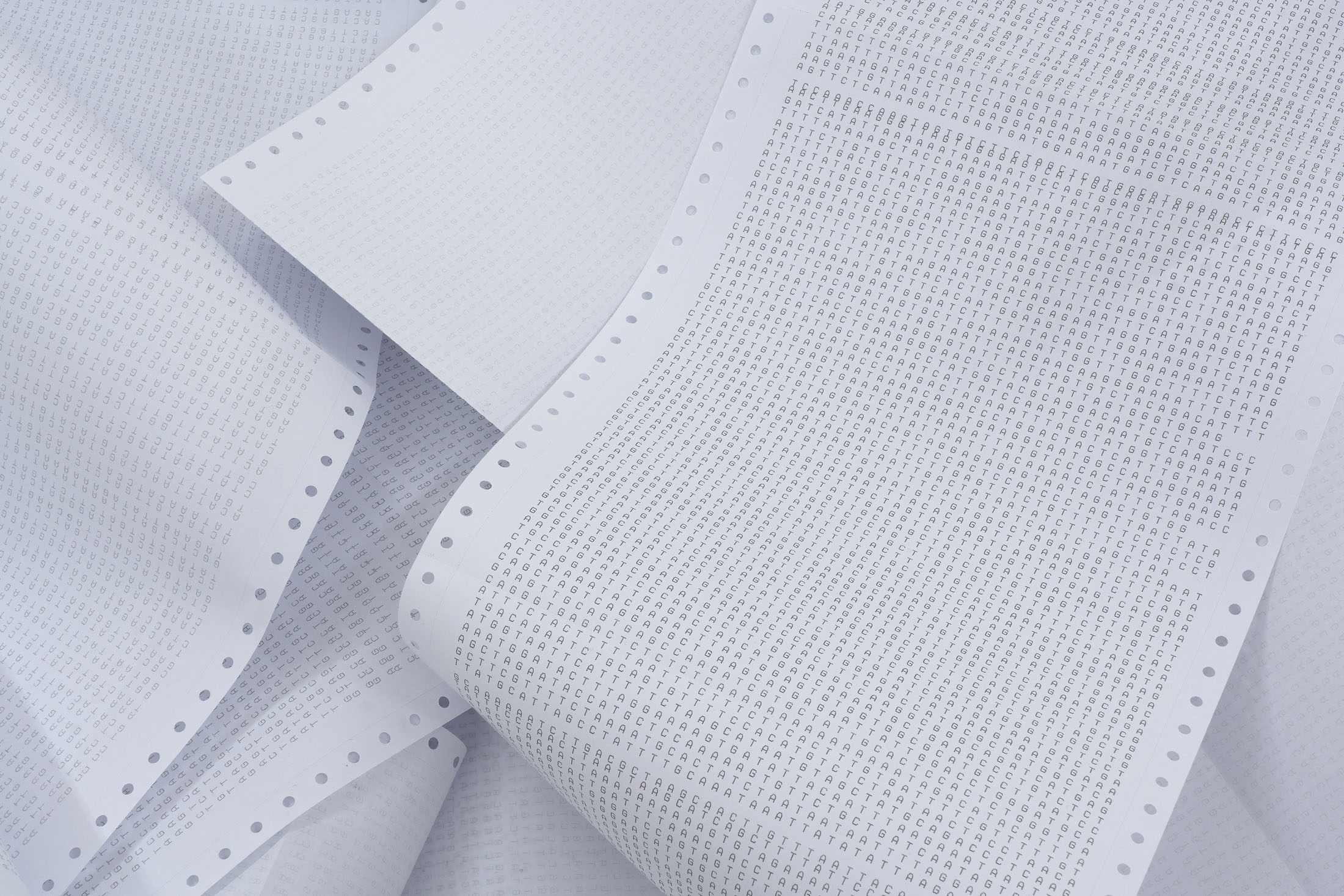 Positioned at the frontier of technological and cultural change, Xin Liu’s practice examines the futility of preservation and the exhausts of progress and scientific pursuit, foregrounding the limitations that shape our contemporary condition. Her work reclaims narratives shaped by technological transformations in recent decades, from space exploration and immigration to biotechnology and motherhood. On the basement level, Liu’s mixed media installation Book of Mine (2019) projects the artist’s DNA sequence in base pairs across the back wall. A dot matrix printer produces endless pages of Liu’s…