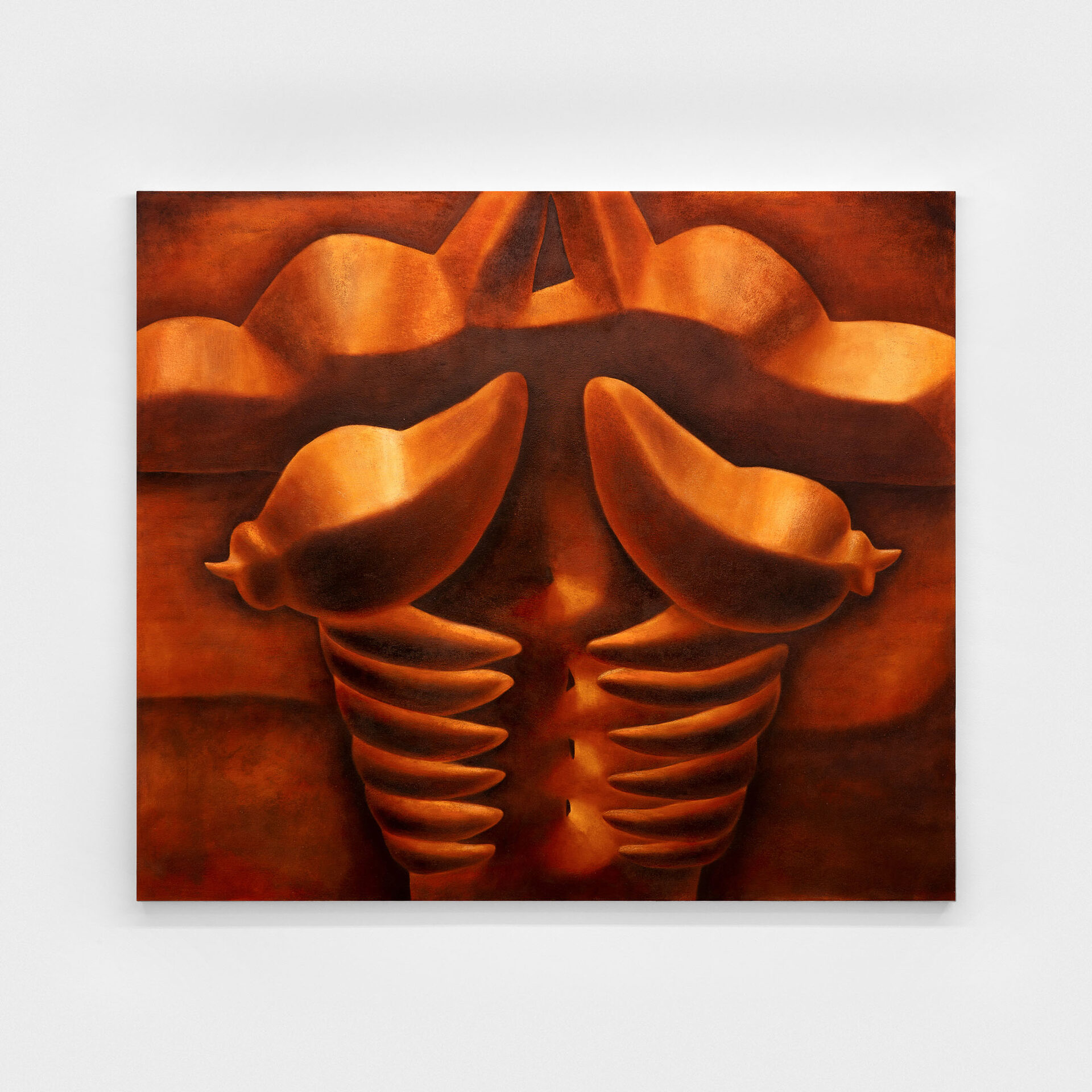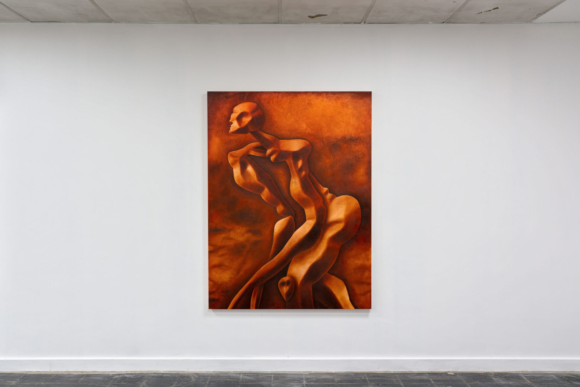 Hoffmann’s practice has long been concerned with states rather than subjects–her figures often hold durational poses, their confinement dictated by the limits of the canvas. In a marked formal shift, recent works turn toward the monochromatic: reddish-brown tones, from dark ochre to rust and clay, dominate the palette. Sill, the exhibition’s title, frames this shift and operates as both metaphor and site. Architecturally, a sill suggests a ledge–a place of pause and rest, but also of voyeuristic consumption. Geologically, it…