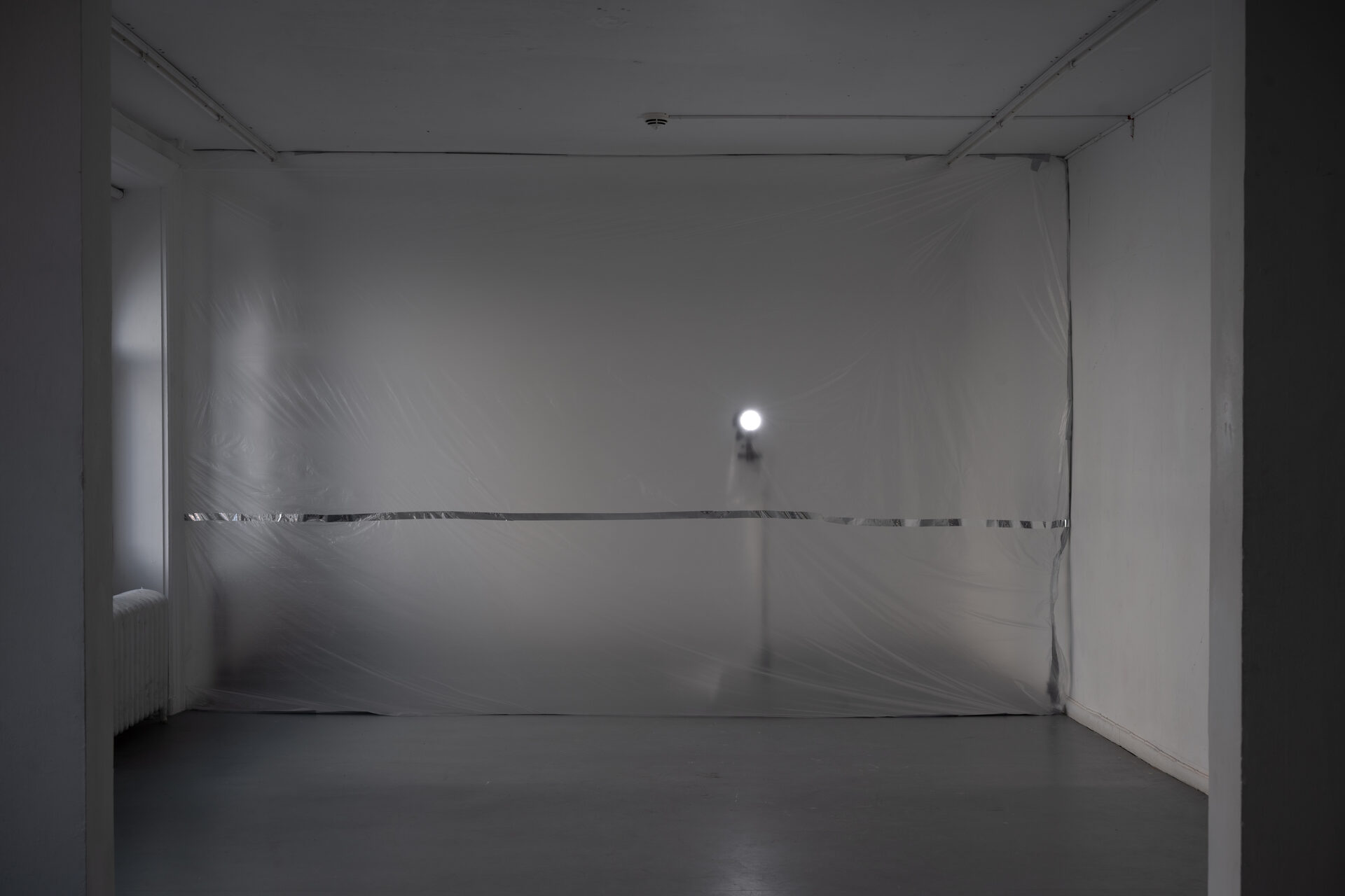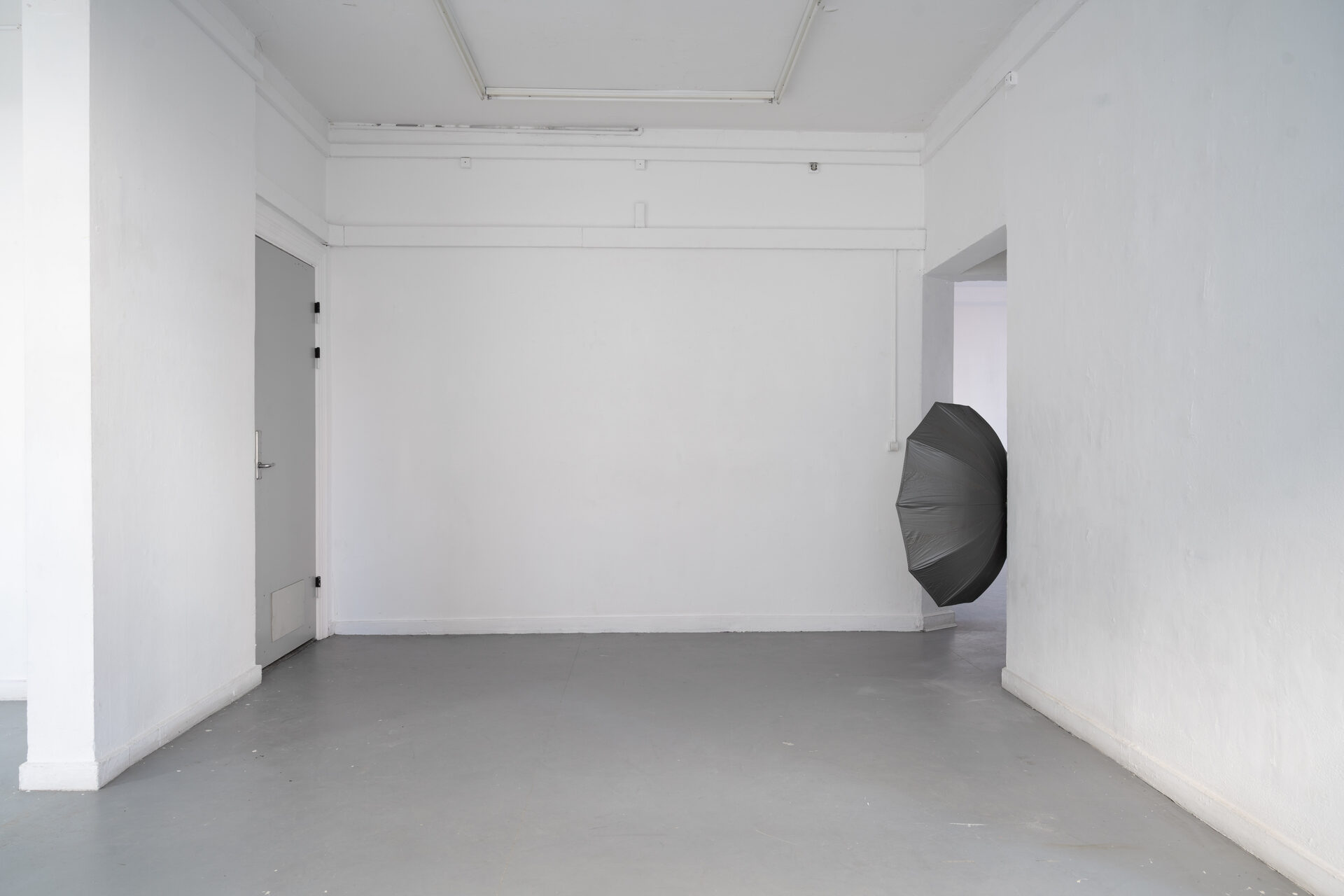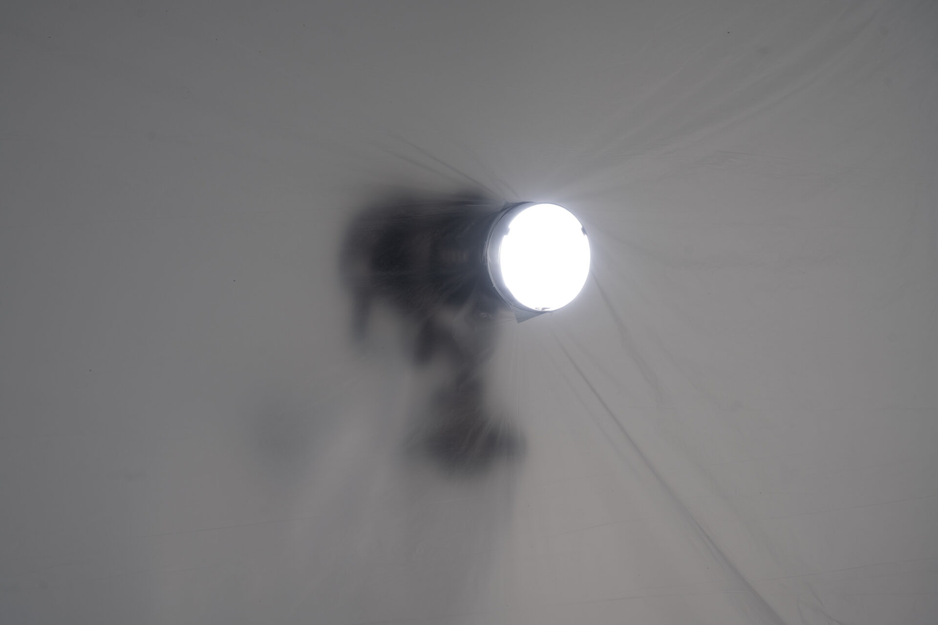 A studio flash fires intermittently in the space, disconnected from any camera and