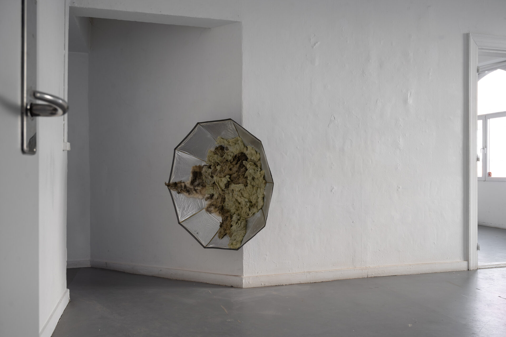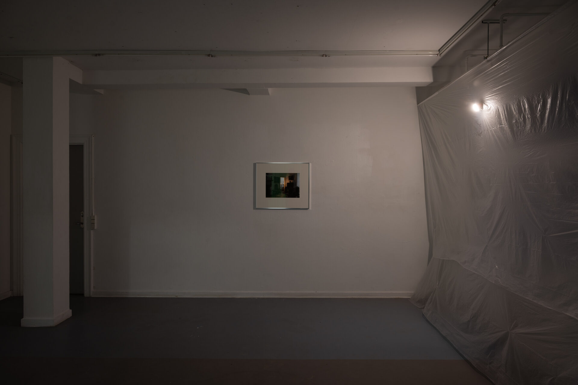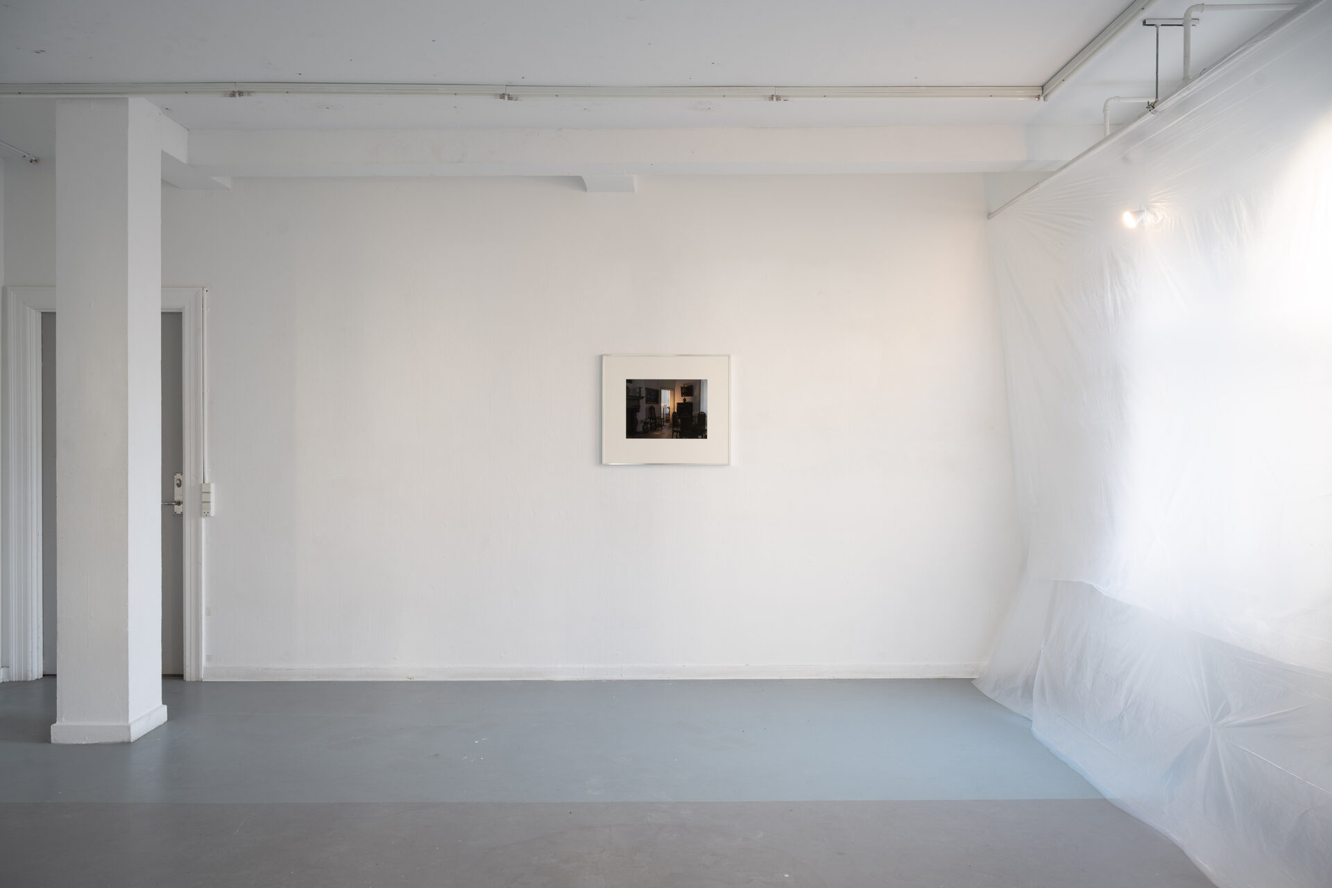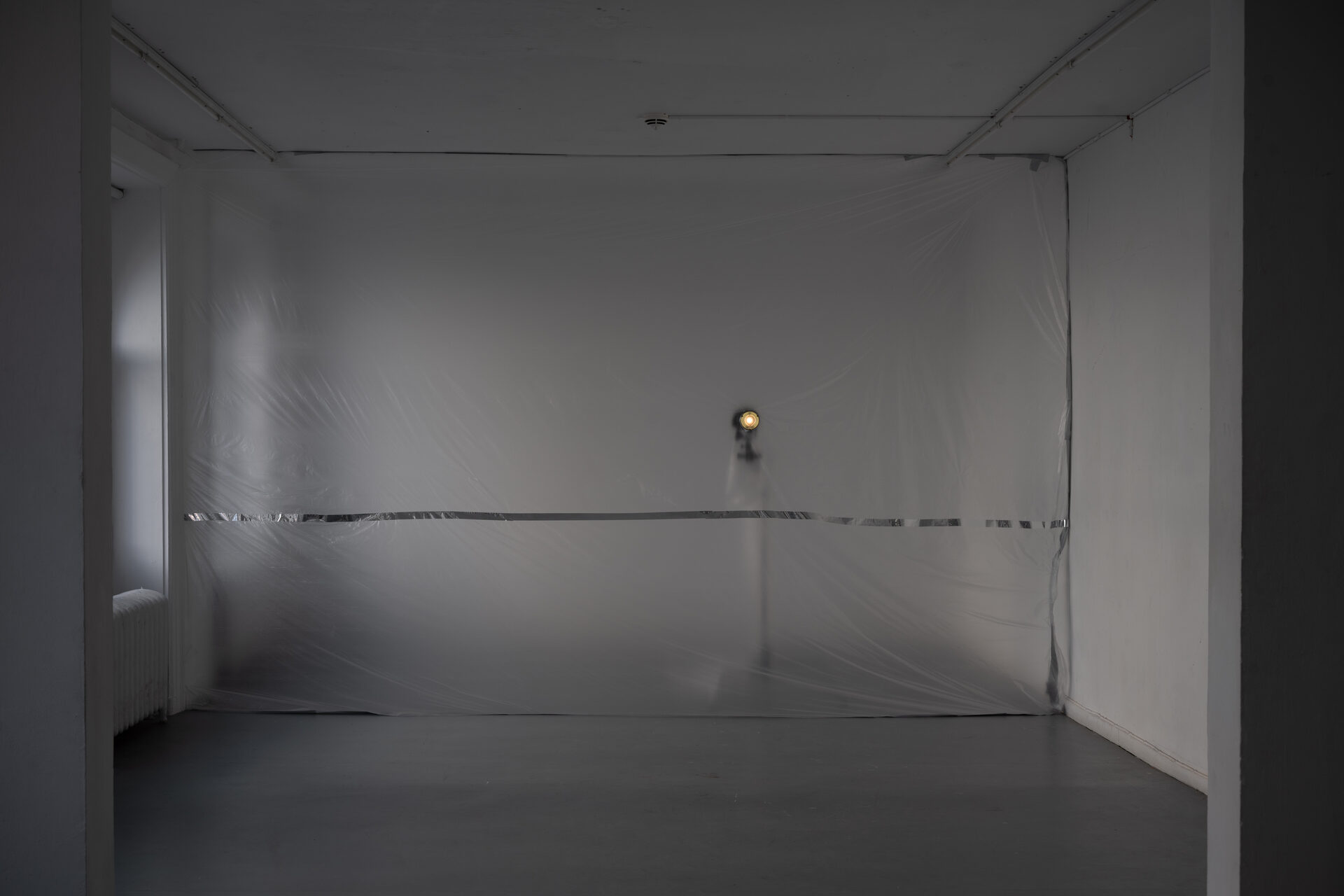 A studio flash fires intermittently in the space, disconnected from any camera and