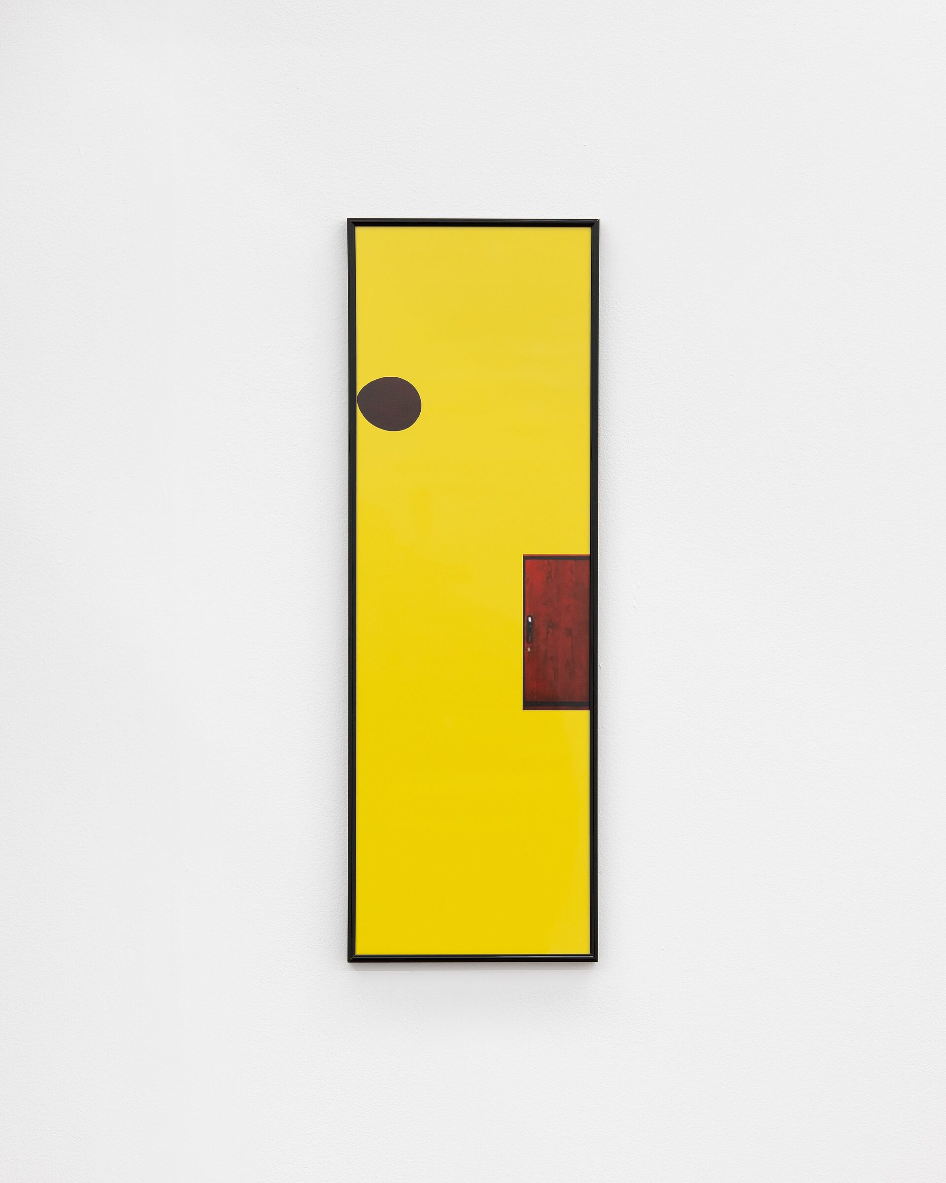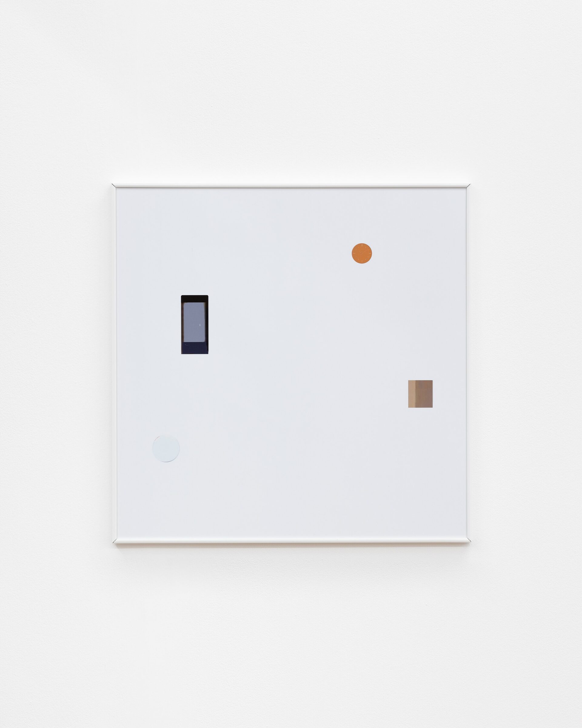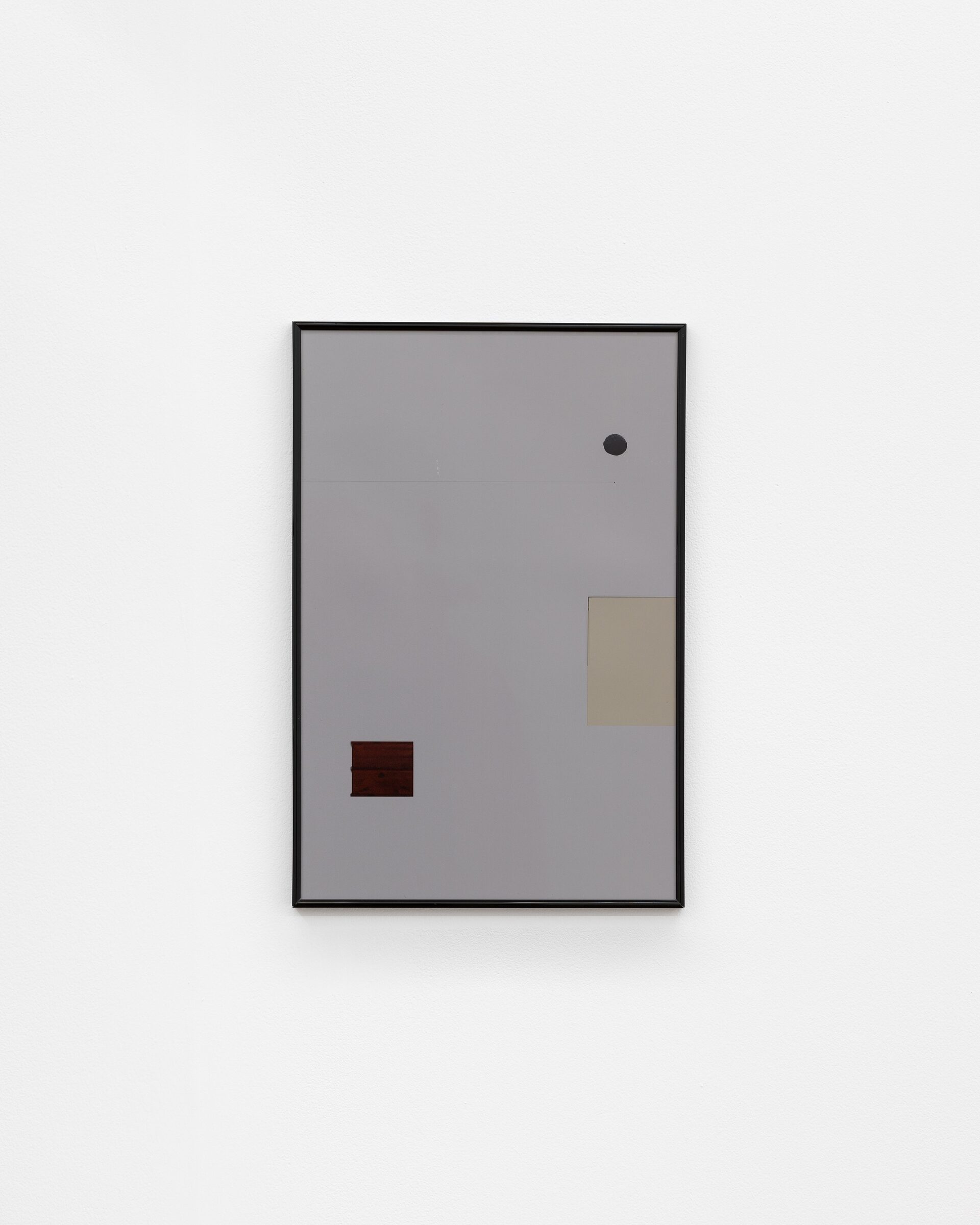 The exhibition includes a series of framed prints which have been produced using a high street chemist’s printing service. The images each contain two or three elements: circles and rectangles of digital information, cut and pasted from found photographs. Details of the source material are given in the above works list. An audio work is also installed in the gallery, with a sound effect taken from a Youtube video repeating at varied intervals.
