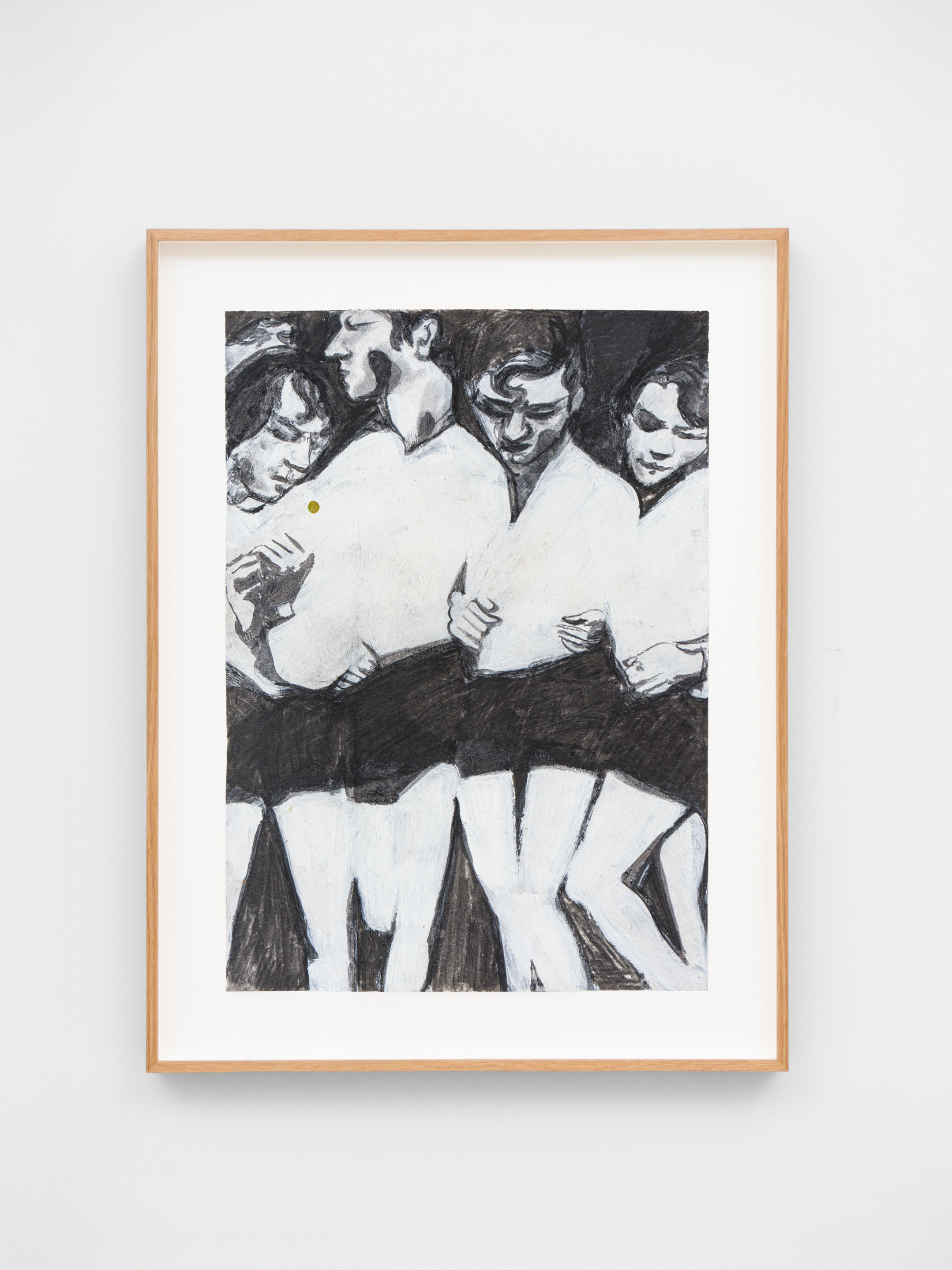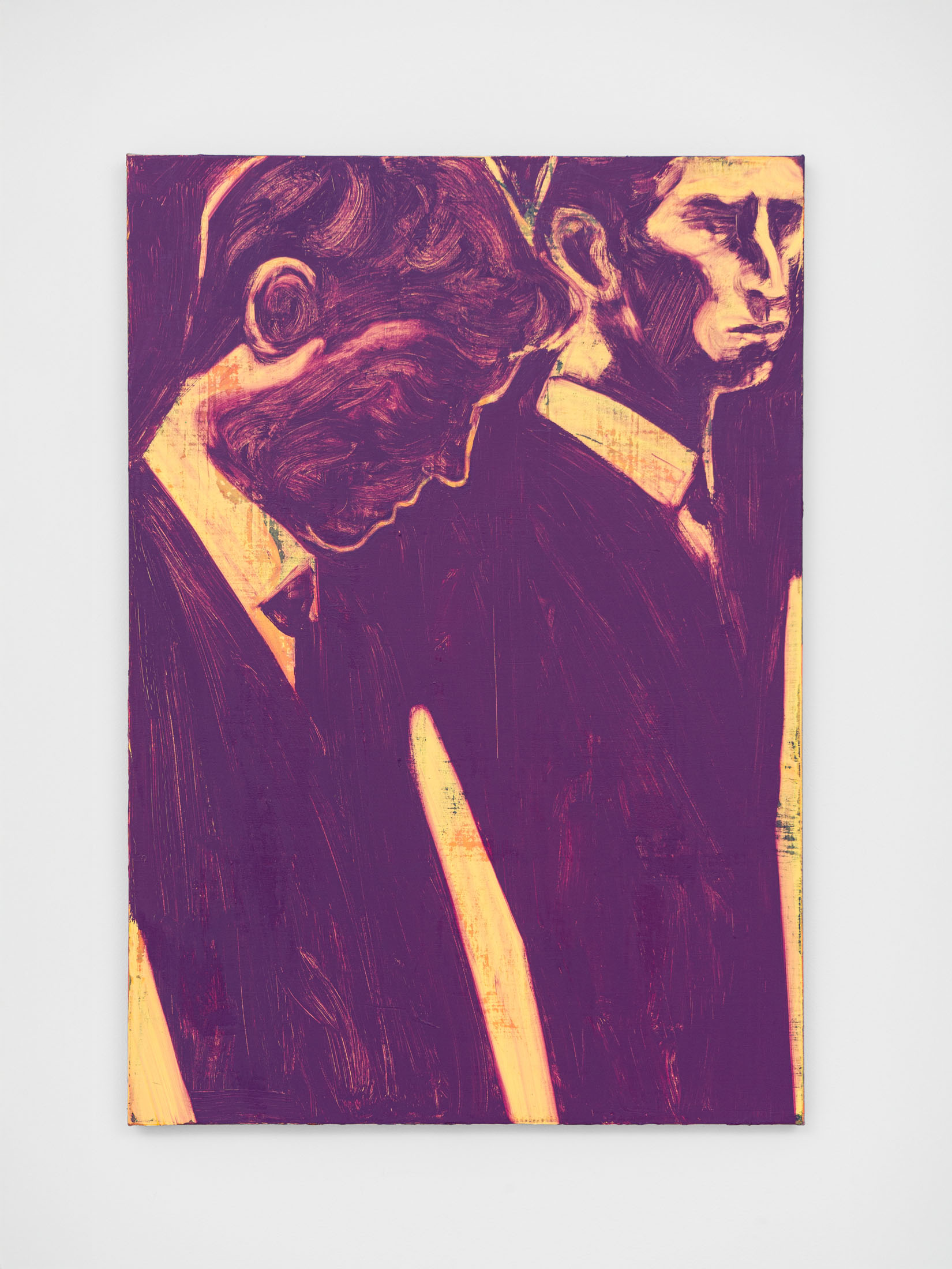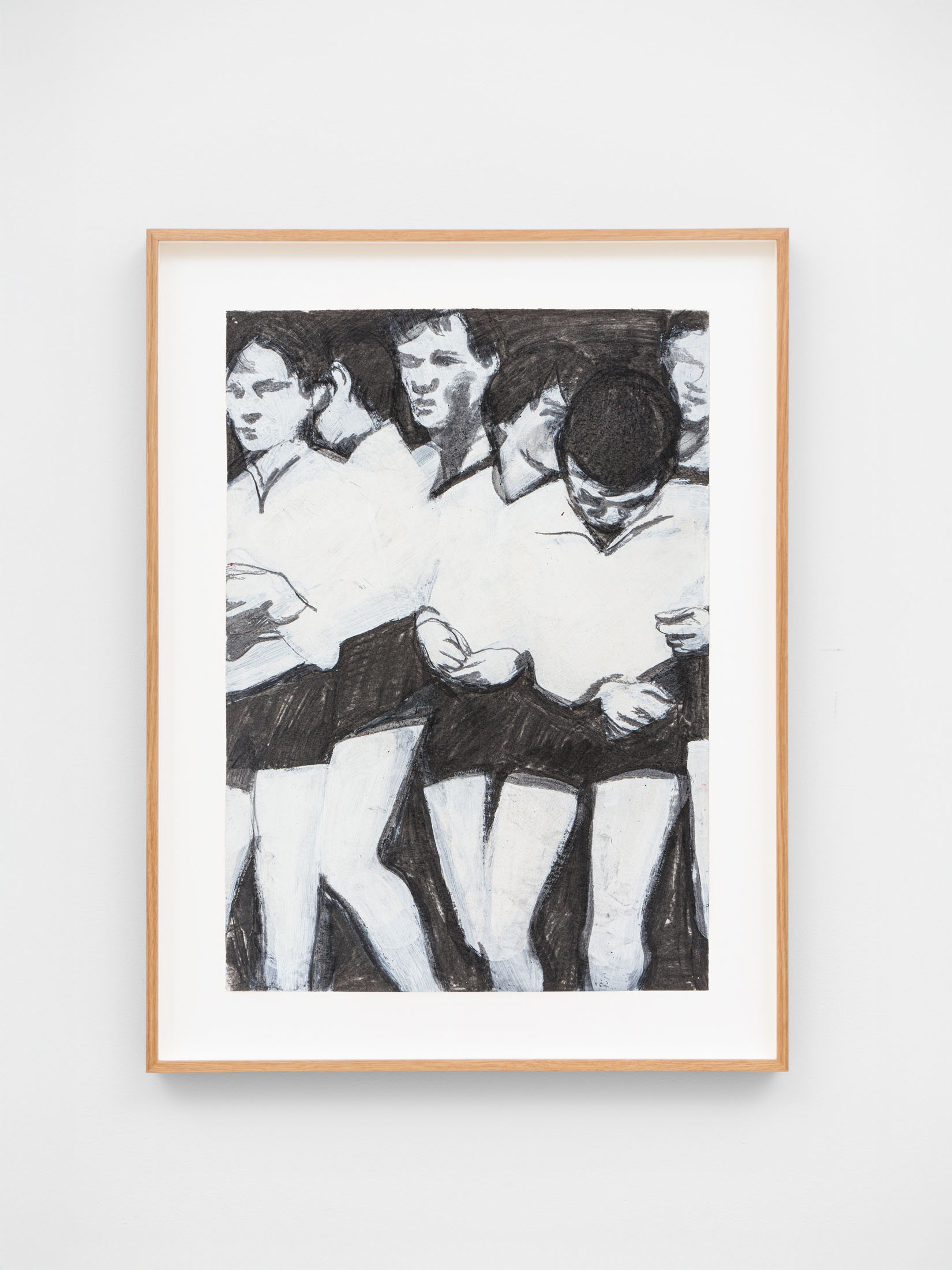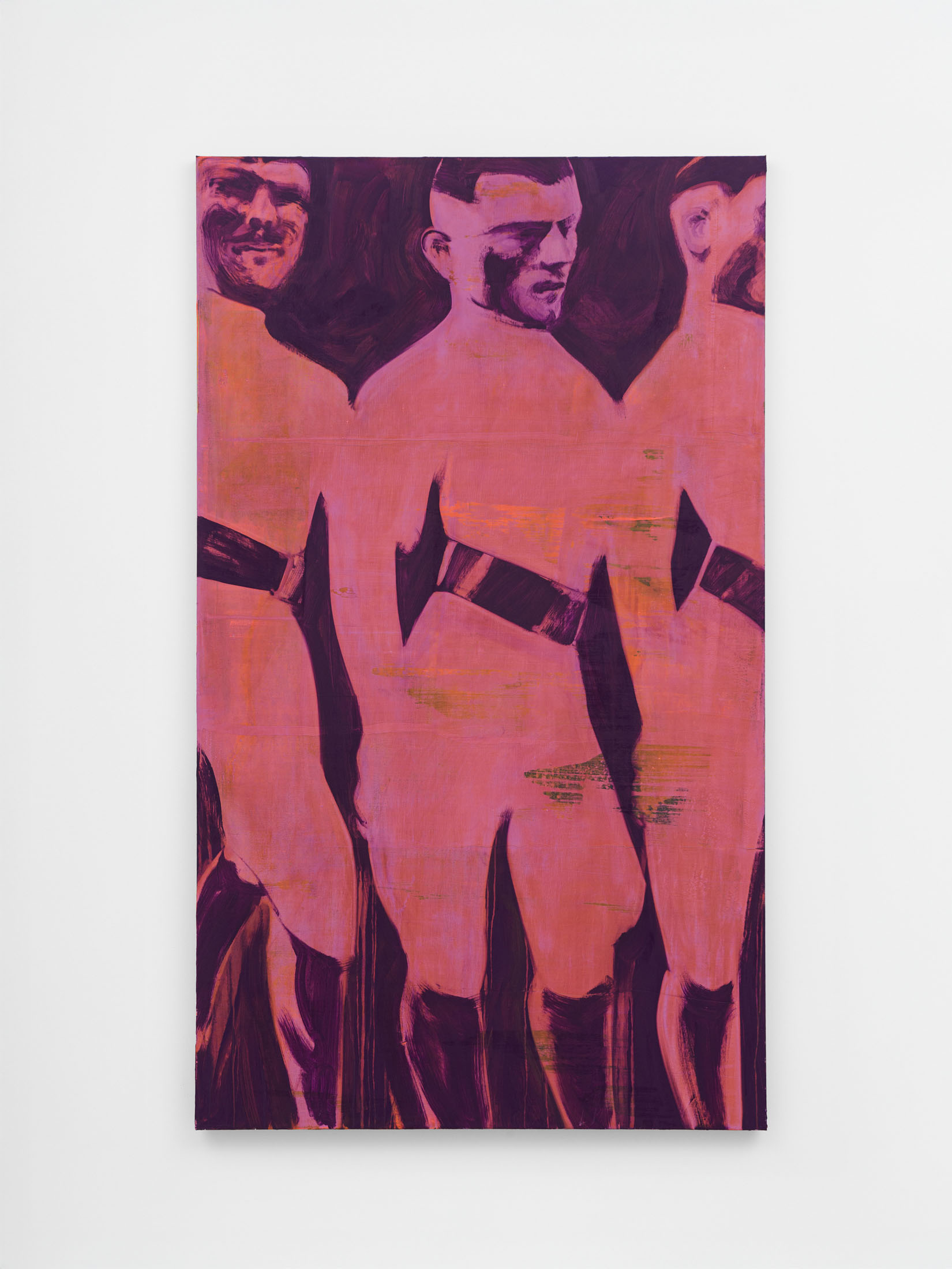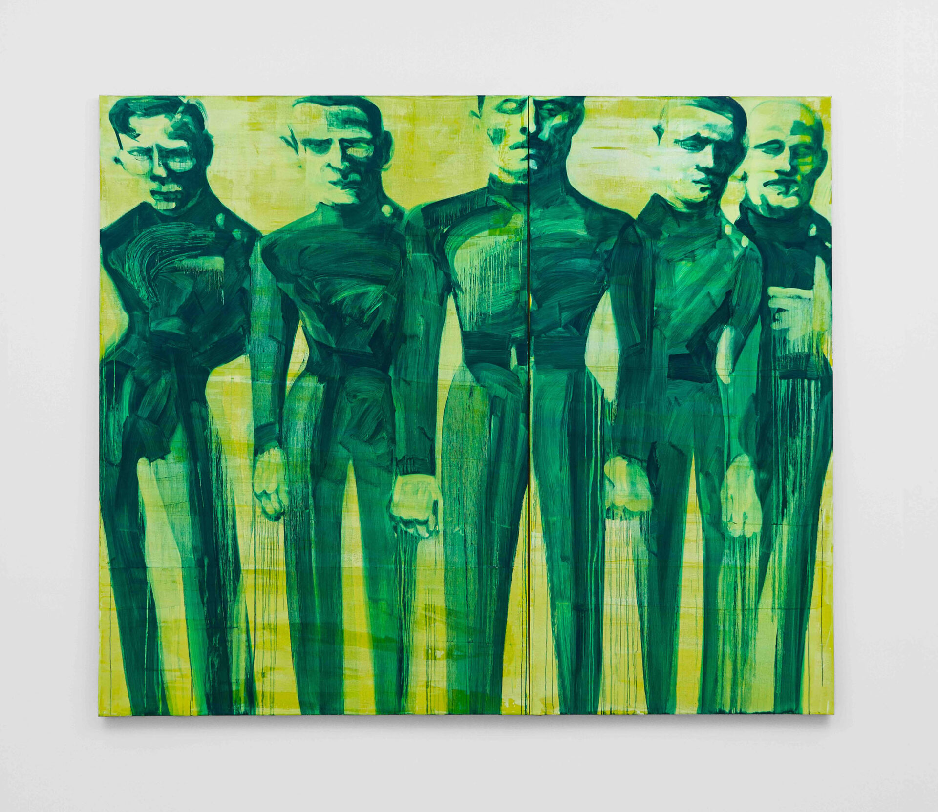 Foxton’s new body of work tackles masculinity at a time when it is being overperformed and reduced to its most classical and rigid codes. Young, controlled bodies with strict demeanors confront us in large group compositions, while portraits of authority figures follow us with their cold gaze. While the artist continues to place primary importance on the physical body, he now approaches it more in relation to the group—to the way it is shaped by various social and political influences.