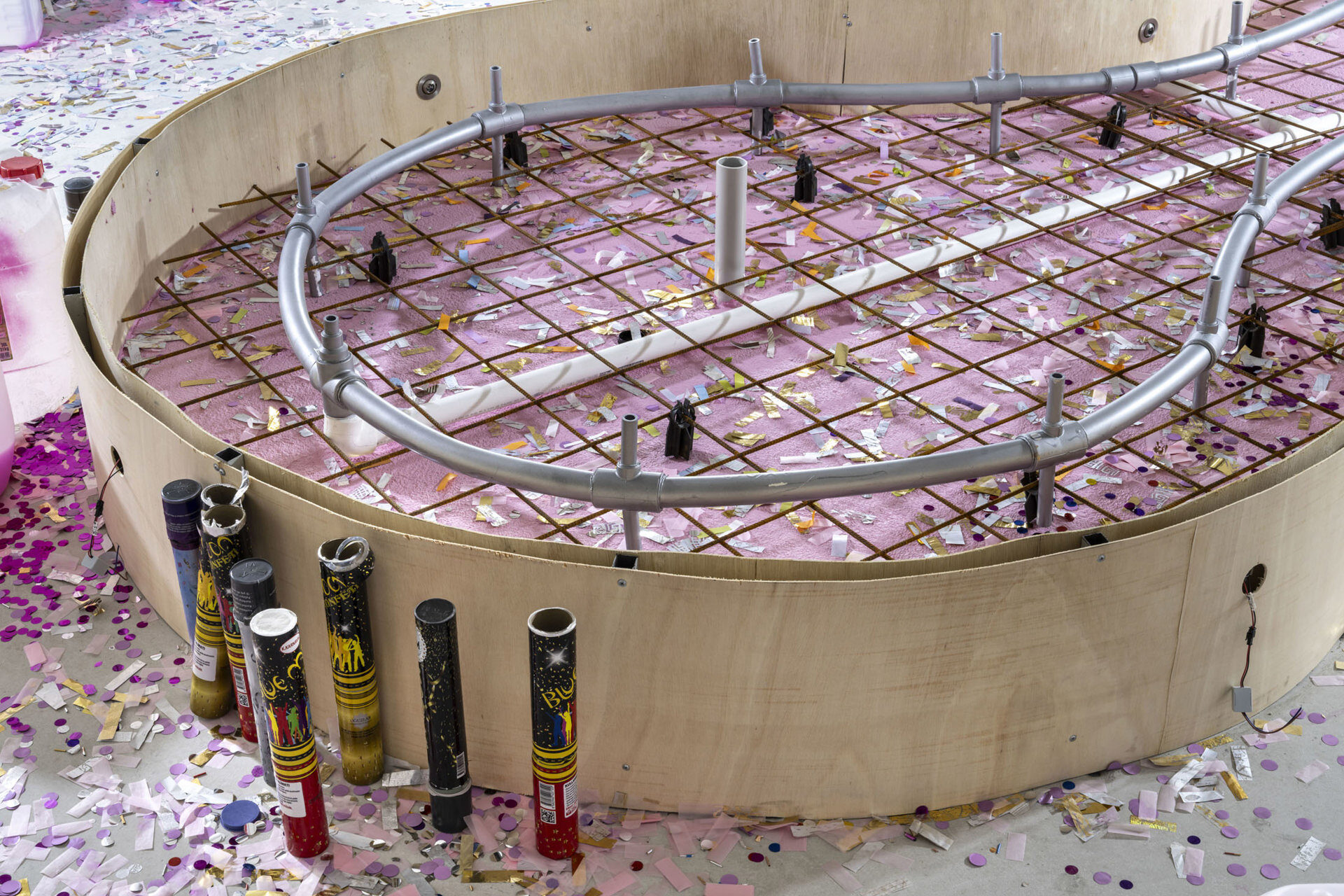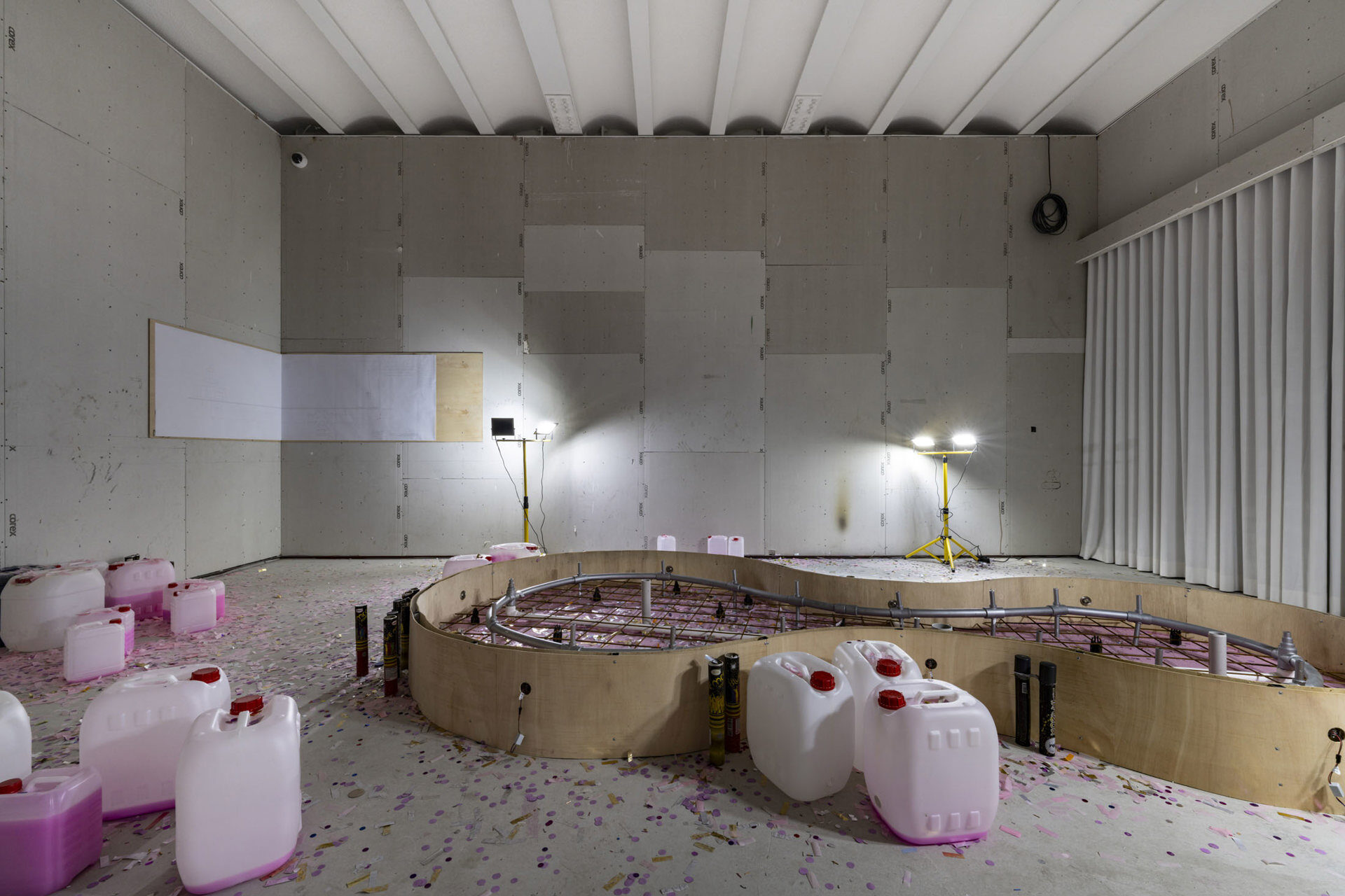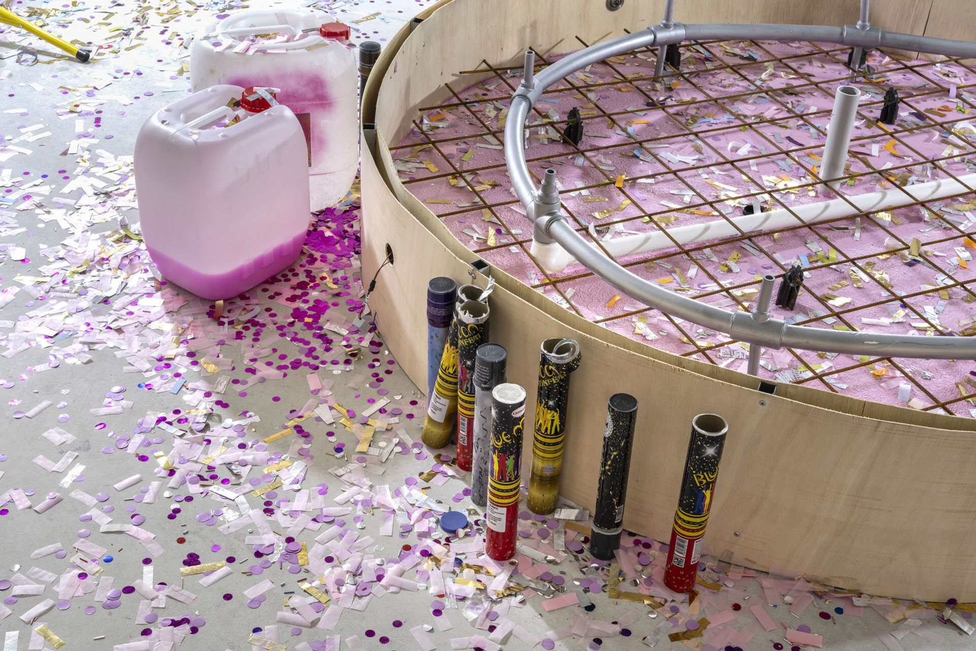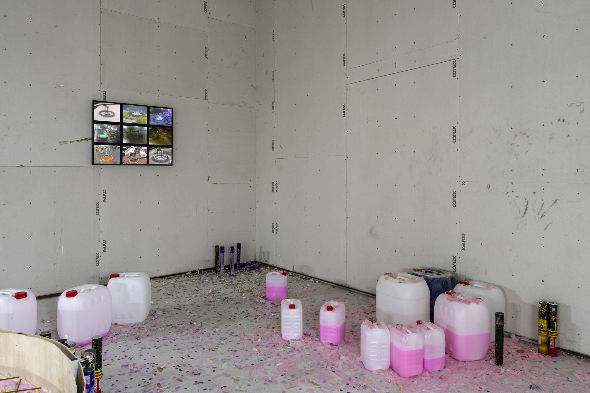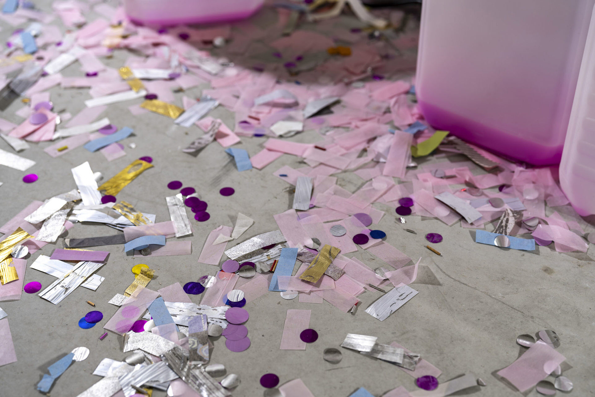 Works spanning three floors unfold within a construction atmosphere shaped by an unfinished fountain and scattered confetti. The exhibition engages with expressive actions such as performing, rising from the ground, launching into the air, and exploding, each approached with different durations, speeds, and intensities. Bayraktar interprets these gestures as repeated vertical impulses that signify productivity and domination, framing them as power performances within hierarchical systems that are not specific to art but operate through self-elevating structures.