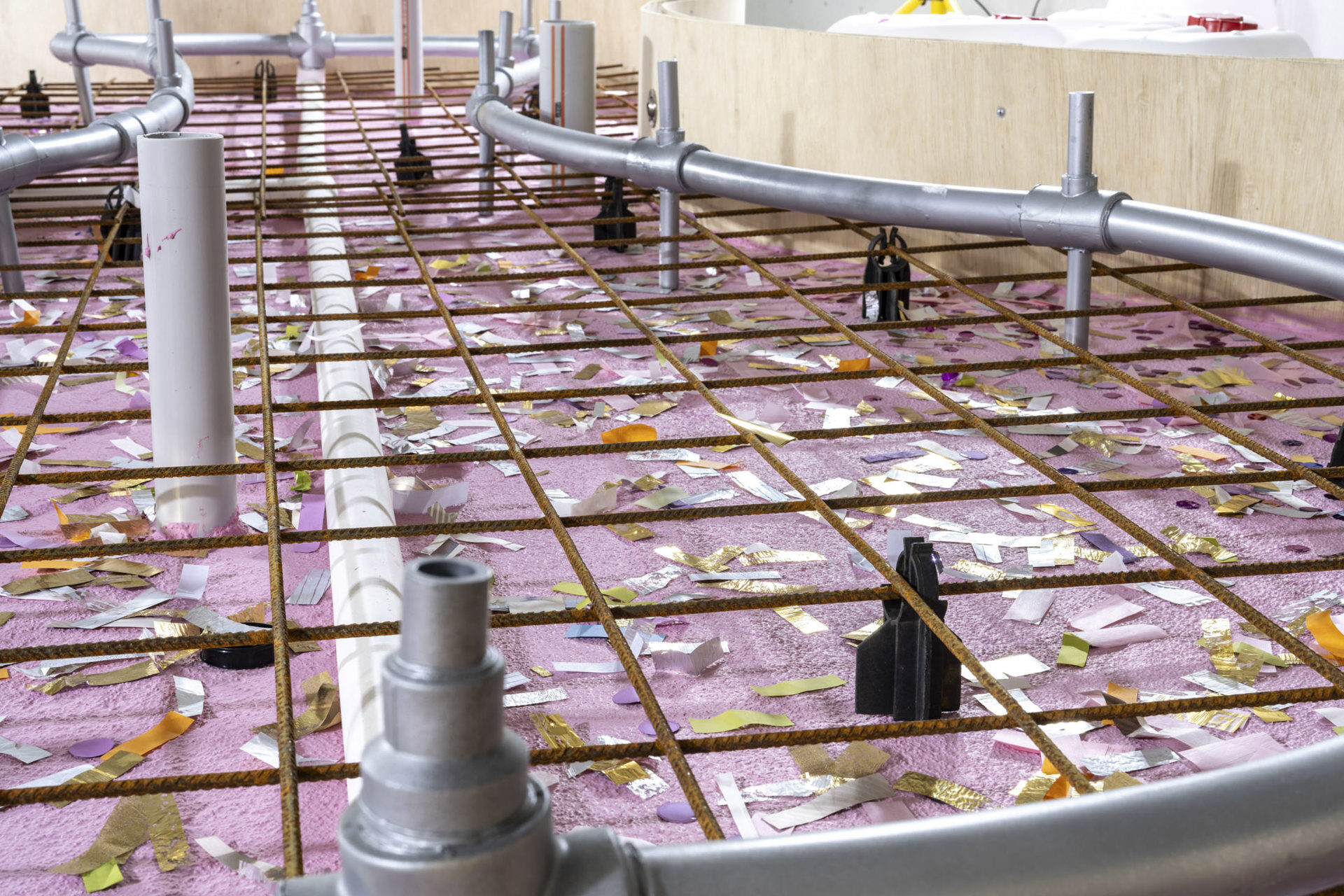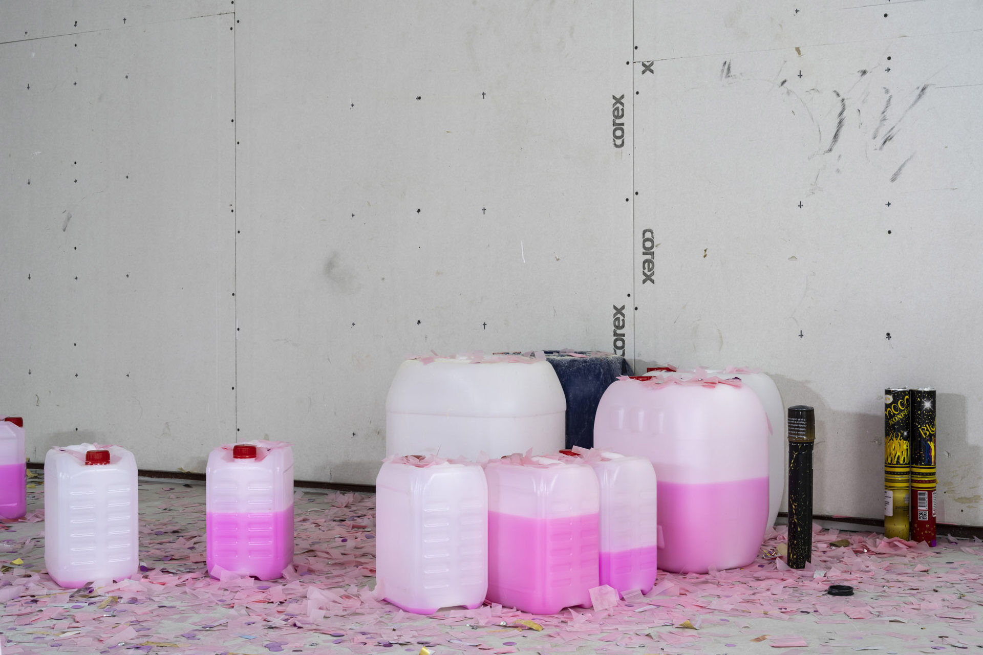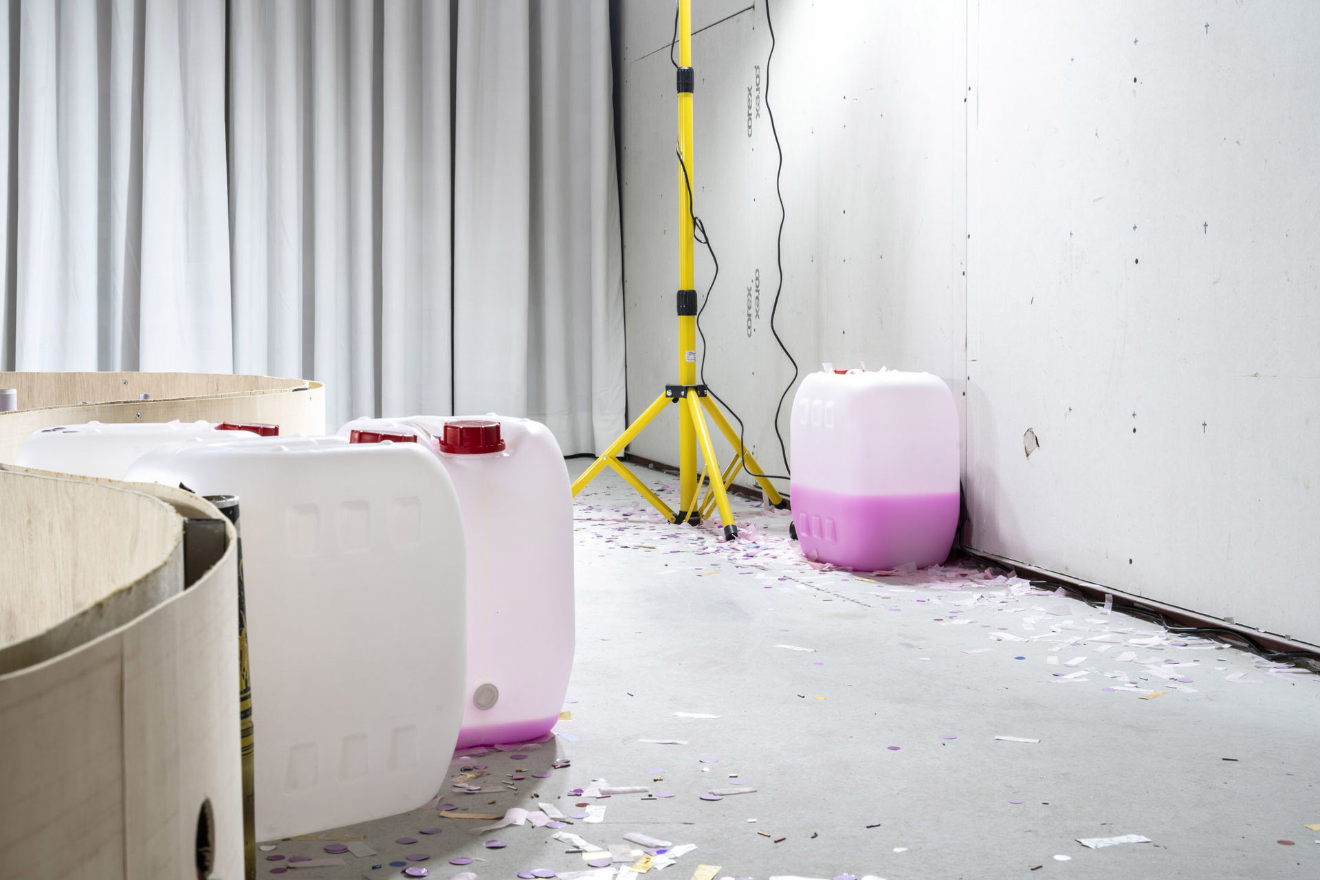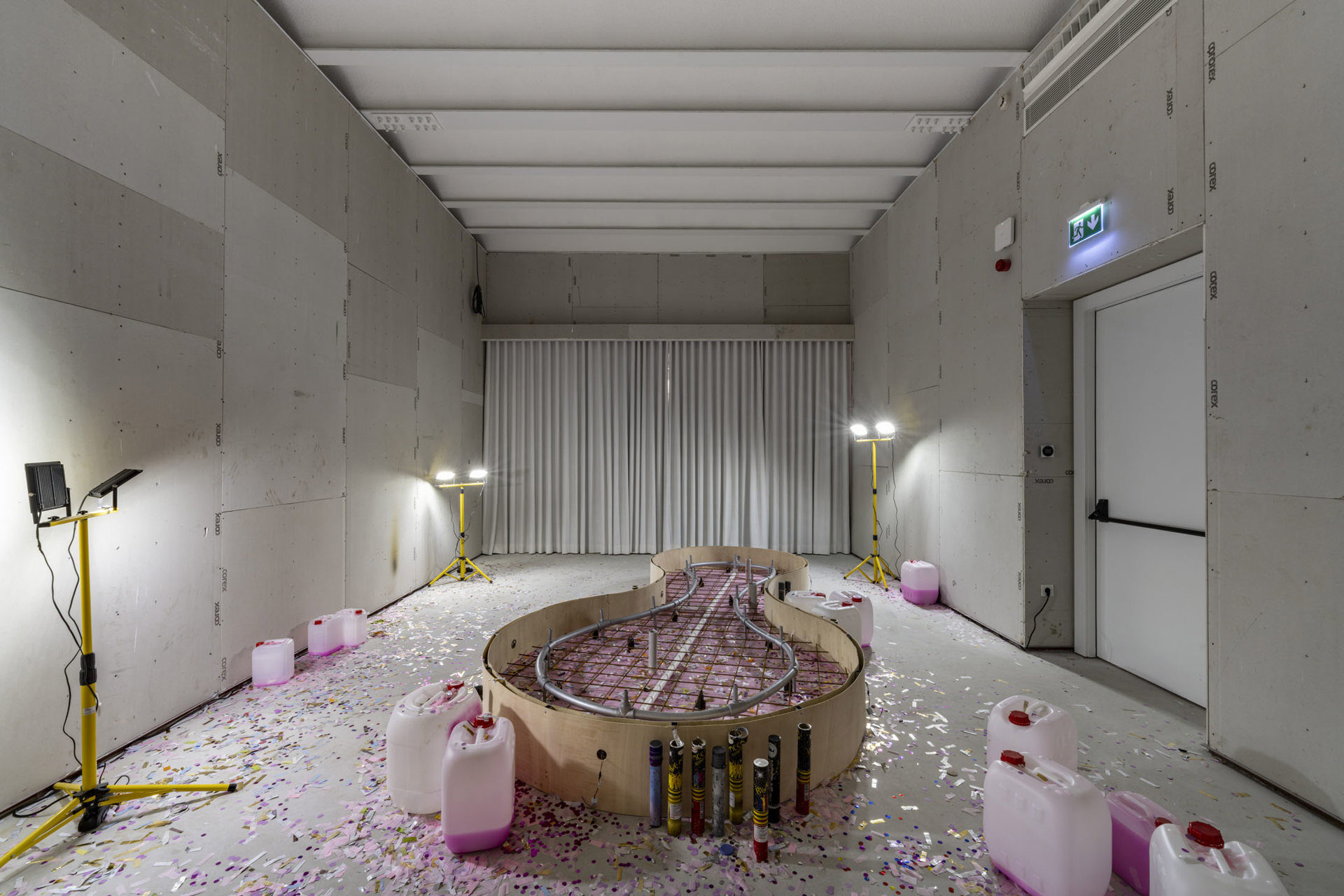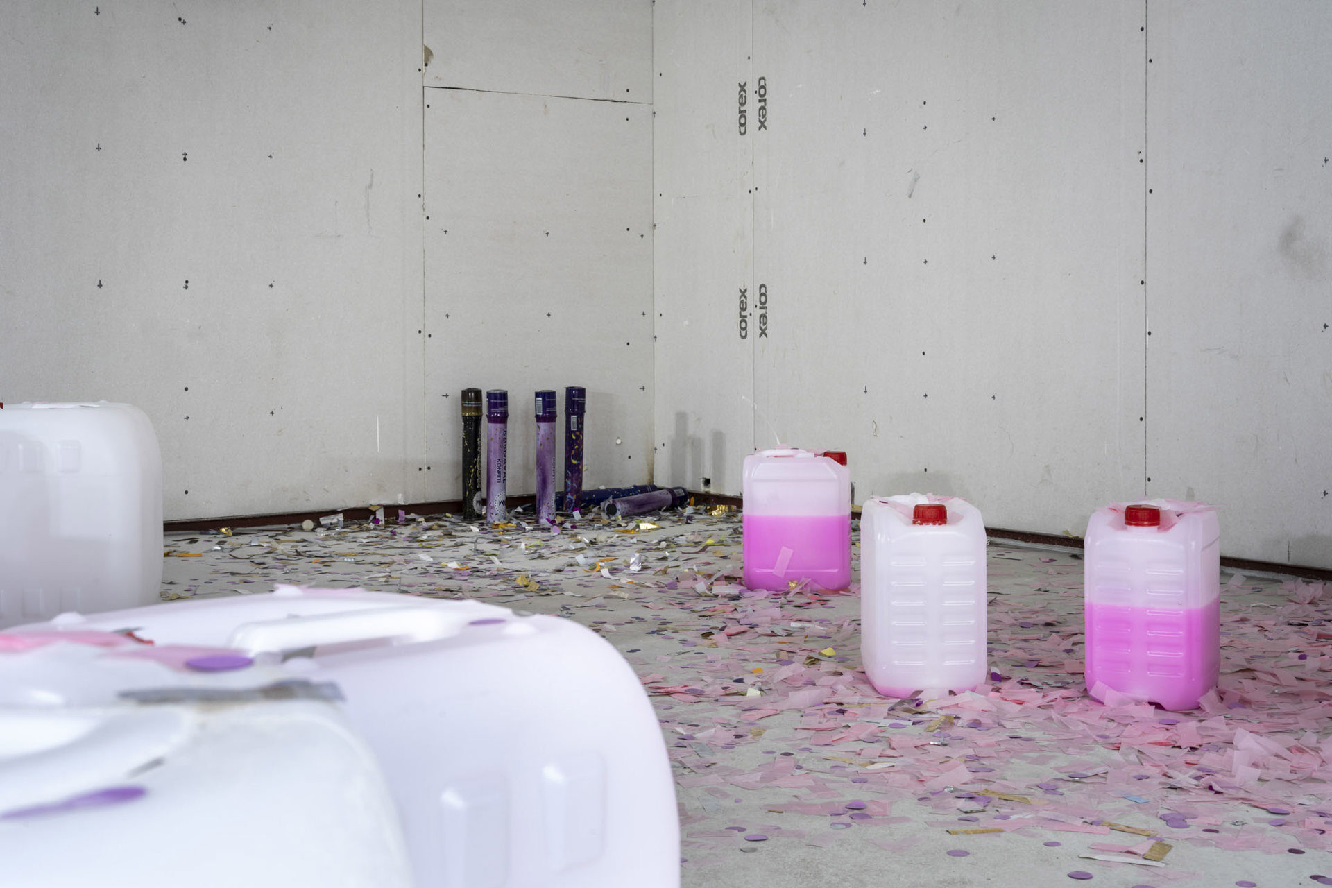 Works spanning three floors unfold within a construction atmosphere shaped by an unfinished fountain and scattered confetti. The exhibition engages with expressive actions such as performing, rising from the ground, launching into the air, and exploding, each approached with different durations, speeds, and intensities. Bayraktar interprets these gestures as repeated vertical impulses that signify productivity and domination, framing them as power performances within hierarchical systems that are not specific to art but operate through self-elevating structures.