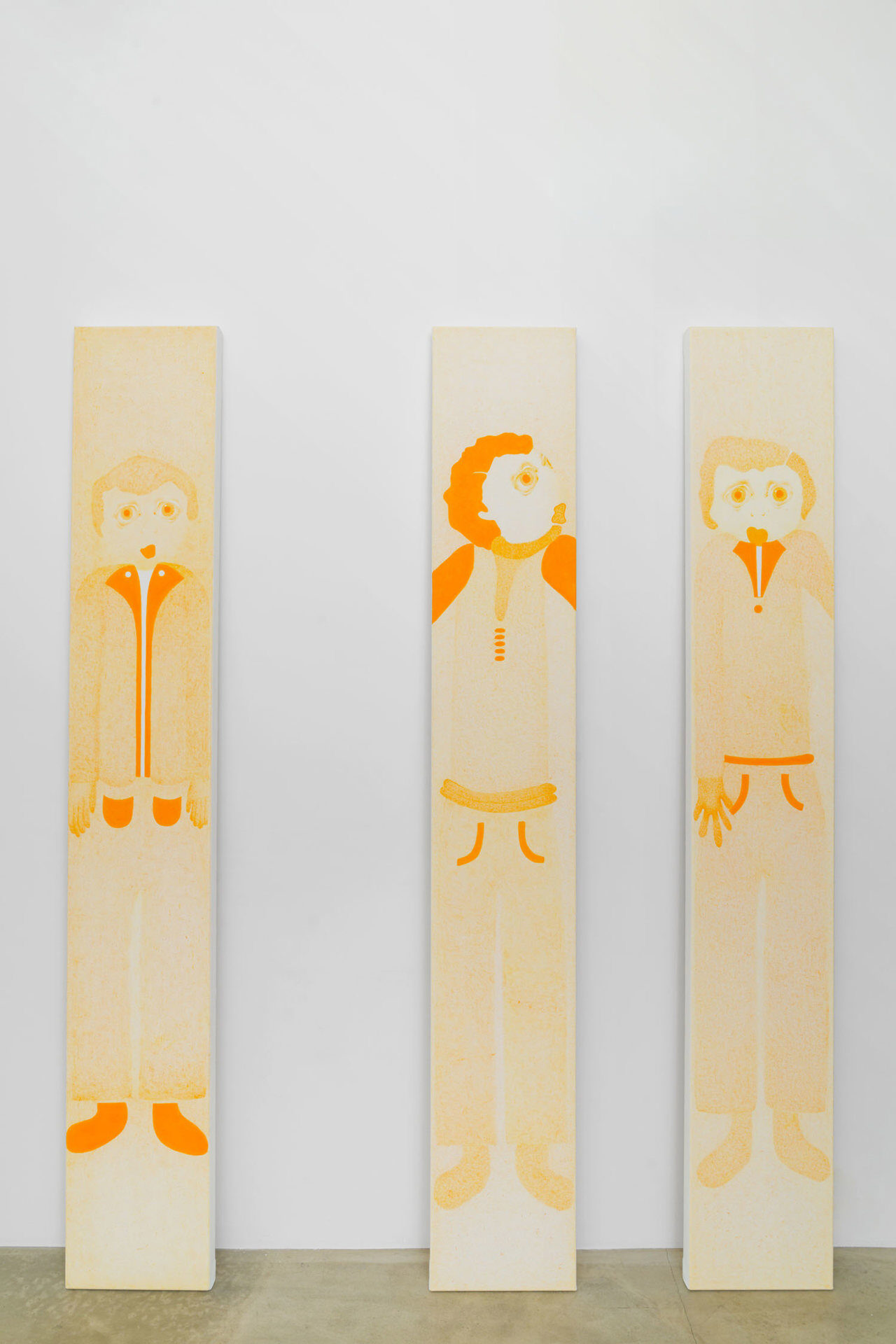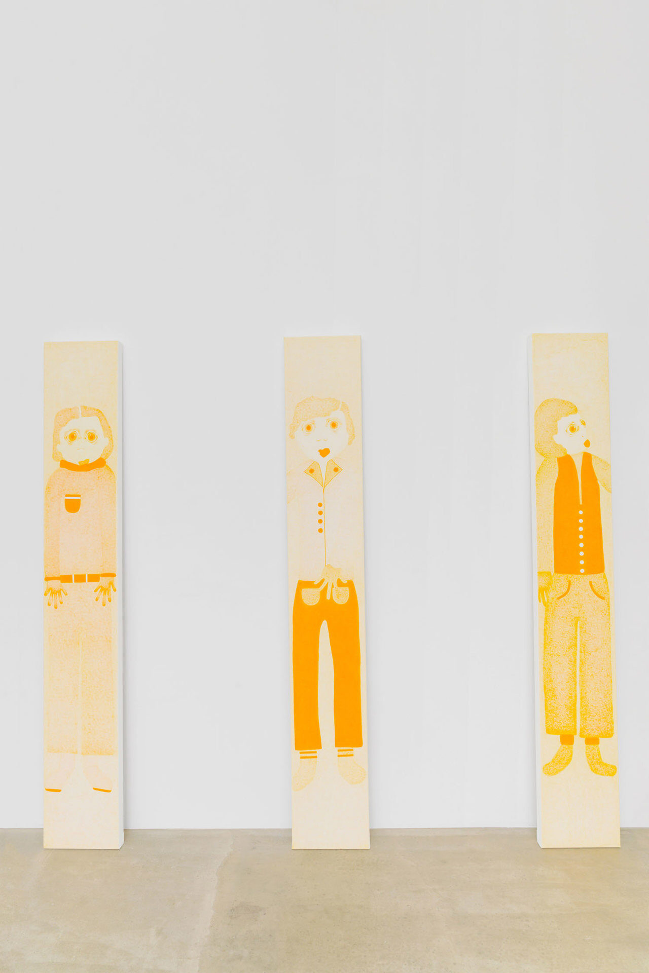 The first solo exhibition in France by Anjesa Dellova (b. Kosovo, 1994) is entitled Passages. A sober word, it evokes as much the traversing of a place as it does a state of metamorphosis. In Sans titre gallery, the artist presents eighteen monochrome paintings in variations of vibrant orange, arranged on the ground, one following another, echoing the elongated architecture of the site. This arrangement extends the idea of a corridor or path that the visitor is invited to take, almost in procession, between figures that seem to float in suspense in…