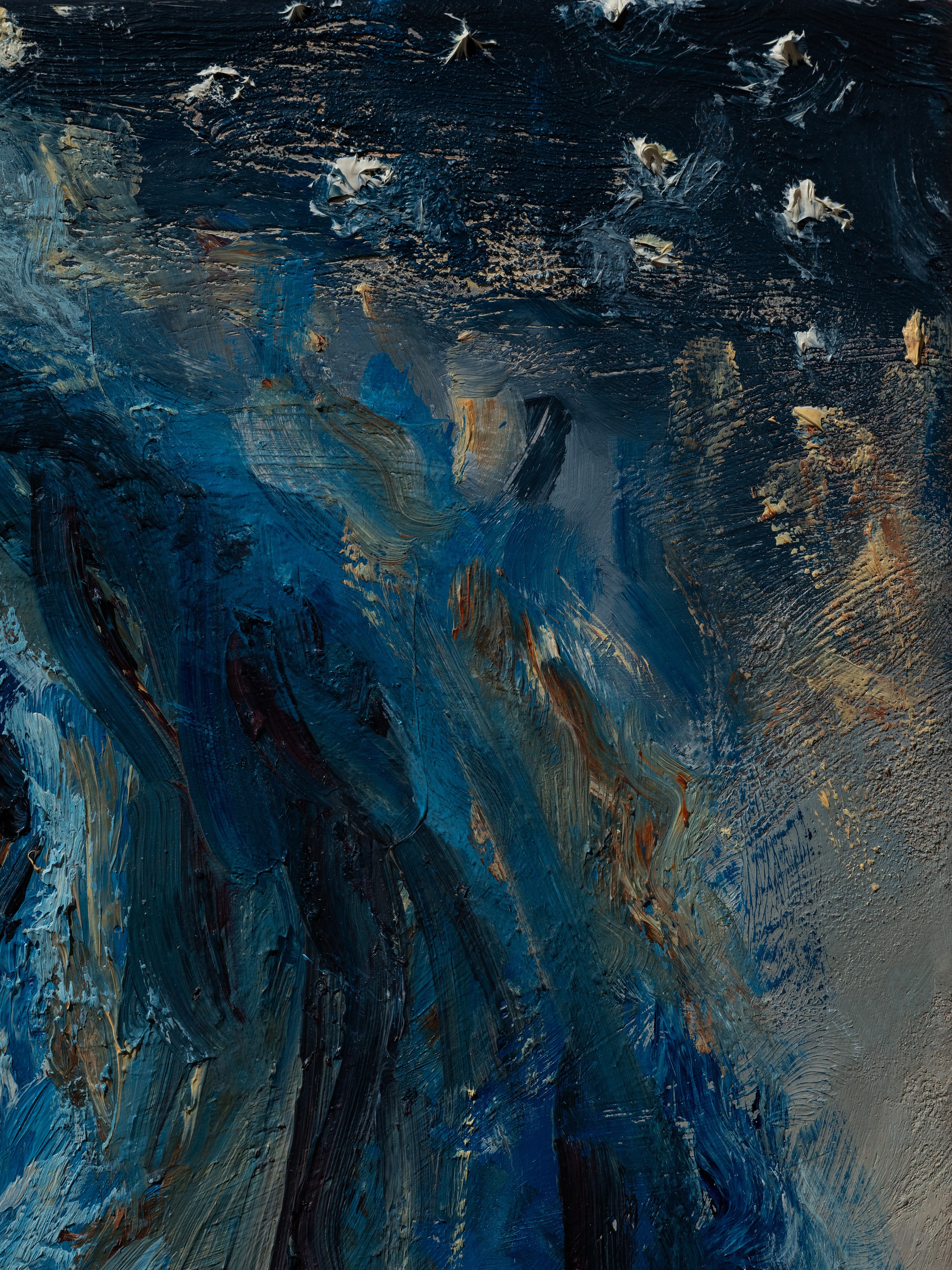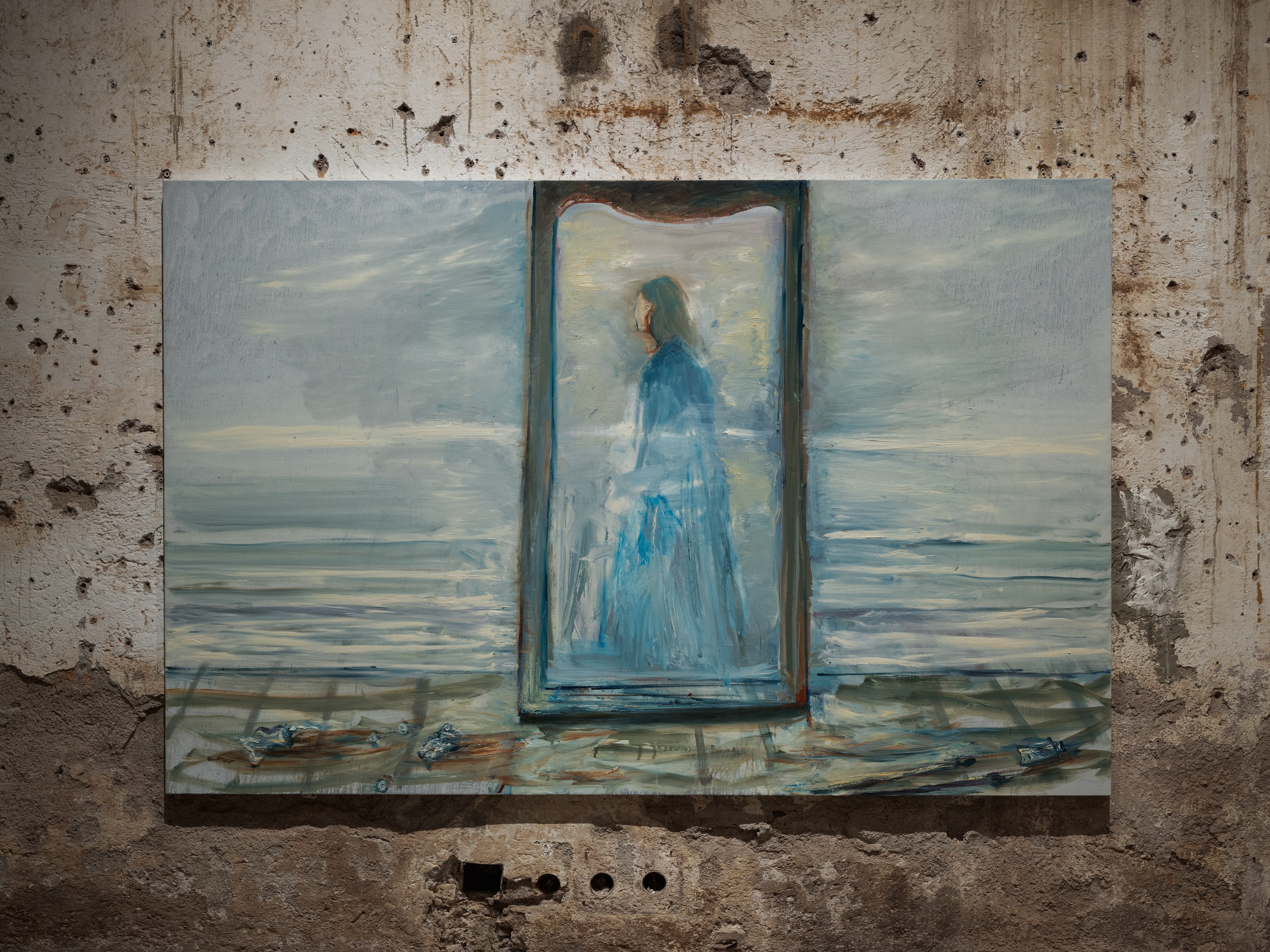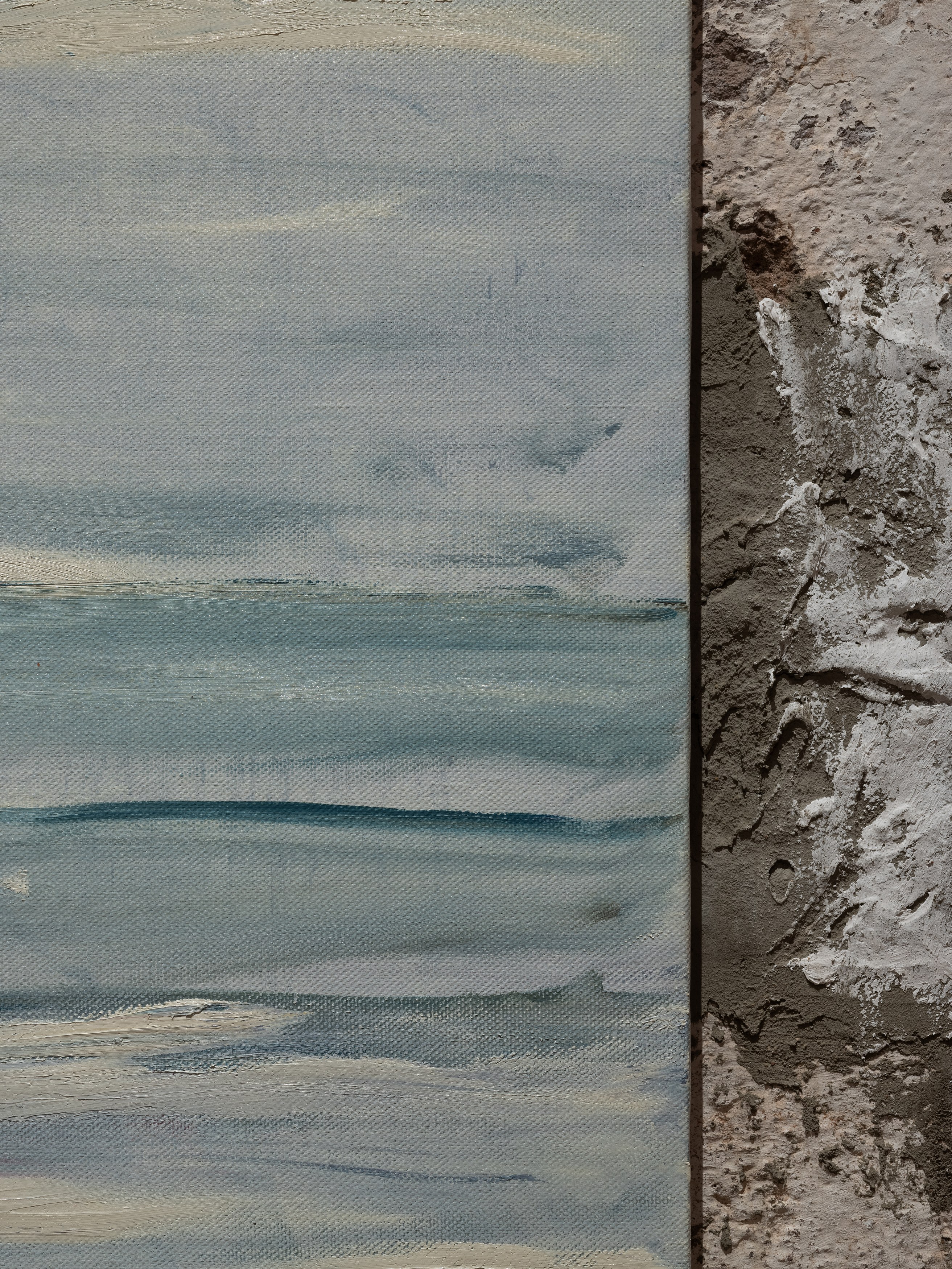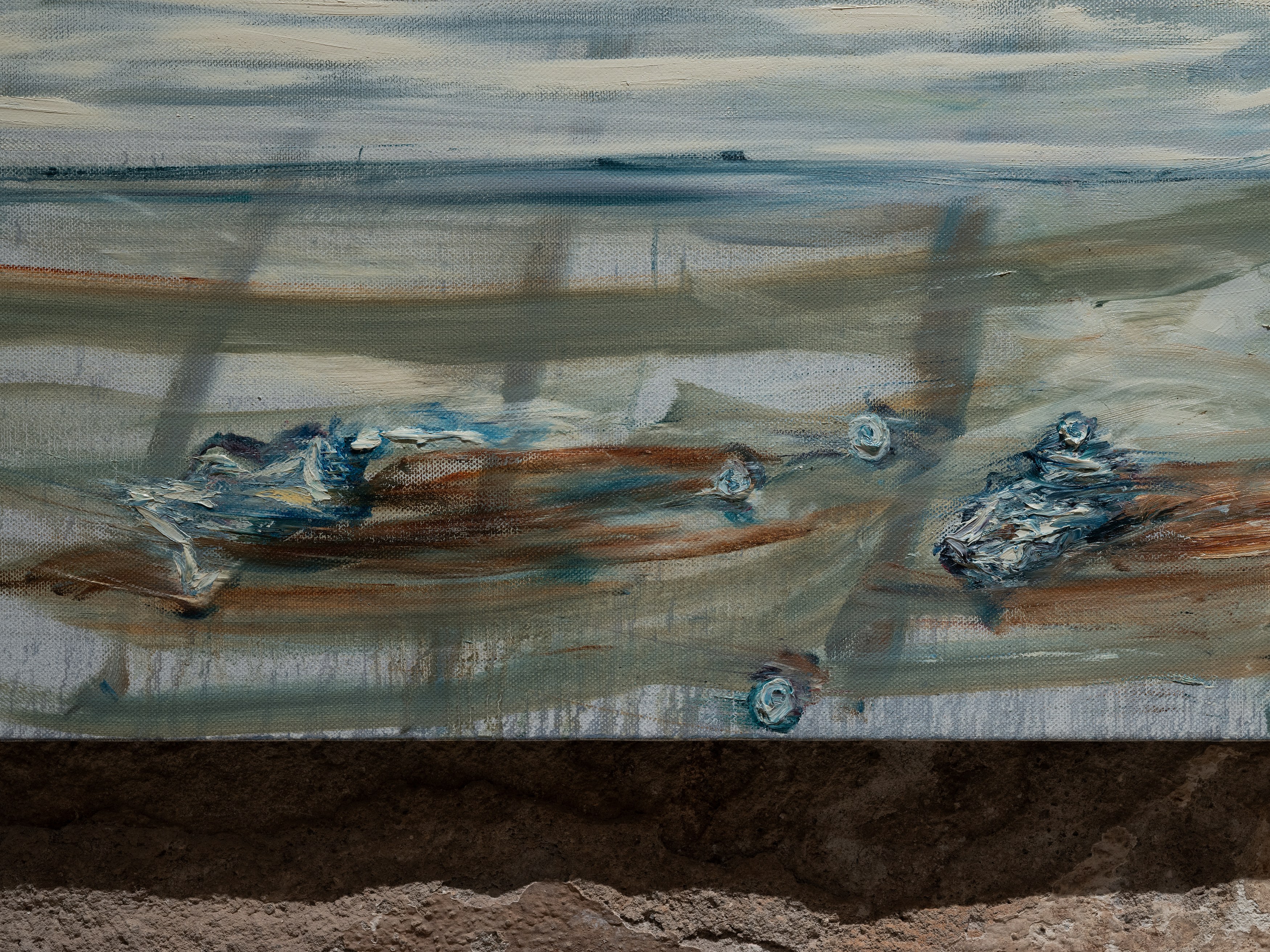 The title of my painting is taken from the great poem by W.H. Auden^{1}. In The Sea and The Mirror, Auden recreates the narrative of The Tempest, Shakespeare’s play about a group of survivors on a small sea-locked island, and gives the characters new voices. For me, Caliban’s monologue is the pivotal focus of Auden’s poem. Caliban is the outcast in Shakespeare’s play, and a source of danger and fascination. Auden makes Caliban speak the story of the outsider. Caliban’s words are full of anguish and proud defiance.