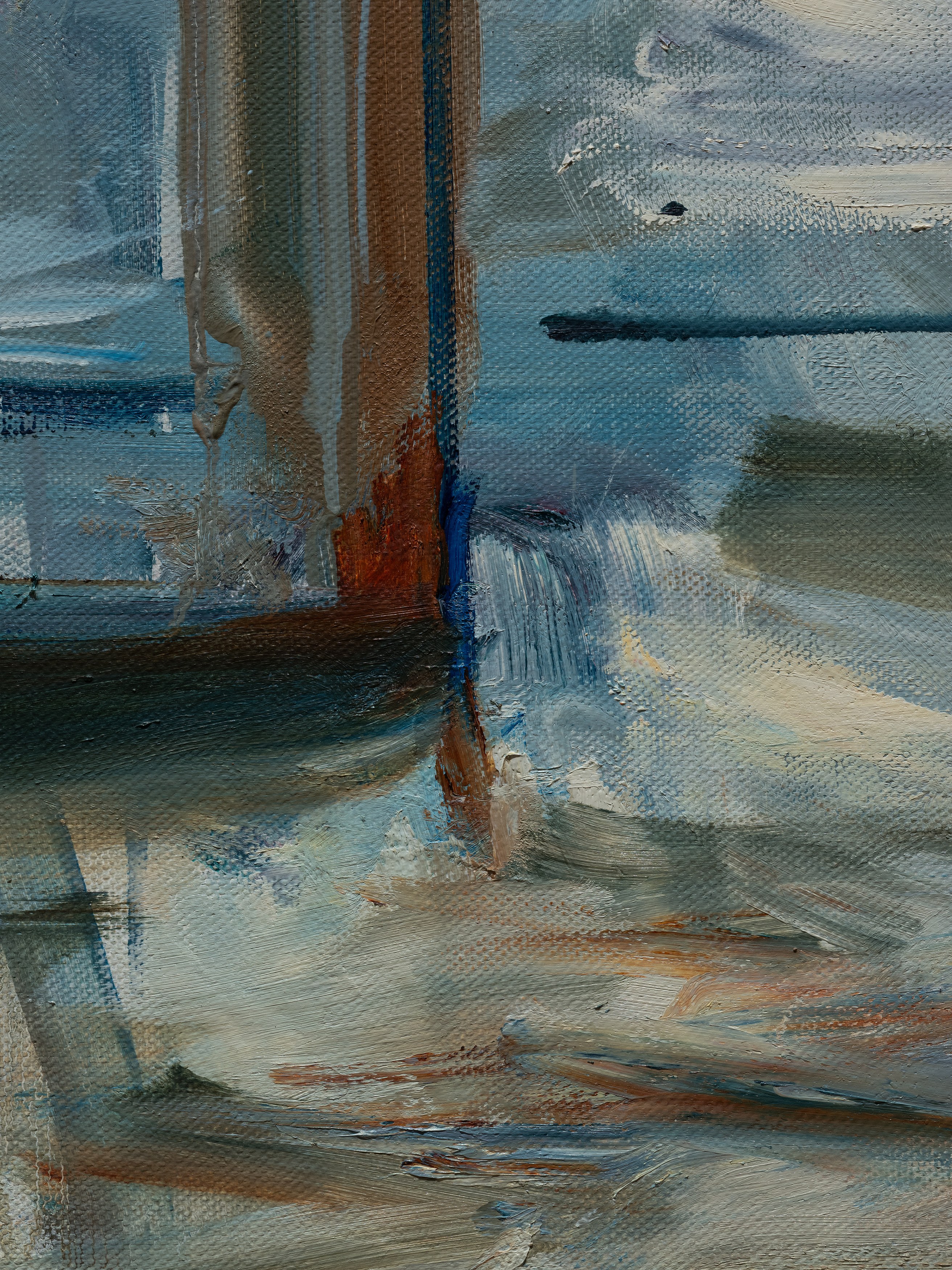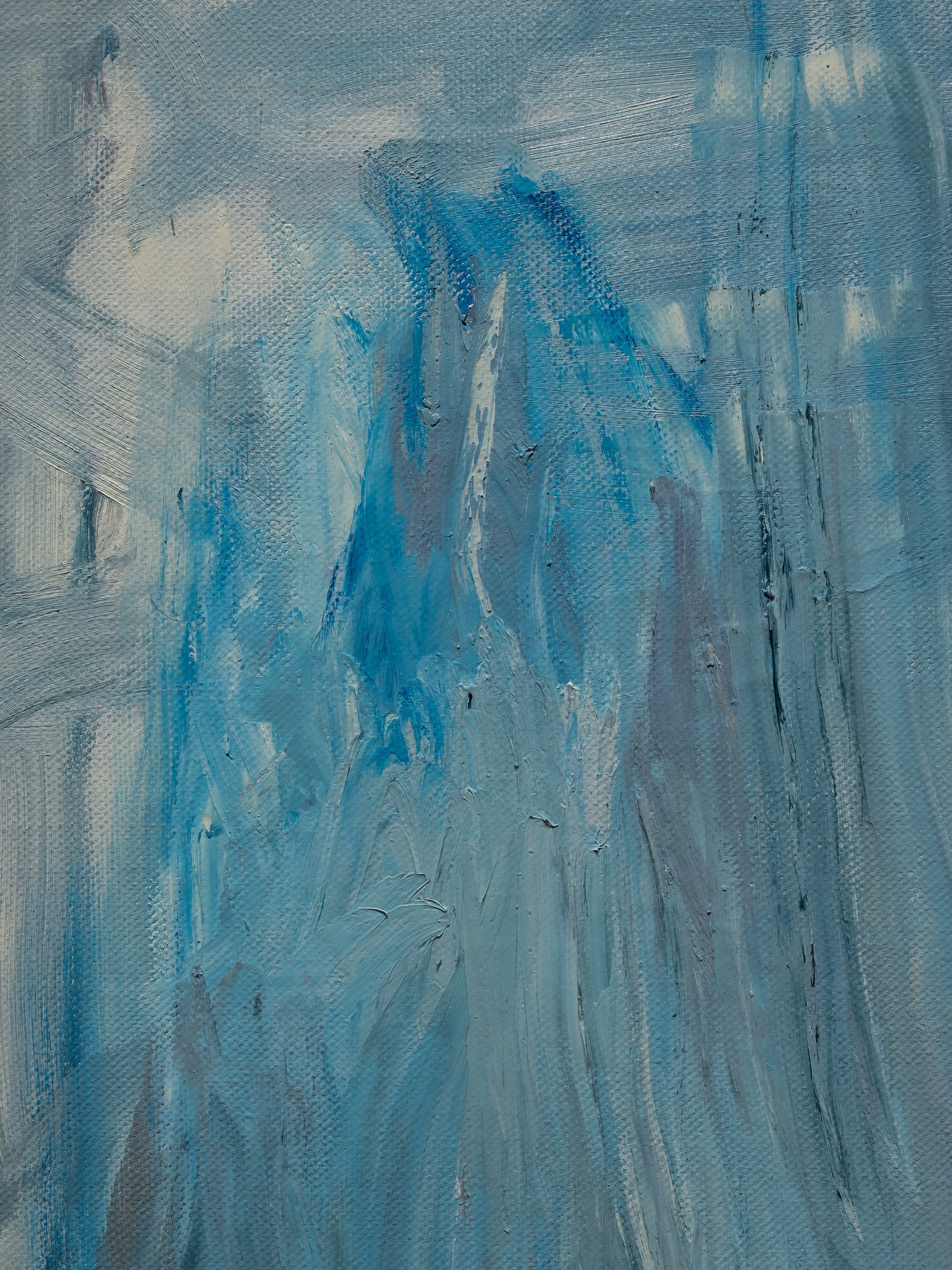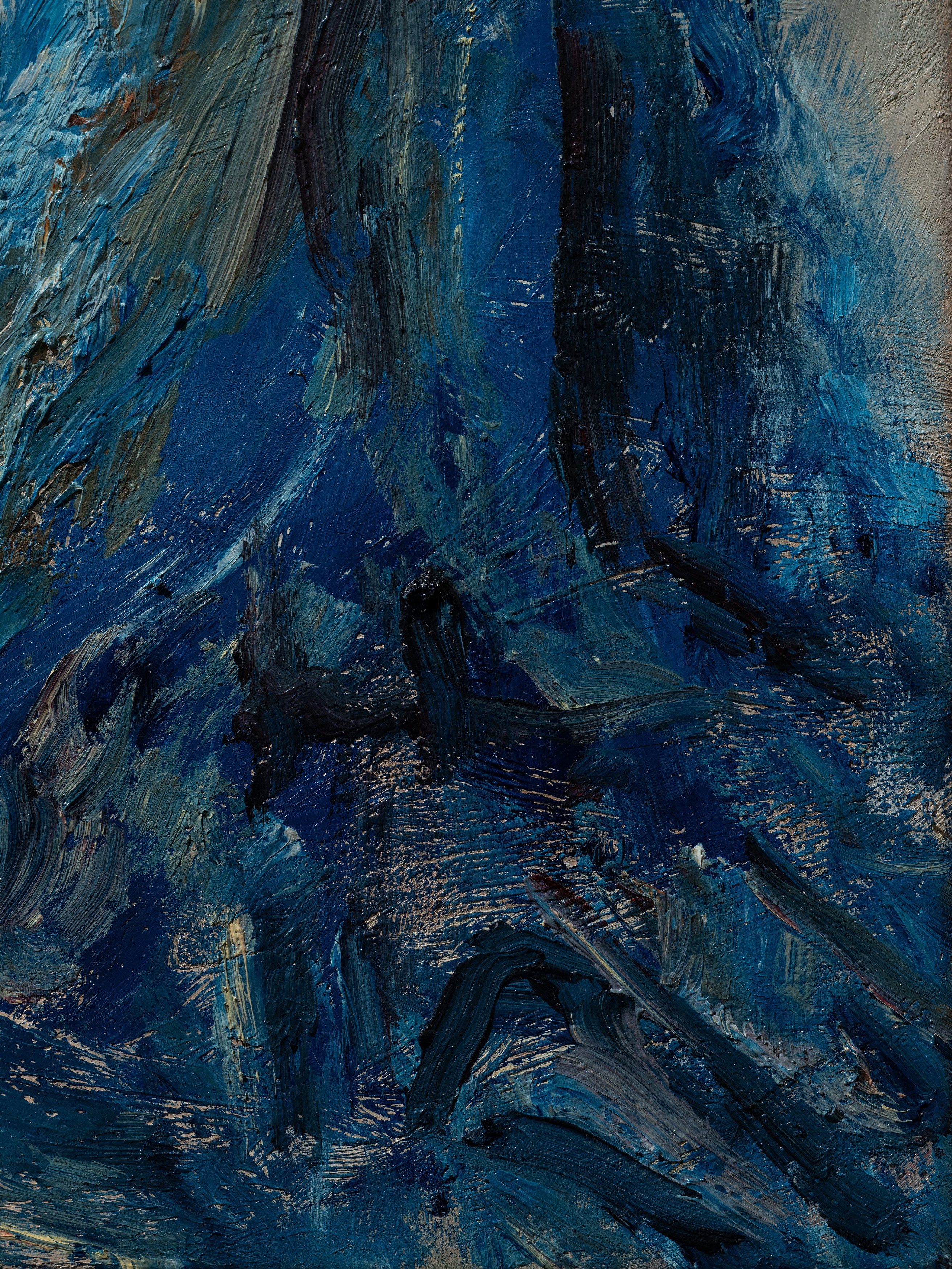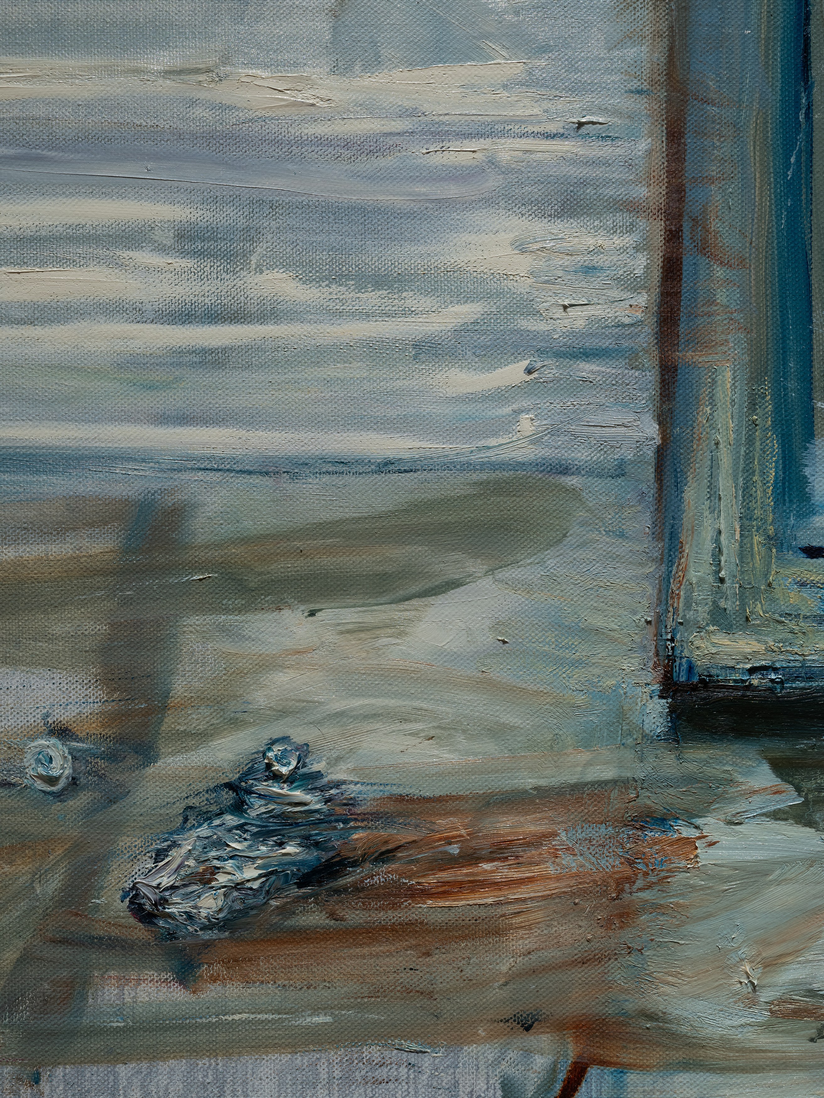 The title of my painting is taken from the great poem by W.H. Auden^{1}. In The Sea and The Mirror, Auden recreates the narrative of The Tempest, Shakespeare’s play about a group of survivors on a small sea-locked island, and gives the characters new voices. For me, Caliban’s monologue is the pivotal focus of Auden’s poem. Caliban is the outcast in Shakespeare’s play, and a source of danger and fascination. Auden makes Caliban speak the story of the outsider. Caliban’s words are full of anguish and proud defiance.