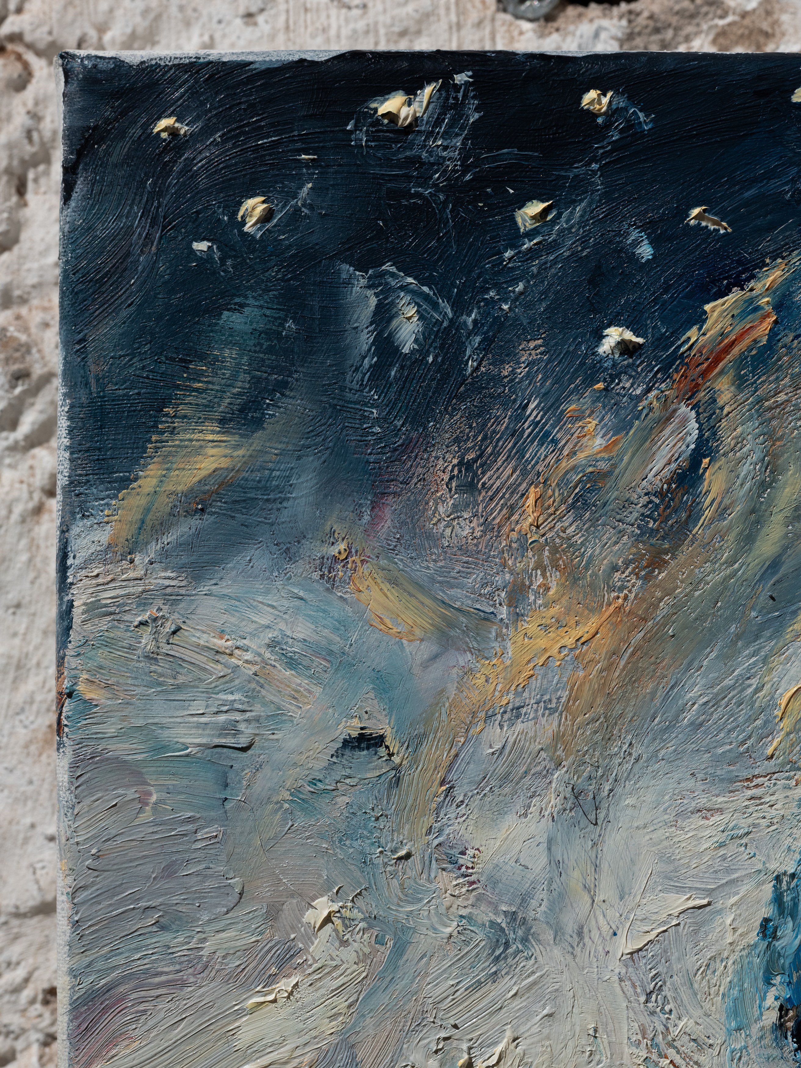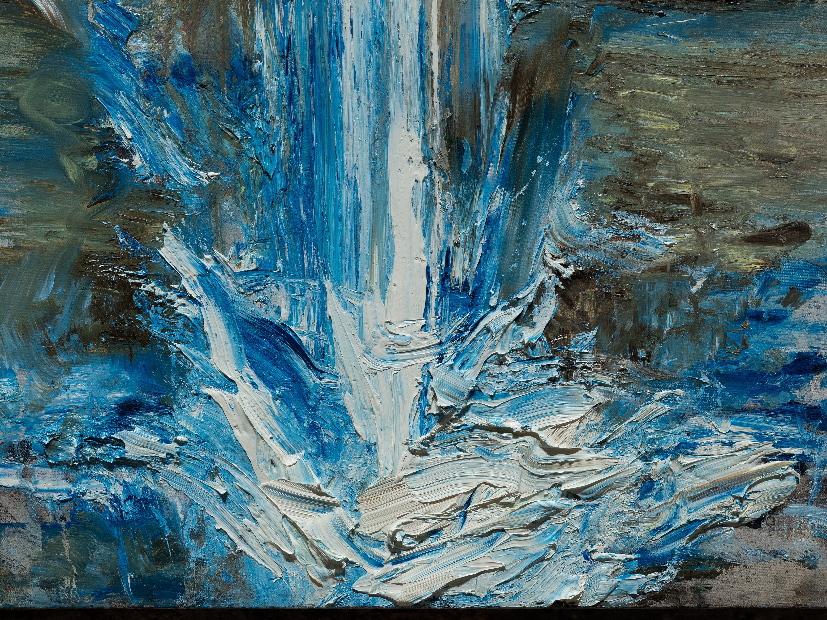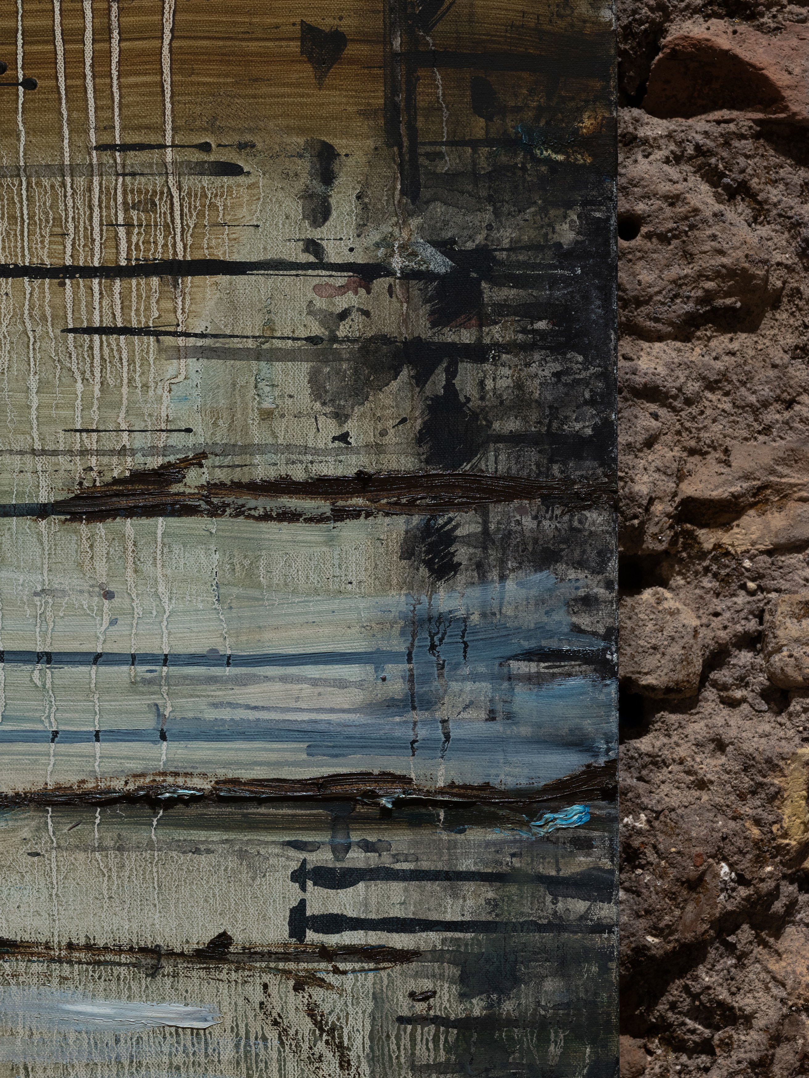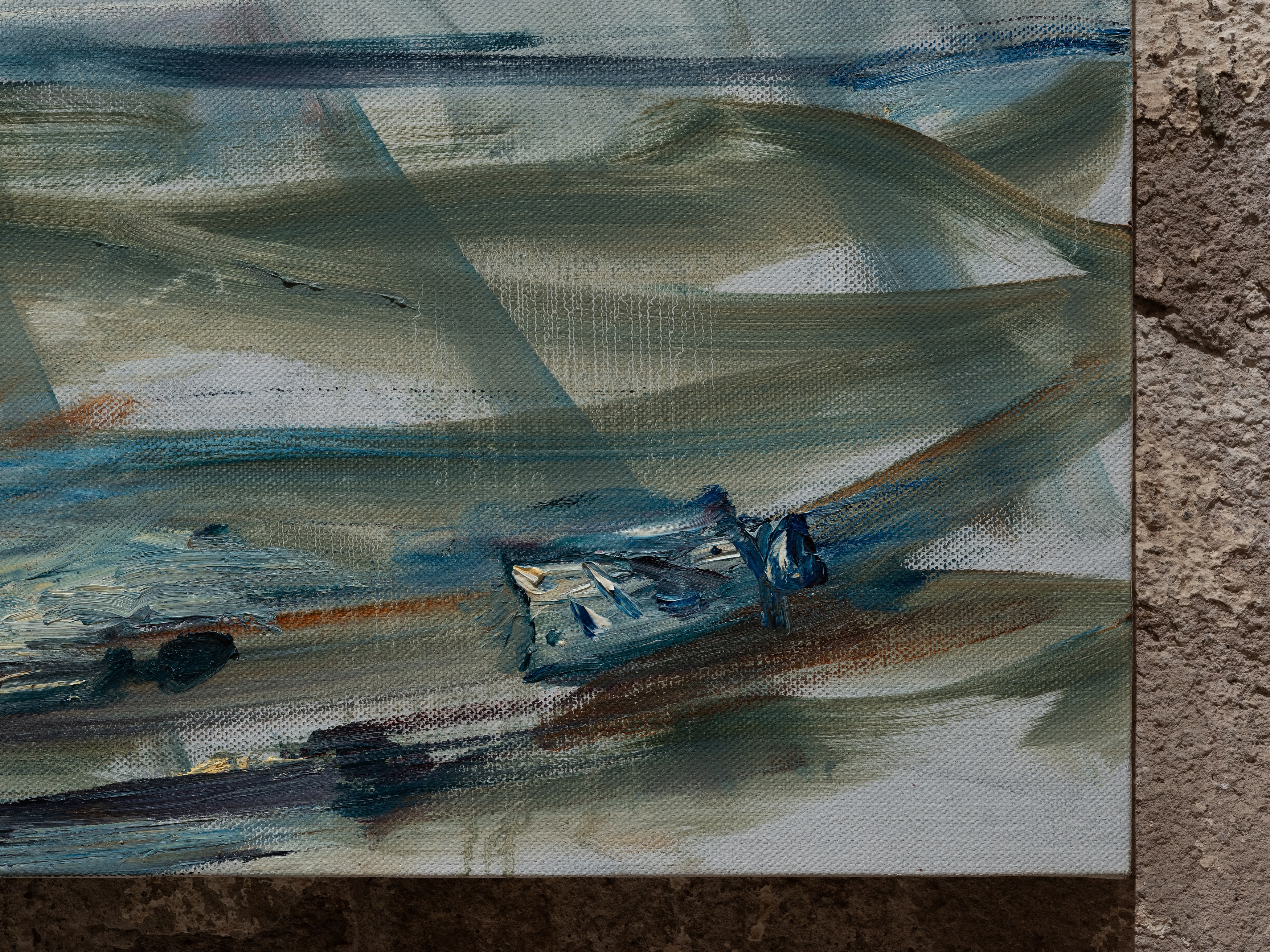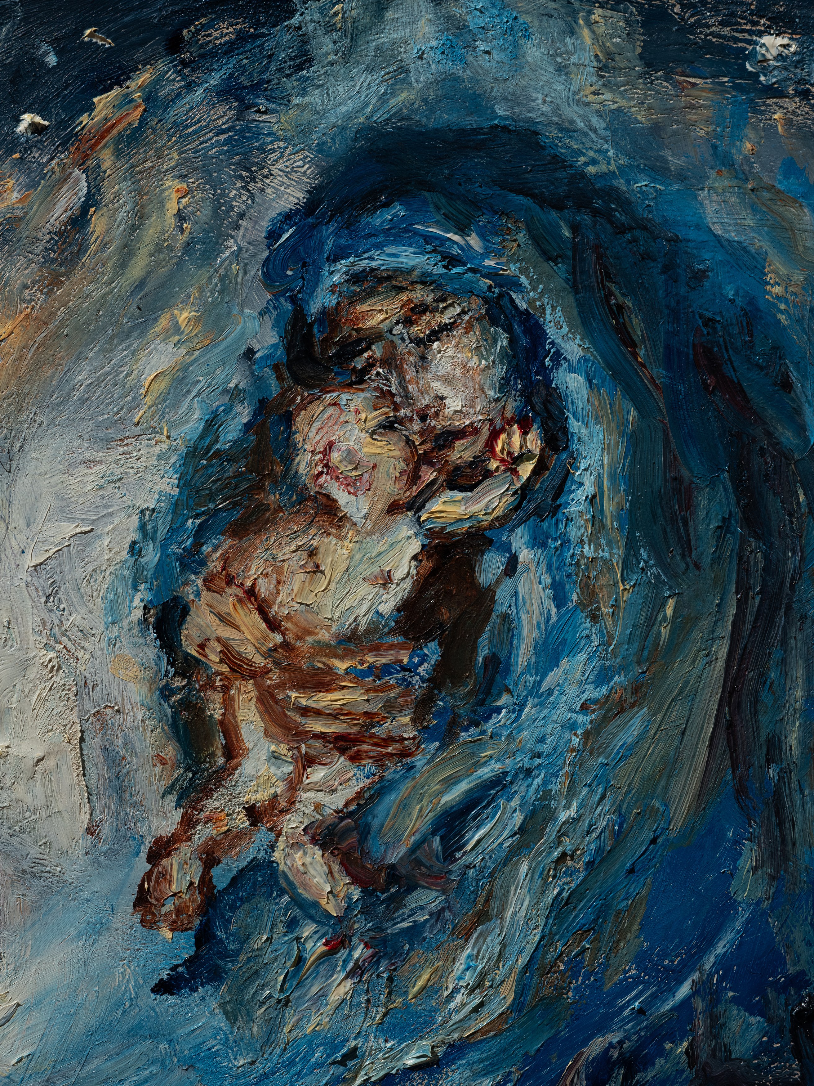 The title of my painting is taken from the great poem by W.H. Auden^{1}. In The Sea and The Mirror, Auden recreates the narrative of The Tempest, Shakespeare’s play about a group of survivors on a small sea-locked island, and gives the characters new voices. For me, Caliban’s monologue is the pivotal focus of Auden’s poem. Caliban is the outcast in Shakespeare’s play, and a source of danger and fascination. Auden makes Caliban speak the story of the outsider. Caliban’s words are full of anguish and proud defiance.
