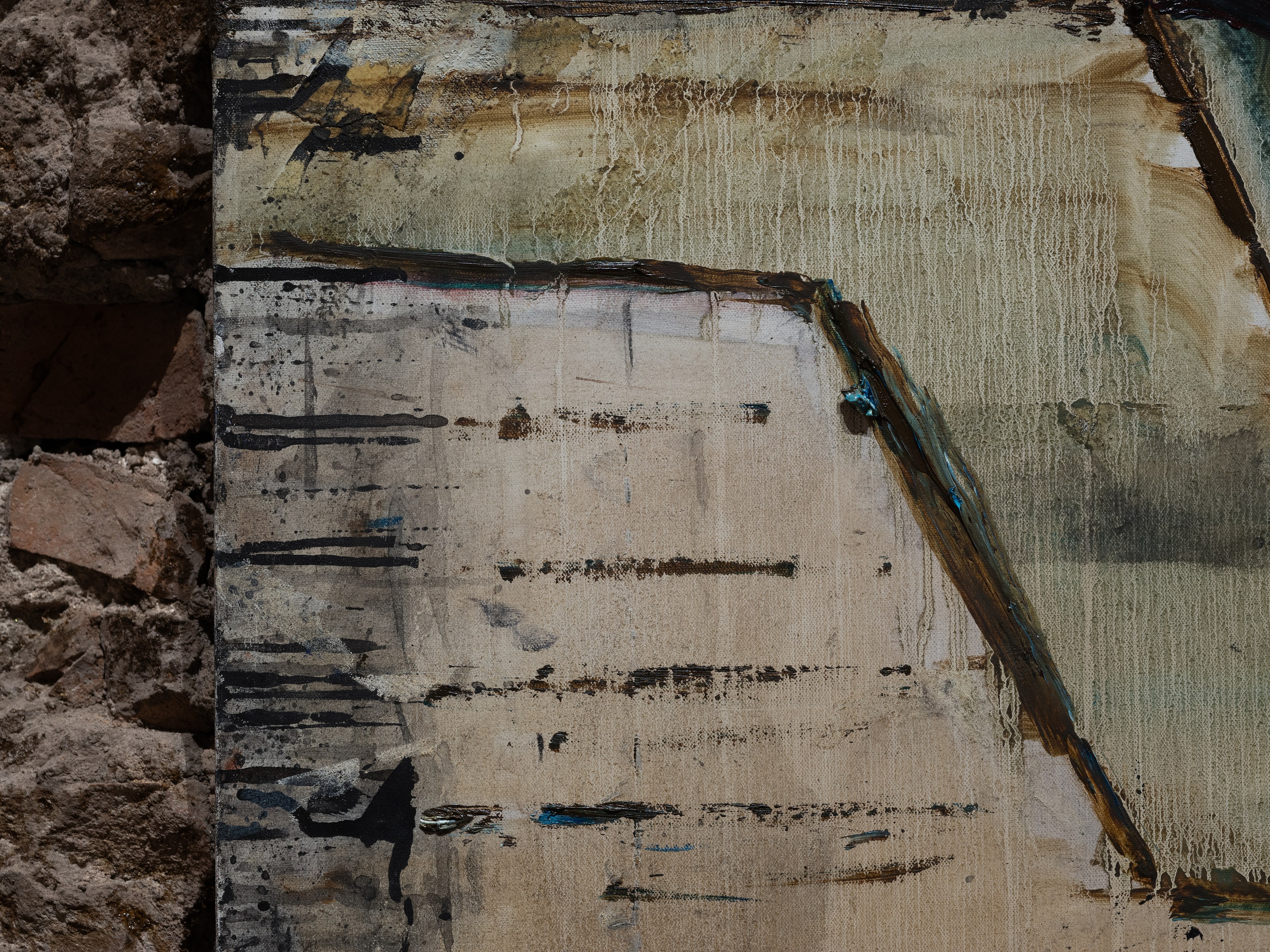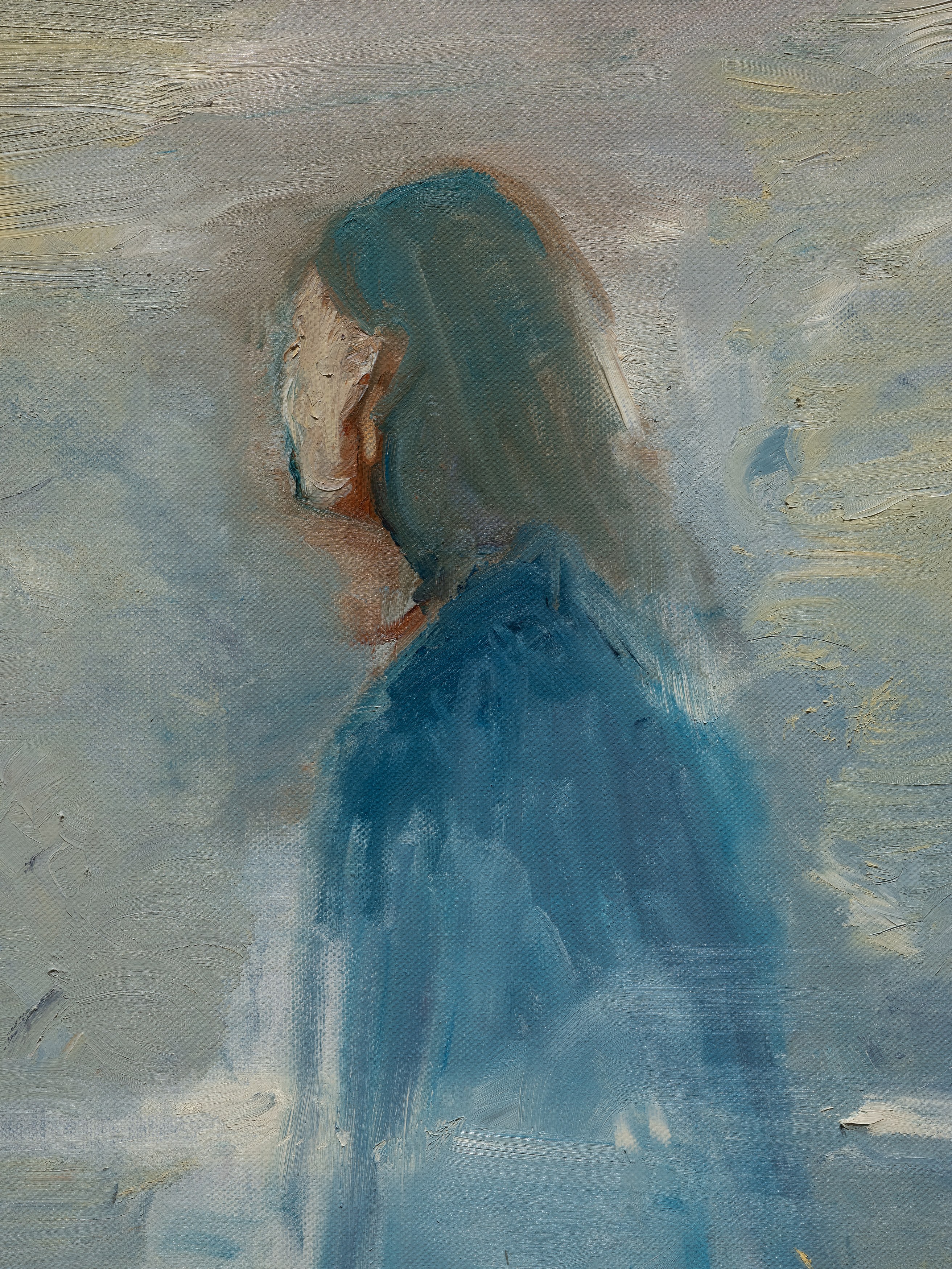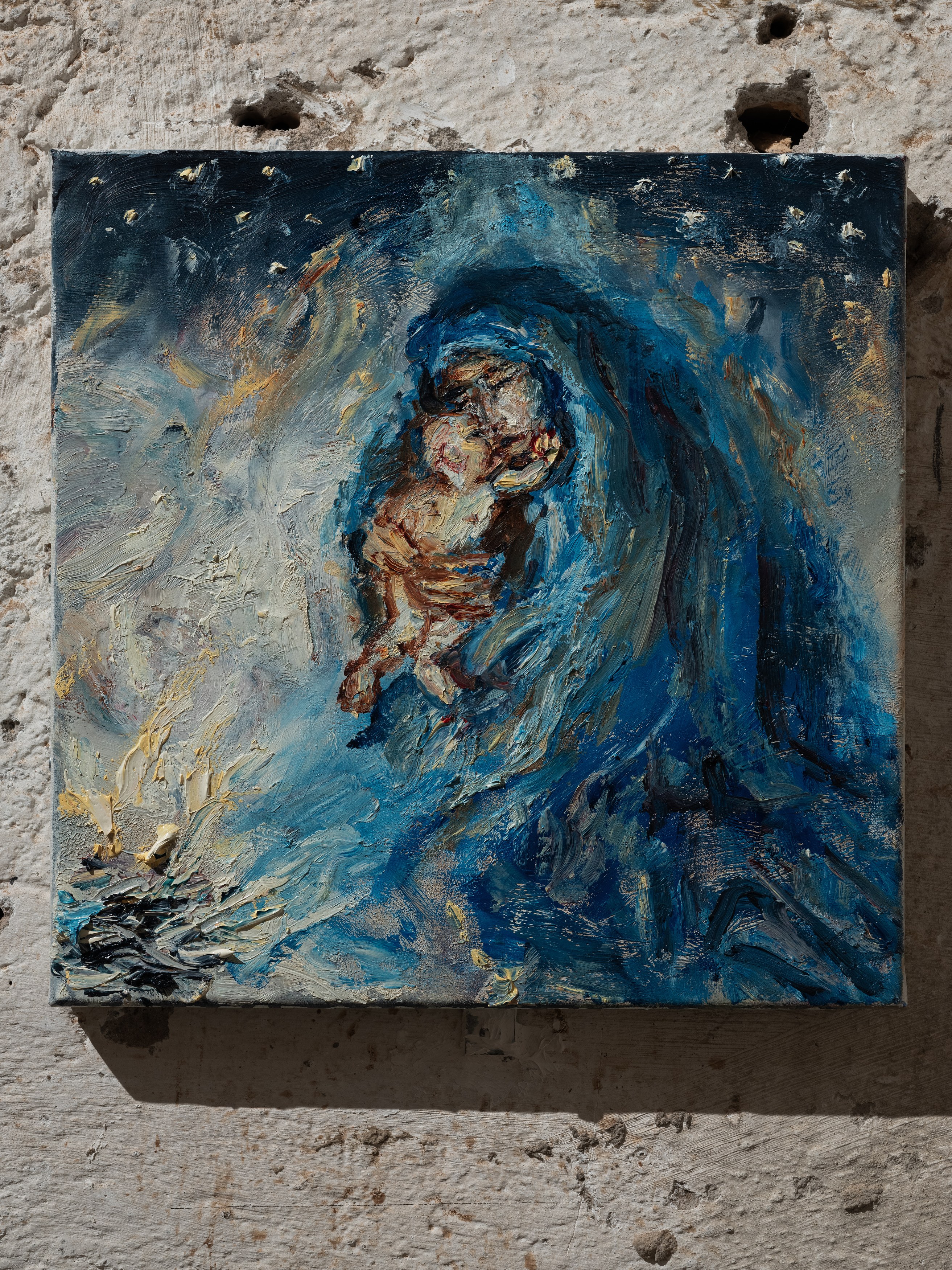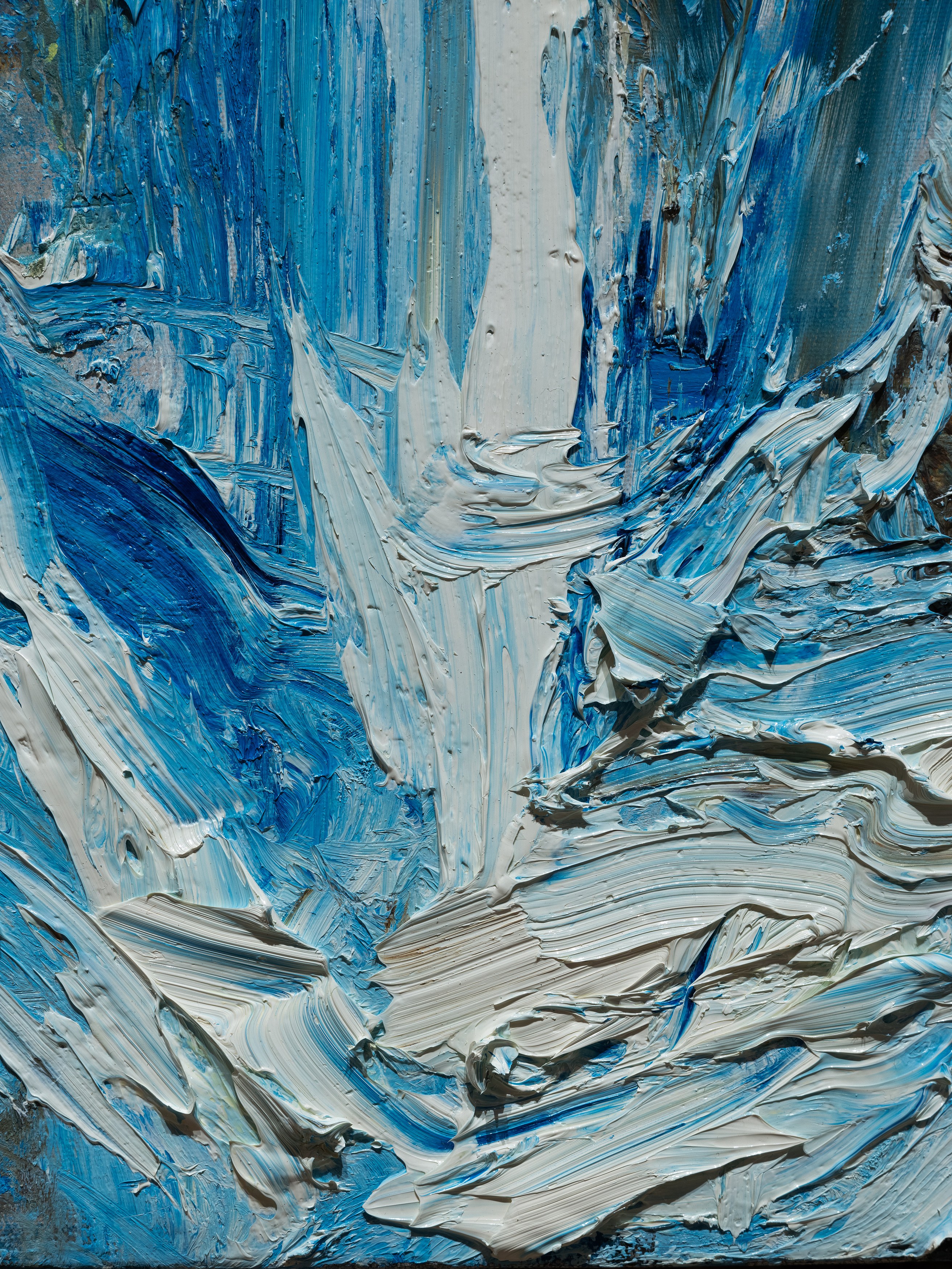 The title of my painting is taken from the great poem by W.H. Auden^{1}. In The Sea and The Mirror, Auden recreates the narrative of The Tempest, Shakespeare’s play about a group of survivors on a small sea-locked island, and gives the characters new voices. For me, Caliban’s monologue is the pivotal focus of Auden’s poem. Caliban is the outcast in Shakespeare’s play, and a source of danger and fascination. Auden makes Caliban speak the story of the outsider. Caliban’s words are full of anguish and proud defiance.