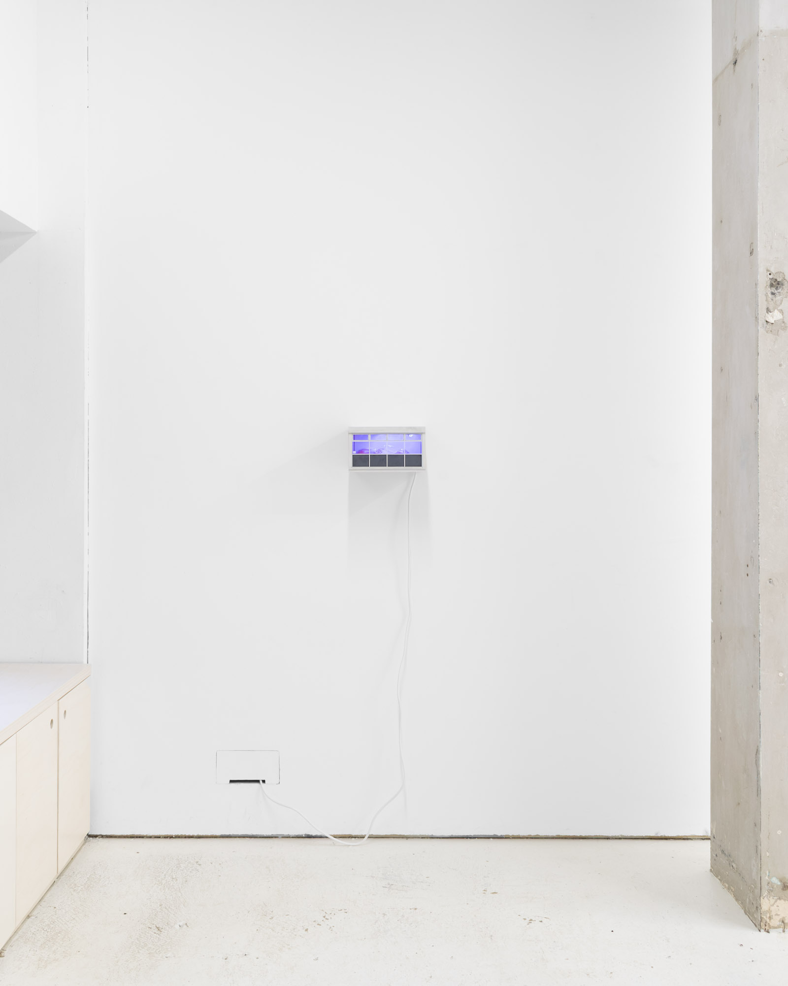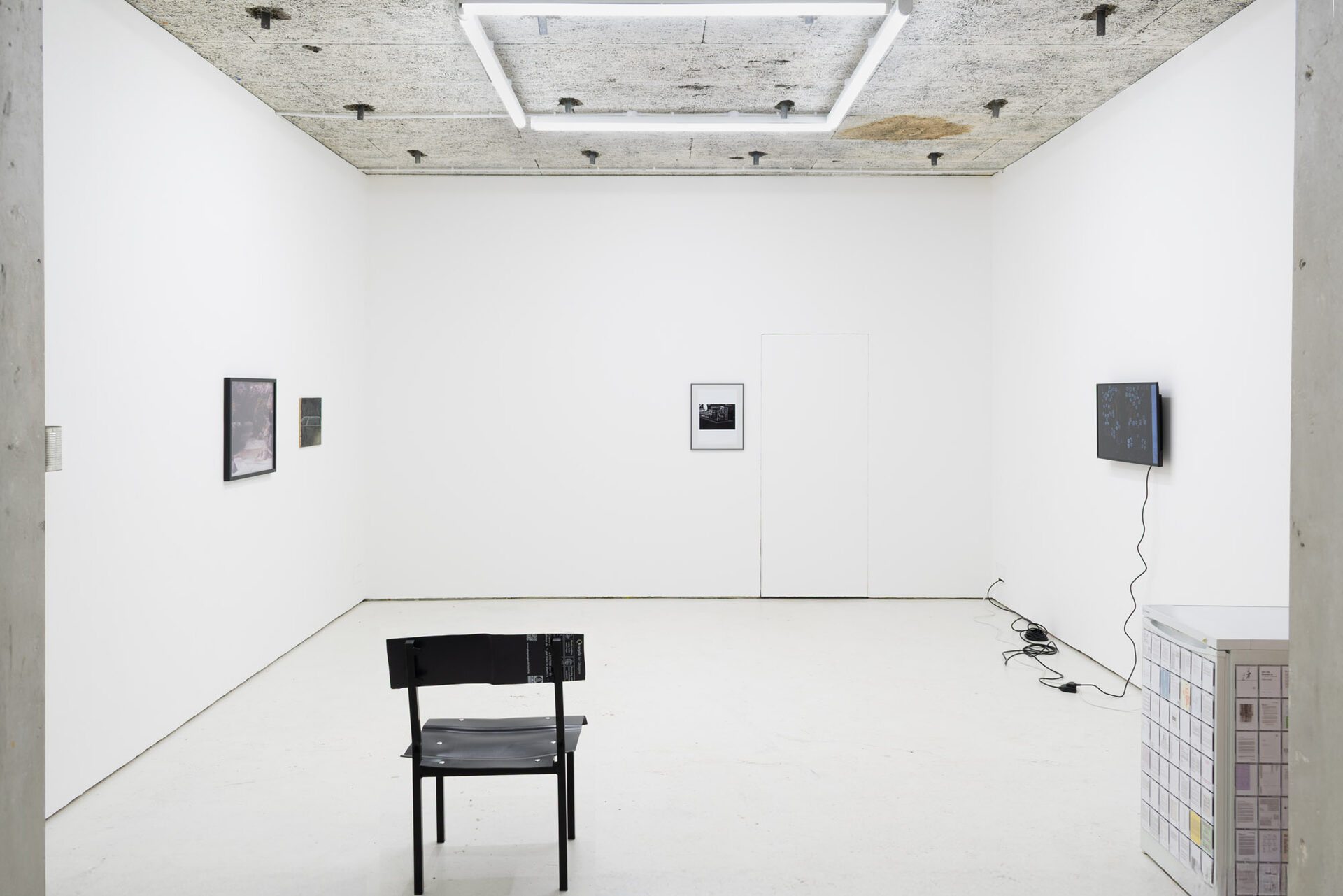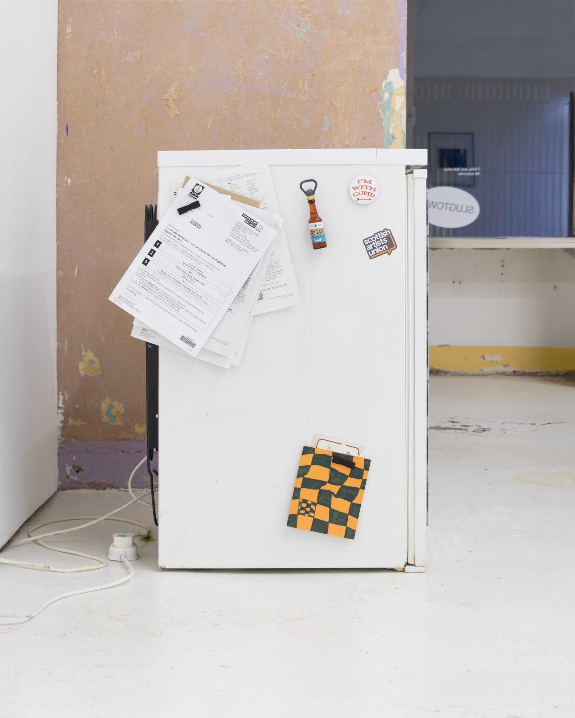 The title is borrowed from Ewan Murray’s painting of the same name. It refers to a motif shared across the works in the show, as well as the function of exhibition space itself. The artworks variously allude to entry and occupation of spaces, and the arrangement of objects within them – be those unusual, utopian or prosaic. They often refer to activities which run alongside or help maintain an art practice but are not always shared openly: family, a service industry job, commuting, living space, and travel.