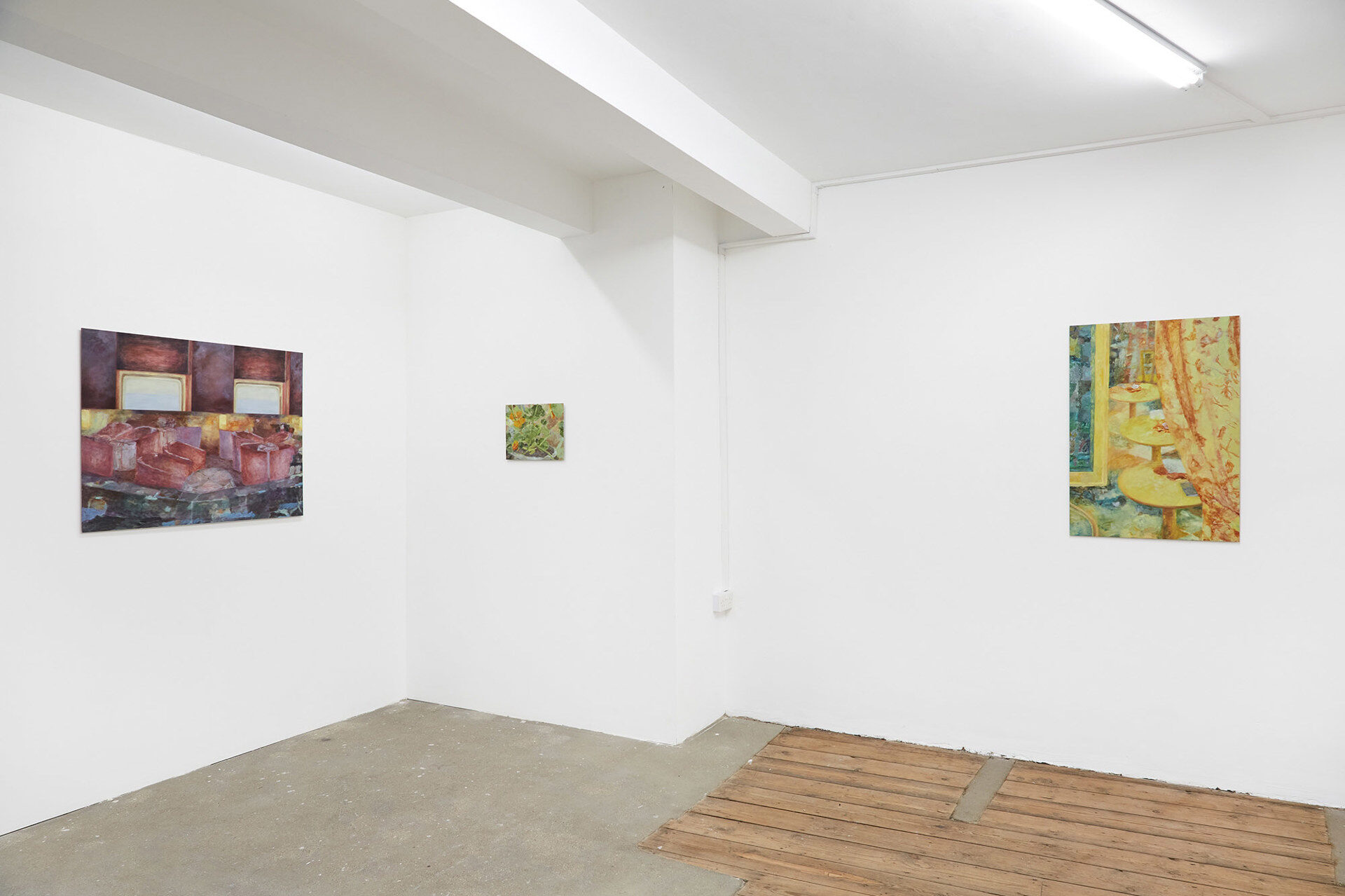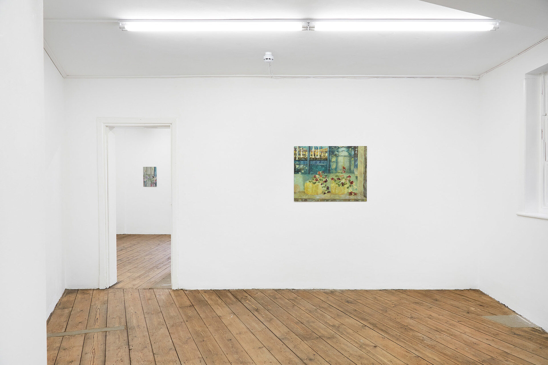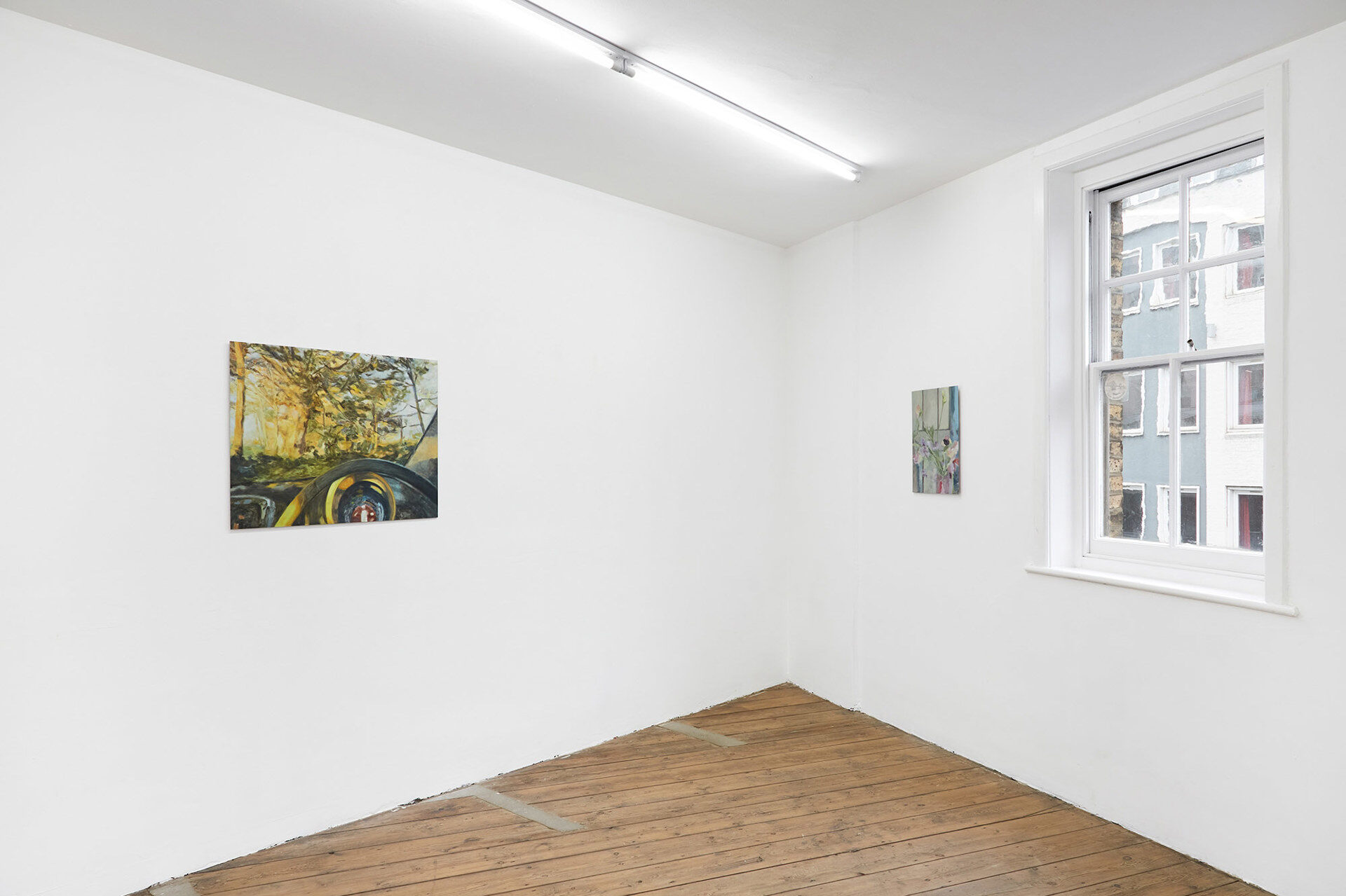 For her second solo exhibition at South Parade, this collection of new paintings continues Zoë’s exploration into the experience of solitude within communal spaces, moments of transition and active attention. Zoë’s paintings unfold episodic scenes depicting transitory metropolitan spaces; a garden inside an Underground station, an office foyer, the landscape beyond a windscreen during a morning commute. And inwards towards the domestic; glimpses through residential windows, empty cafes, a still life of flowers. Areas we would otherwise pass through, or linger within a shared encounter, are captured and experienced in seclusion.