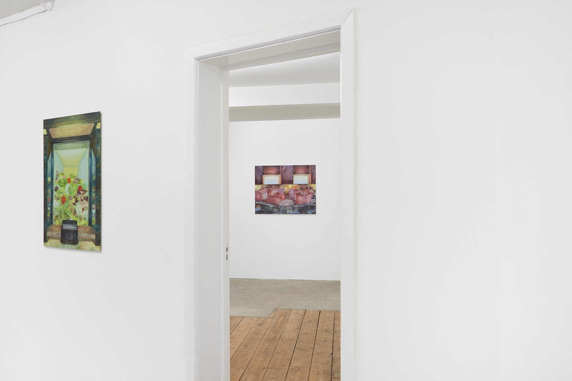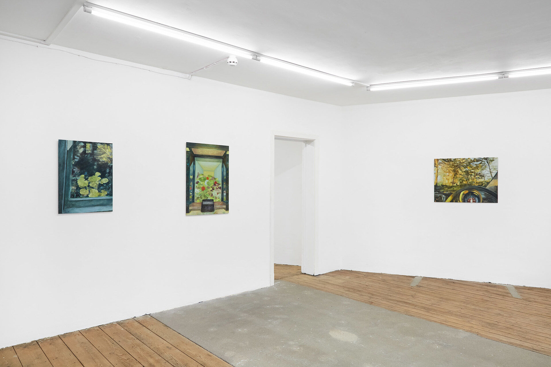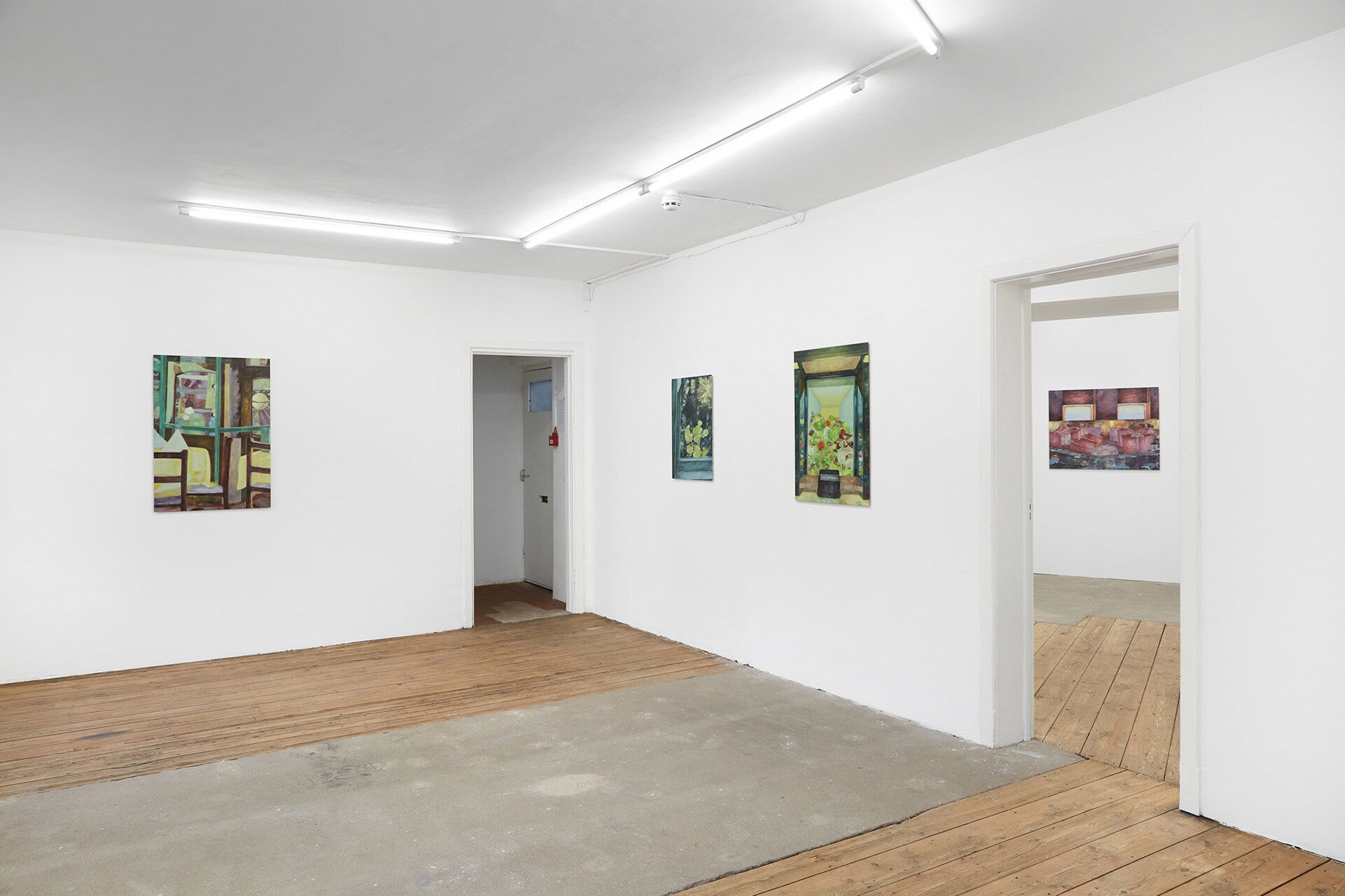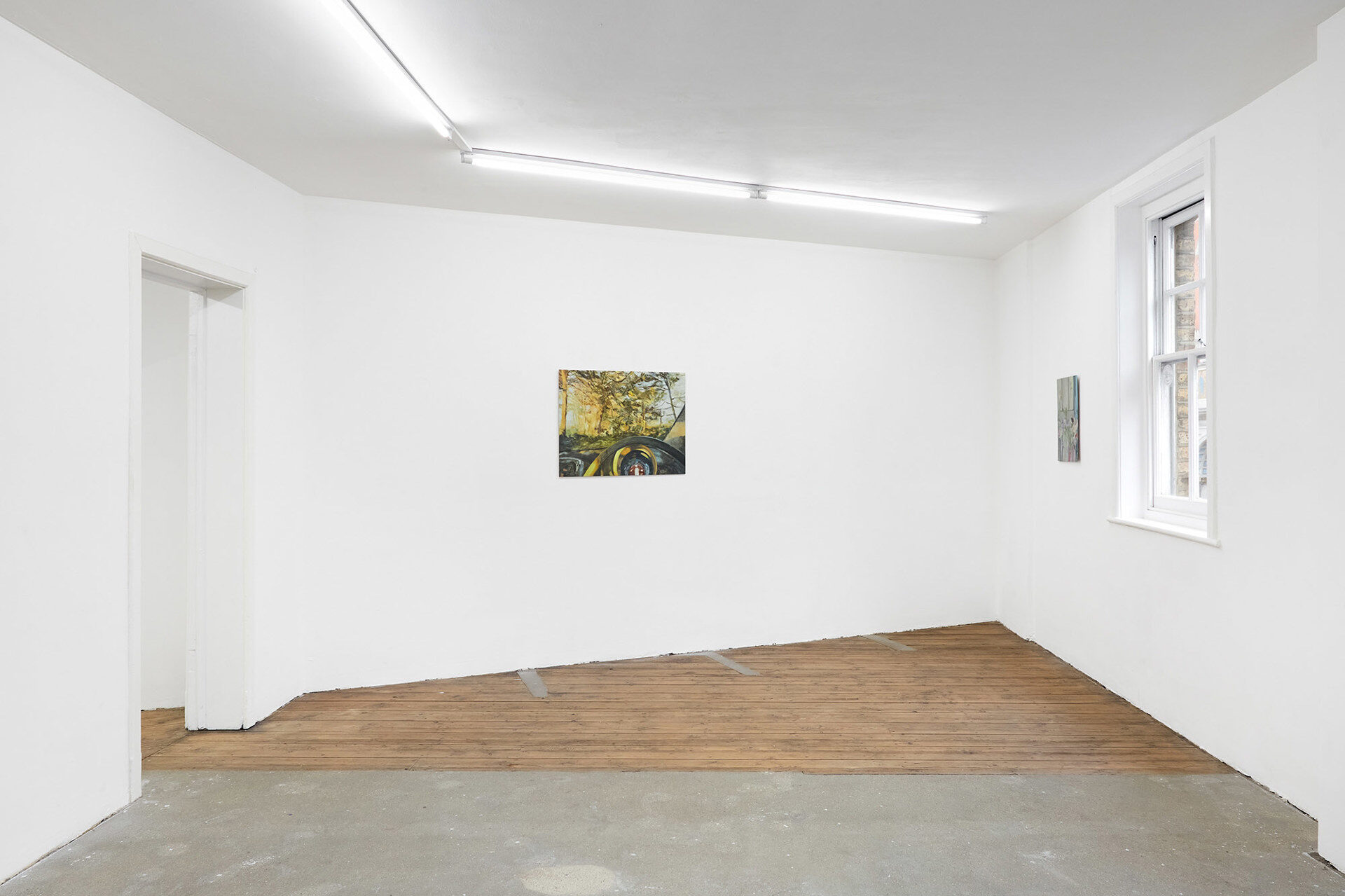 For her second solo exhibition at South Parade, this collection of new paintings continues Zoë’s exploration into the experience of solitude within communal spaces, moments of transition and active attention. Zoë’s paintings unfold episodic scenes depicting transitory metropolitan spaces; a garden inside an Underground station, an office foyer, the landscape beyond a windscreen during a morning commute. And inwards towards the domestic; glimpses through residential windows, empty cafes, a still life of flowers. Areas we would otherwise pass through, or linger within a shared encounter, are captured and experienced in seclusion.