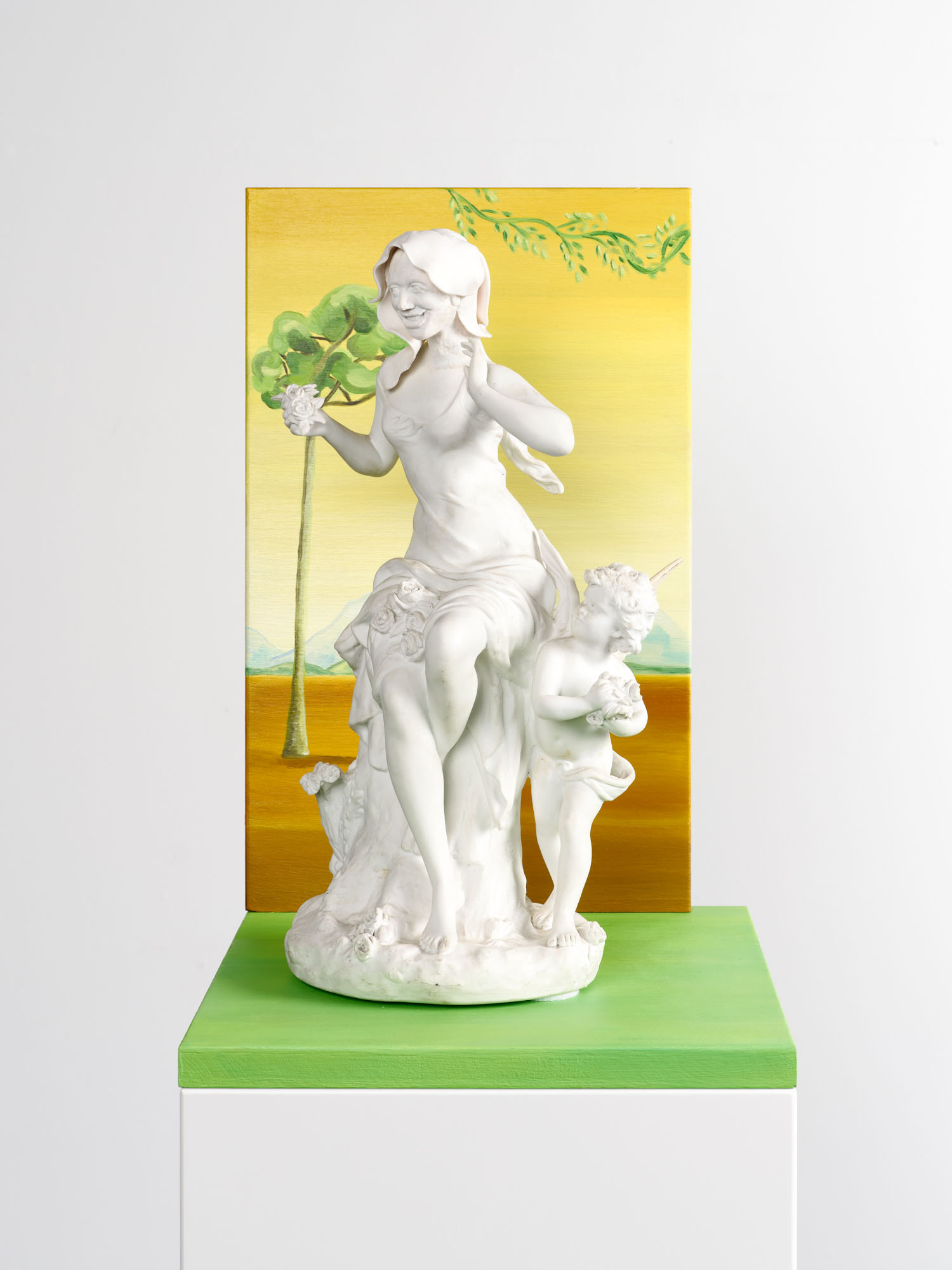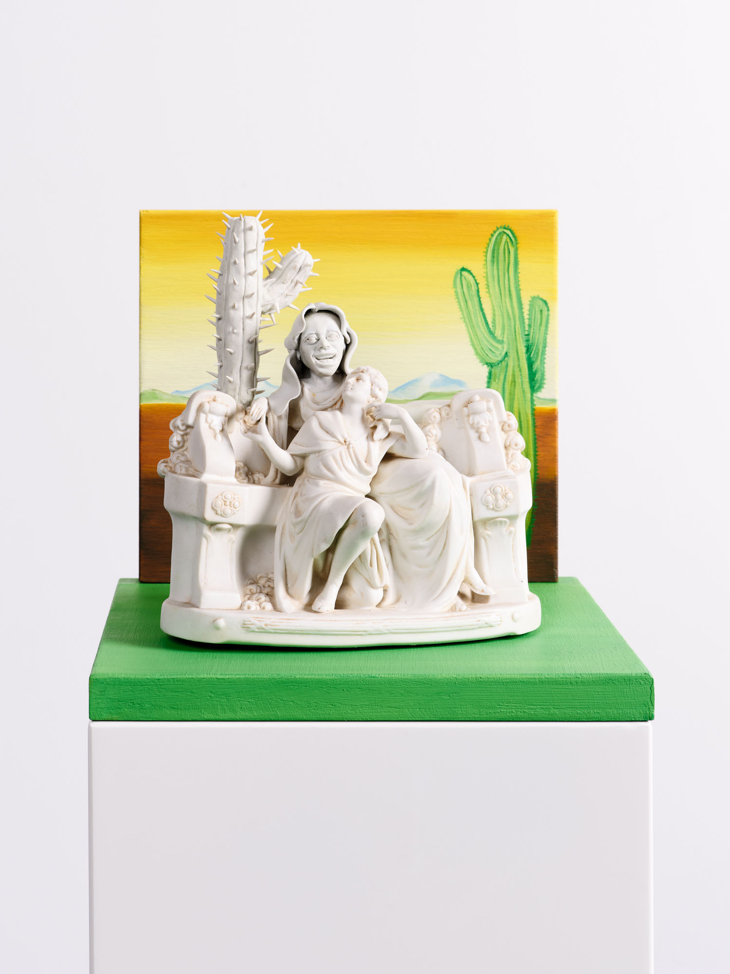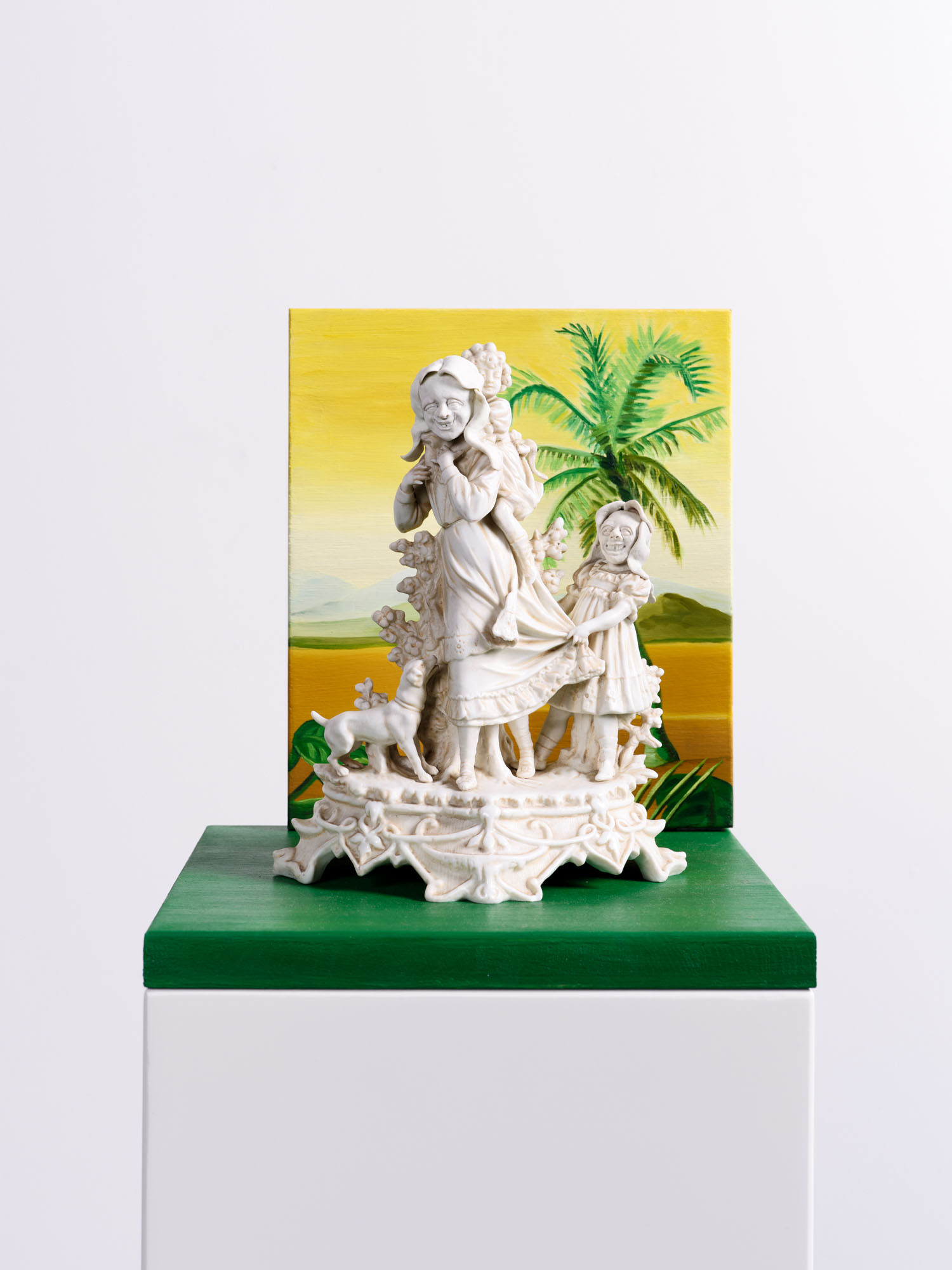 In ‘Grace Grit Grin’, Ilke Cop examines the internalisation of visual codes of femininity embedded in everyday objects. Damaged porcelain figurines of women, frozen in poses of mothers, caretakers, or lovers, are not restored but remade. Working from her own likeness, Cop sculpts grotesquely grinning heads that parody the polite smile historically demanded of women.