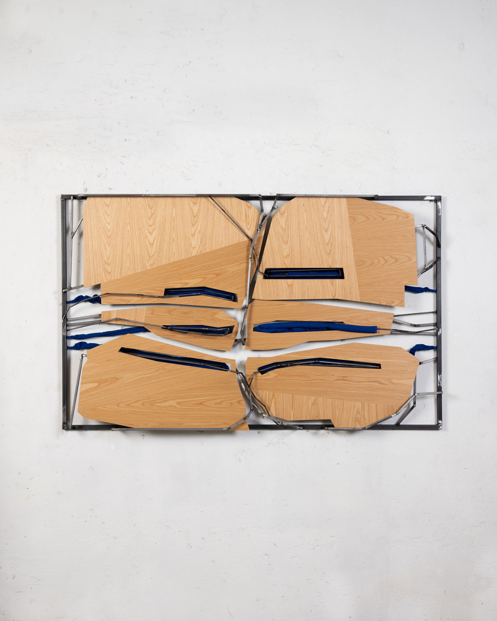 TATJANA PIETERS is honoured to invite you to the third solo exhibition by Indrikis Gelzis at the gallery. ‘What Stays When the Shape Leaves Knot’ presents new wall-based sculptural objects using metal, wood, and textiles. Gelzis employs 3D software in his creative process, blending digital technology with natural materials to form abstract, formally nuanced compositions.