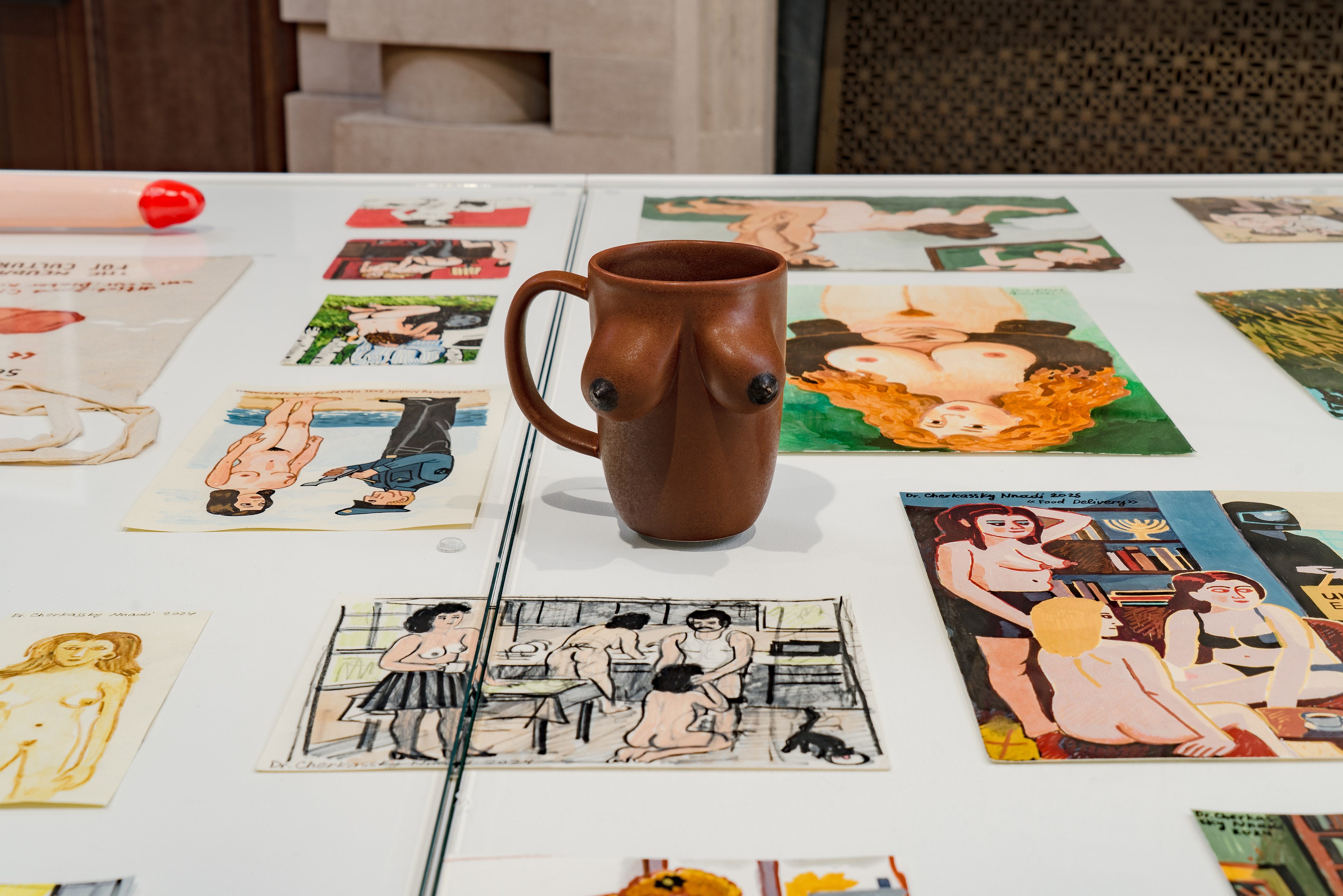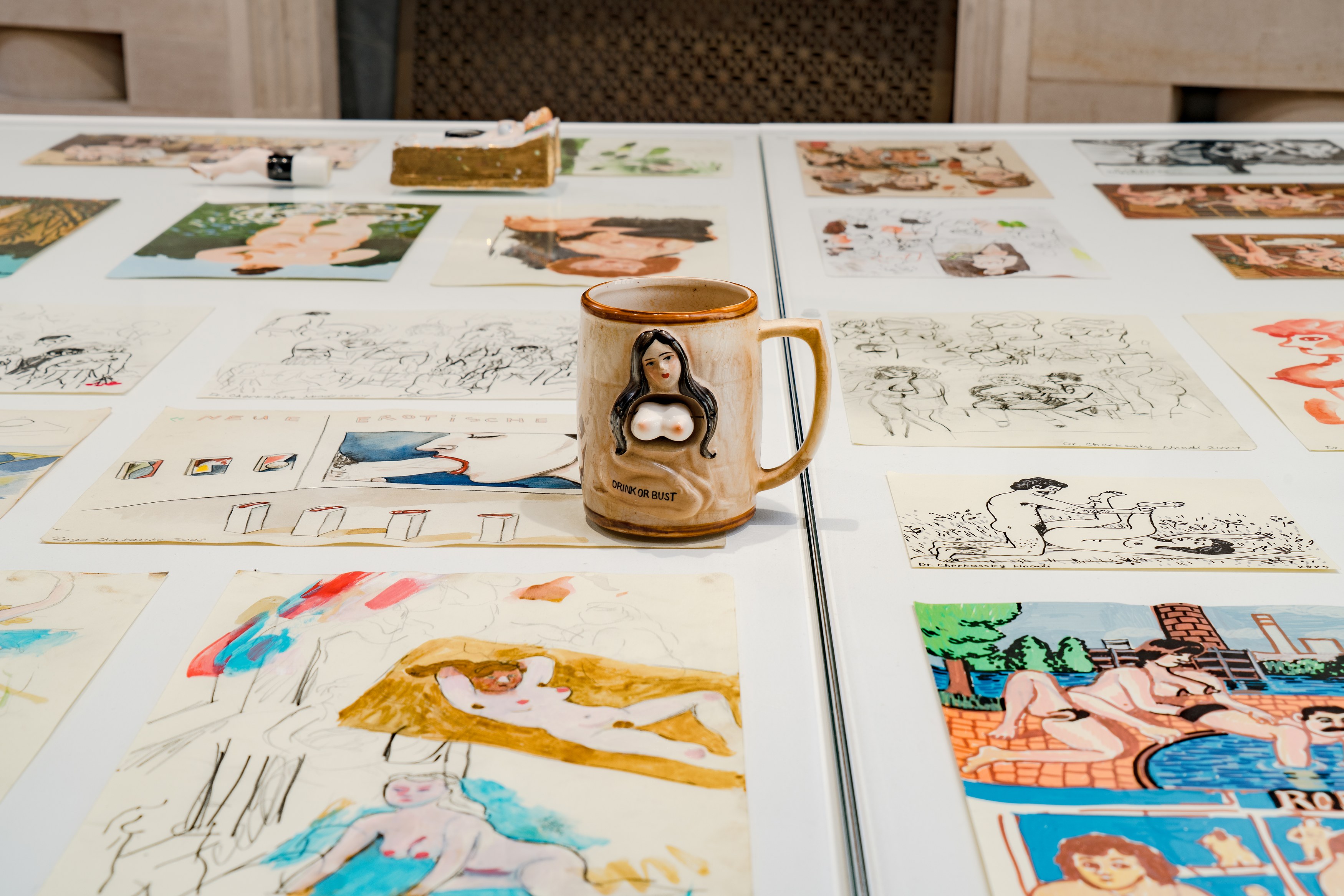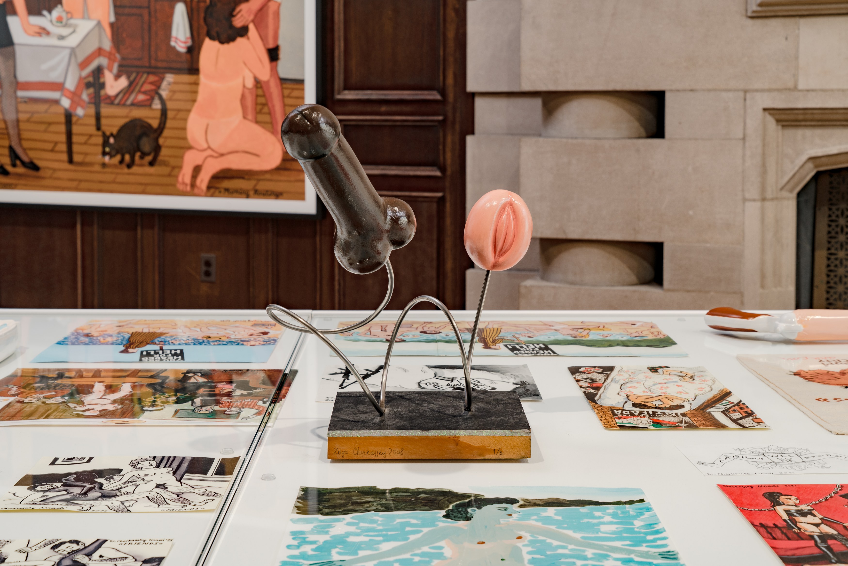 This fall, the Neubauer Collegium will present a suite of new works by Soviet-born Israeli artist Zoya Cherkassky. Teasingly titled The Global Political Crisis, the exhibition consists of erotic drawings in Cherkassky’s signature diaristic style and four large acrylic paintings with similarly charged content, as well as an erotic sculpture and a small collection of jokey pornographic tchotchkes. Touching on the vexed issue of free speech at a moment when political and cultural leaders seem to have very clear ideas about what art should say and do (or, just as patronizingly, what it shouldn’t say and do), Cherkassky’s humorous paean to the “joy of sex” offers a vision of everyday desire that stands in knowing, defiant contrast with the planetary polycrisis alluded to in the title. More than a mere escapist fantasy, Cherkassky’s foray into the age-old tradition of ars erotica symbolizes the importance of pleasure in our trying times – of joining the beleaguered forces of Eros against a…