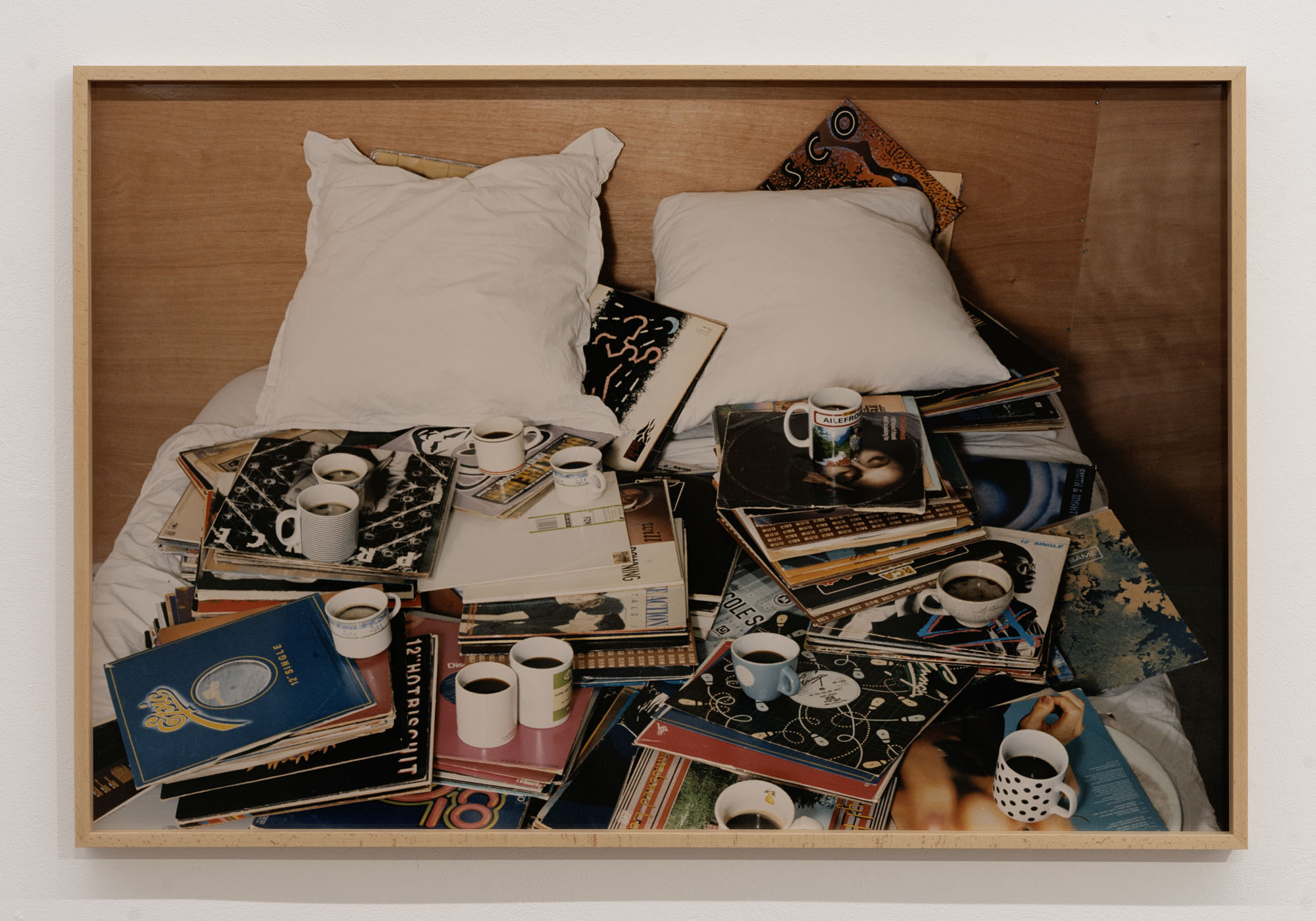 The sixteen photographs included in the show form an allegorical landscape of insomnia: coffee cups, books, masks, neon lights… Some images are meticulously staged, while others allow for improvisation, as if thought itself had seeped into them.