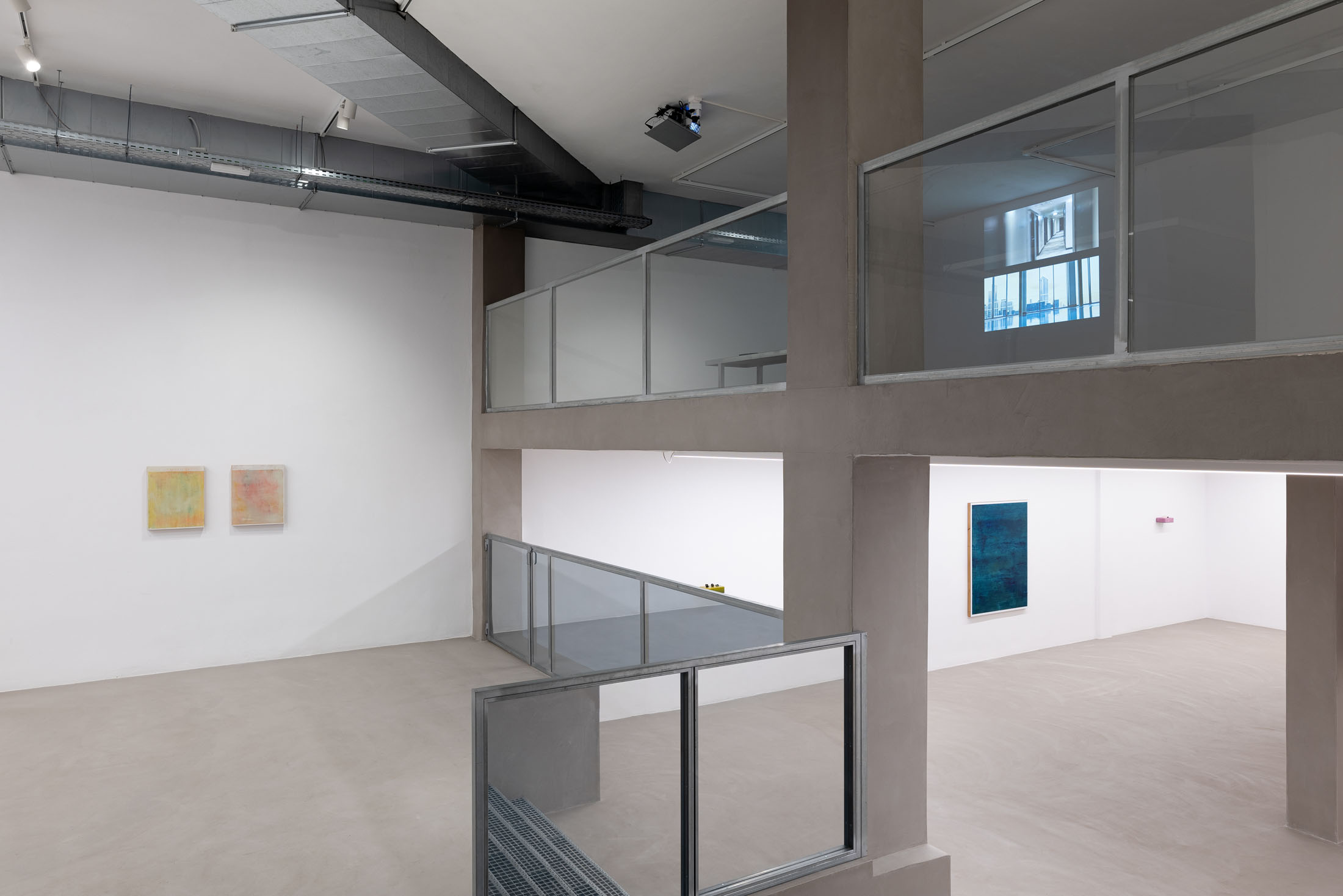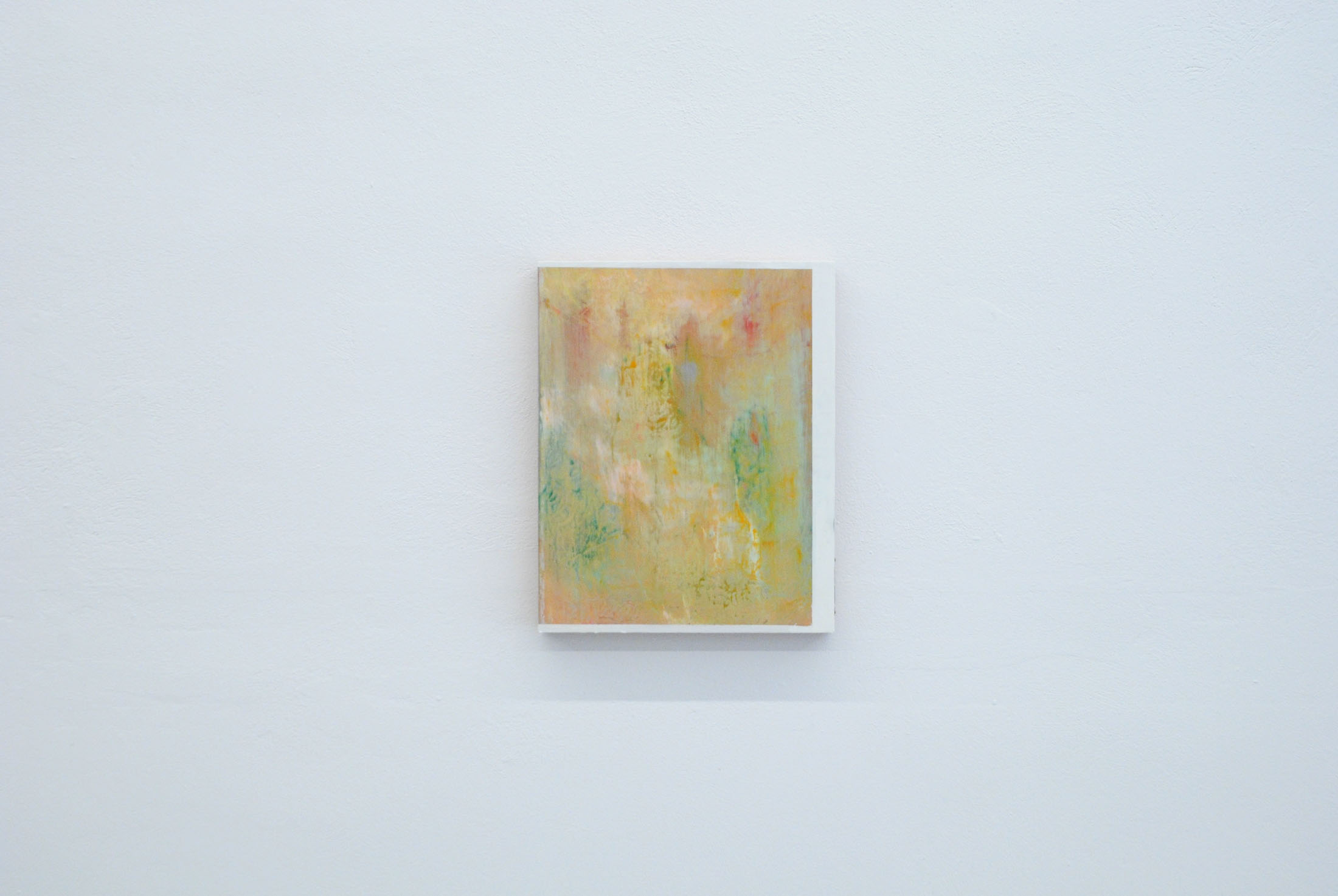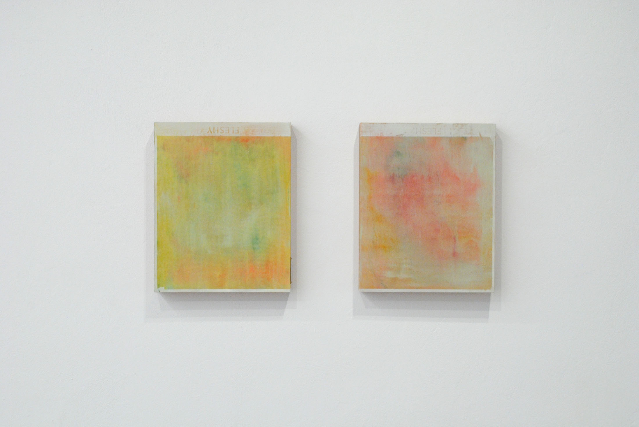 The five paintings occupying the gallery’s entrance appear at first as abstractions of light and colour, with repetitive, layered, and erased marks bringing to mind the weathered surfaces of abandoned buildings. Yet, the works do not occupy a purely abstract space, but instead…