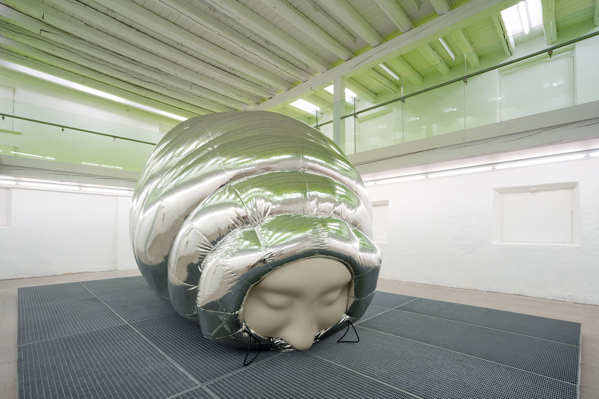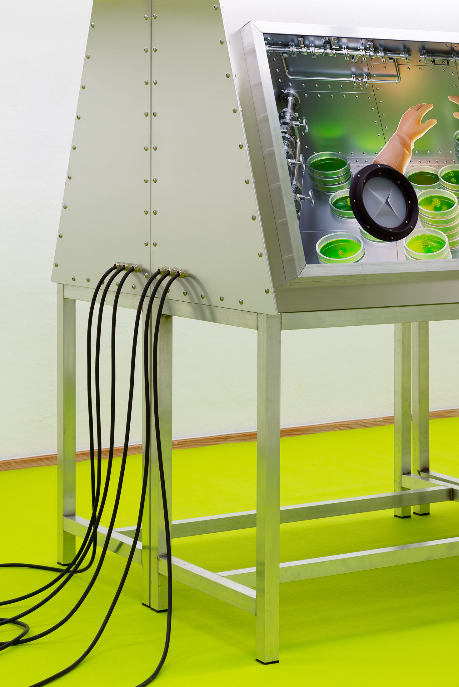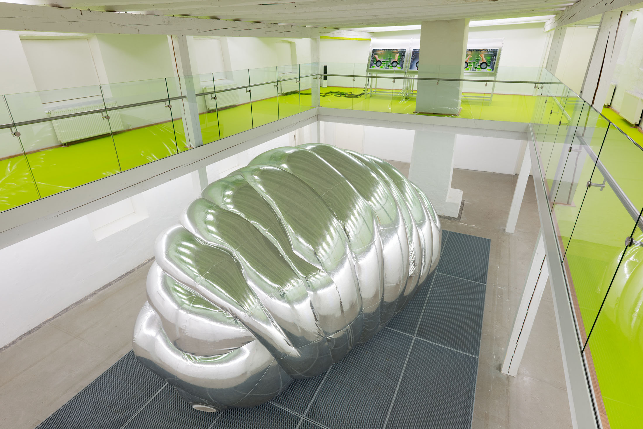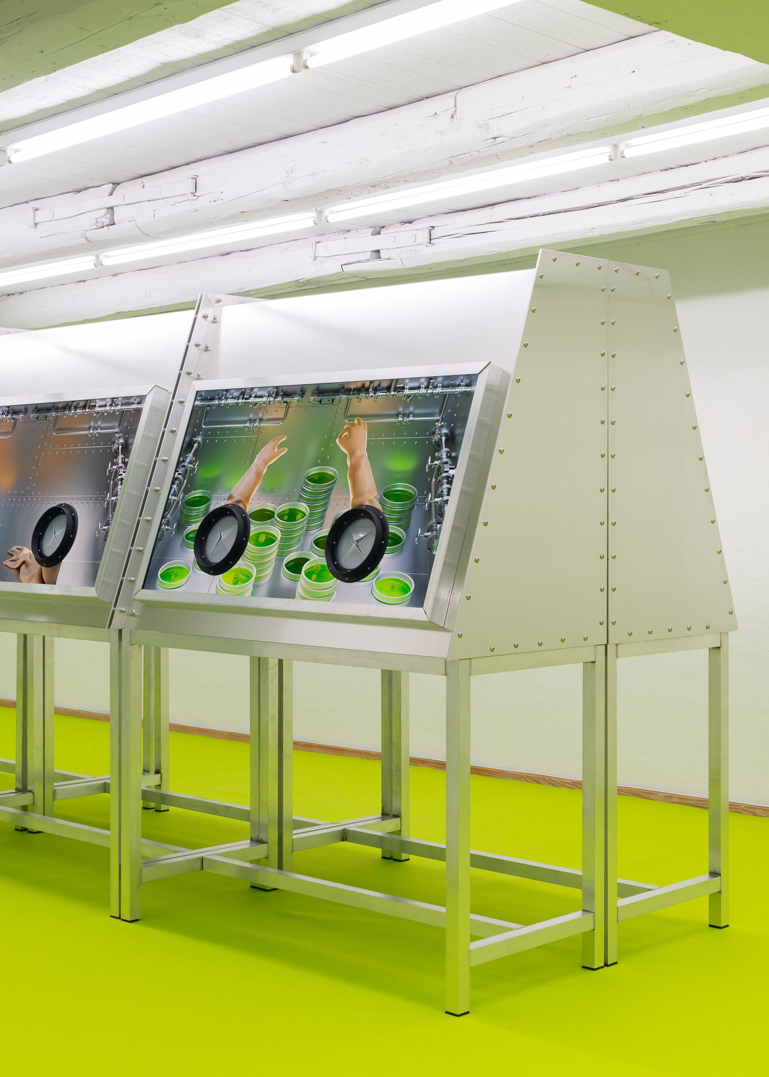 The installation explores the idea of a hybrid between human and tardigrade. A vision that is not far from reality, as researchers are already experimenting with tardigrade genes in human stem cells. The monumental human–tardigrade hybrid can be experienced from both the ground floor and the first floor, while incubators containing tardigrade eggs reinforce the sense of scientific experimentation.