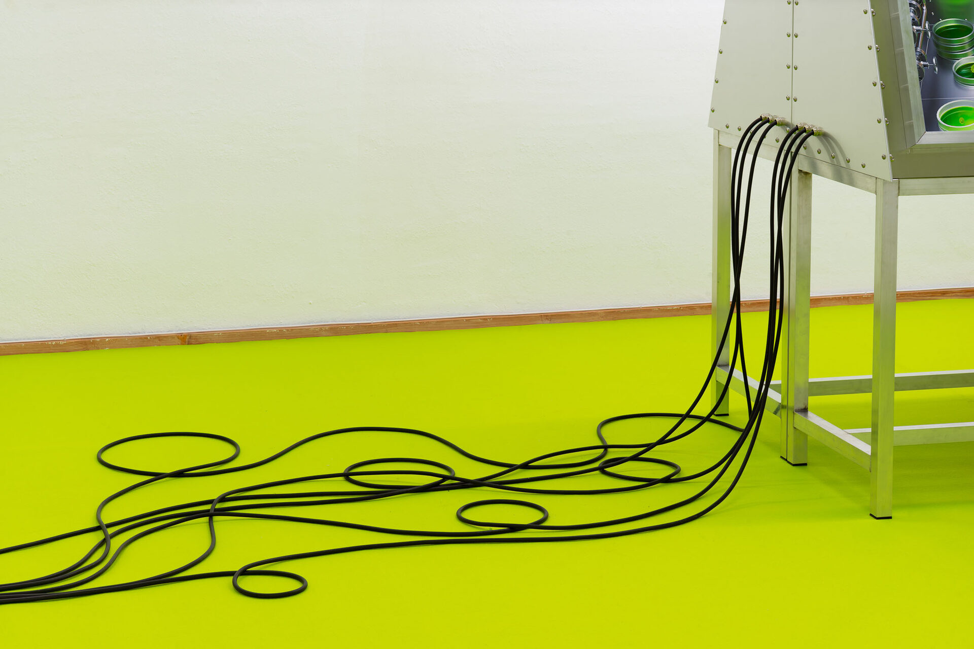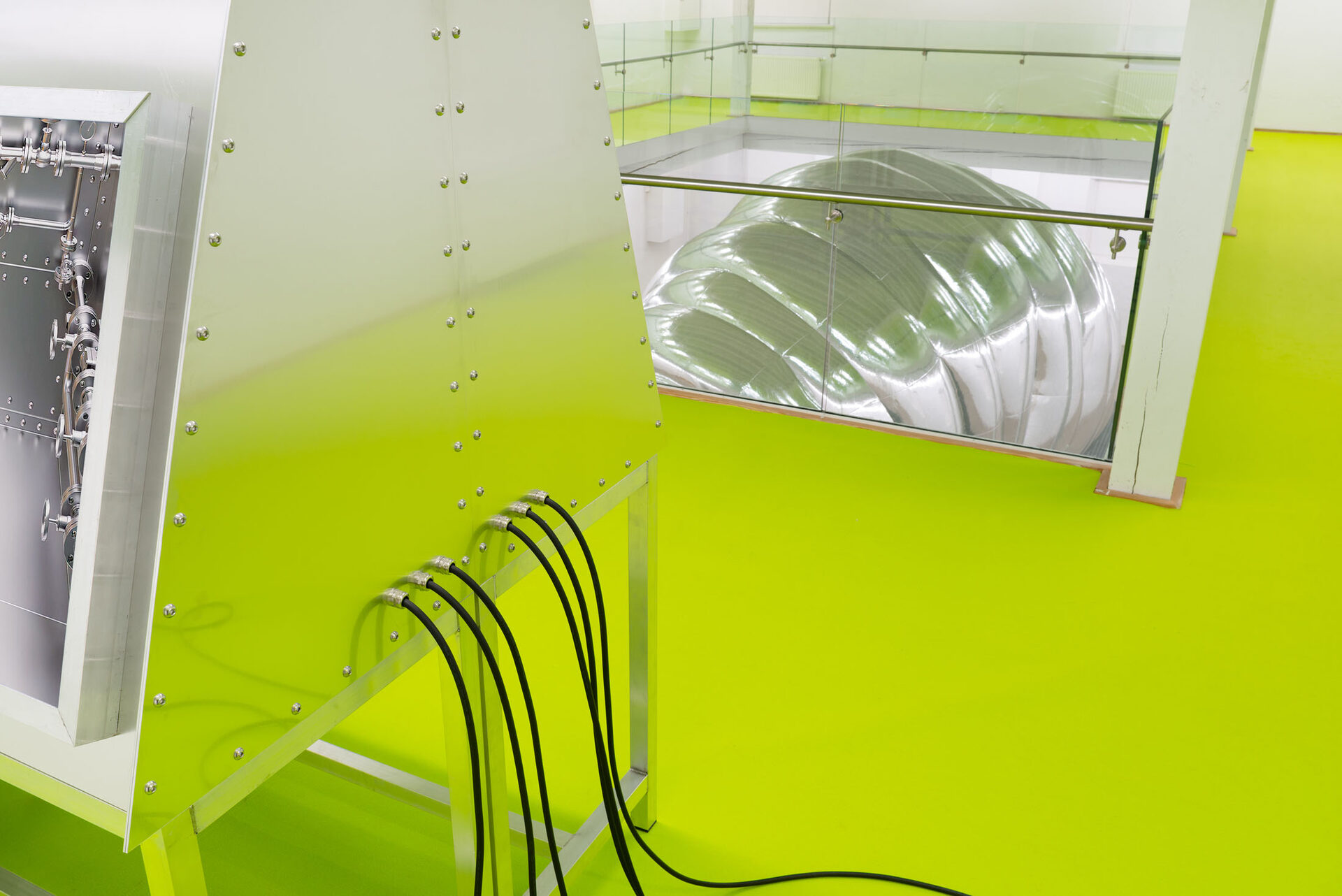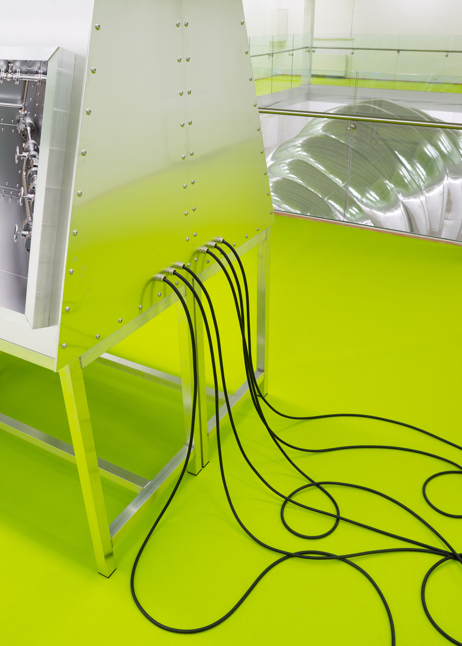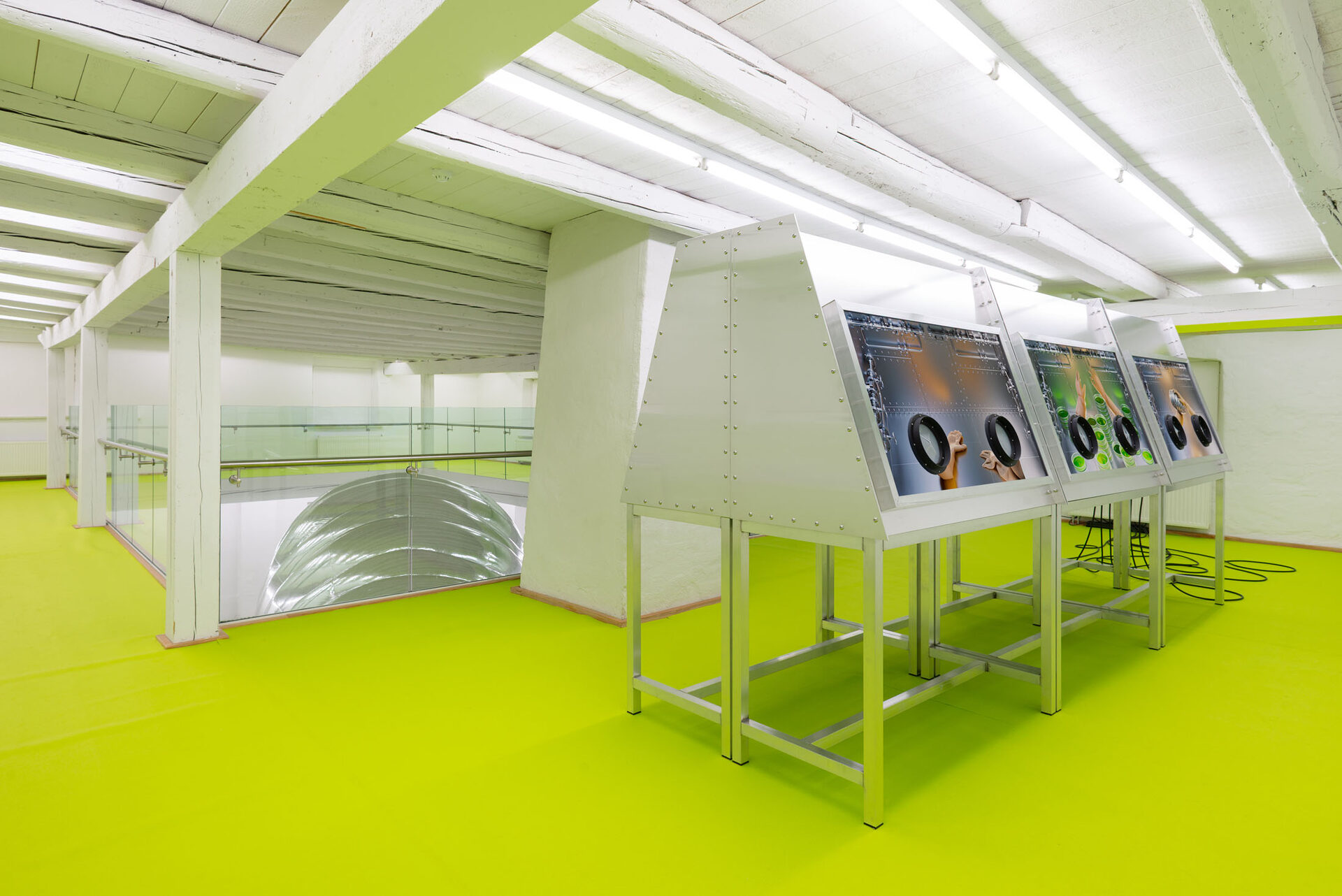 The installation explores the idea of a hybrid between human and tardigrade. A vision that is not far from reality, as researchers are already experimenting with tardigrade genes in human stem cells. The monumental human–tardigrade hybrid can be experienced from both the ground floor and the first floor, while incubators containing tardigrade eggs reinforce the sense of scientific experimentation.