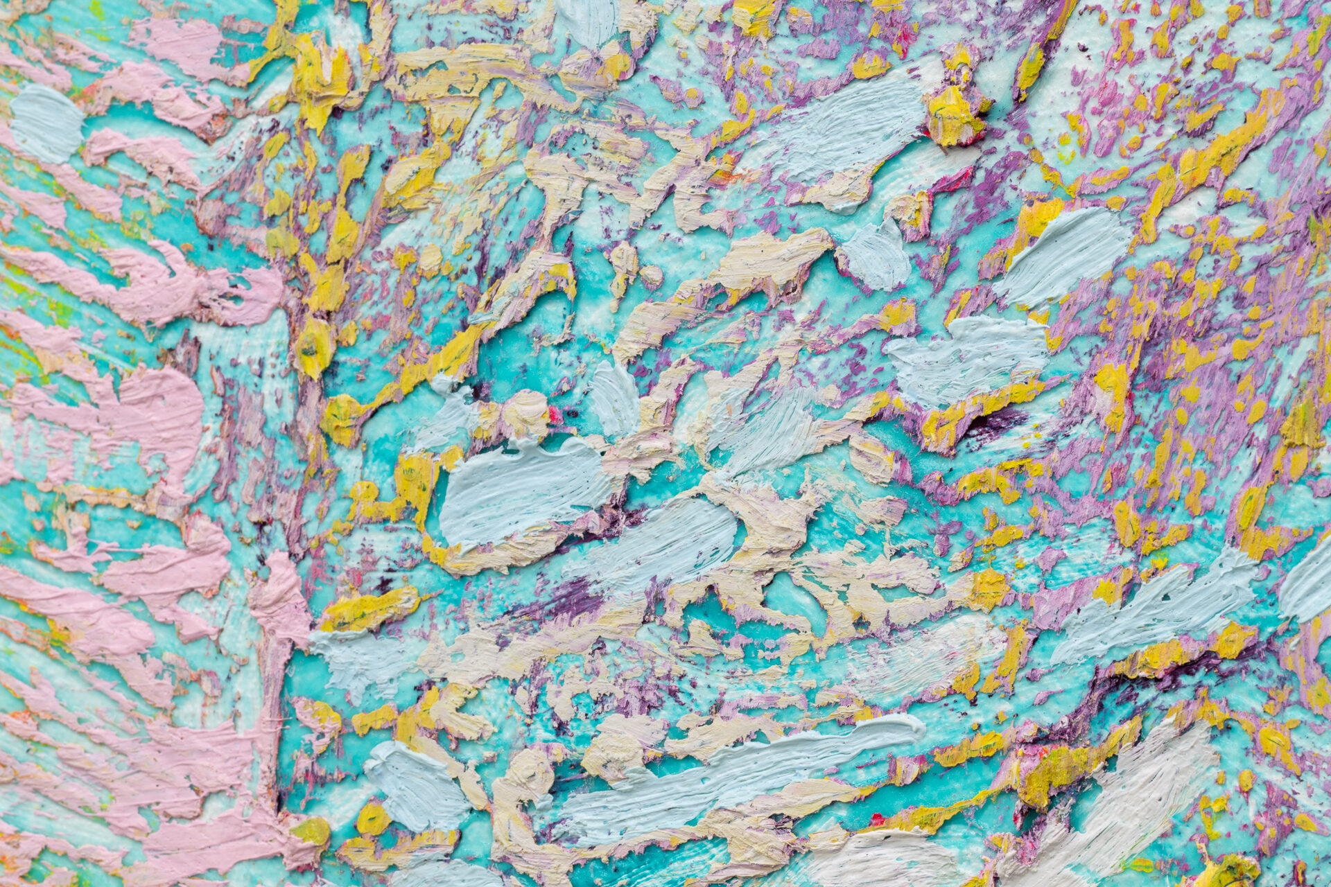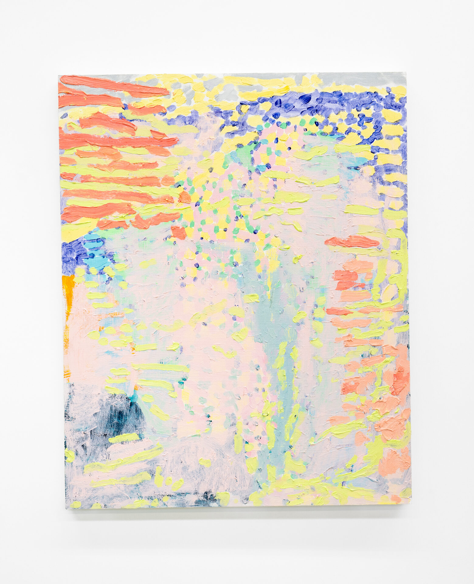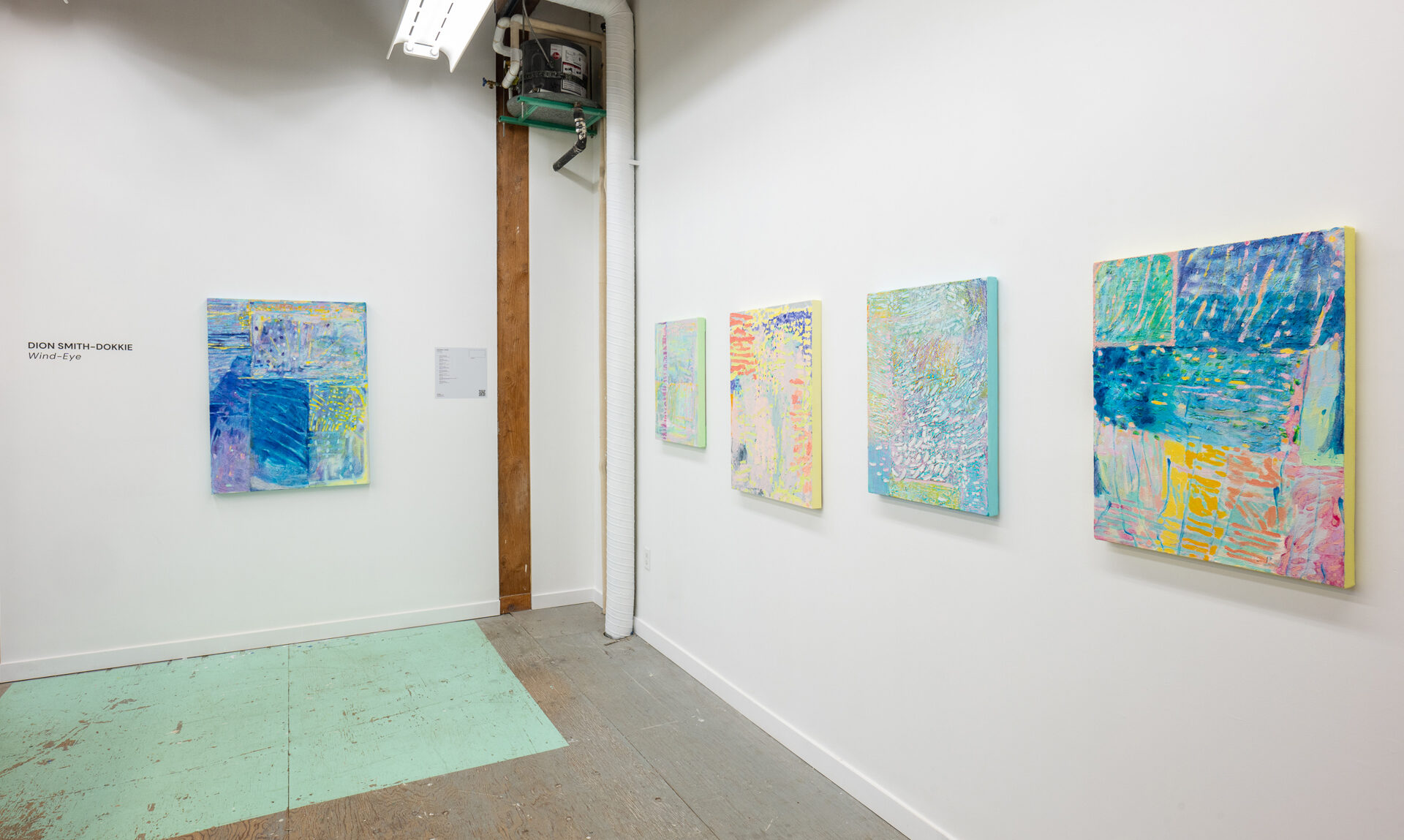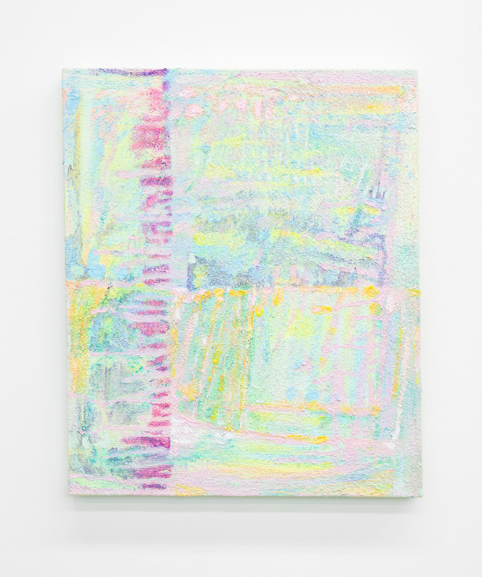 Bringing together works in acrylic, oil and mixed-media, the variety of techniques demonstrate an ongoing inquiry into the juncture of the sensual, formal, and environmental. Multiple works incorporate sand and other materials, in the quest for a vibrant surface. The use of internal subdivision and abutting passages refracts multiple places into the frame of each work while the palette, predominantly pastel with sections of deep blue and violet, conjures the uncertainty of dusk, when the world beckons through the window. Throughout Wind-Eye, wind-swept gestures caress and flow like garlands or fingers.