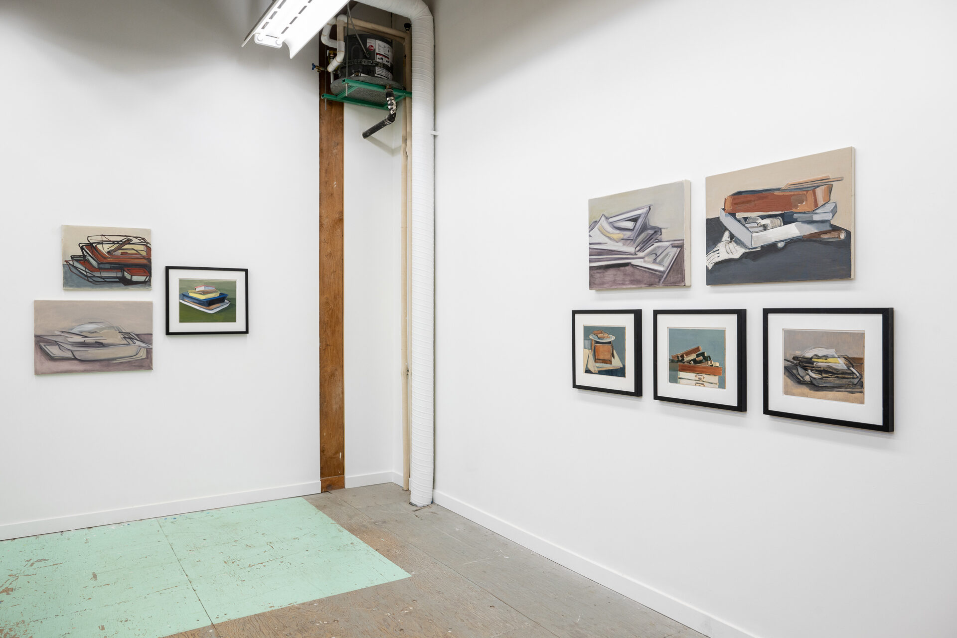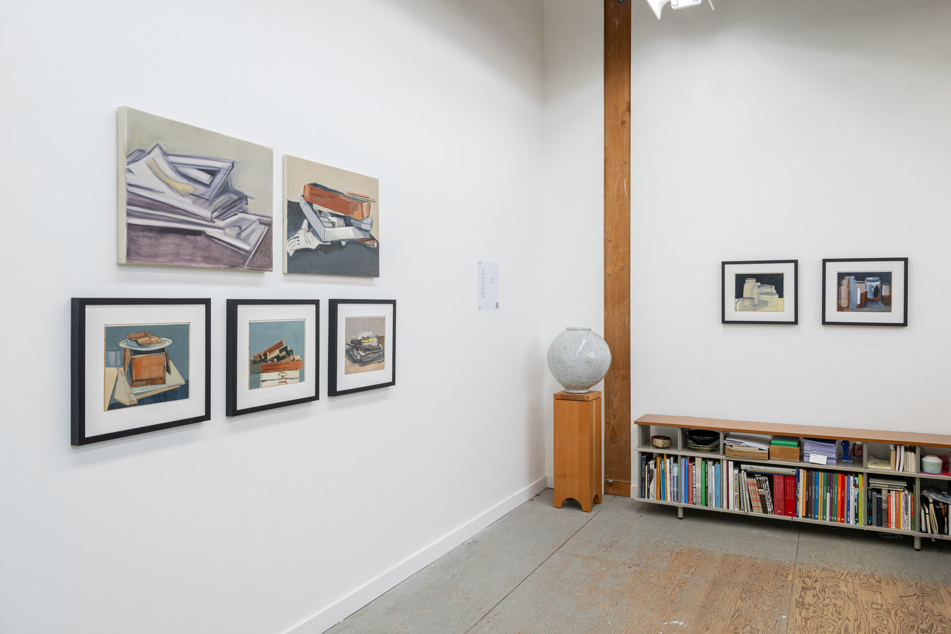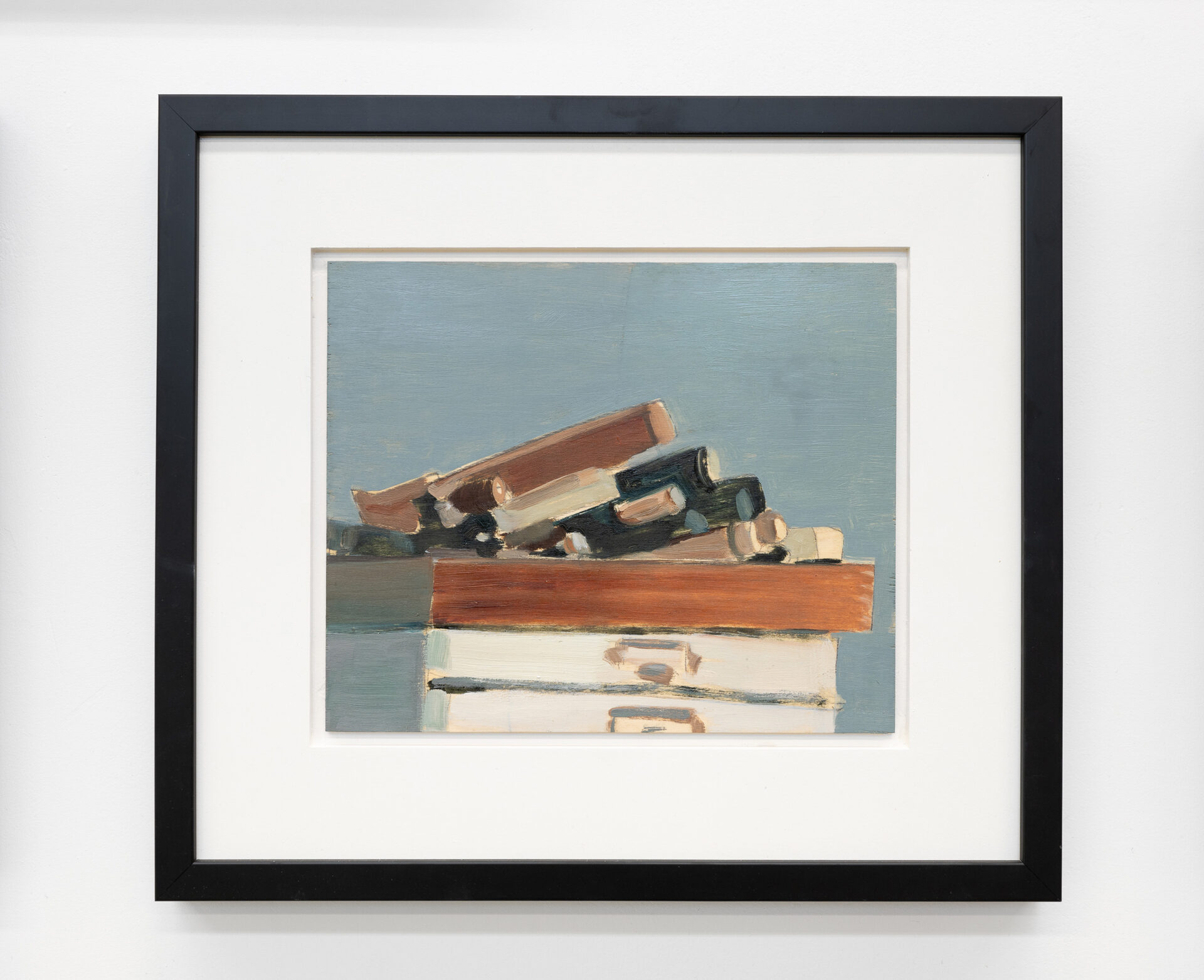 In painting and drawing, I have used the still life genre to relieve common objects of their purpose, to feature them as characters as if in a series of tableaus. The paintings in this exhibition focus on Herald Nix’s studio, where collections appear just as the artist left them, gathered in new stacks each day. Whether carefully organized or haphazardly stacked, these objects seem to write humorous little stories throughout the home and studio. Like a midden, I see those arrangements as a transitory record, the detritus of daily life that I fix in new form where the objects merge, shift roles, and meaning.
