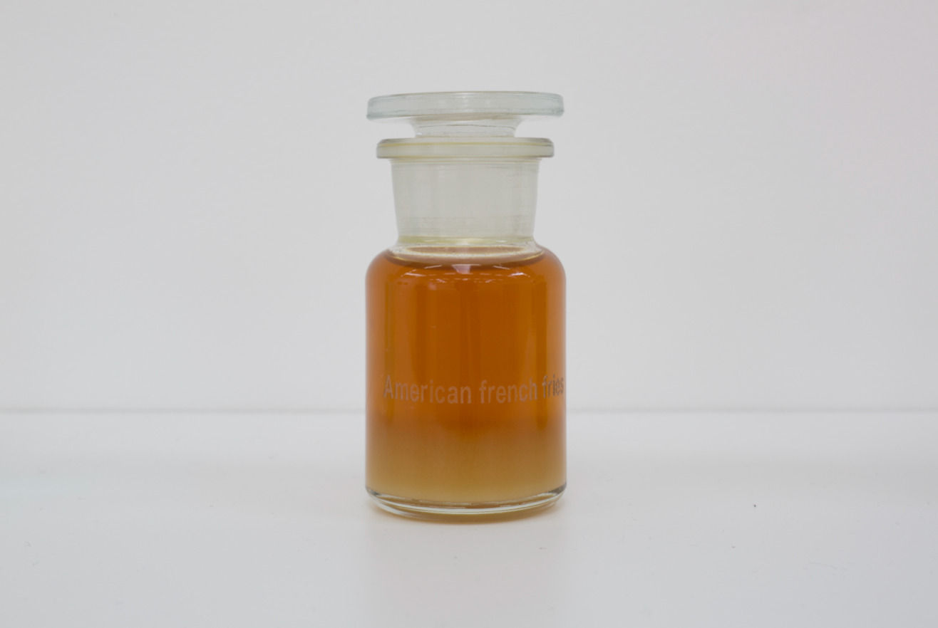 Chantal Peñalosa Fong, A Few Cubic Meters of Air Between the United States and Mexico (2019). Six engraved glass bottles with scent, variable dimensions. Scents, from left to right: Carne Asada Tacos; Highway Far South of California; Brand New Car; American French Fries; National Garbage in Decomposition; American French Fries.